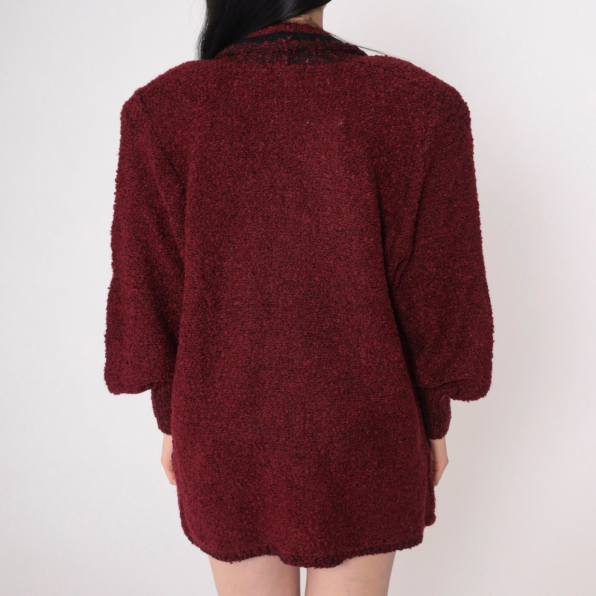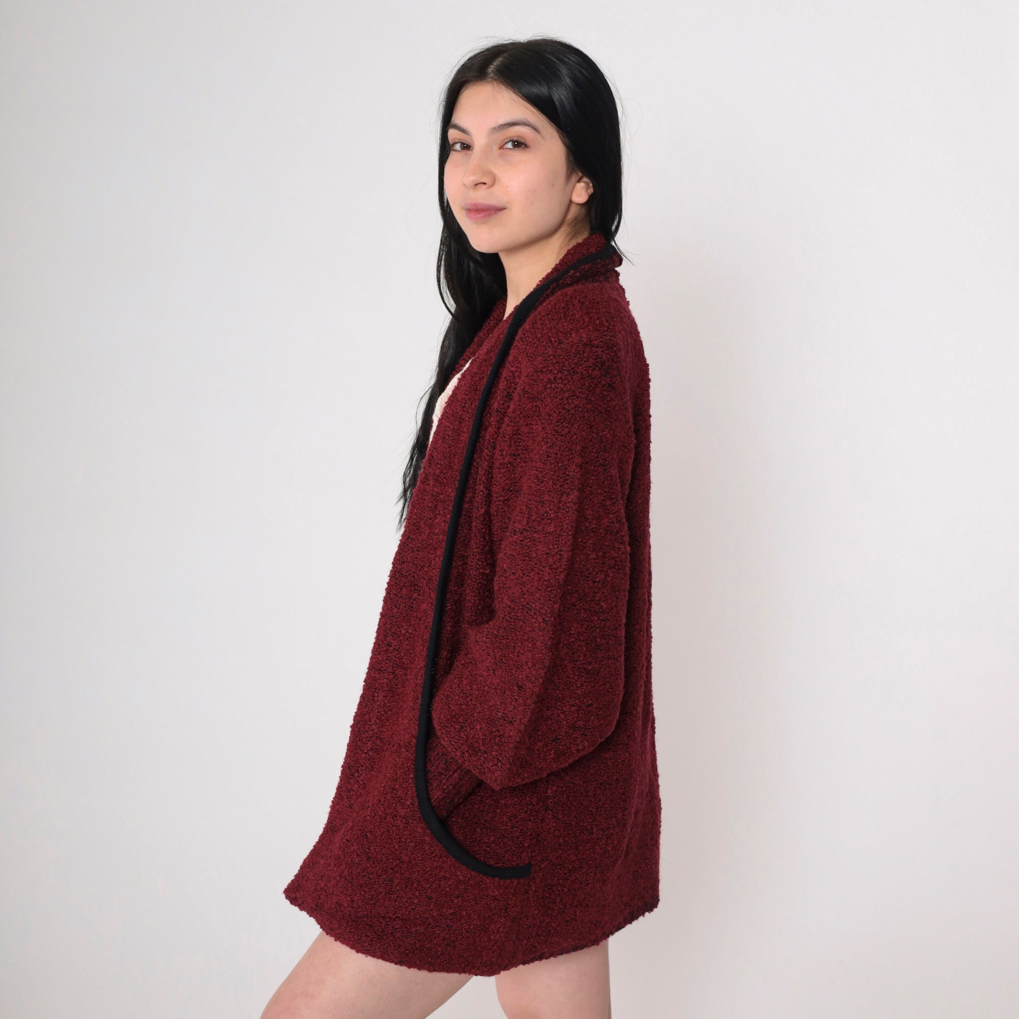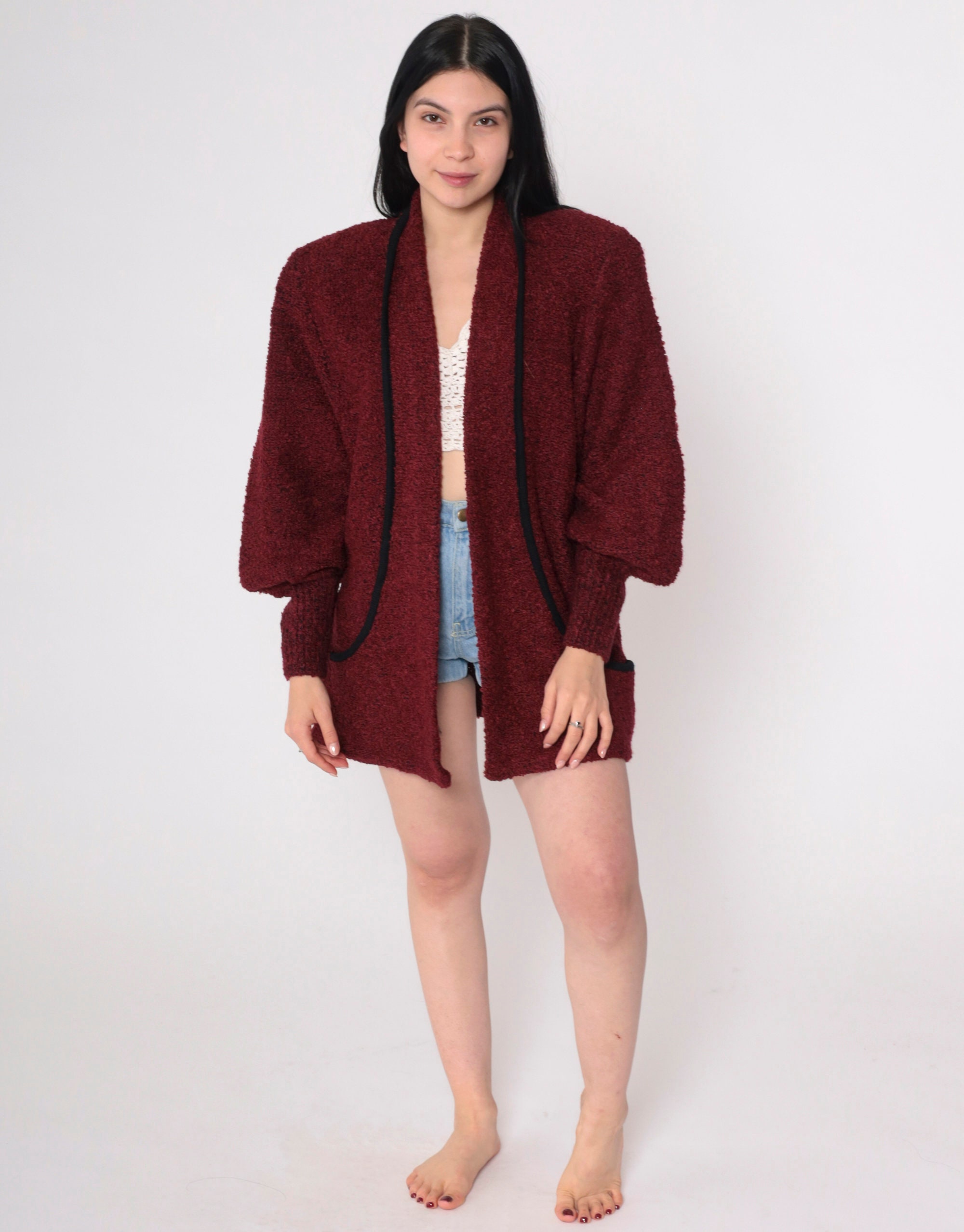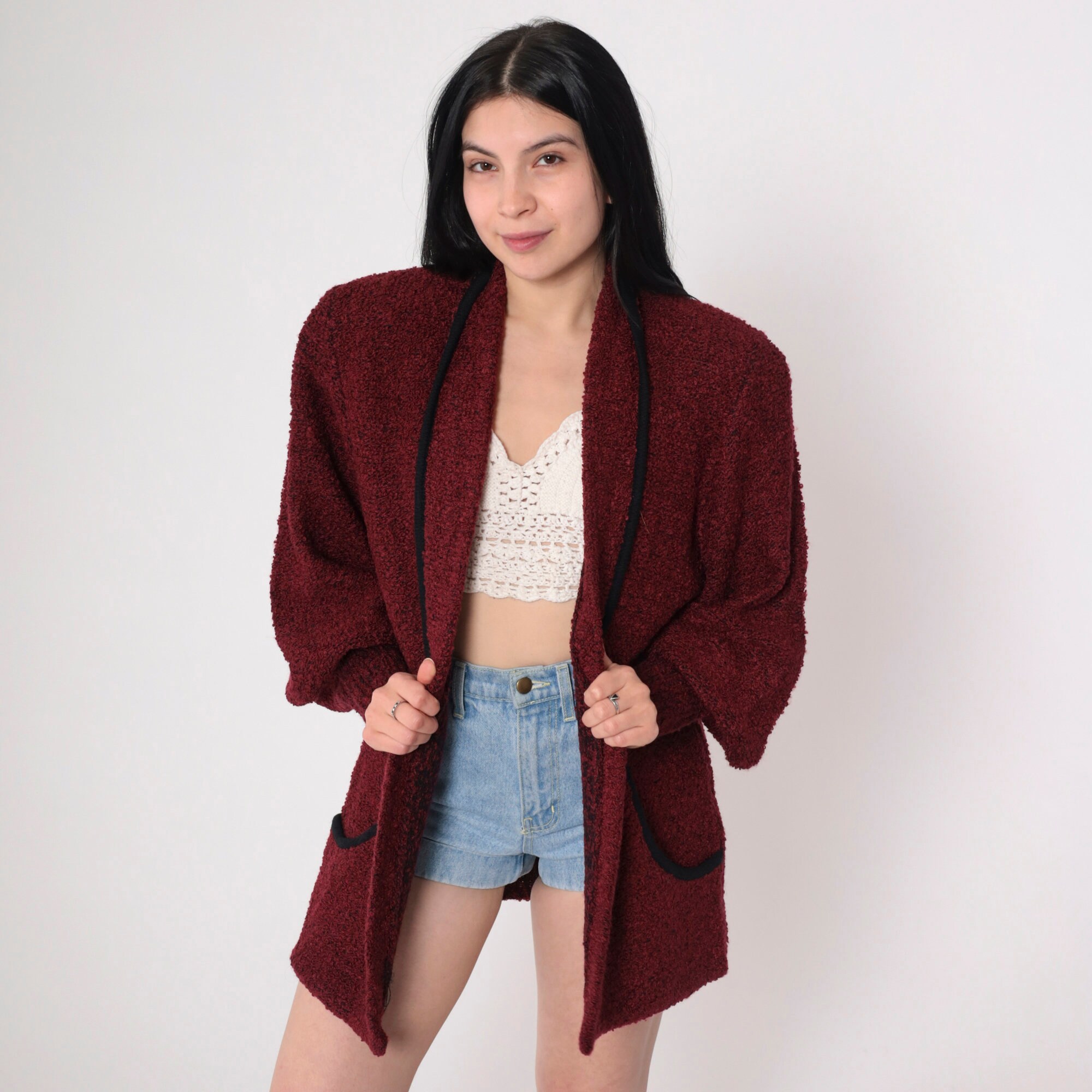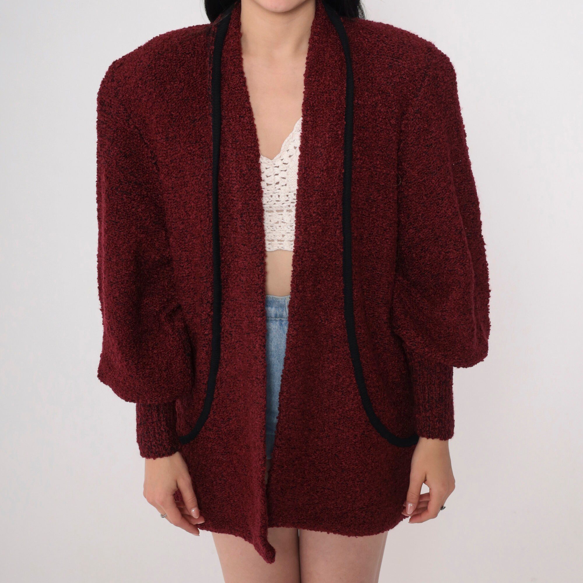 Vintage 80s 90s cardigan sweater in wine nubby knit with black trim and an open front. It has pockets and shoulder pads.
