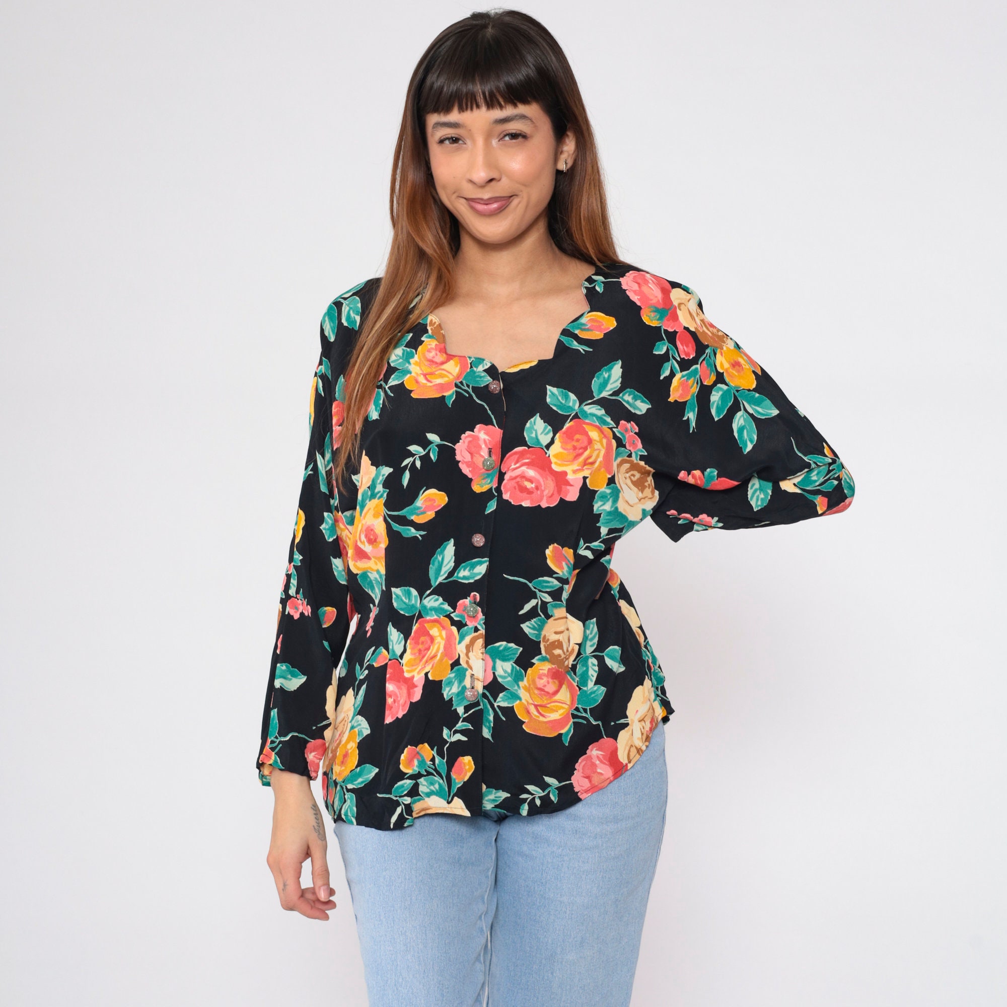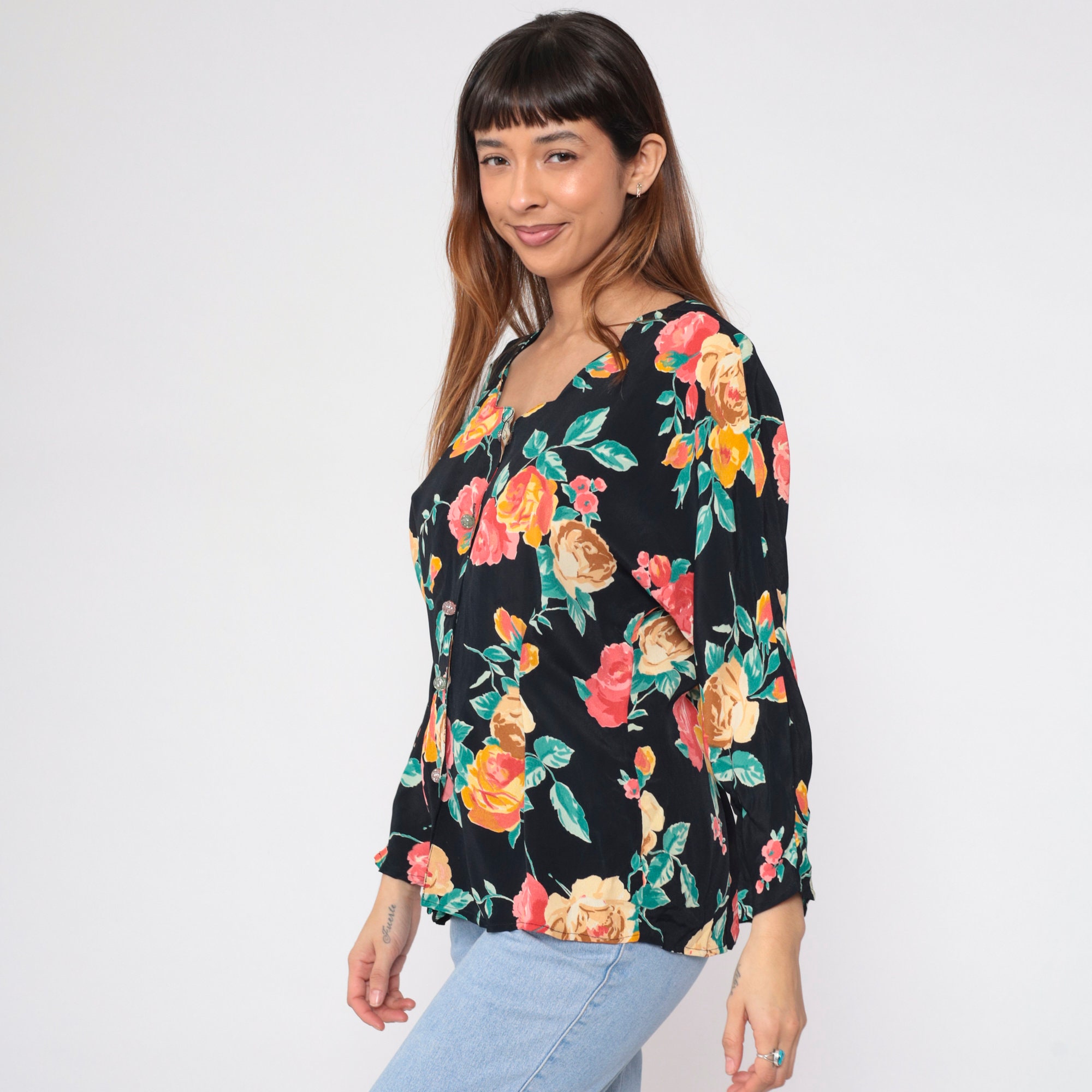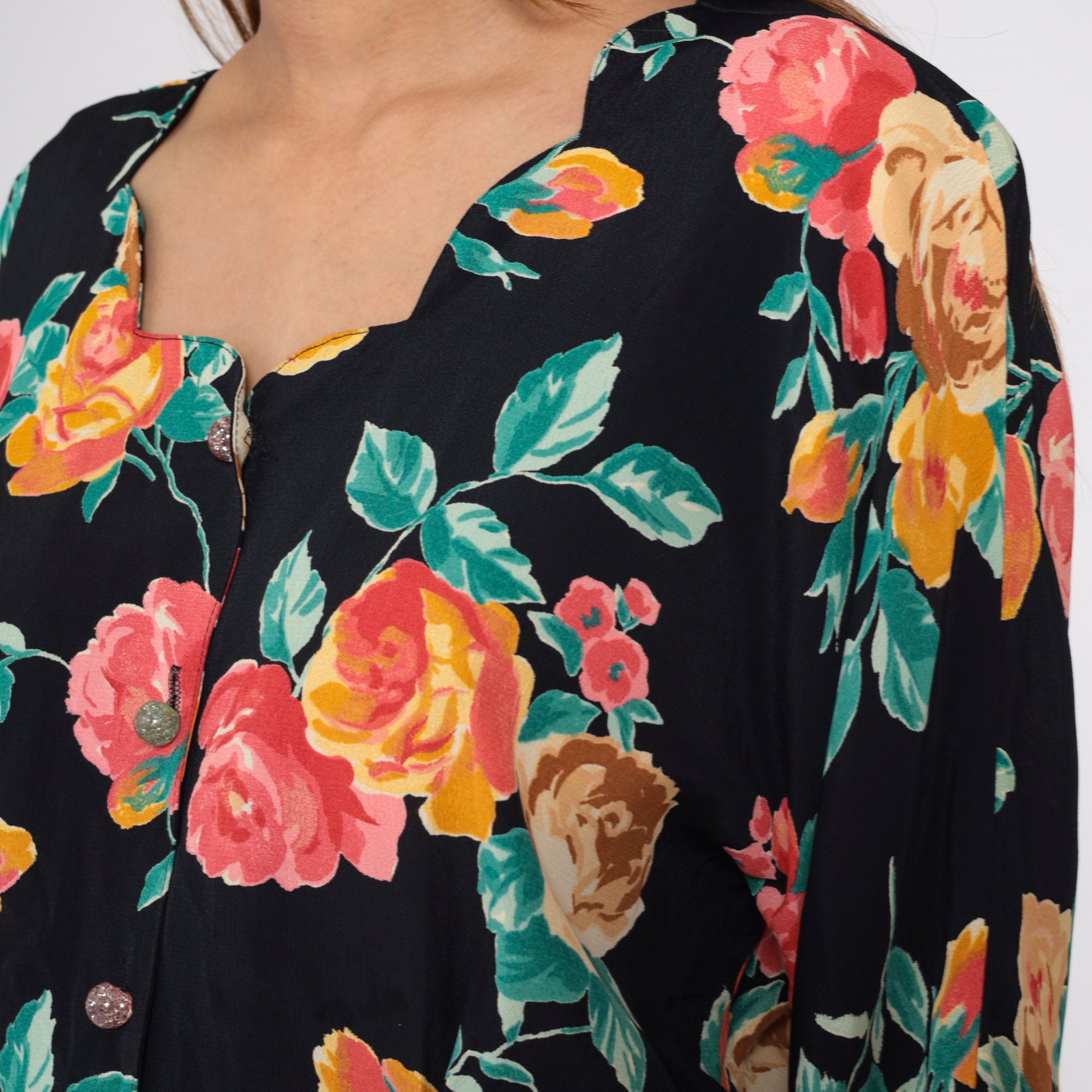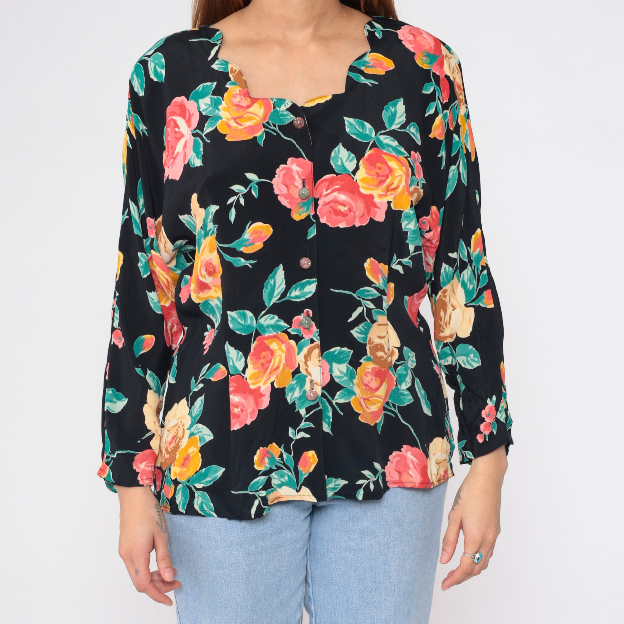 Vintage 90s blouse in black with a floral print. Buttons up the front with long sleeves and a scalloped neckline.