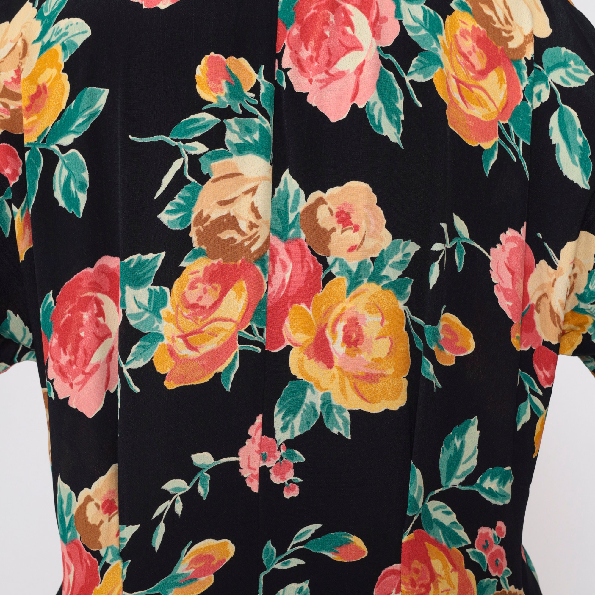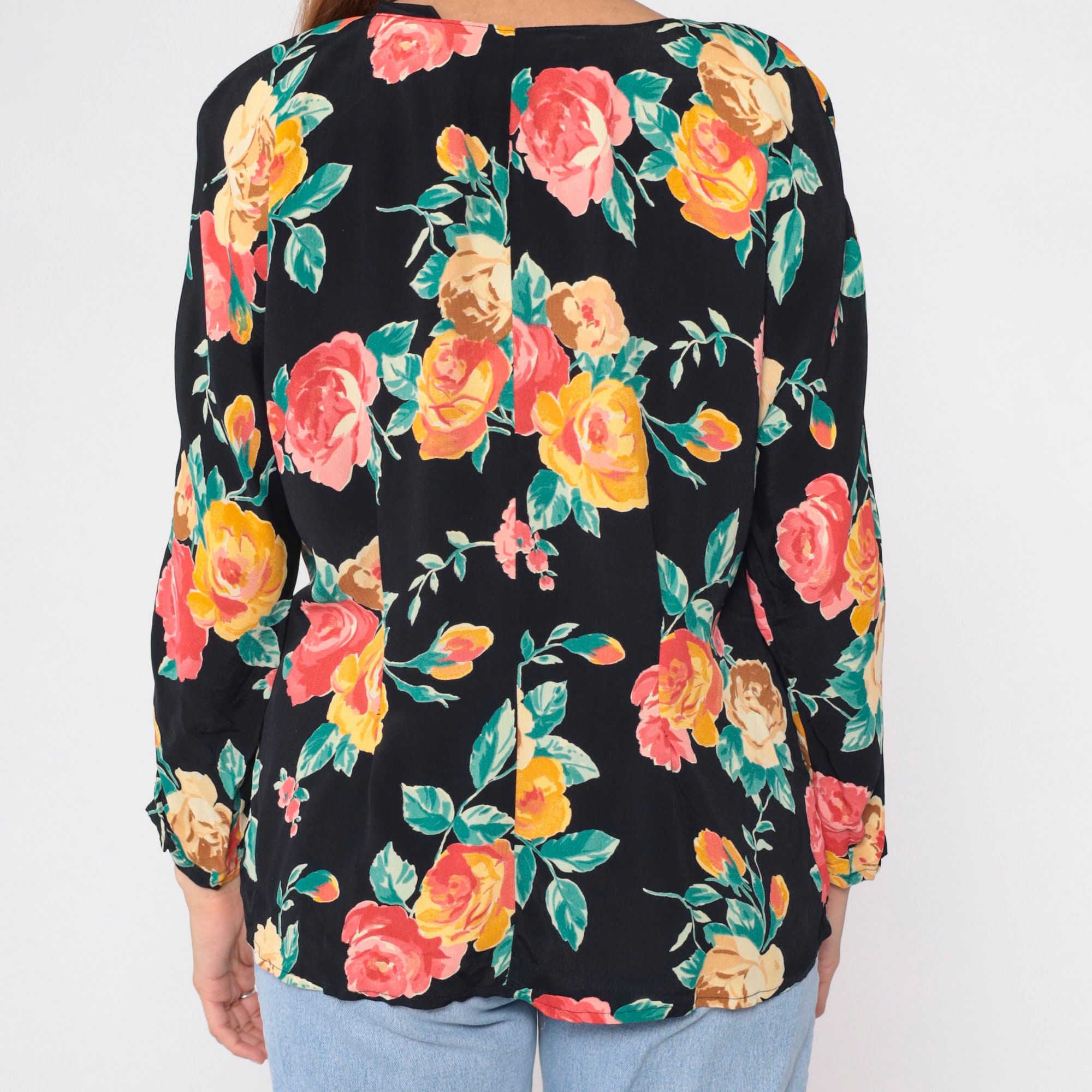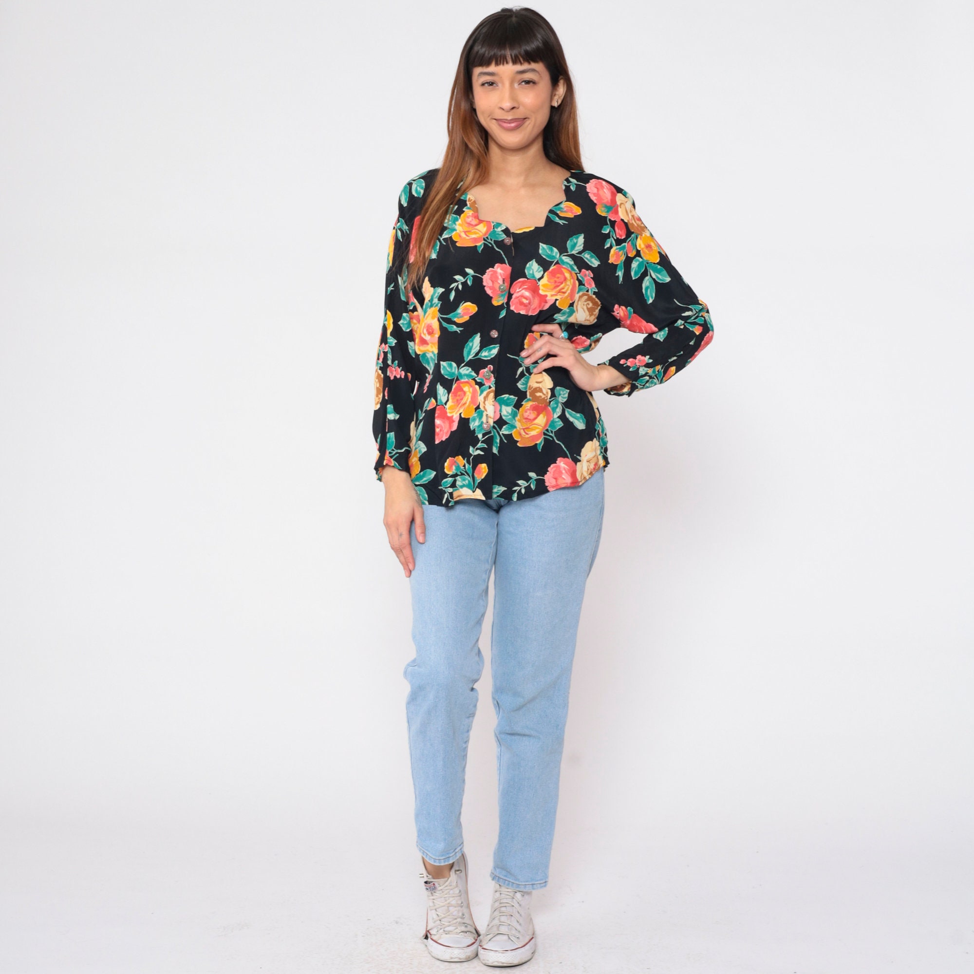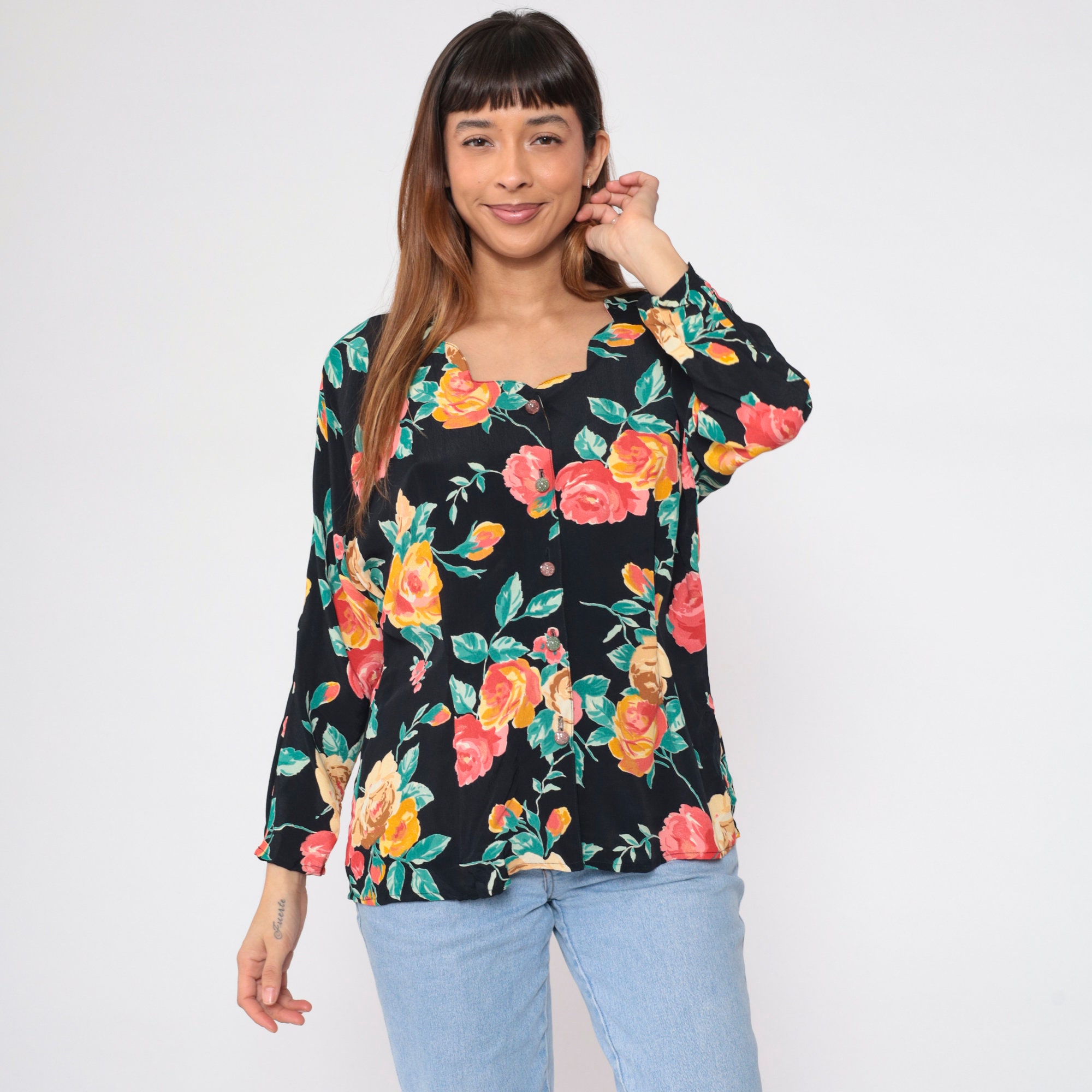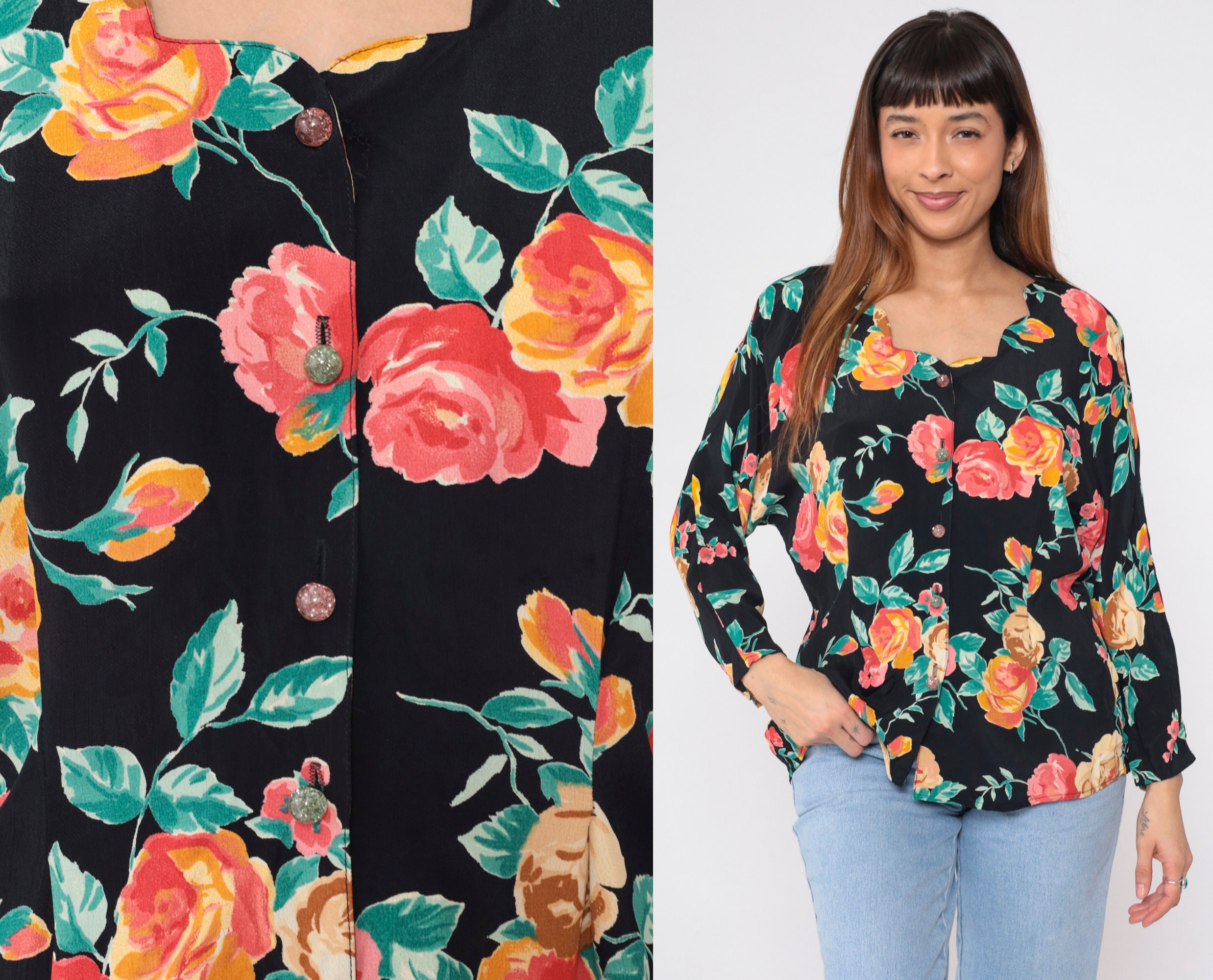Vintage 90s blouse in black with a floral print. Buttons up the front with long sleeves and a scalloped neckline.