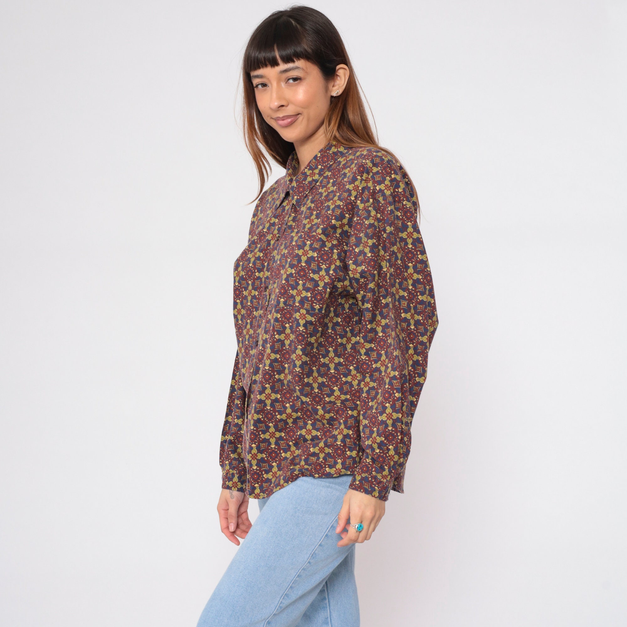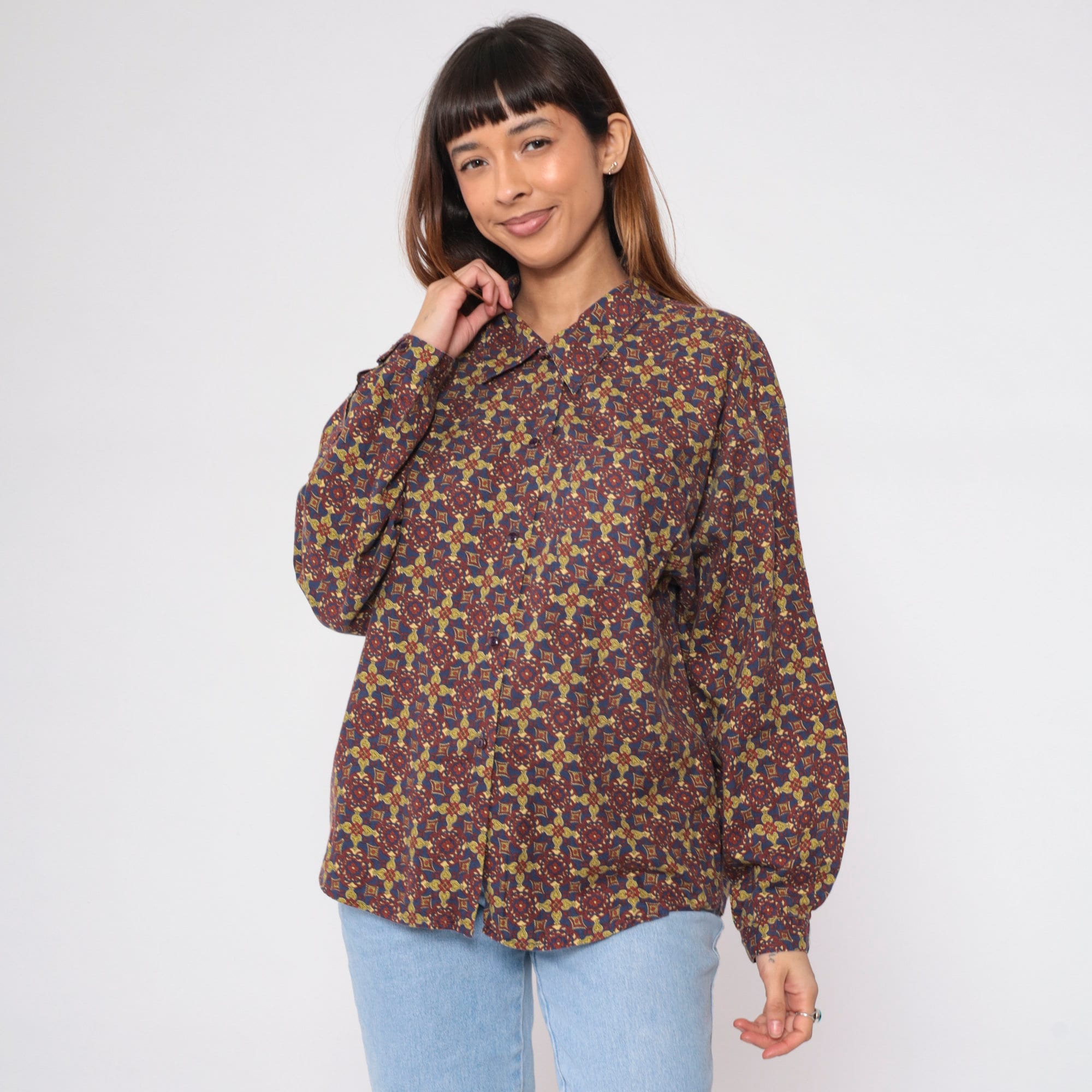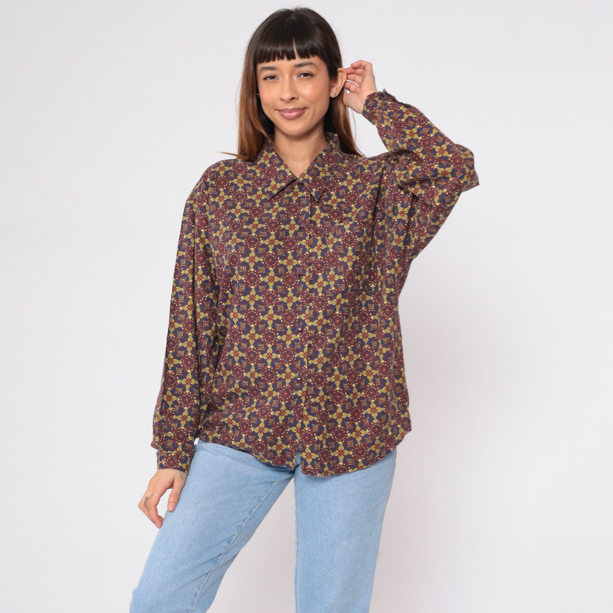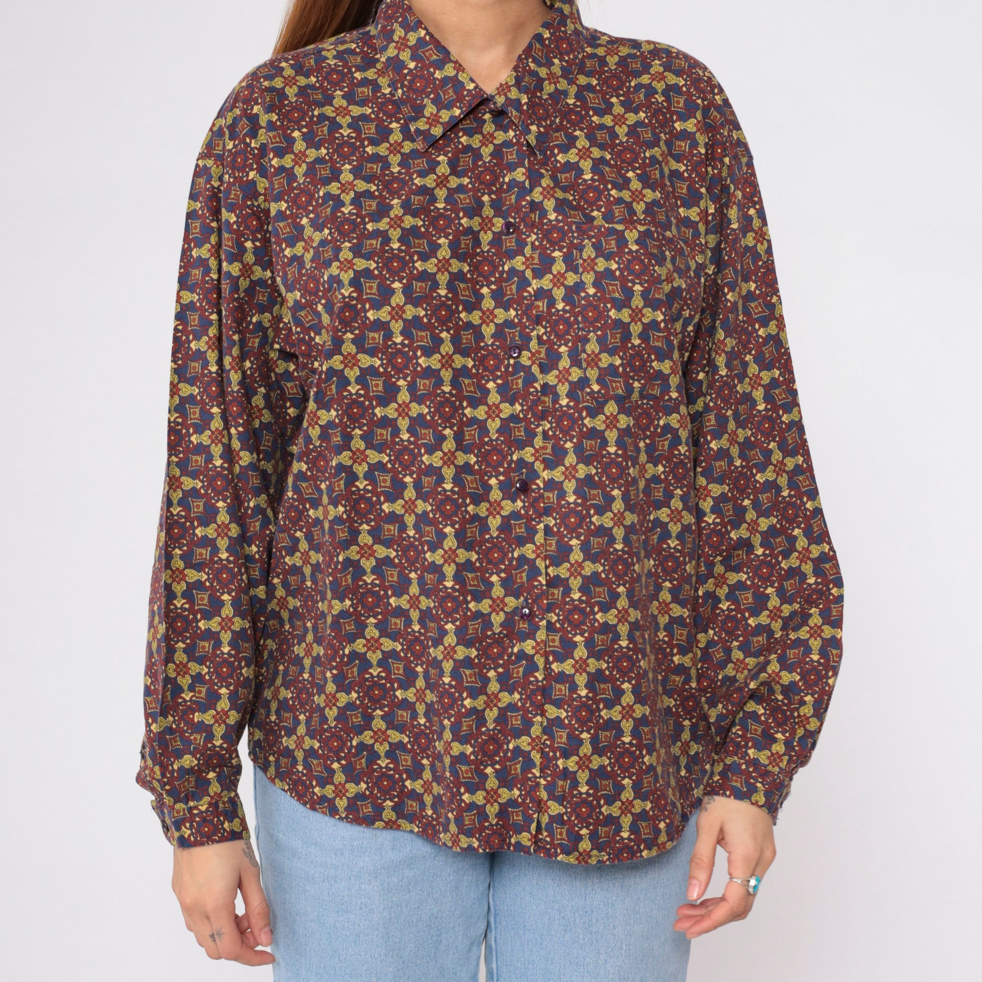 Vintage 90s shirt in a Geometric floral print. It has long sleeves and buttons up the front.