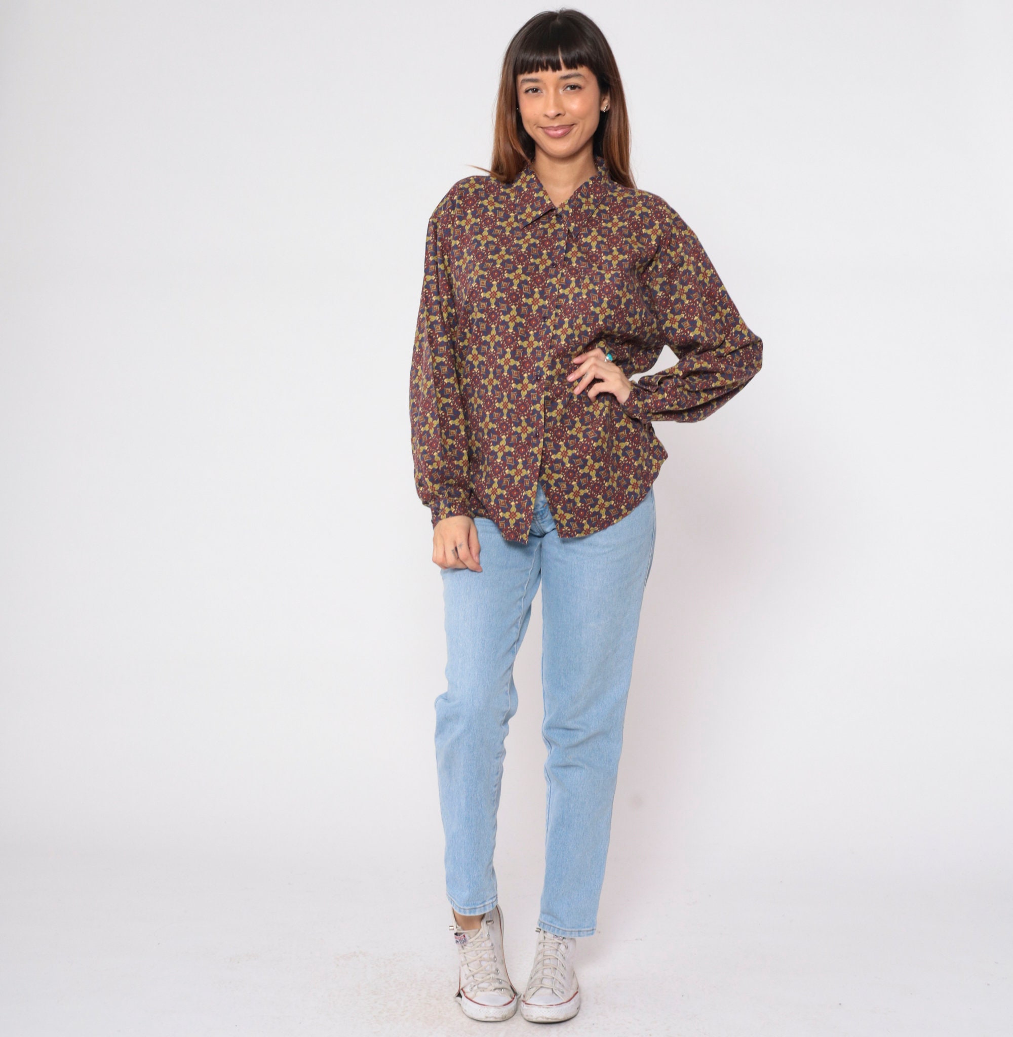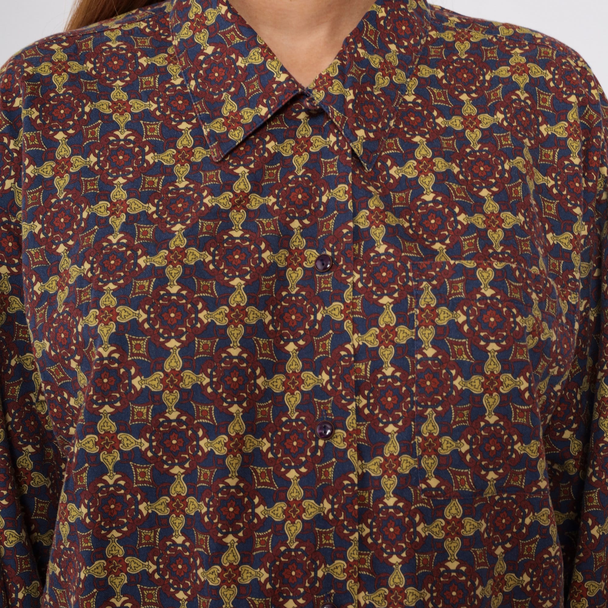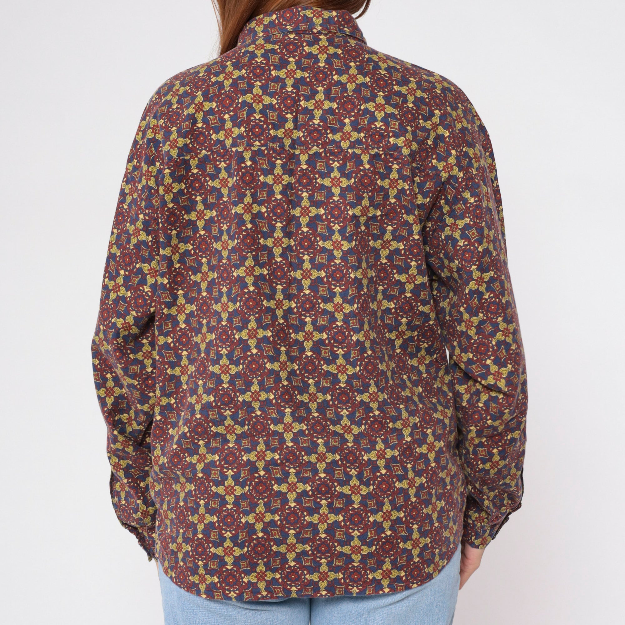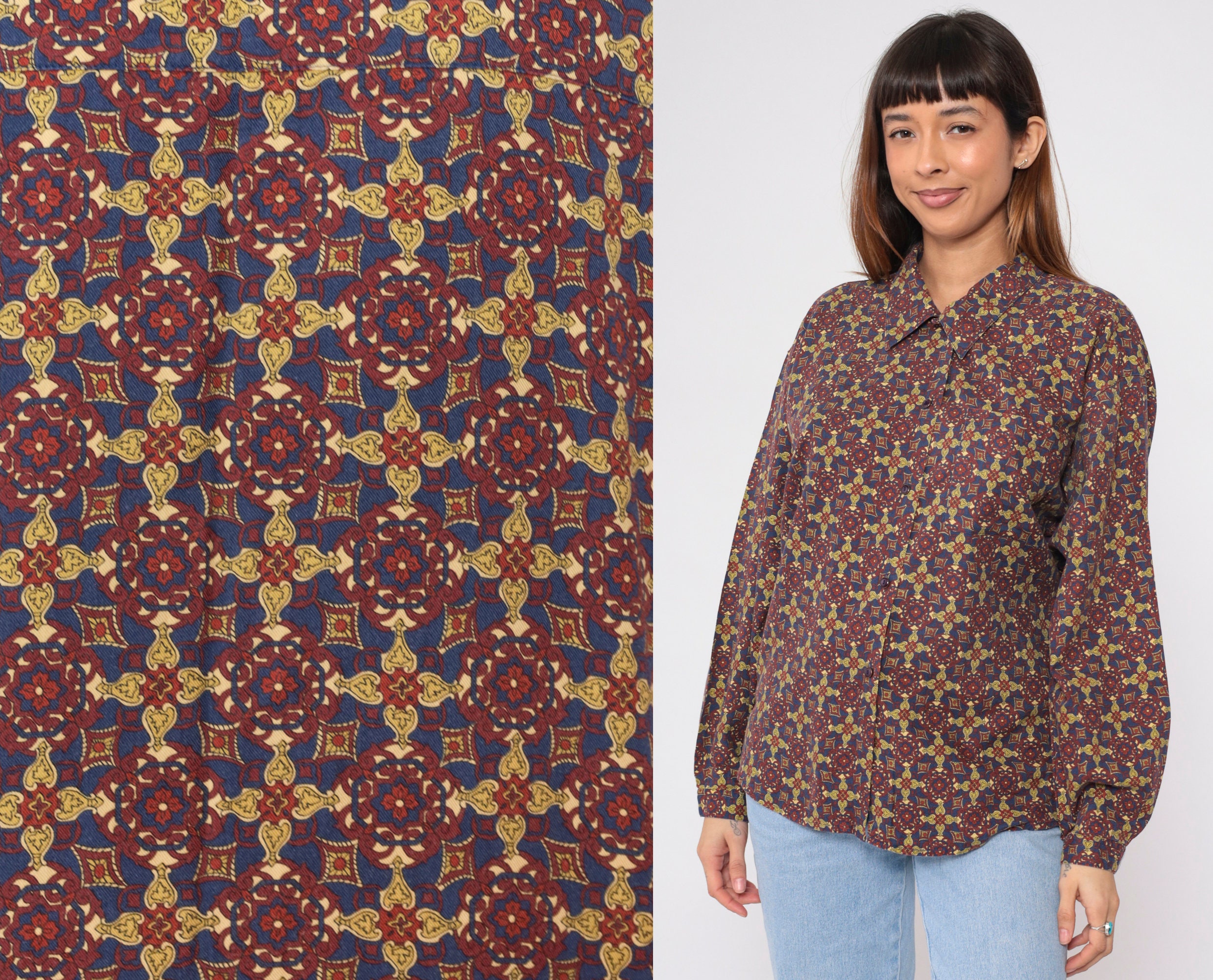 Vintage 90s shirt in a Geometric floral print. It has long sleeves and buttons up the front.
