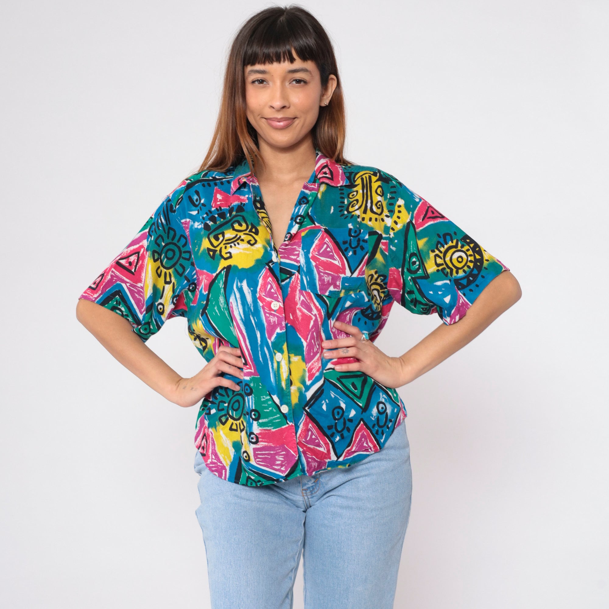 Vintage 90s shirt in black with an abstract Geometric print. Buttons up the front with short sleeves.