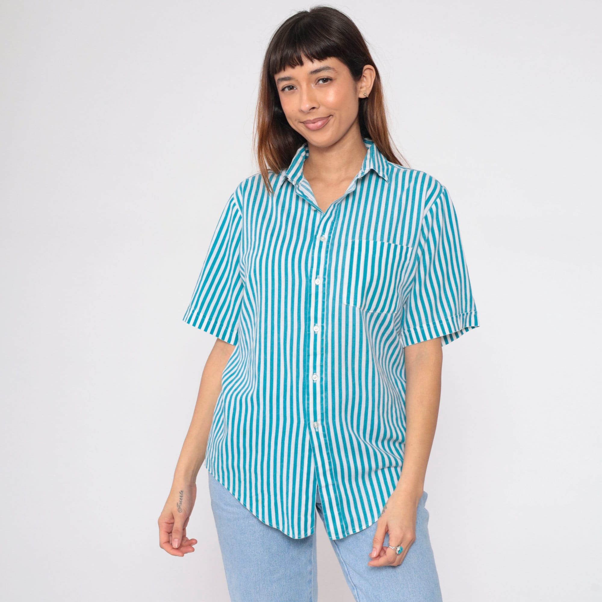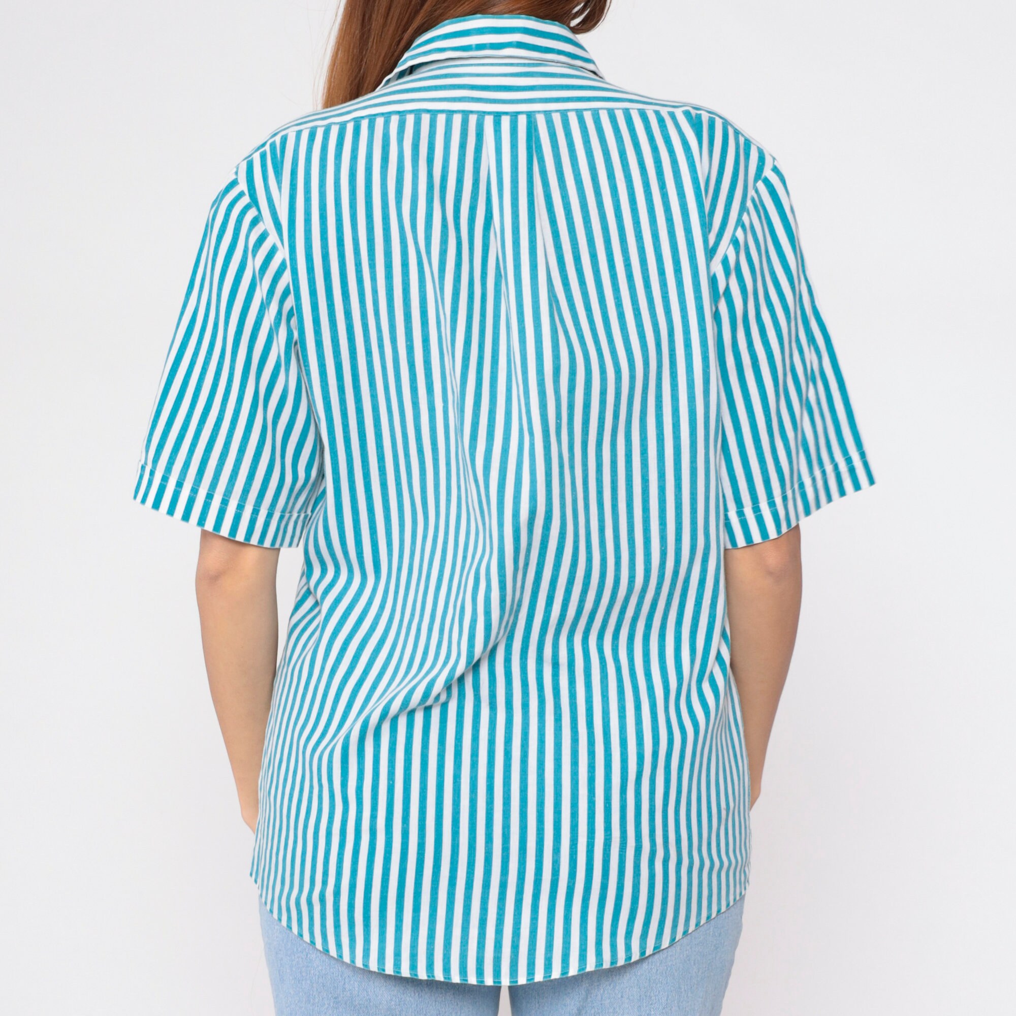 Vintage 90s shirt in blue and white vertical stripes with a pocket on the chest. Buttons up the front.