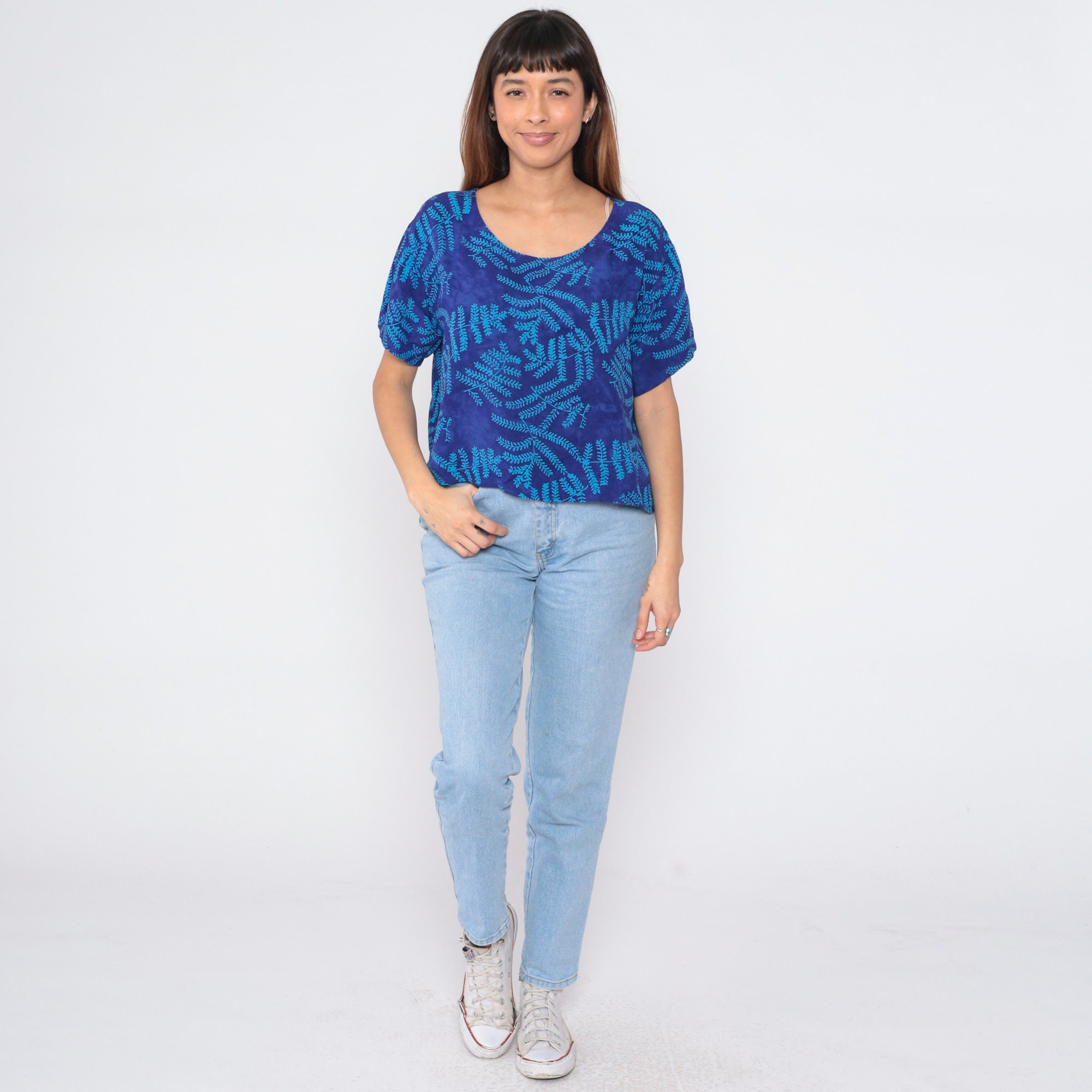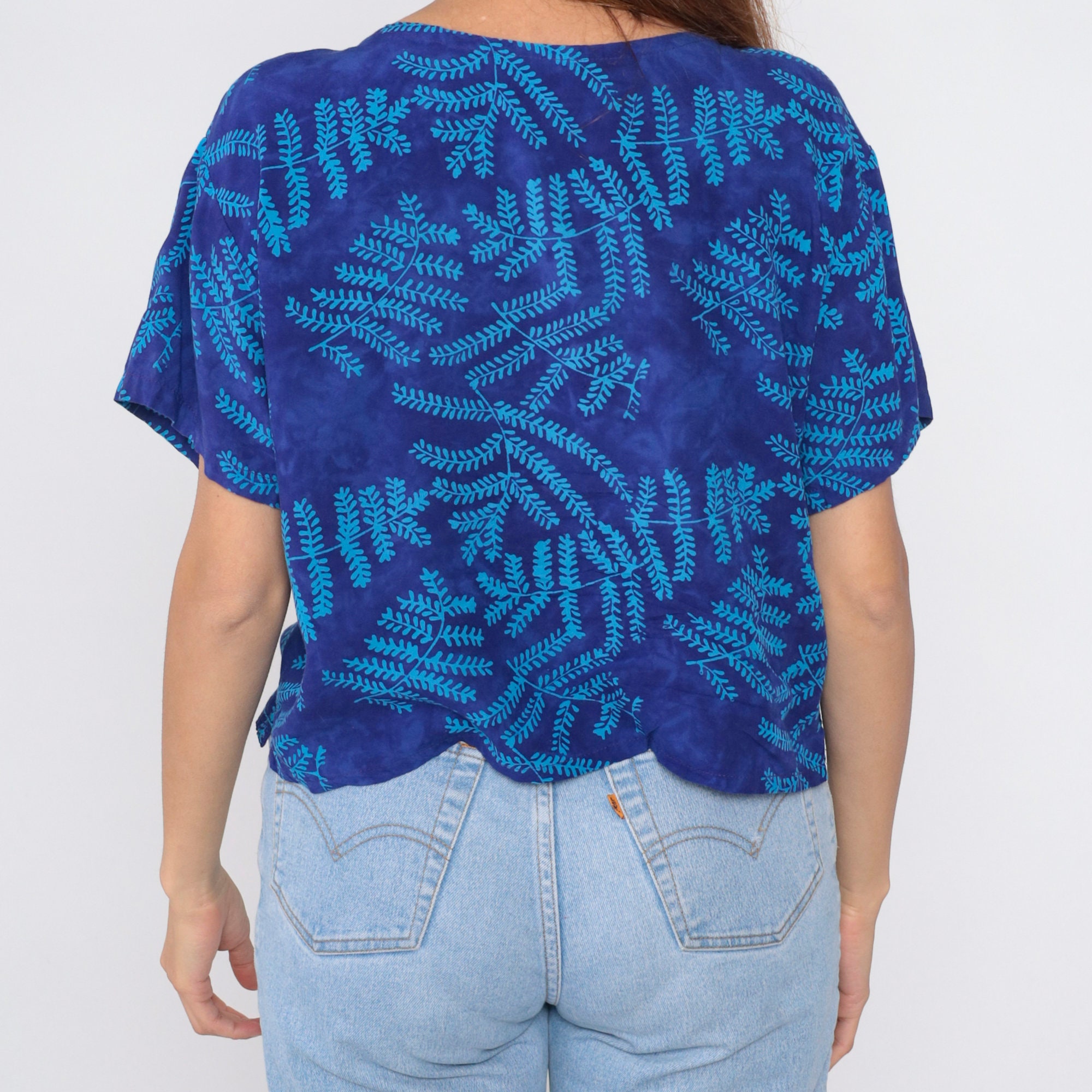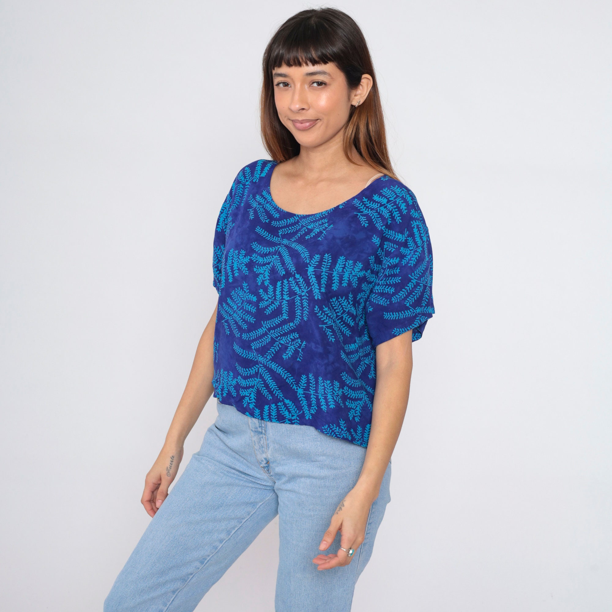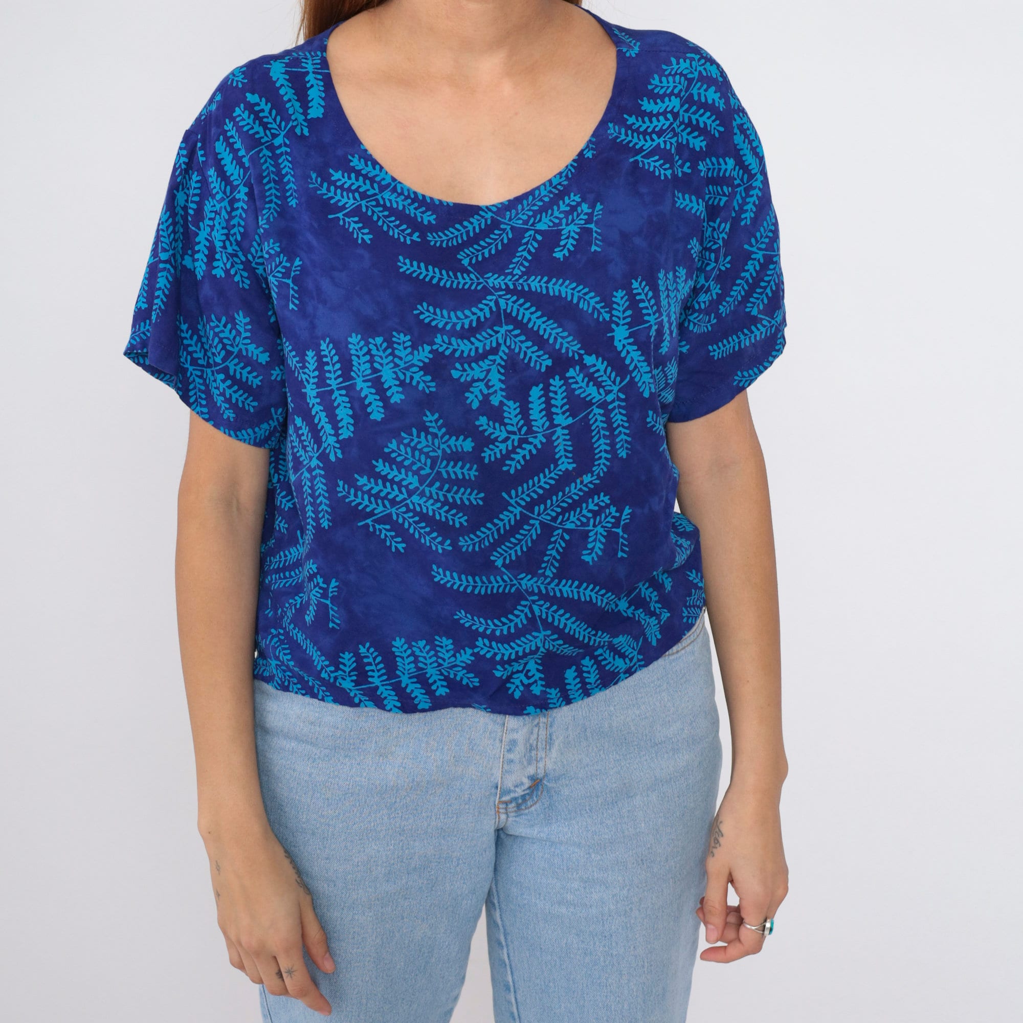 Vintage 90s shirt in blue with a tropical leaf print. It has a loose fit, short sleeves and a scoop neck.