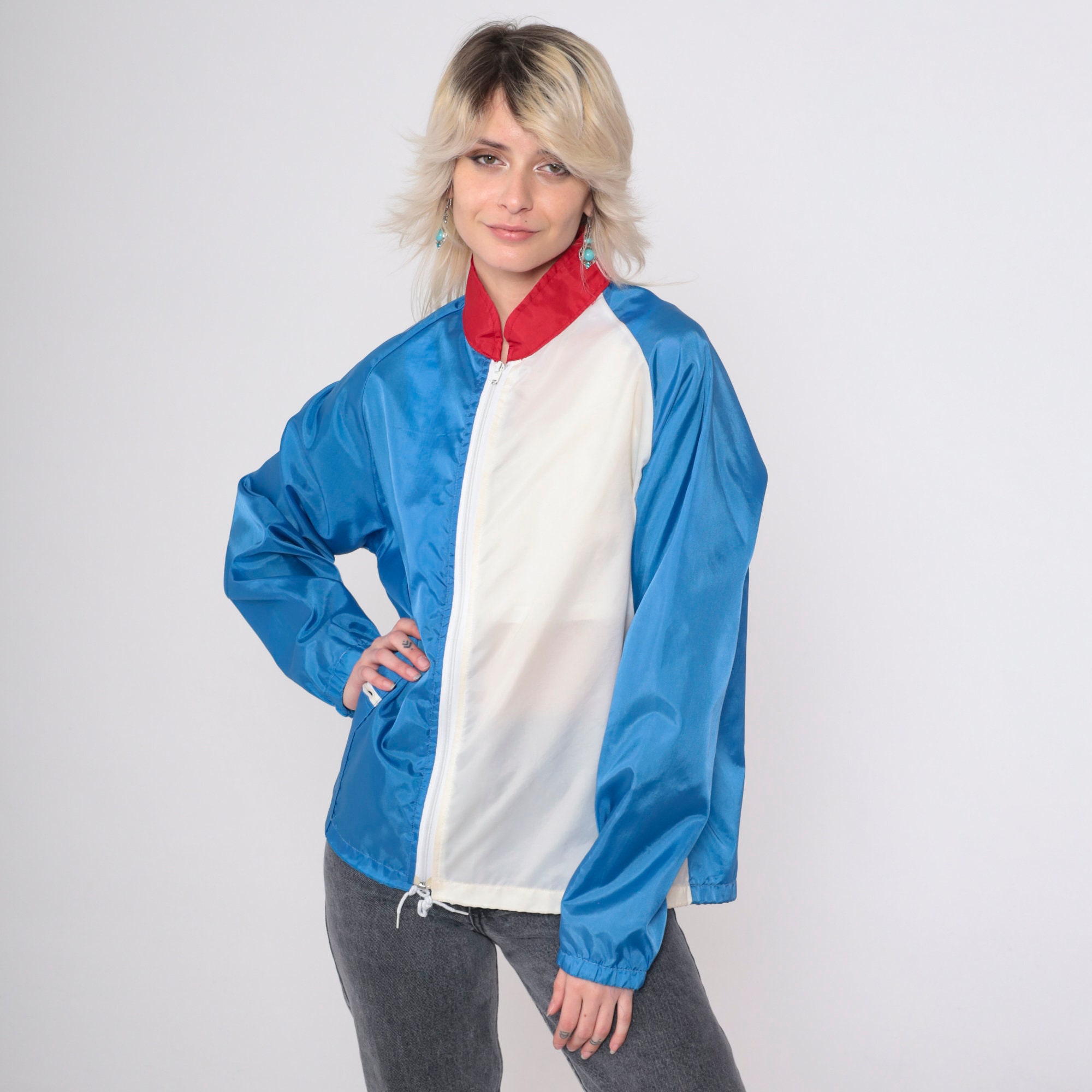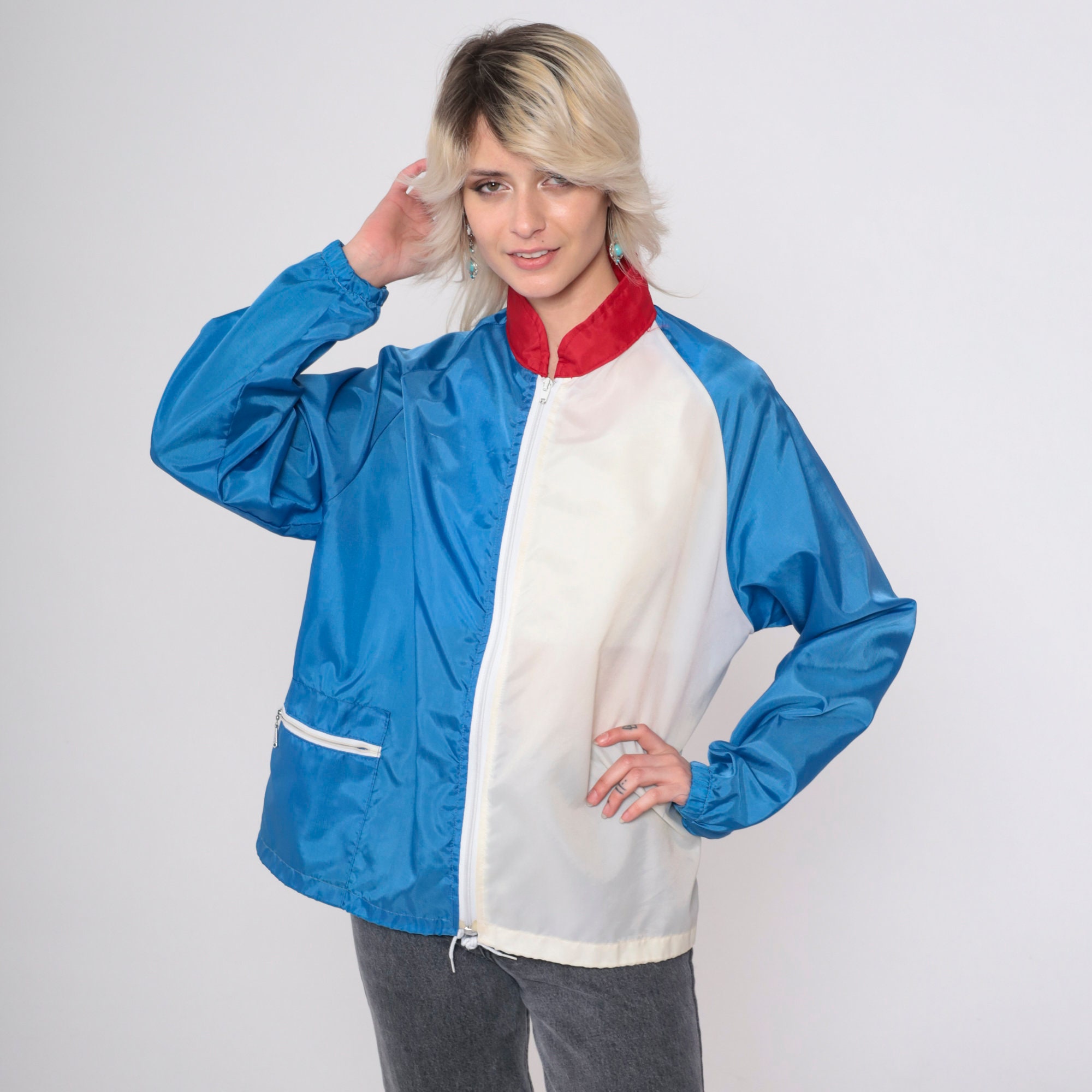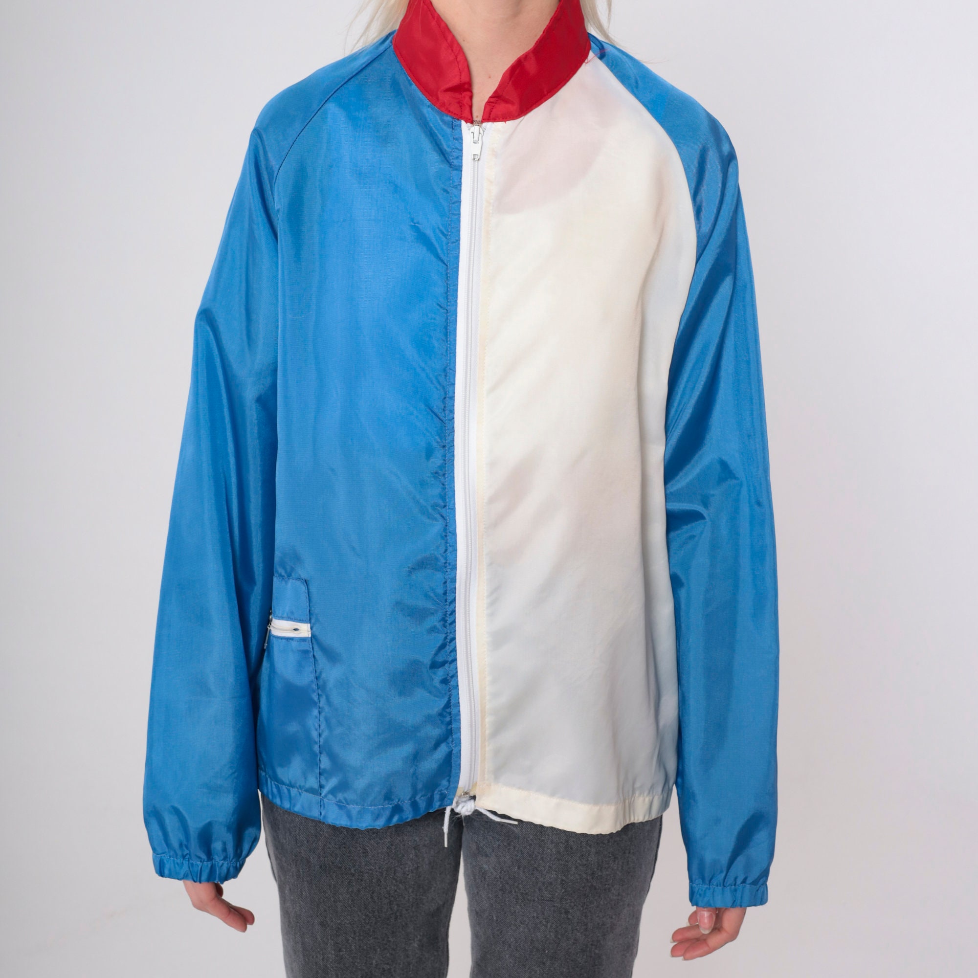 Vintage 80s jacket in blue and white colour blocking with a red collar. It has a full zipper and raglan sleeves.