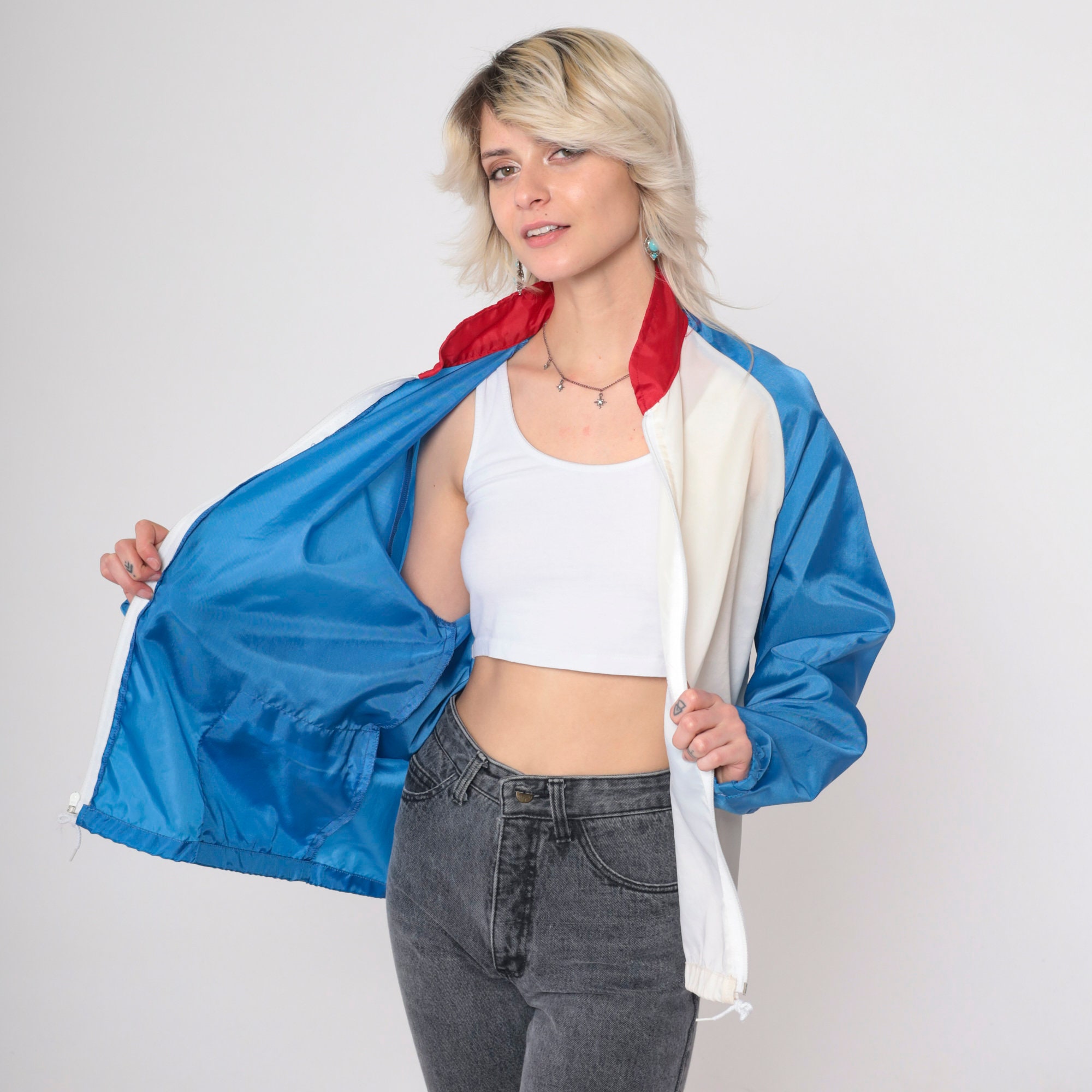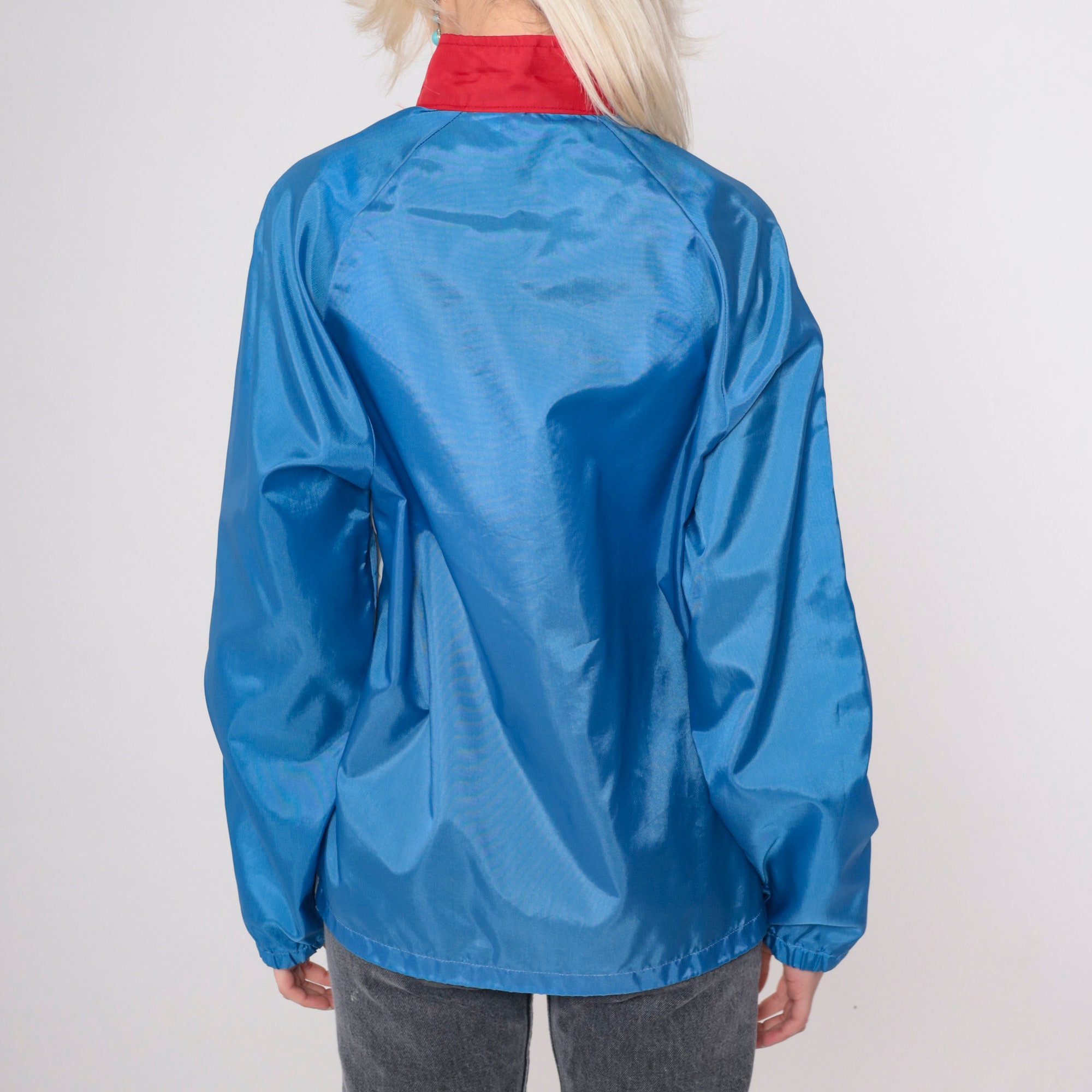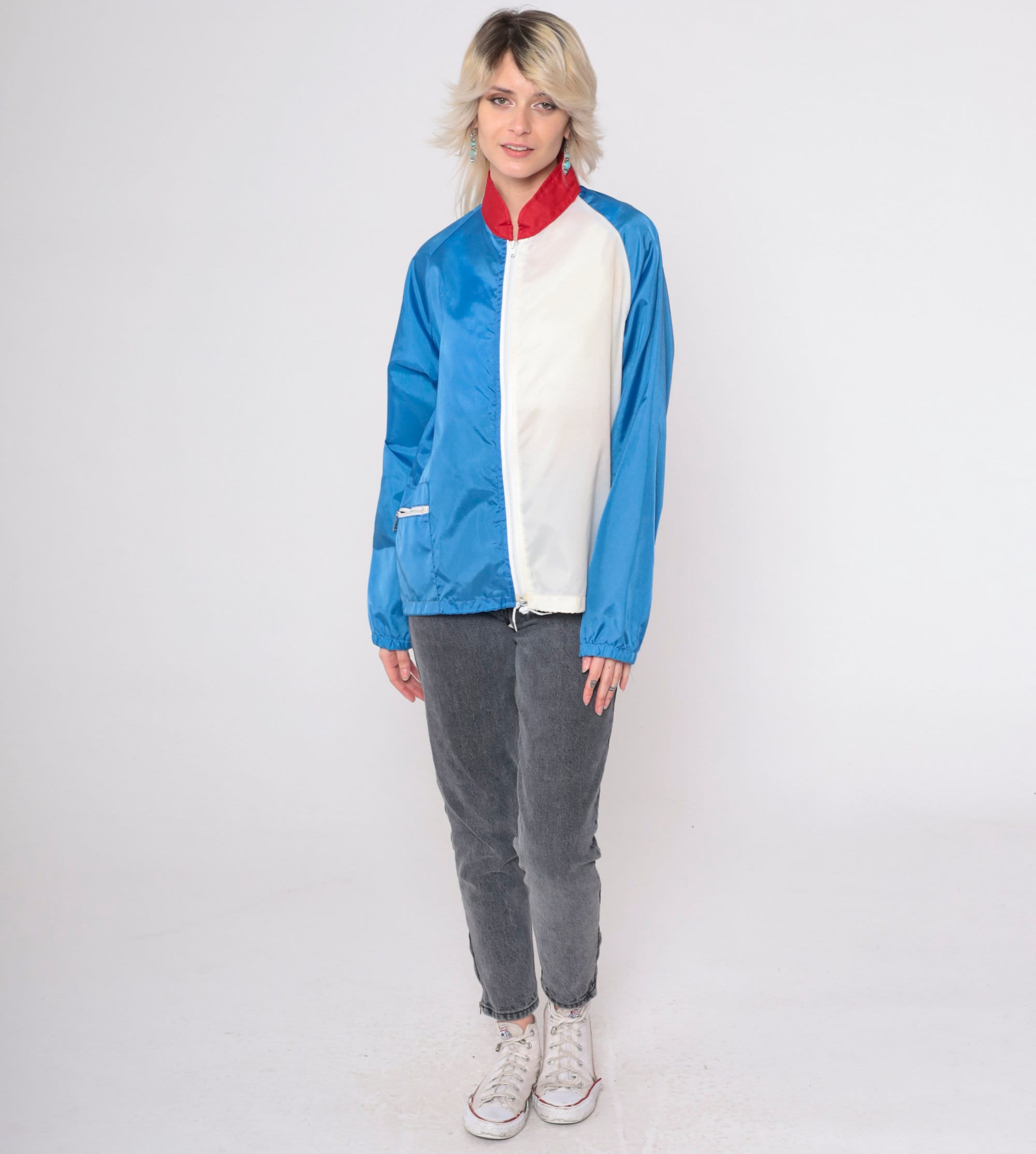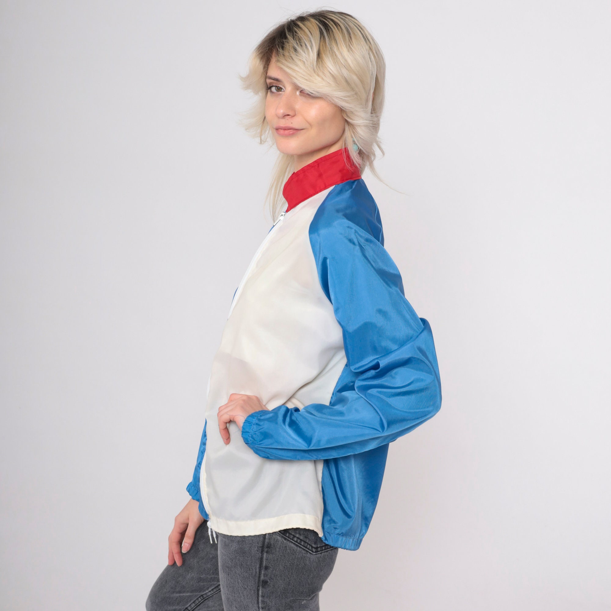 Vintage 80s jacket in blue and white colour blocking with a red collar. It has a full zipper and raglan sleeves.