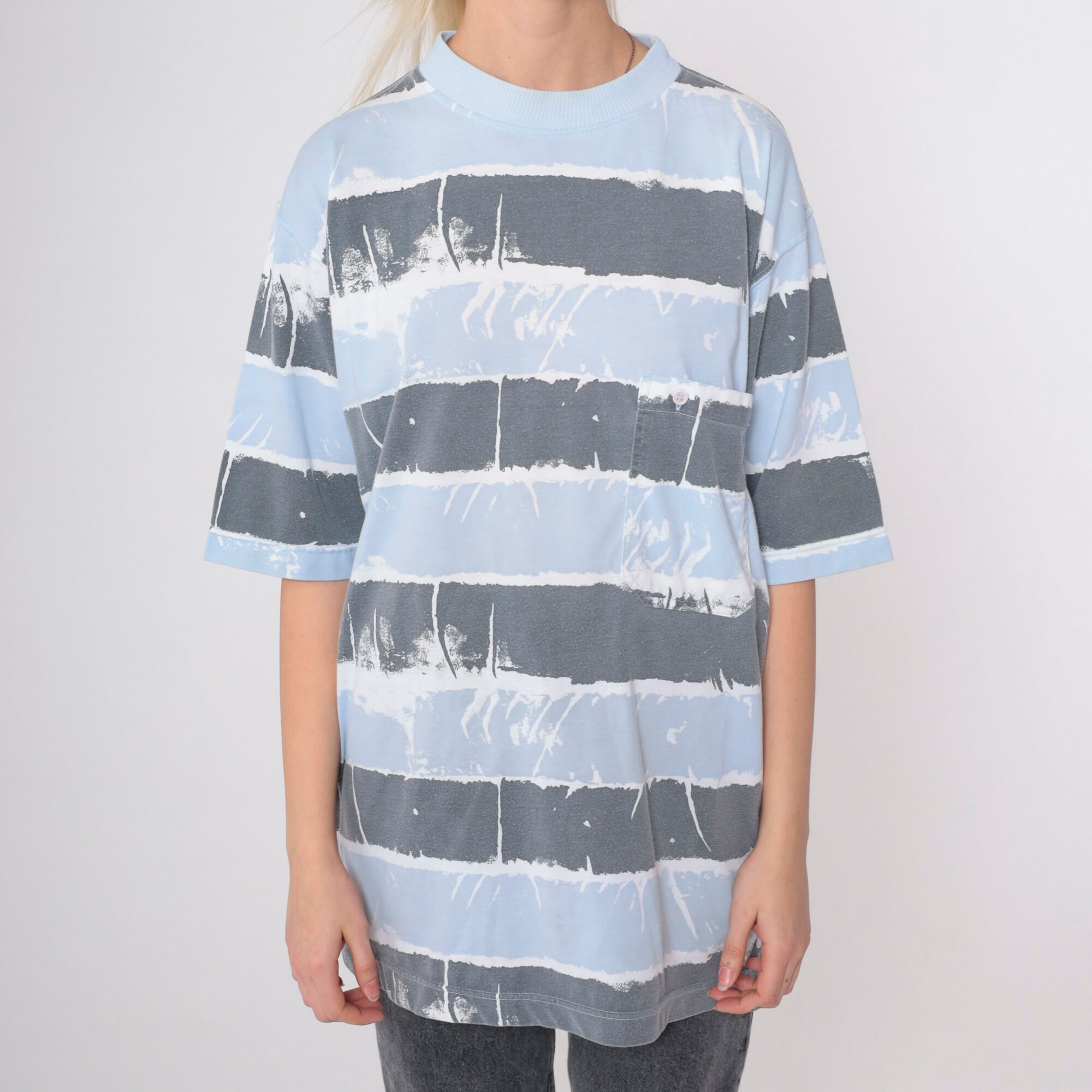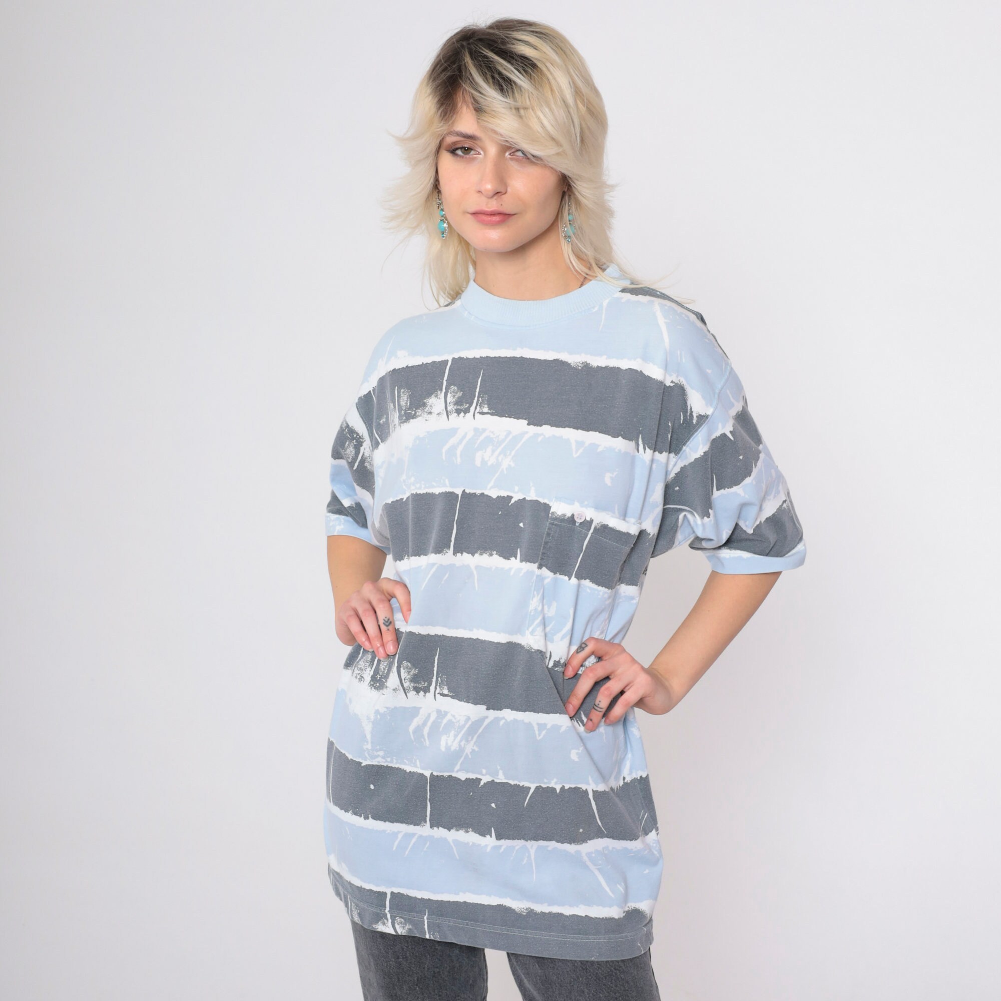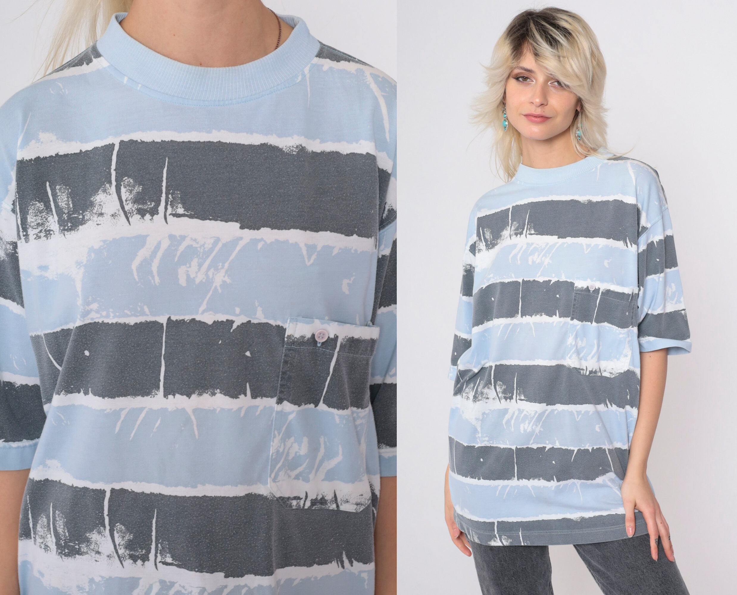 Vintage 90s t shirt with grey, white and blue stripes with a painted look. Short sleeved with a pocket on the chest.