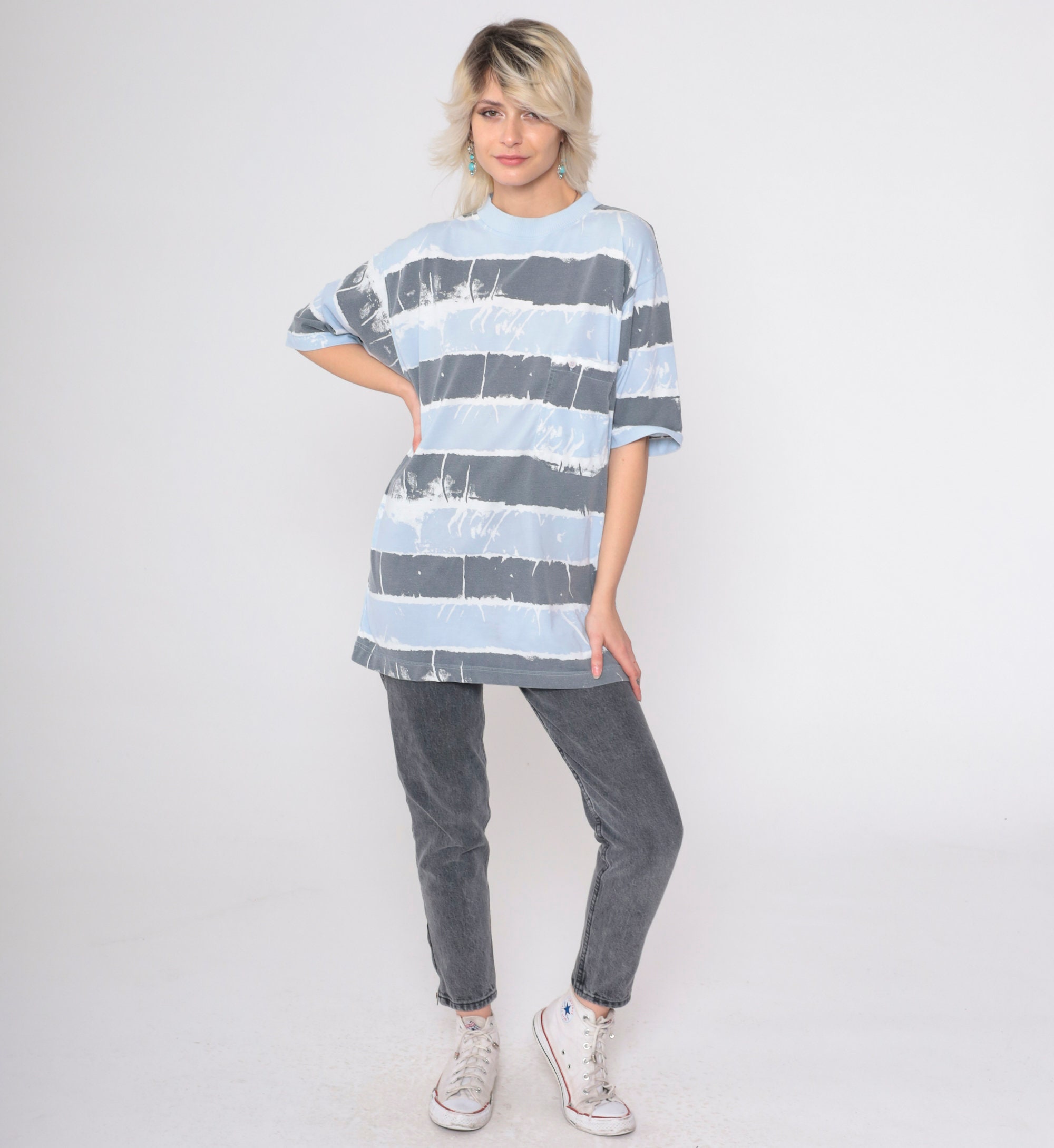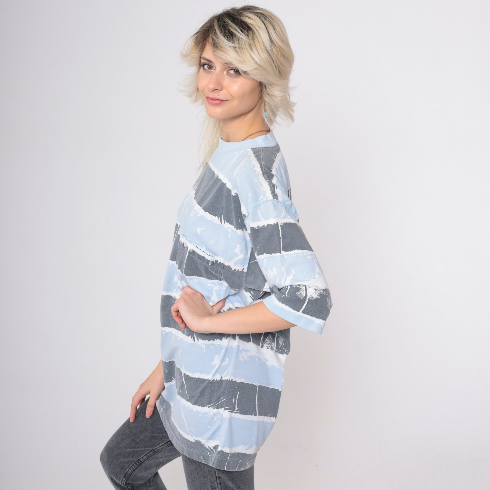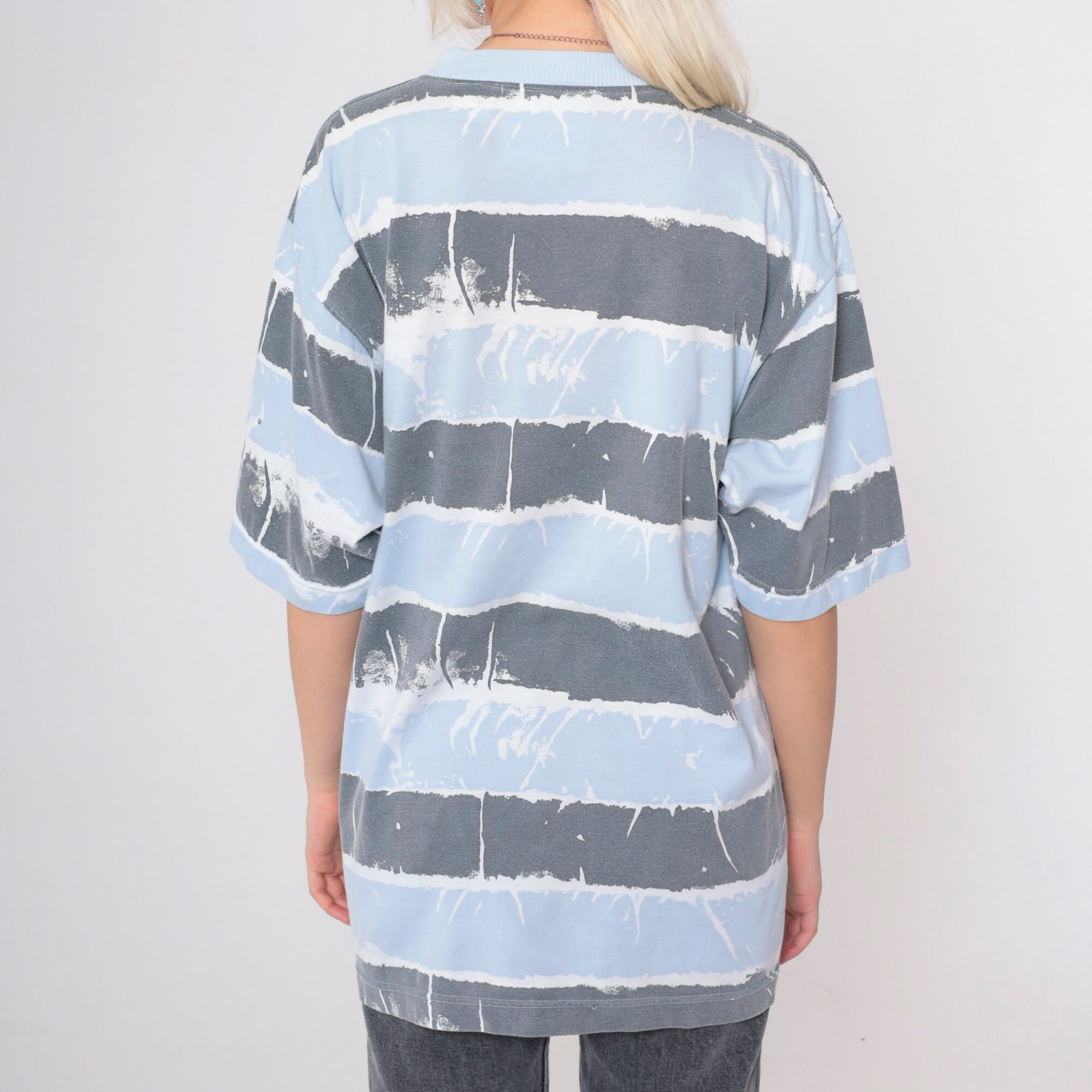 Vintage 90s t shirt with grey, white and blue stripes with a painted look. Short sleeved with a pocket on the chest.