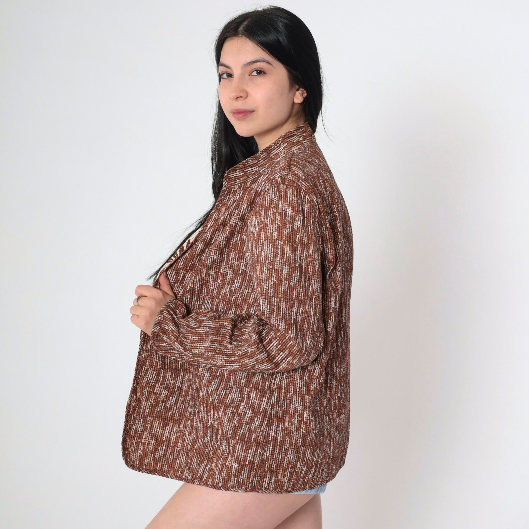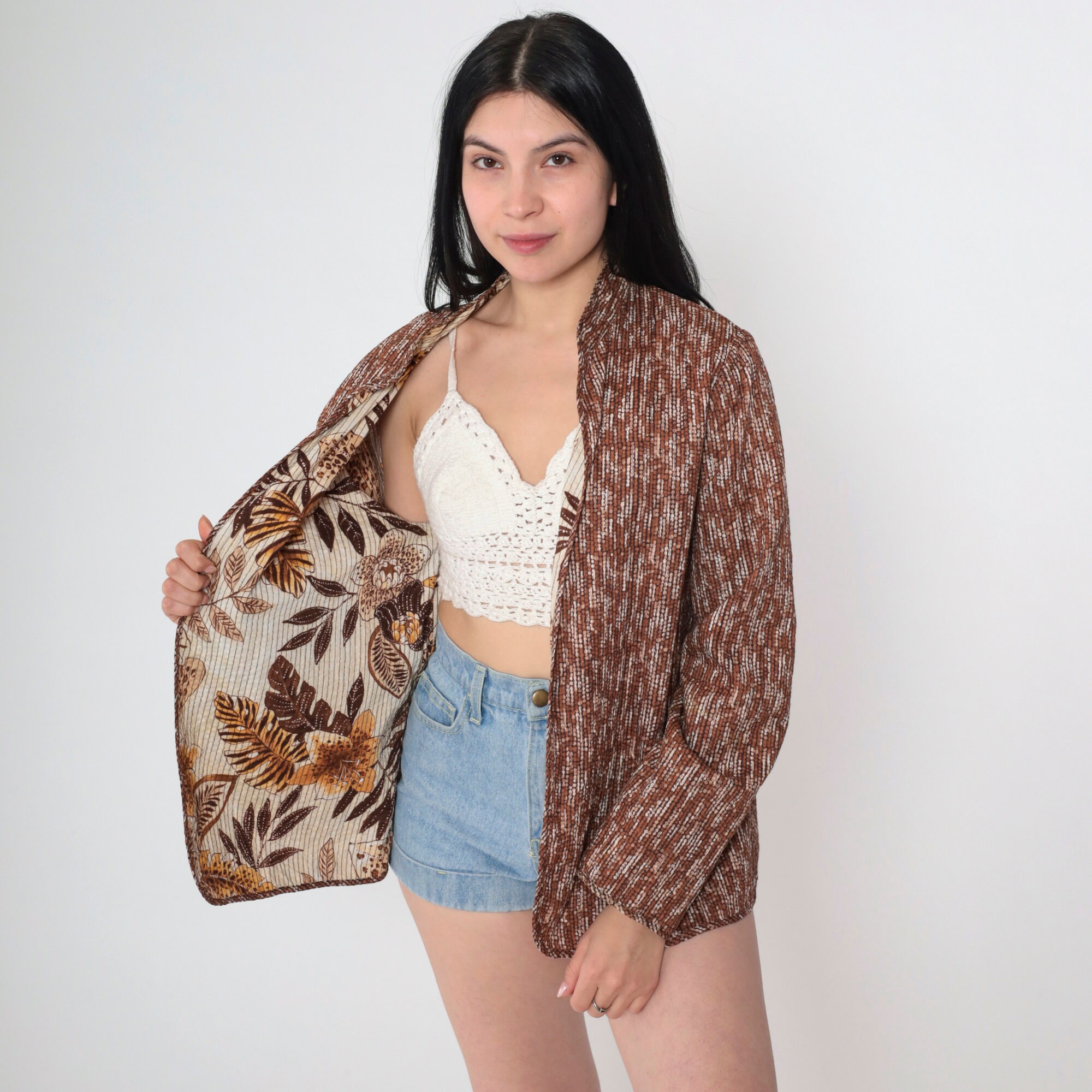 Y2K reversible jacket with a tropical leopard and floral print on one side, and a dot print on the other. Open in front and has a mandarin collar.