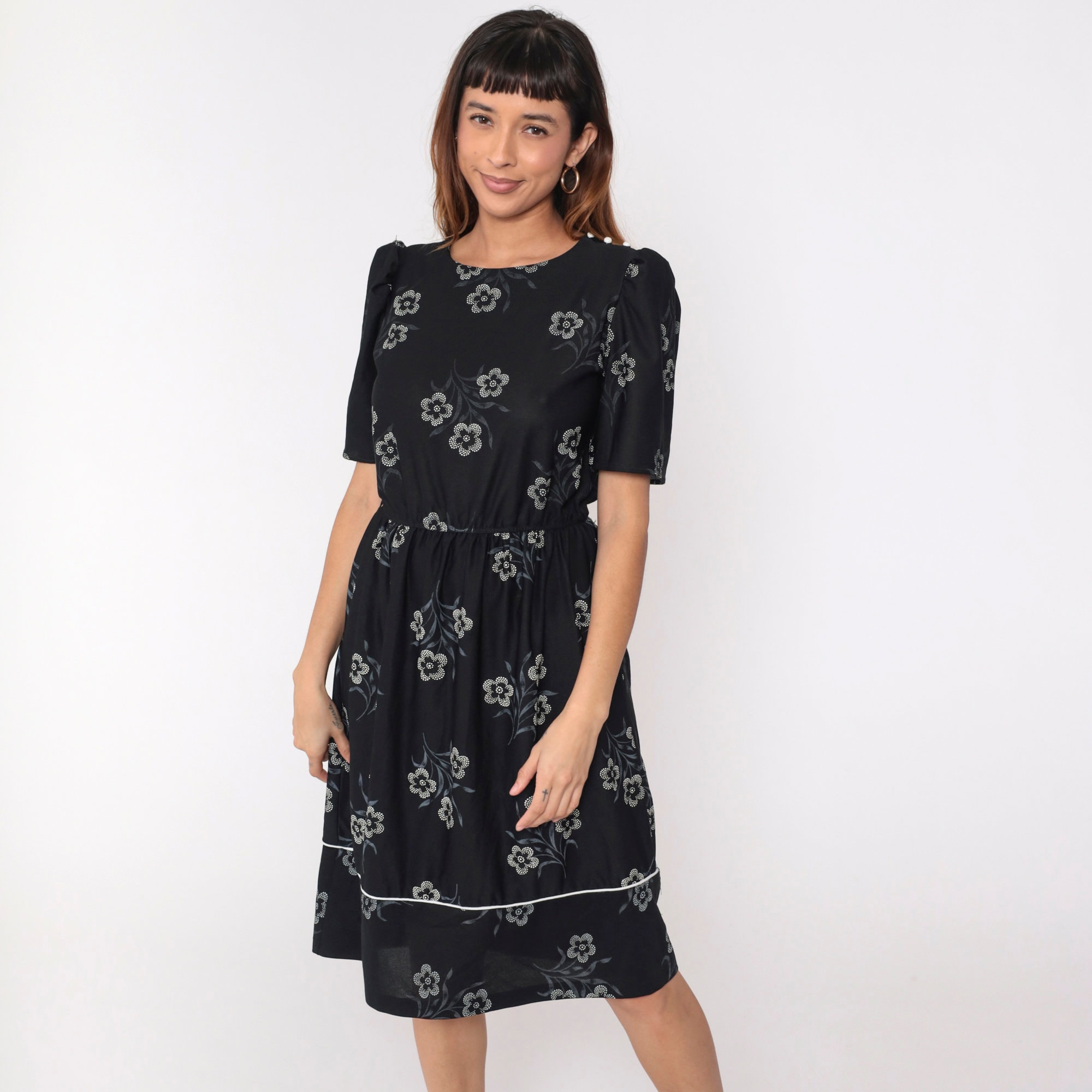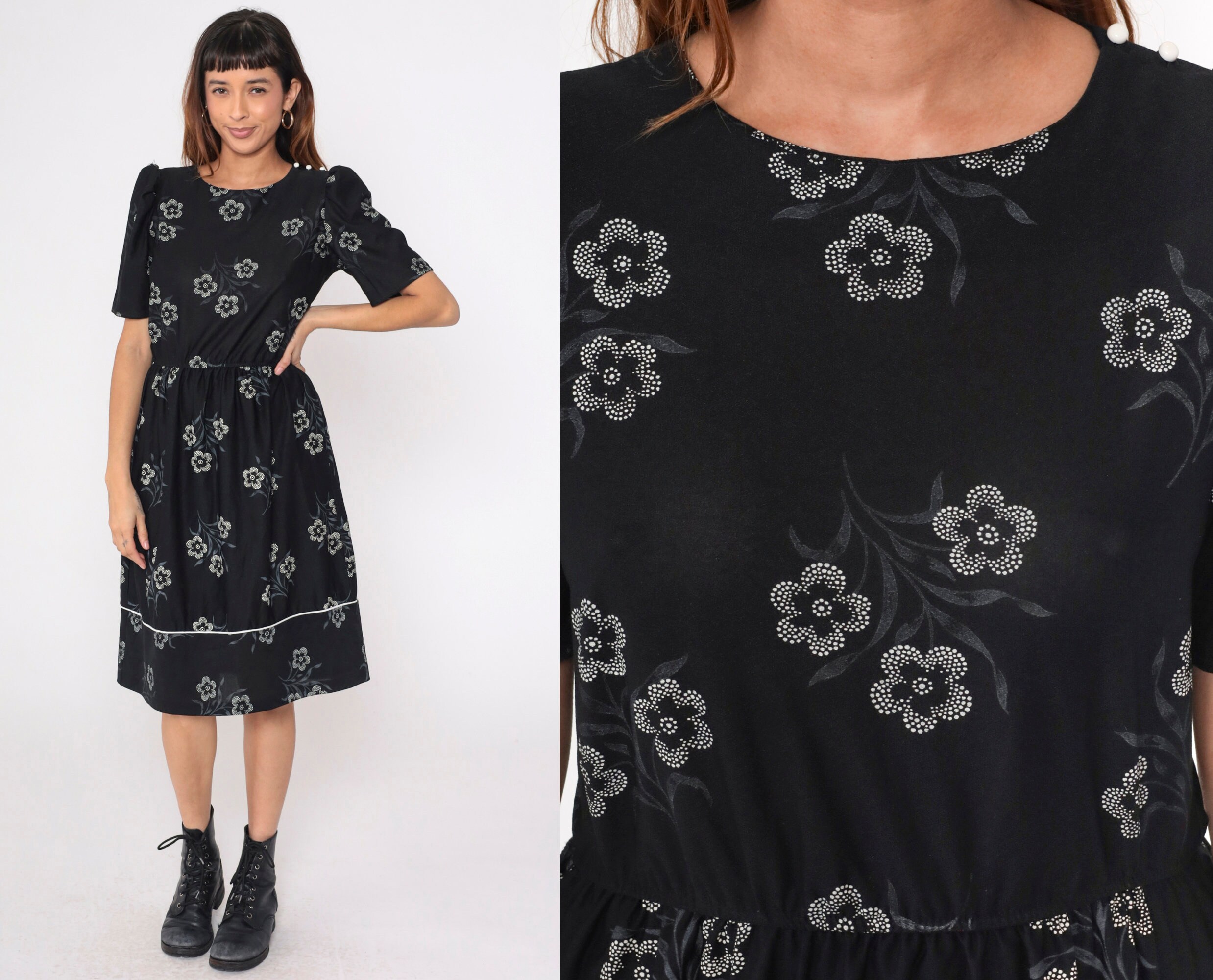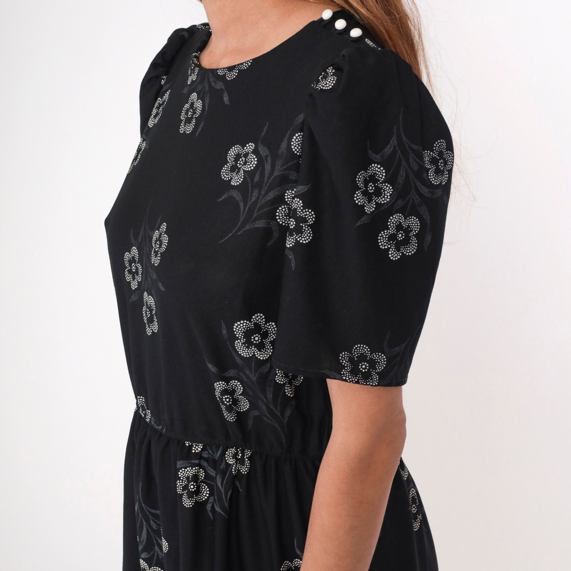Vintage 80s dress in black with a white floral print. It has a high waist, puff sleeves and buttons on the shoulder.