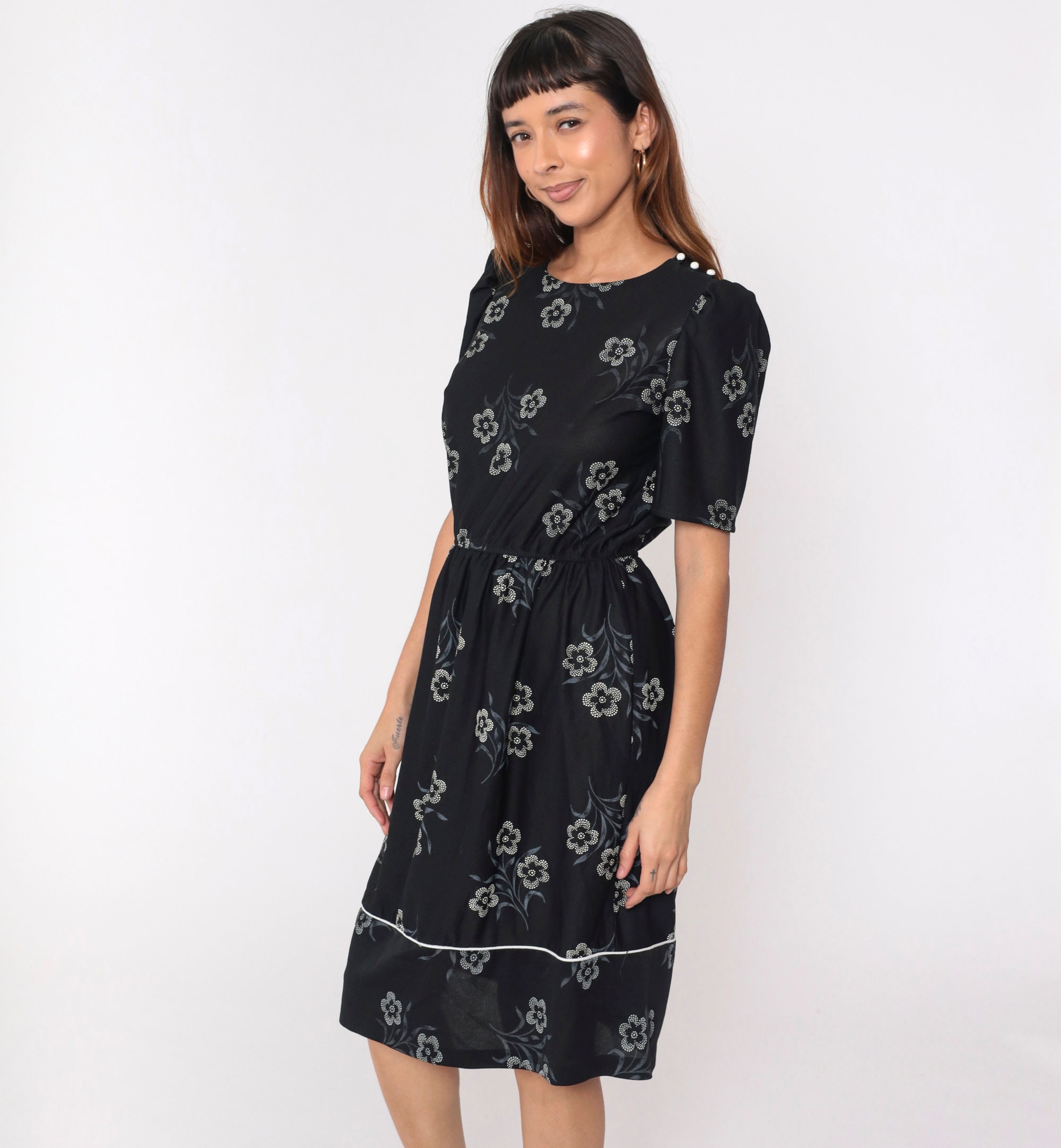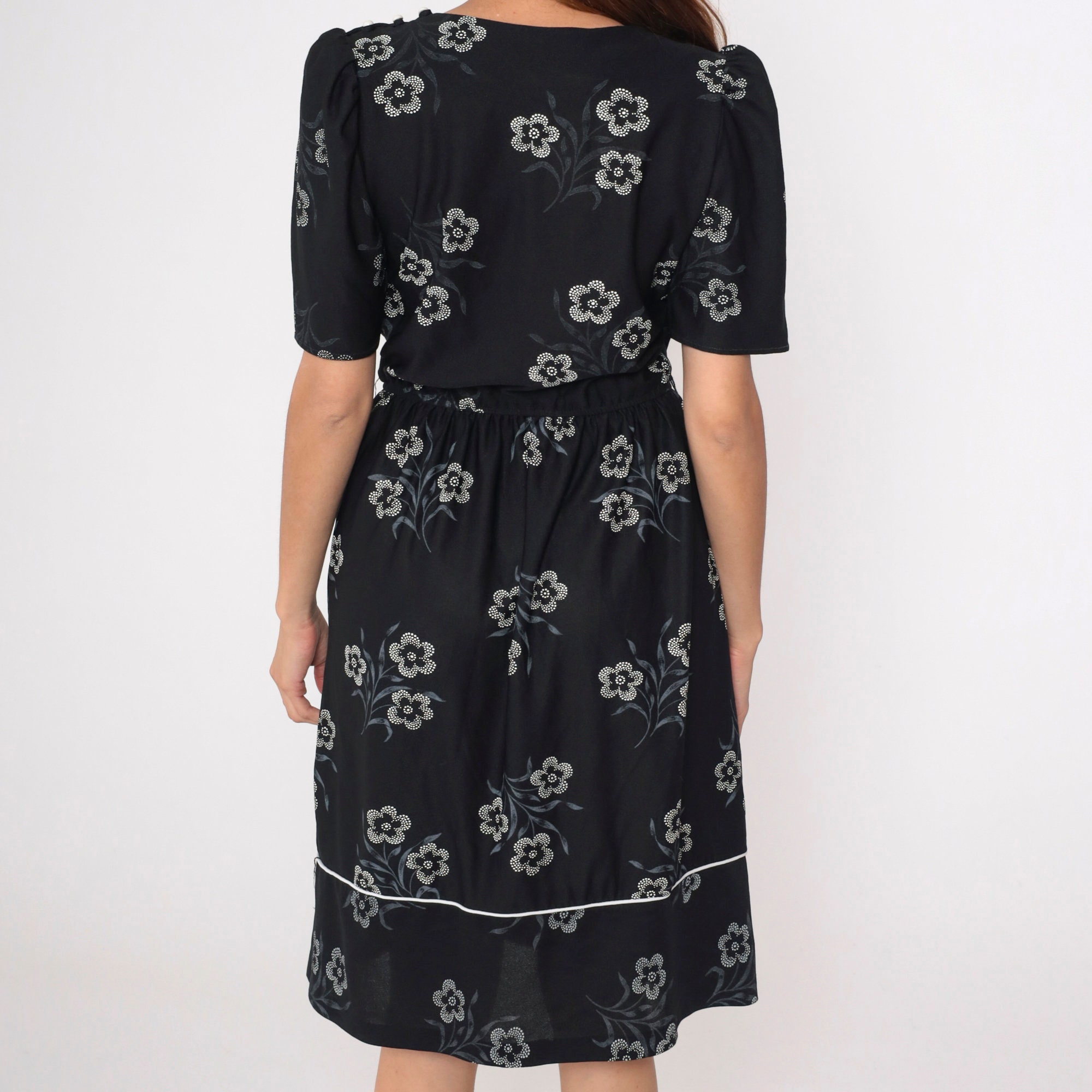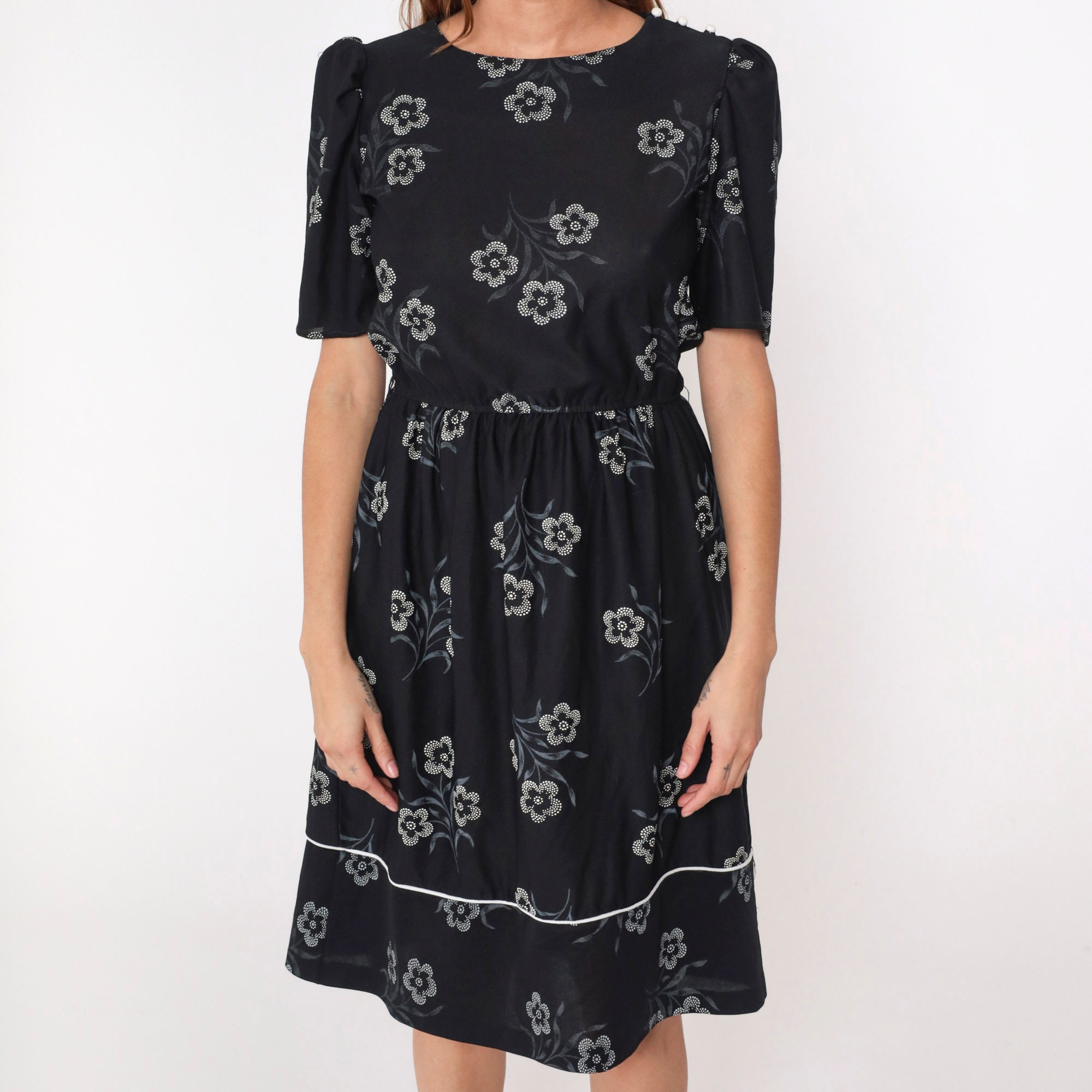 Vintage 80s dress in black with a white floral print. It has a high waist, puff sleeves and buttons on the shoulder.