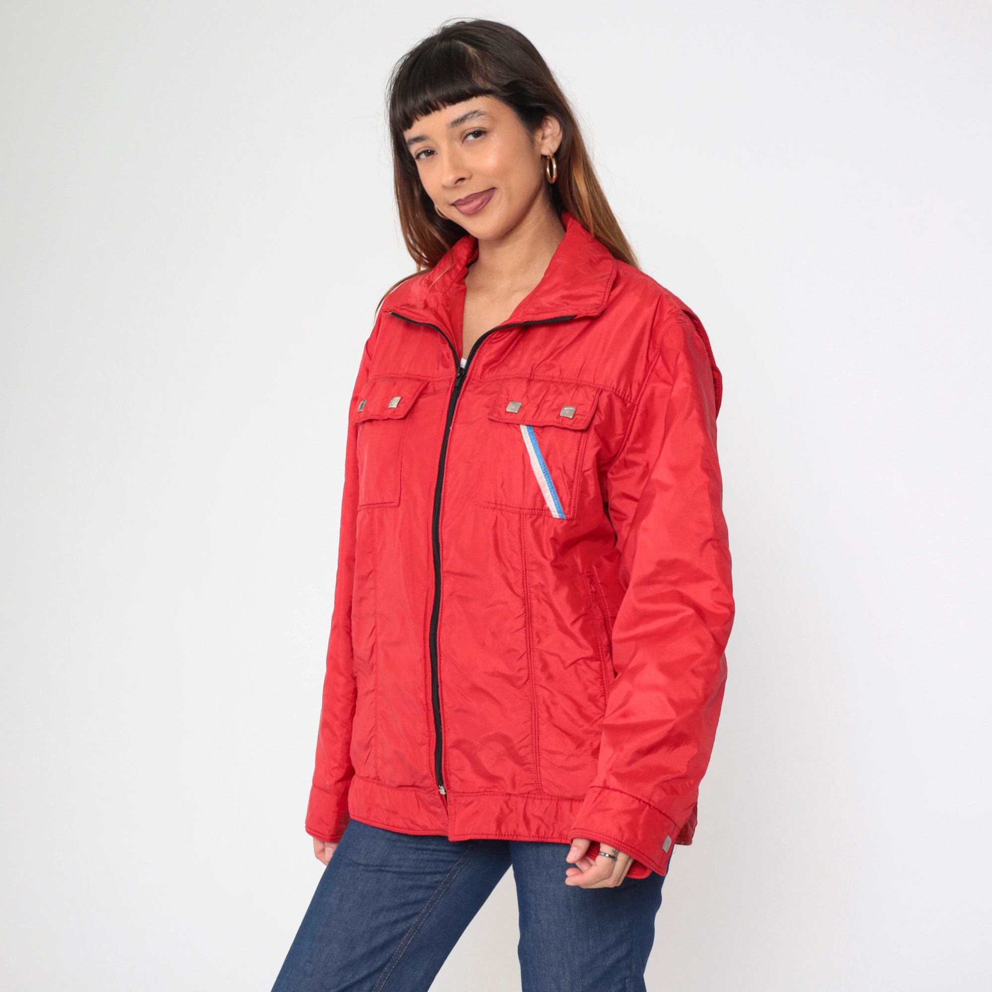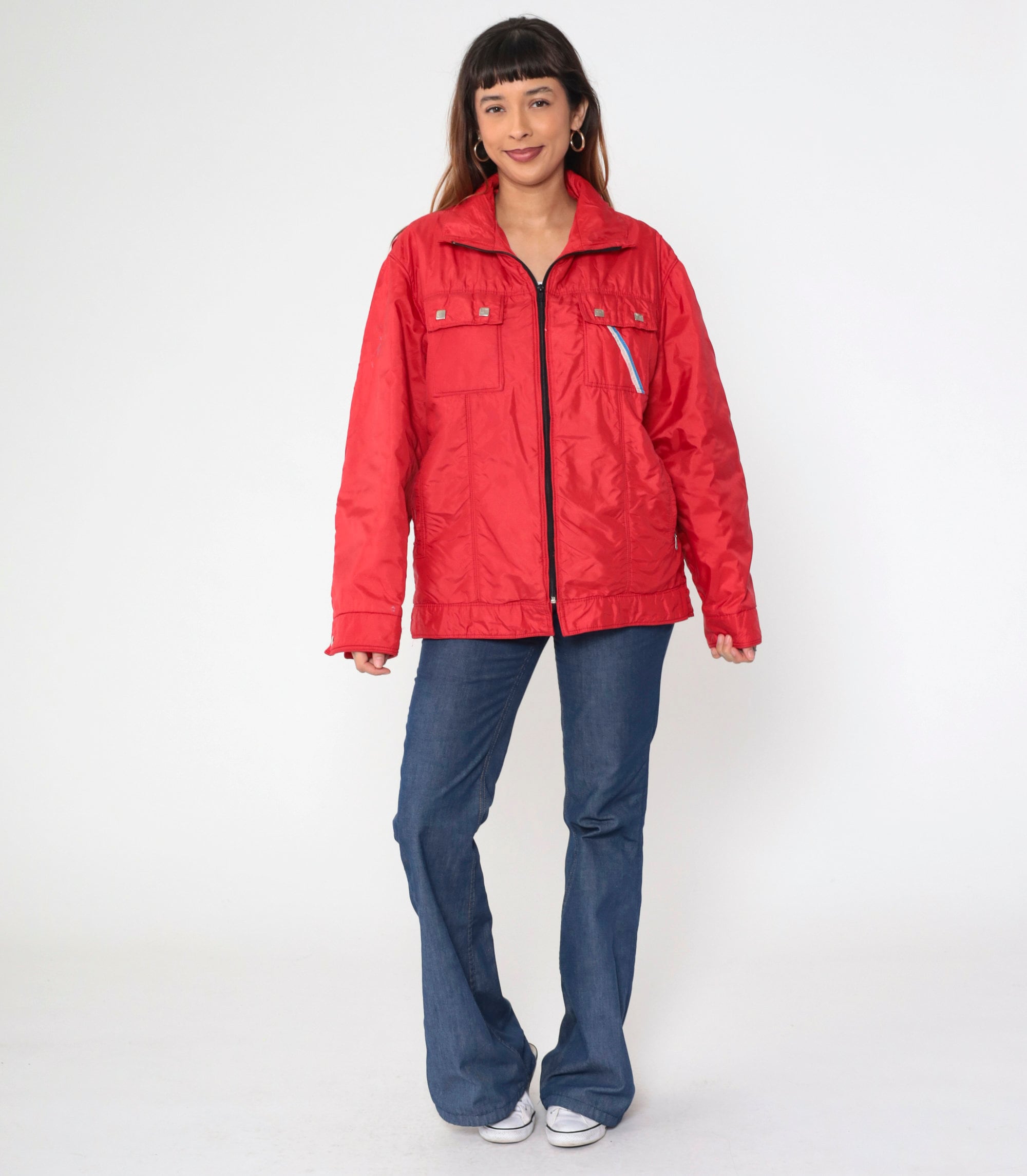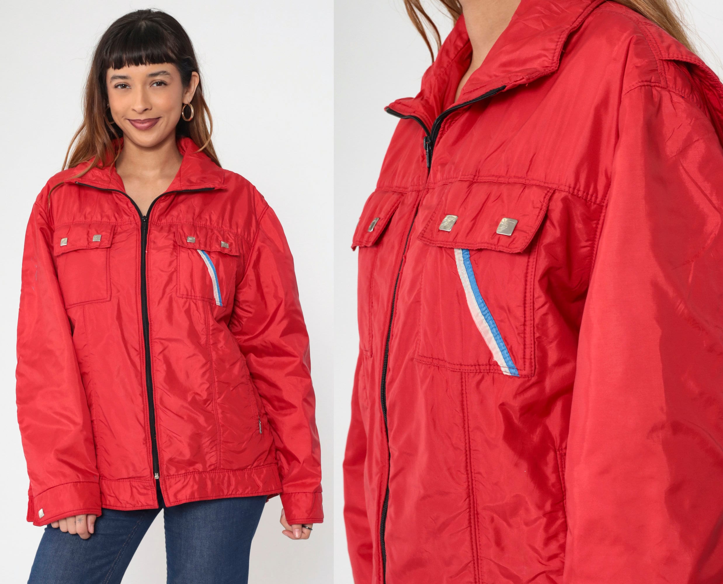 Vintage 80s ski jacket in red with a blue and white stripe on the chest pocket and a zipper up the front.