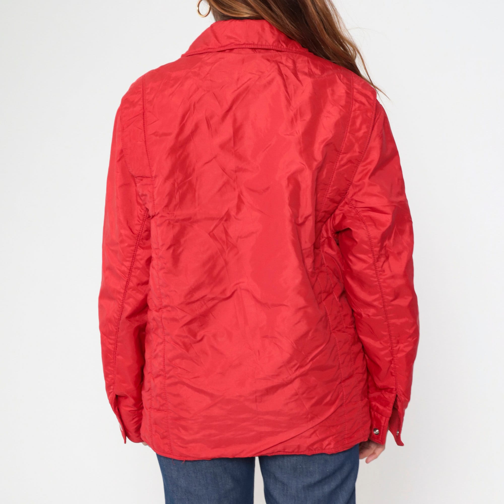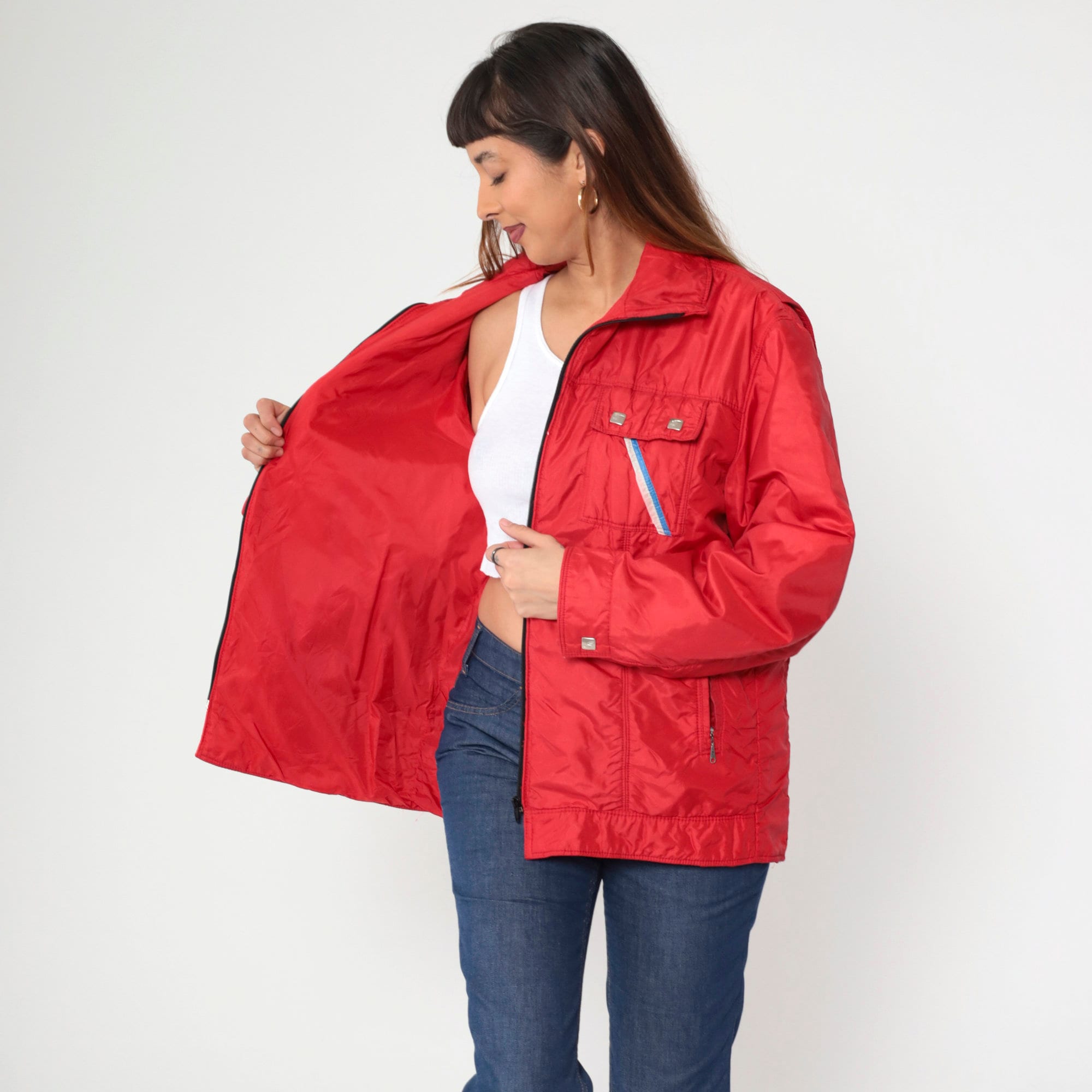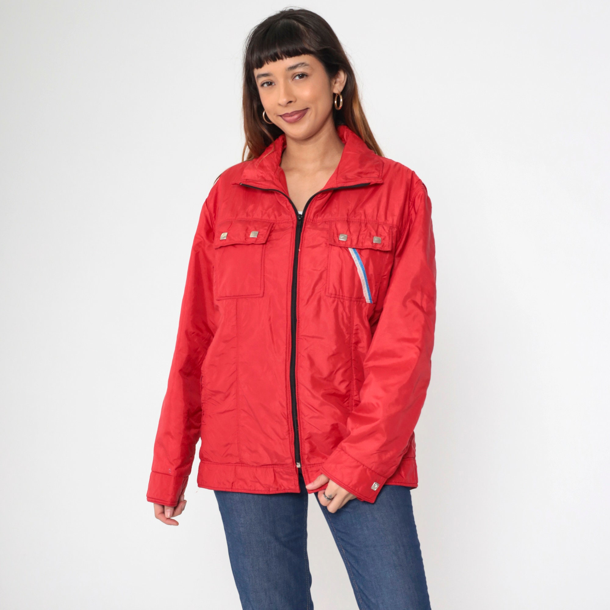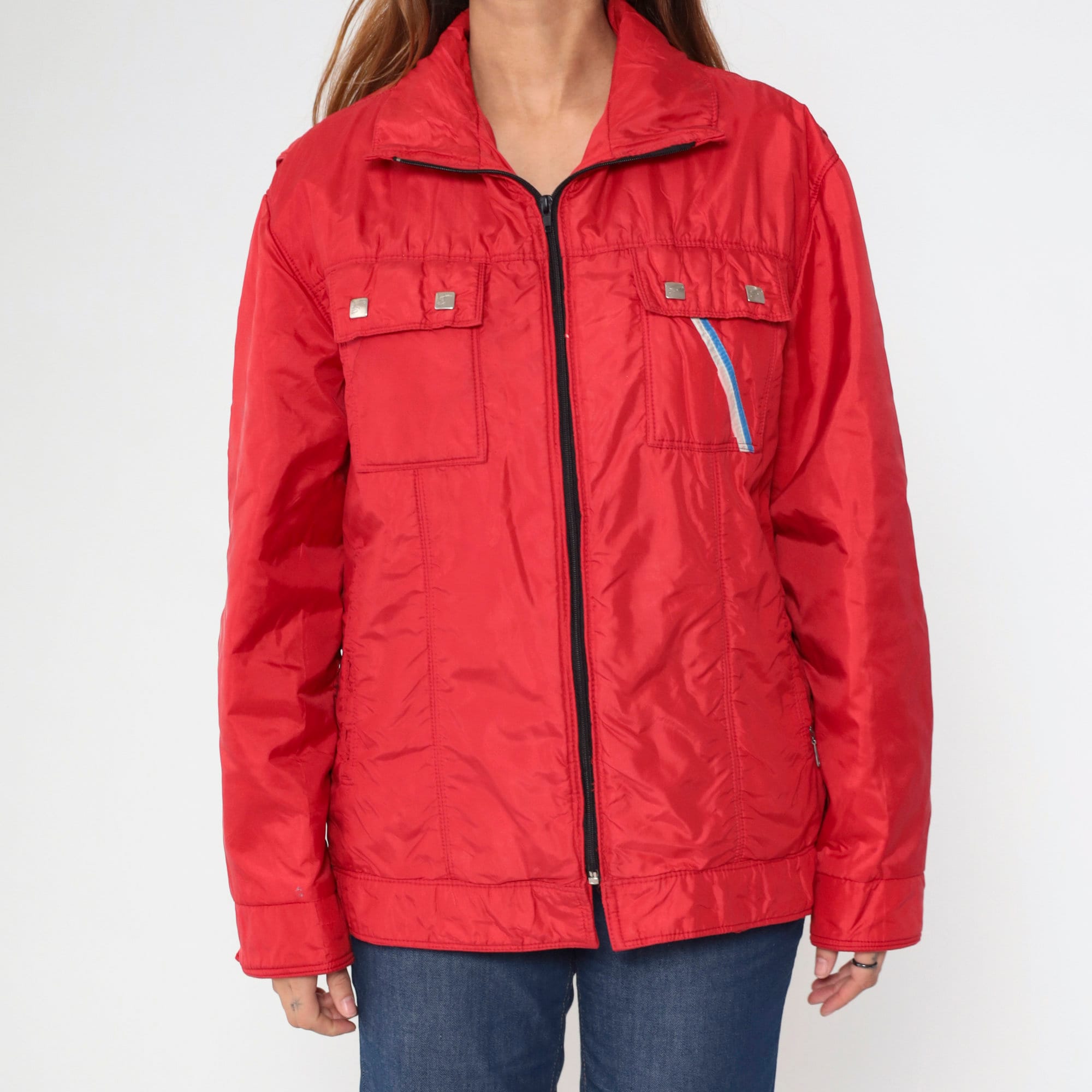 Vintage 80s ski jacket in red with a blue and white stripe on the chest pocket and a zipper up the front.