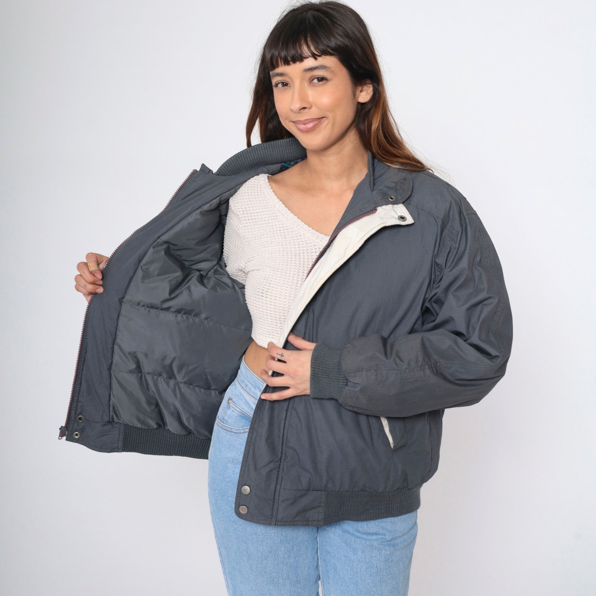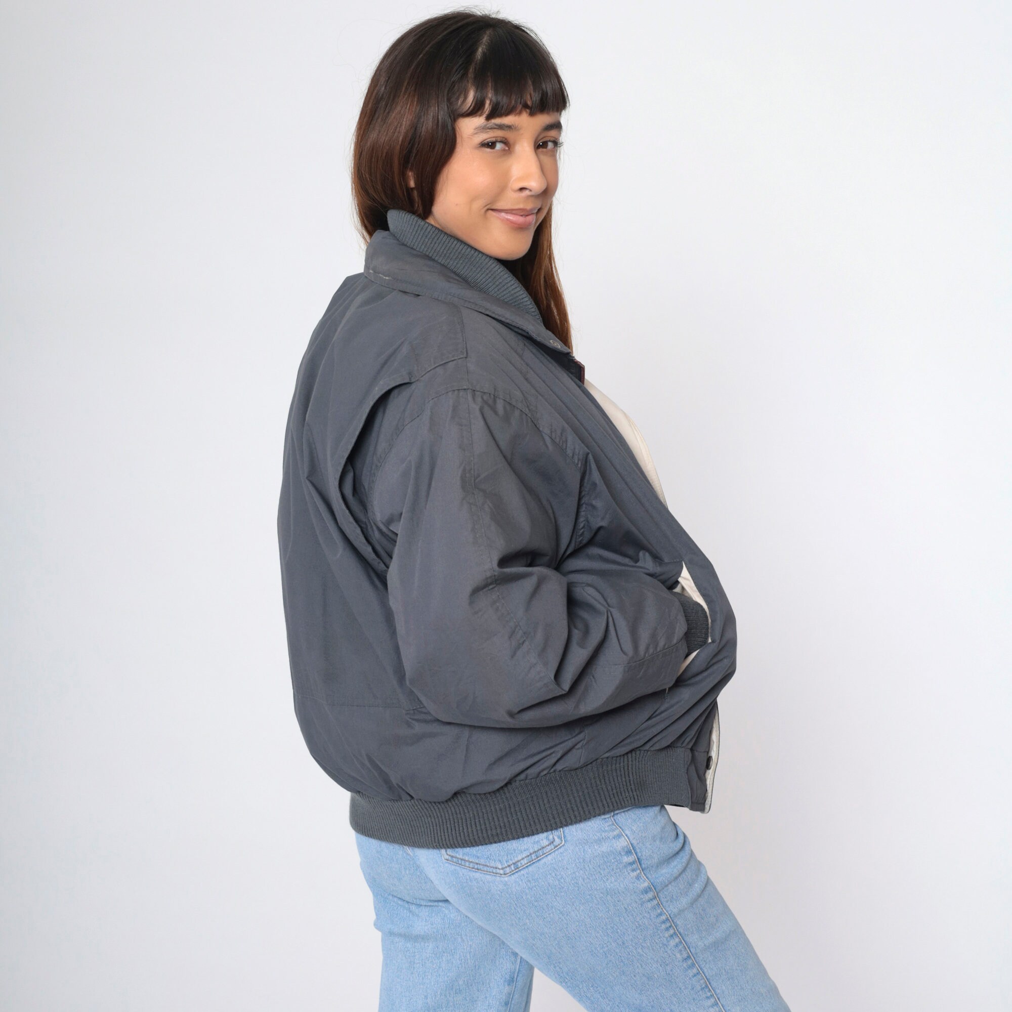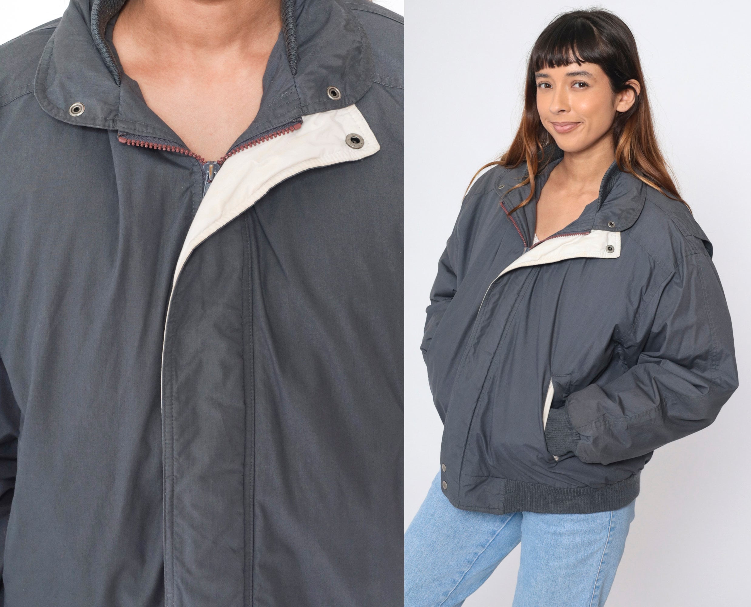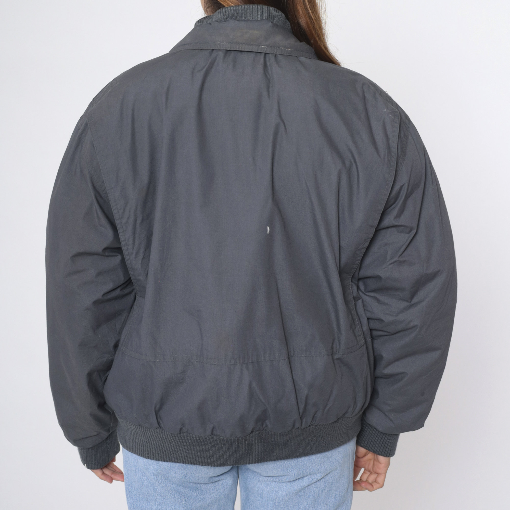 Vintage 80s Members Only jacket in dark grey with a down fill. Zips and snaps up the front. Originally for men.