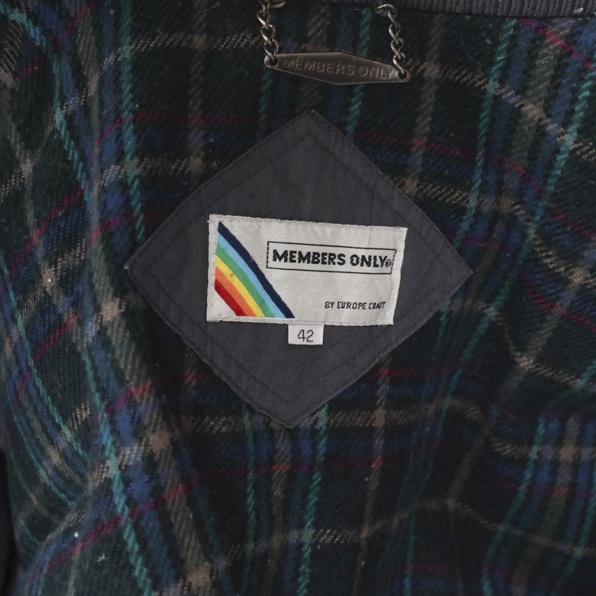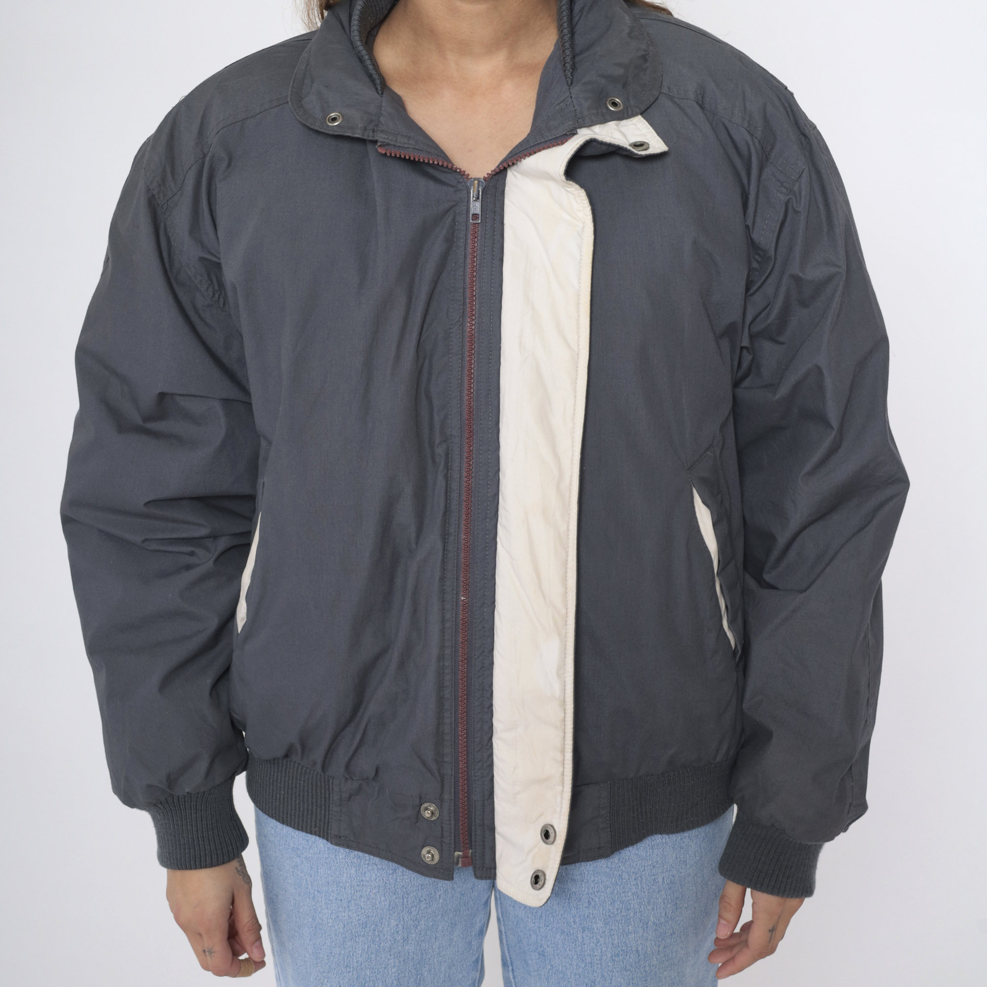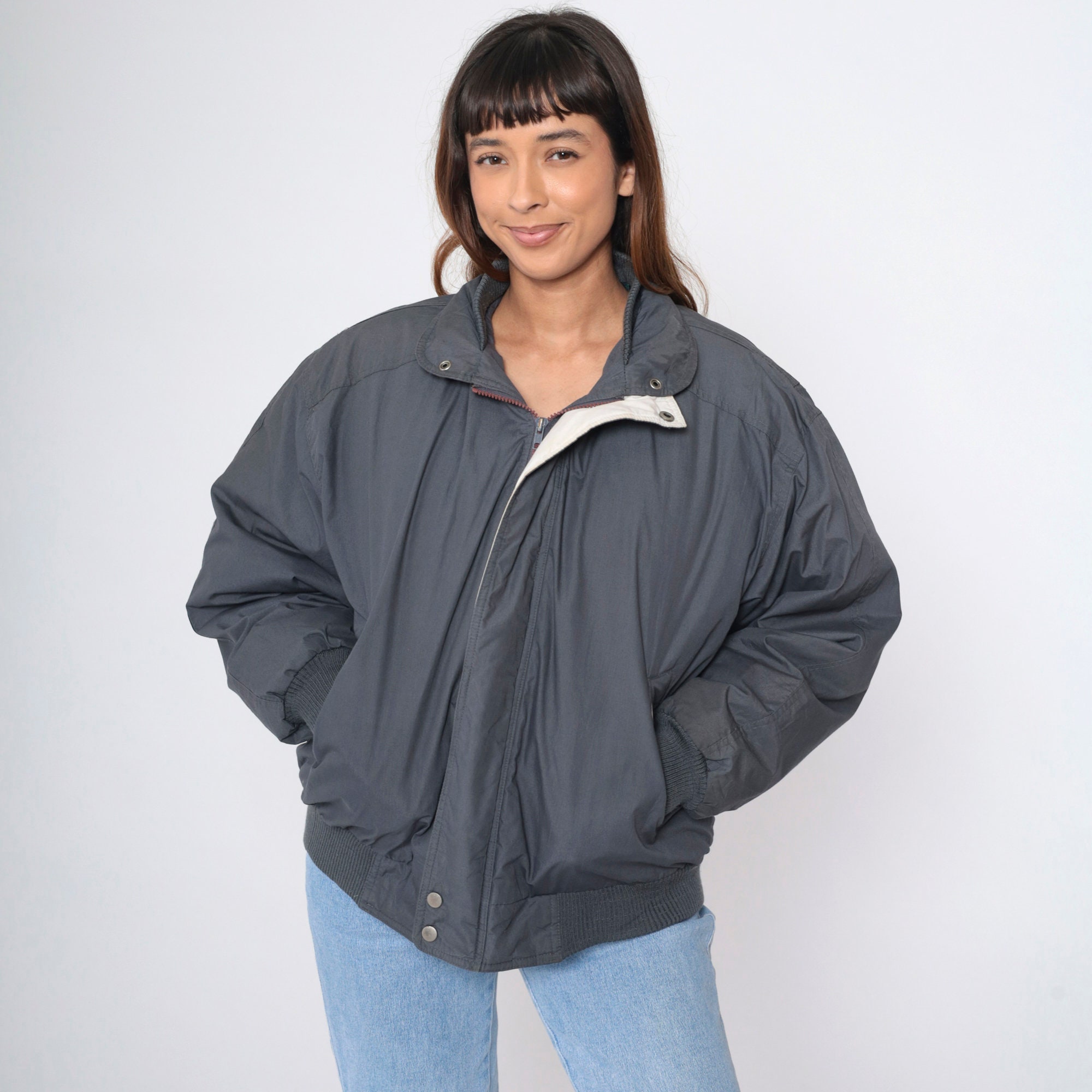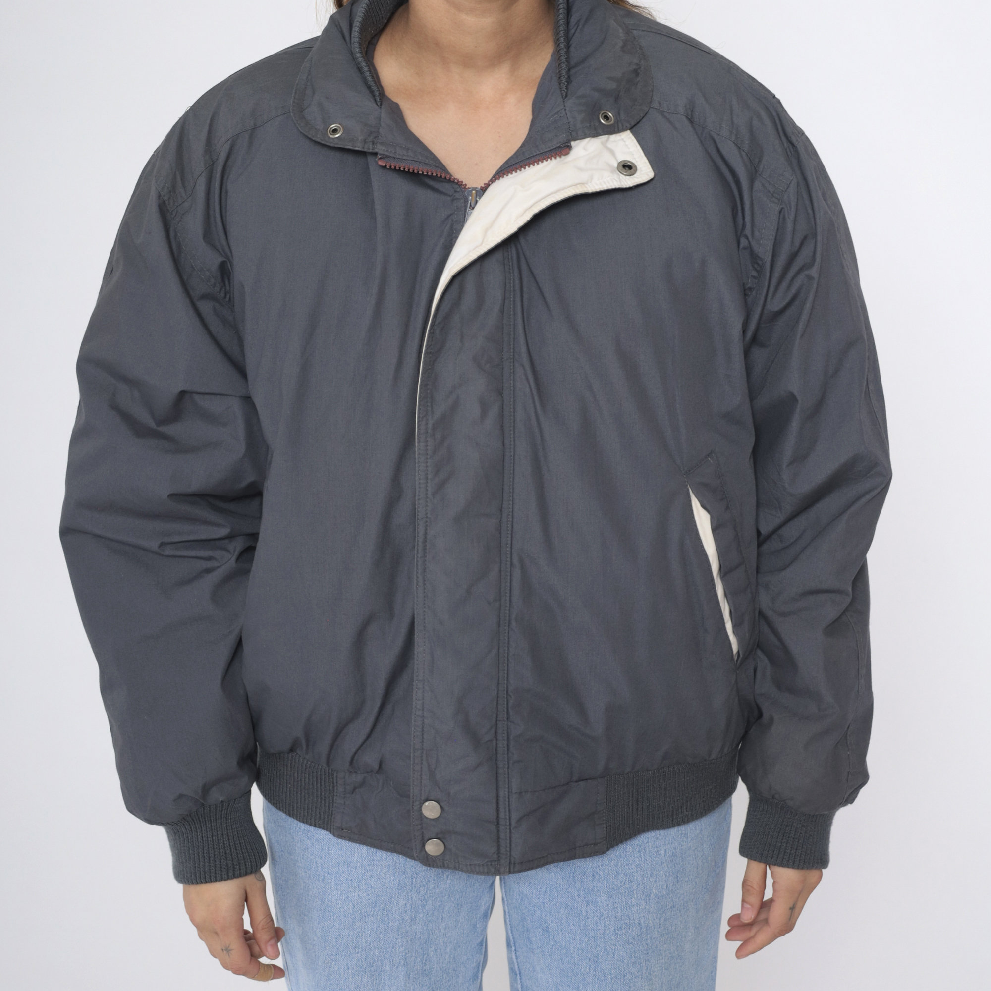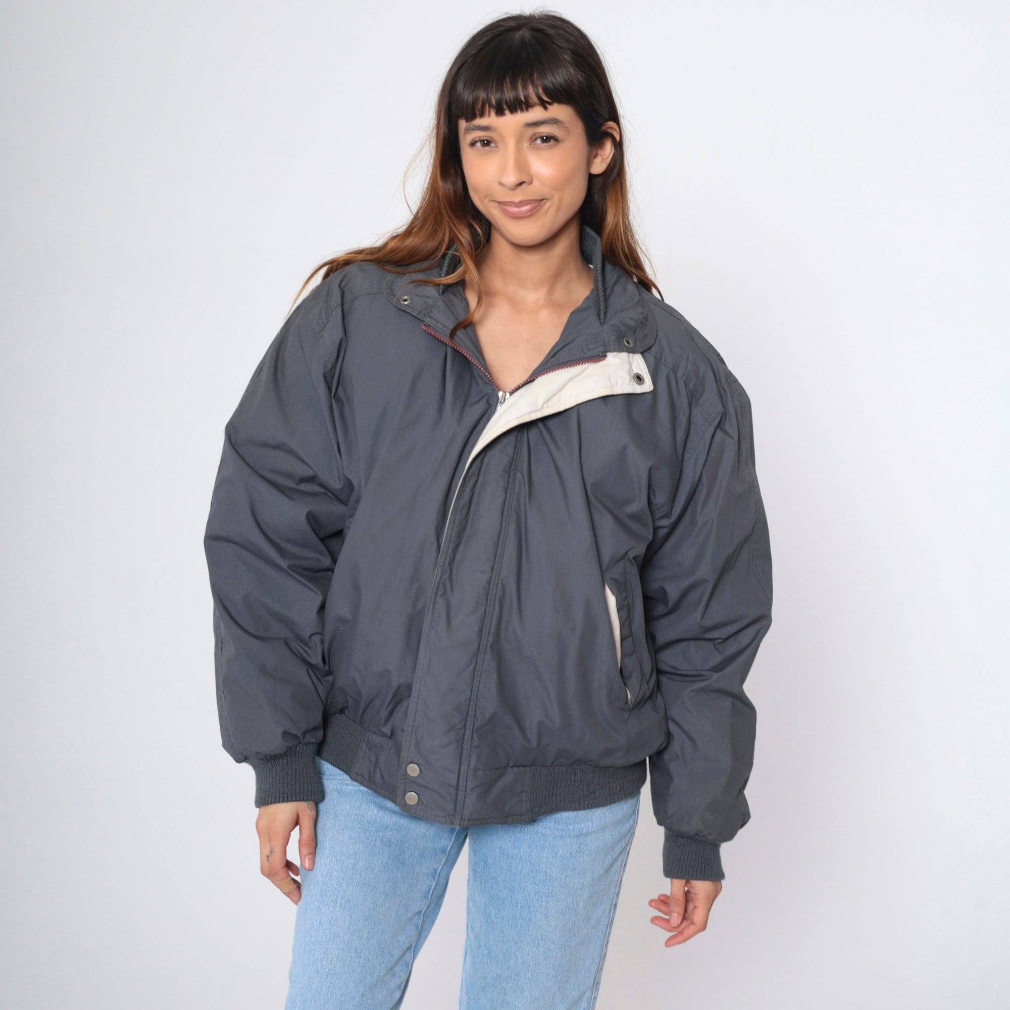 Vintage 80s Members Only jacket in dark grey with a down fill. Zips and snaps up the front. Originally for men.