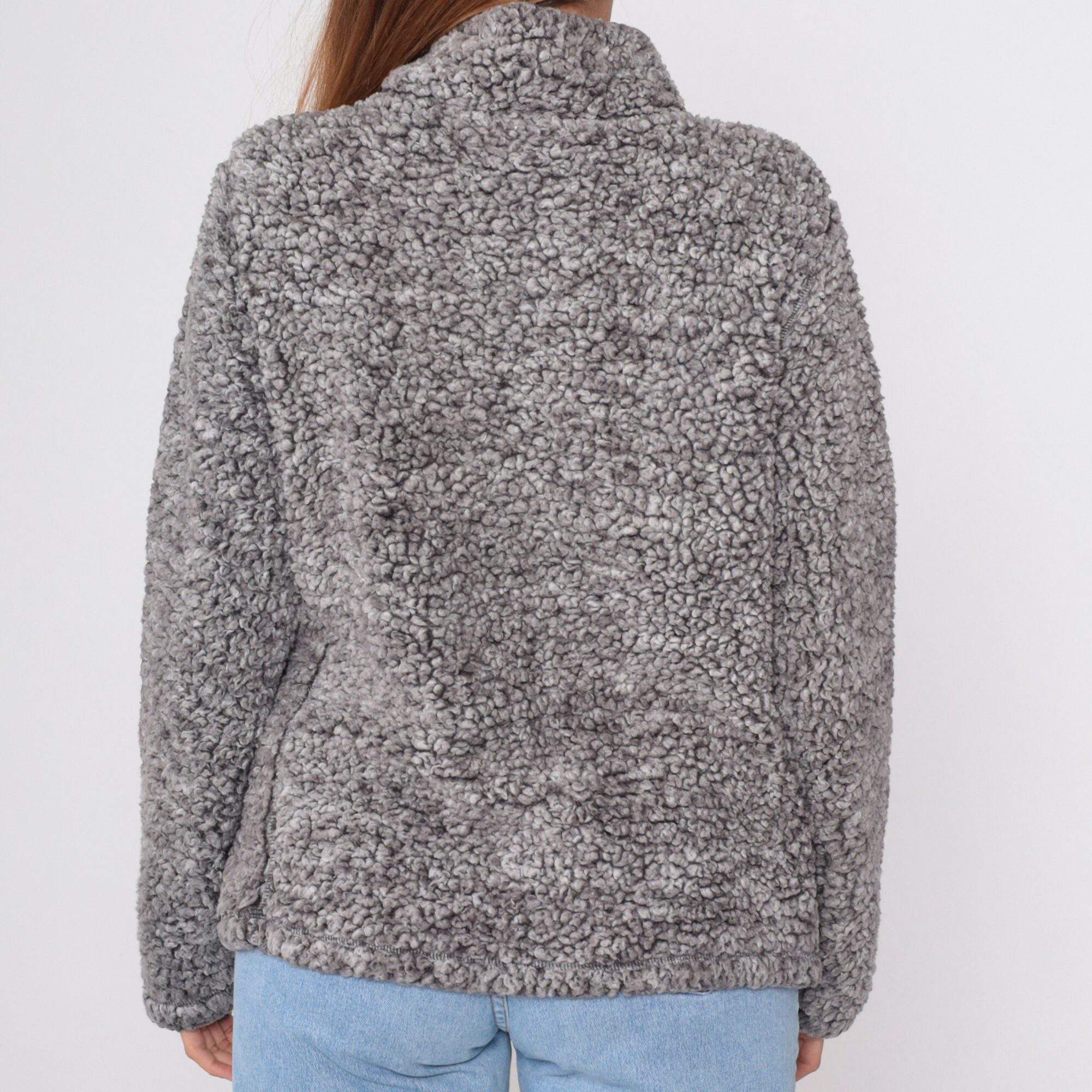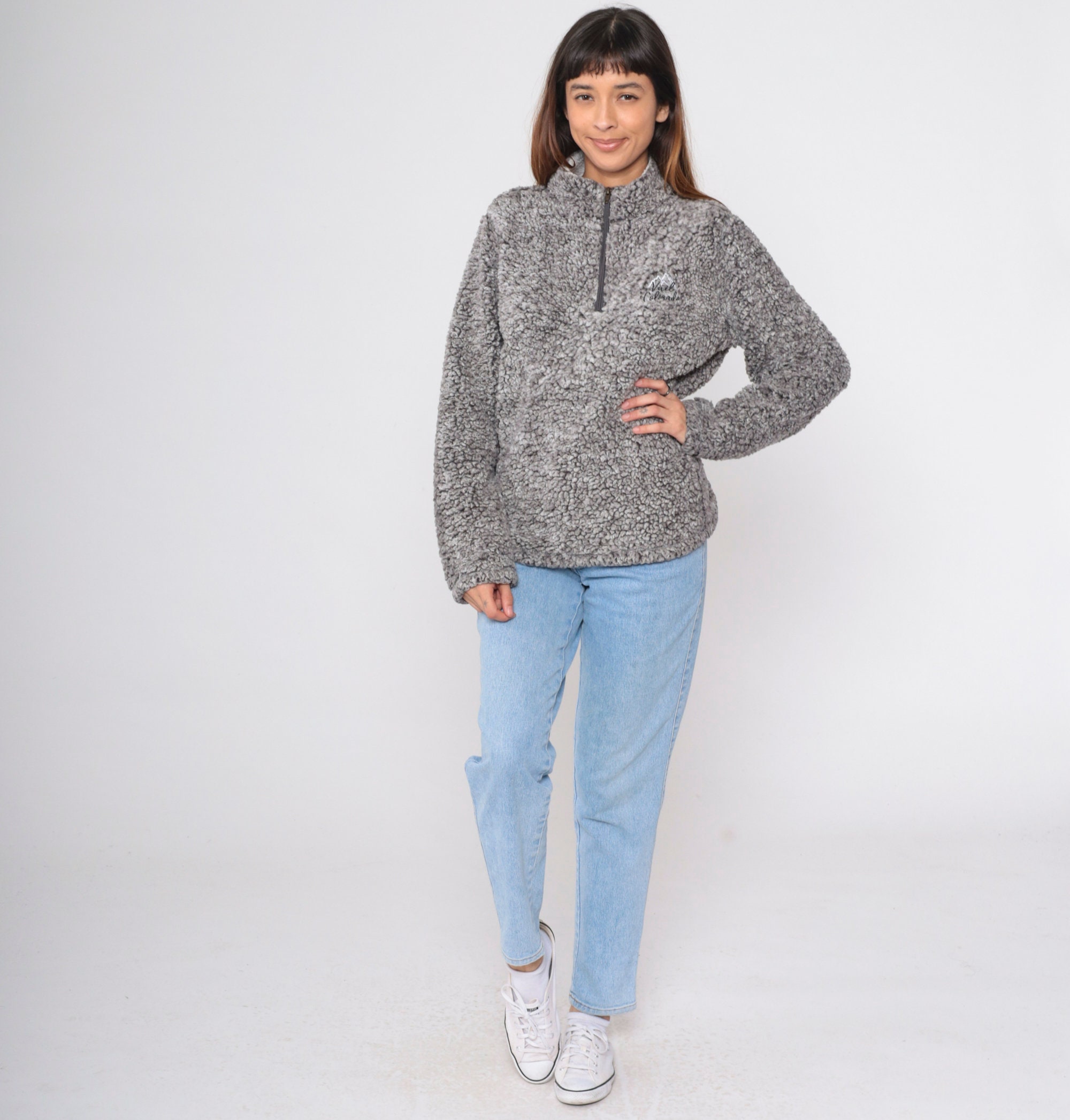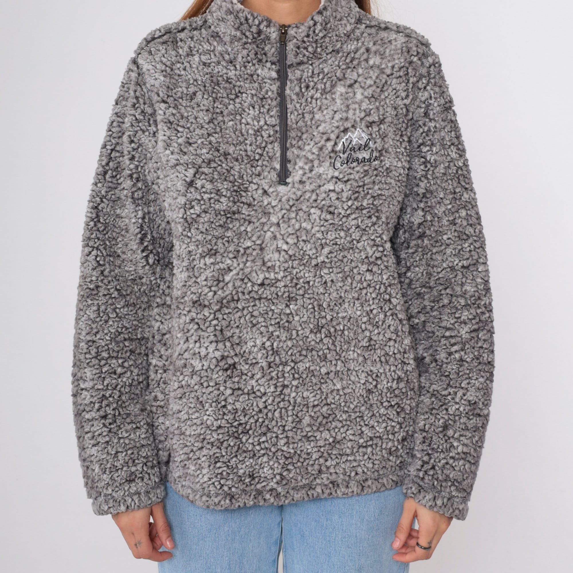 Vintage 90s fleece sweatshirt in grey with Vail Colorado embroidered on the chest. It has a mock neck and a quarter zipper closure.