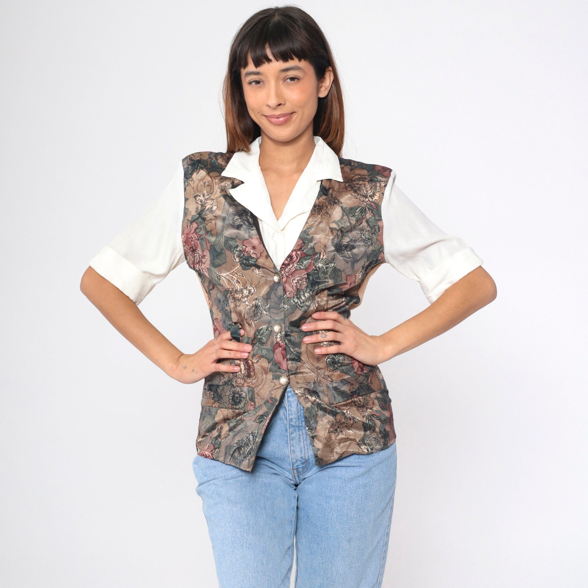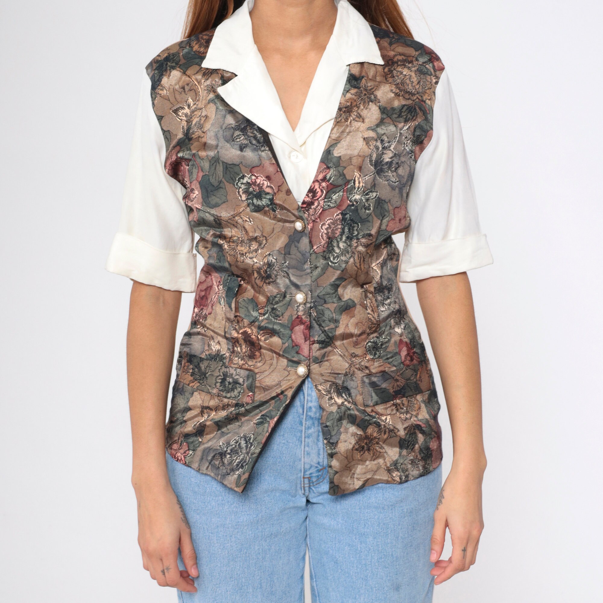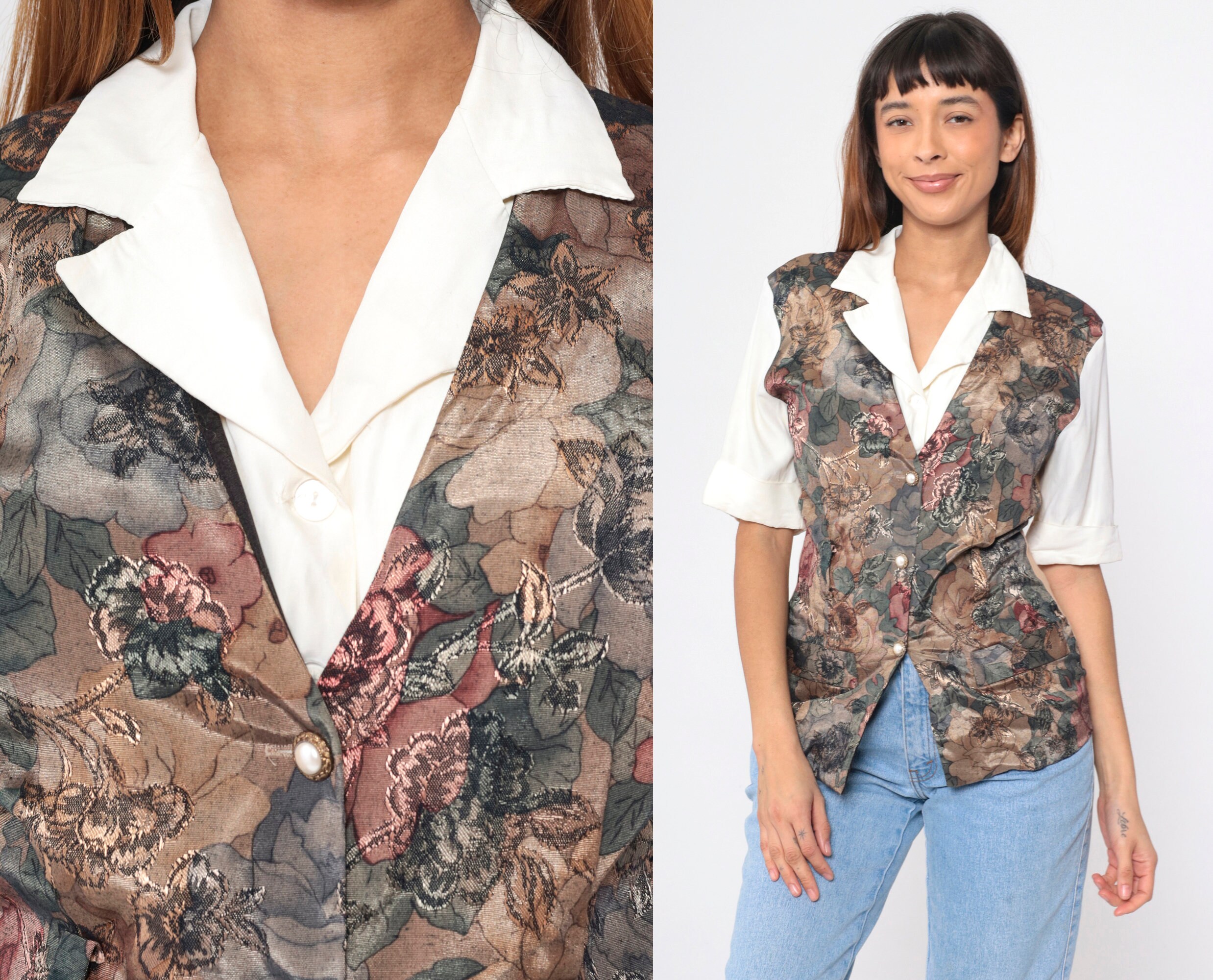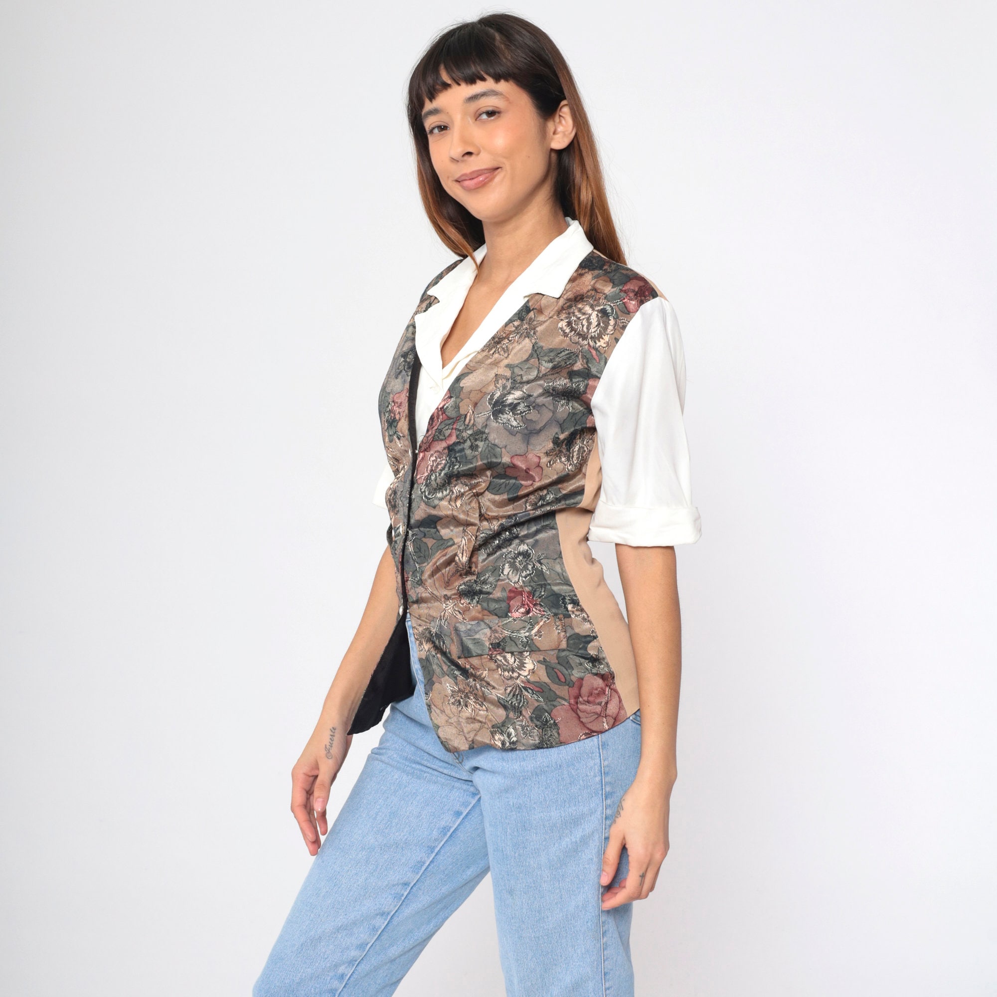 Vintage 90s shirt in white with an attached floral embossed vest. Buttons up the front and has short sleeves.