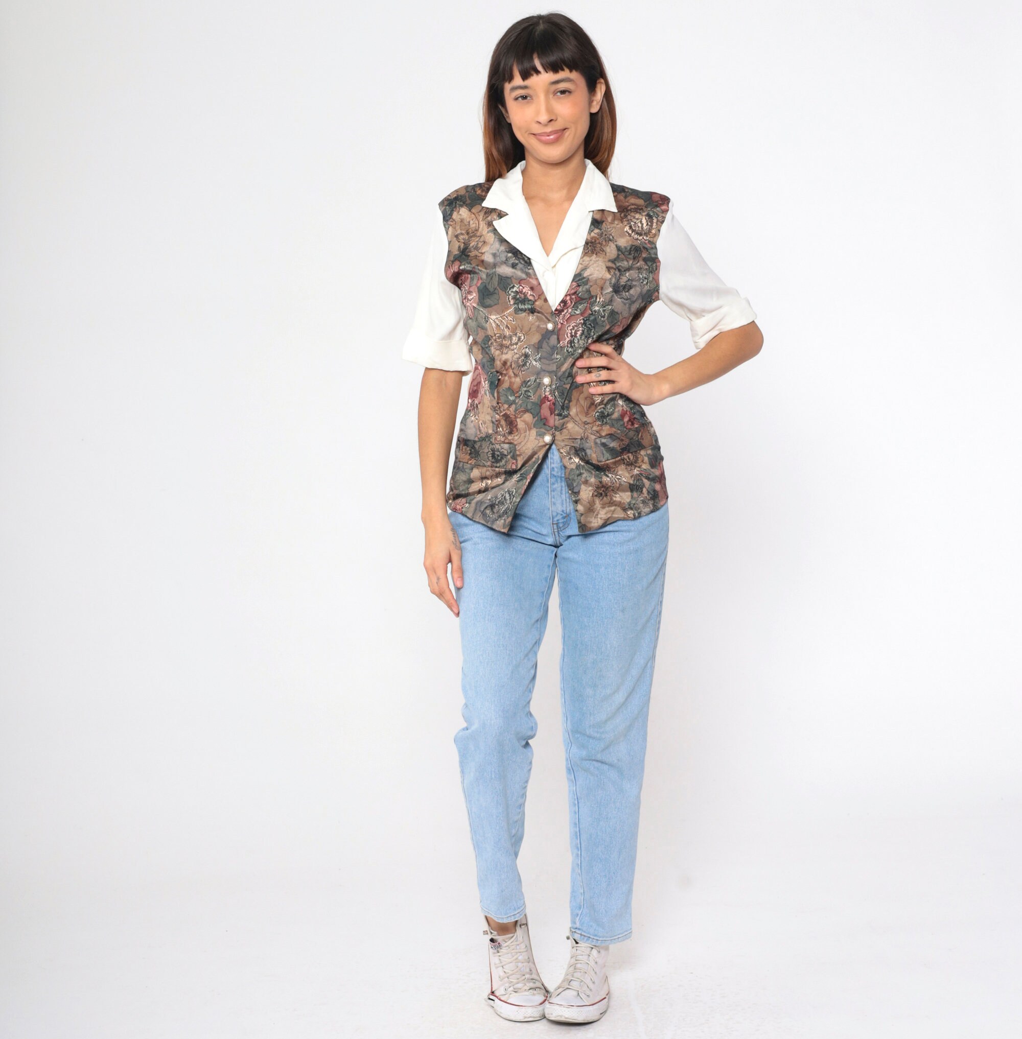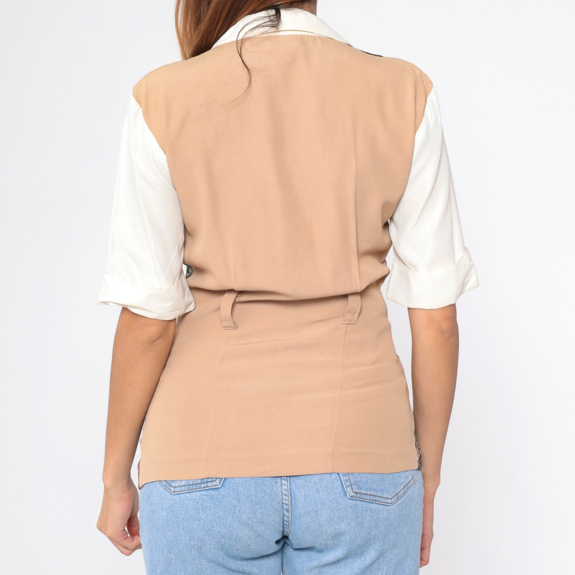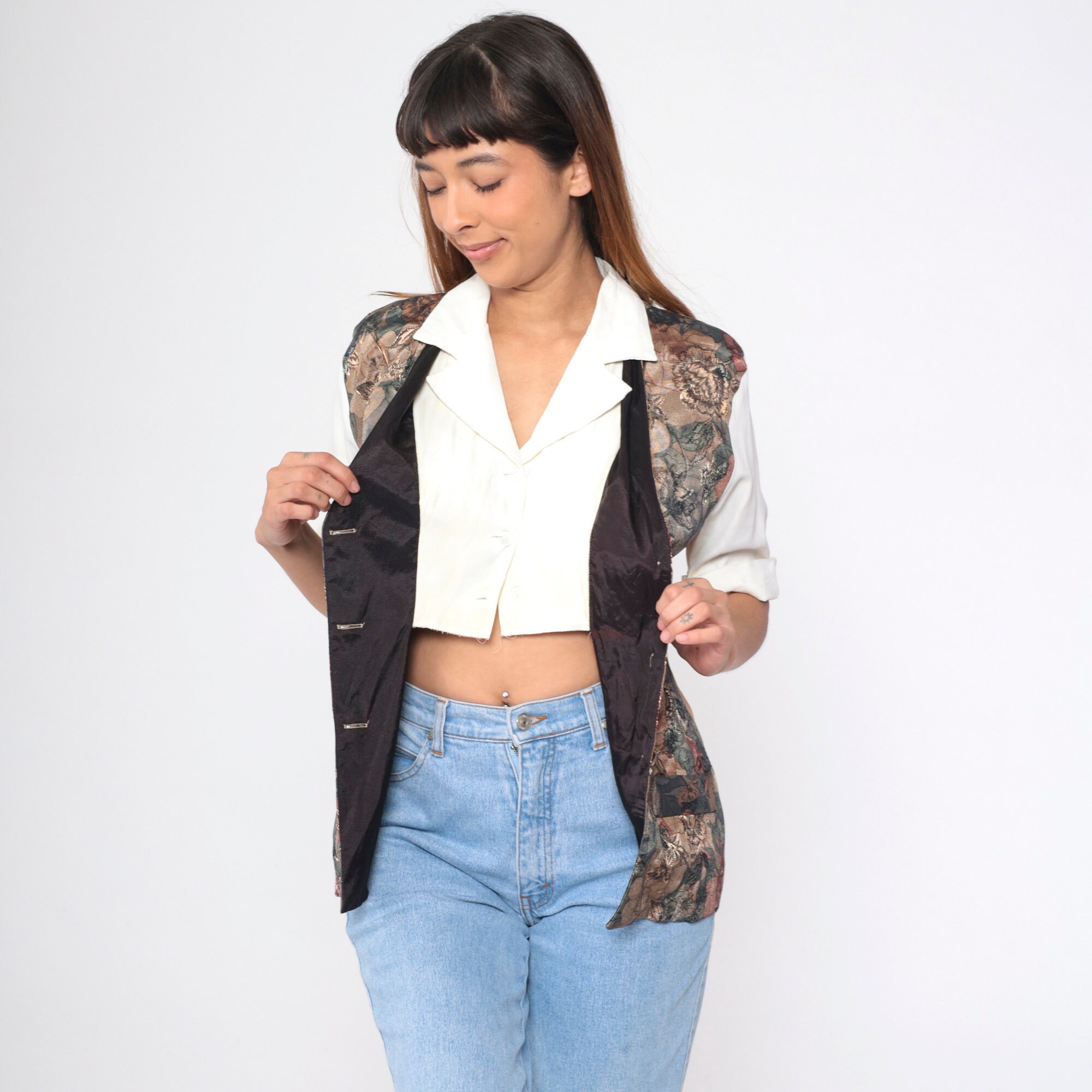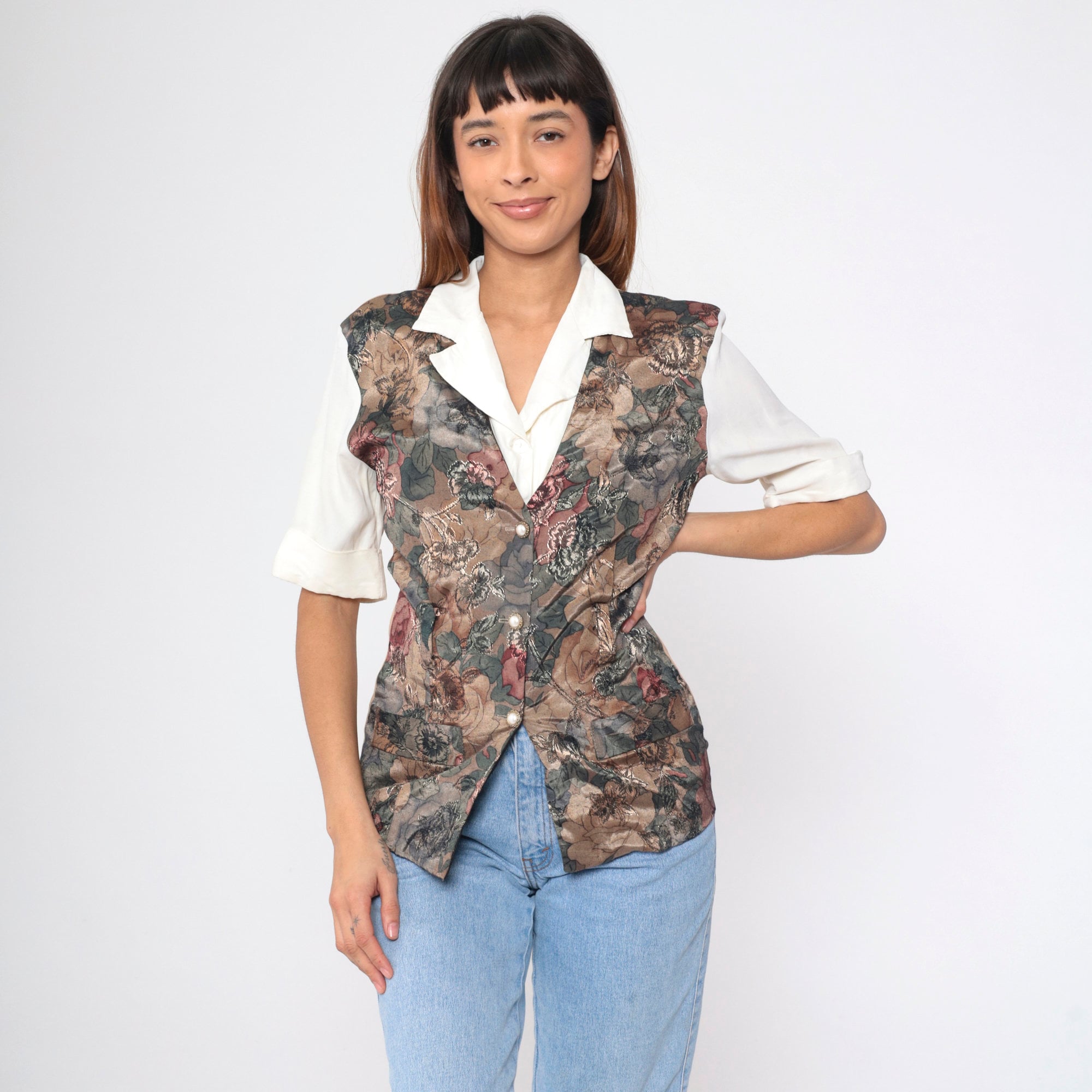 Vintage 90s shirt in white with an attached floral embossed vest. Buttons up the front and has short sleeves.