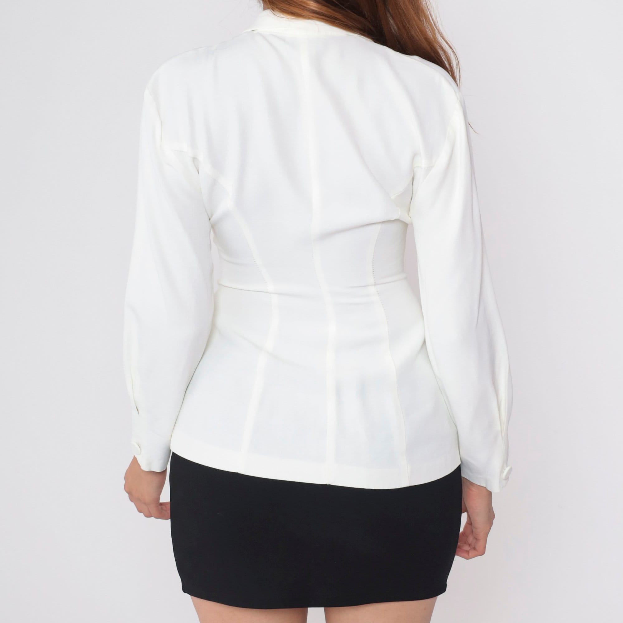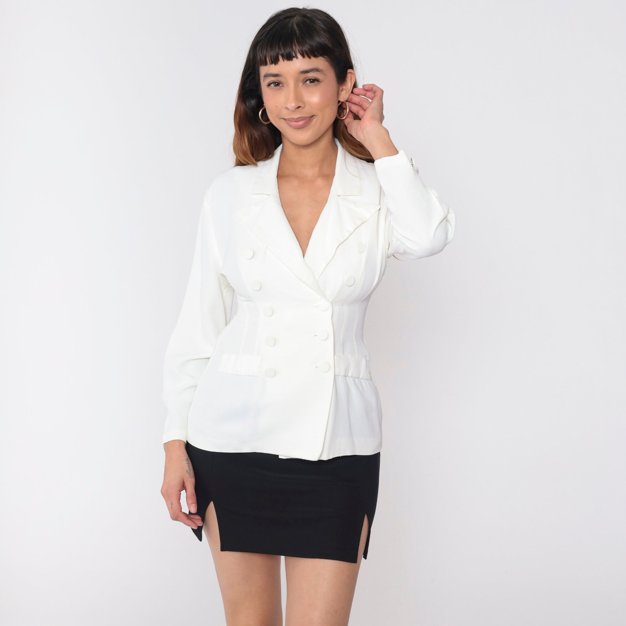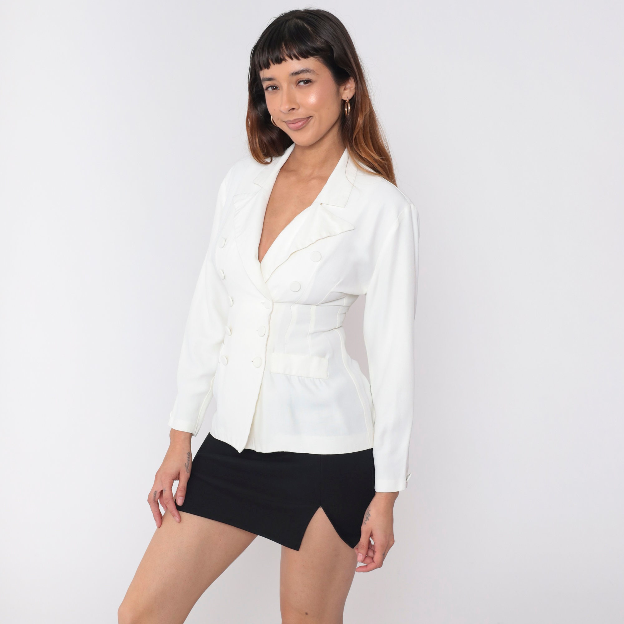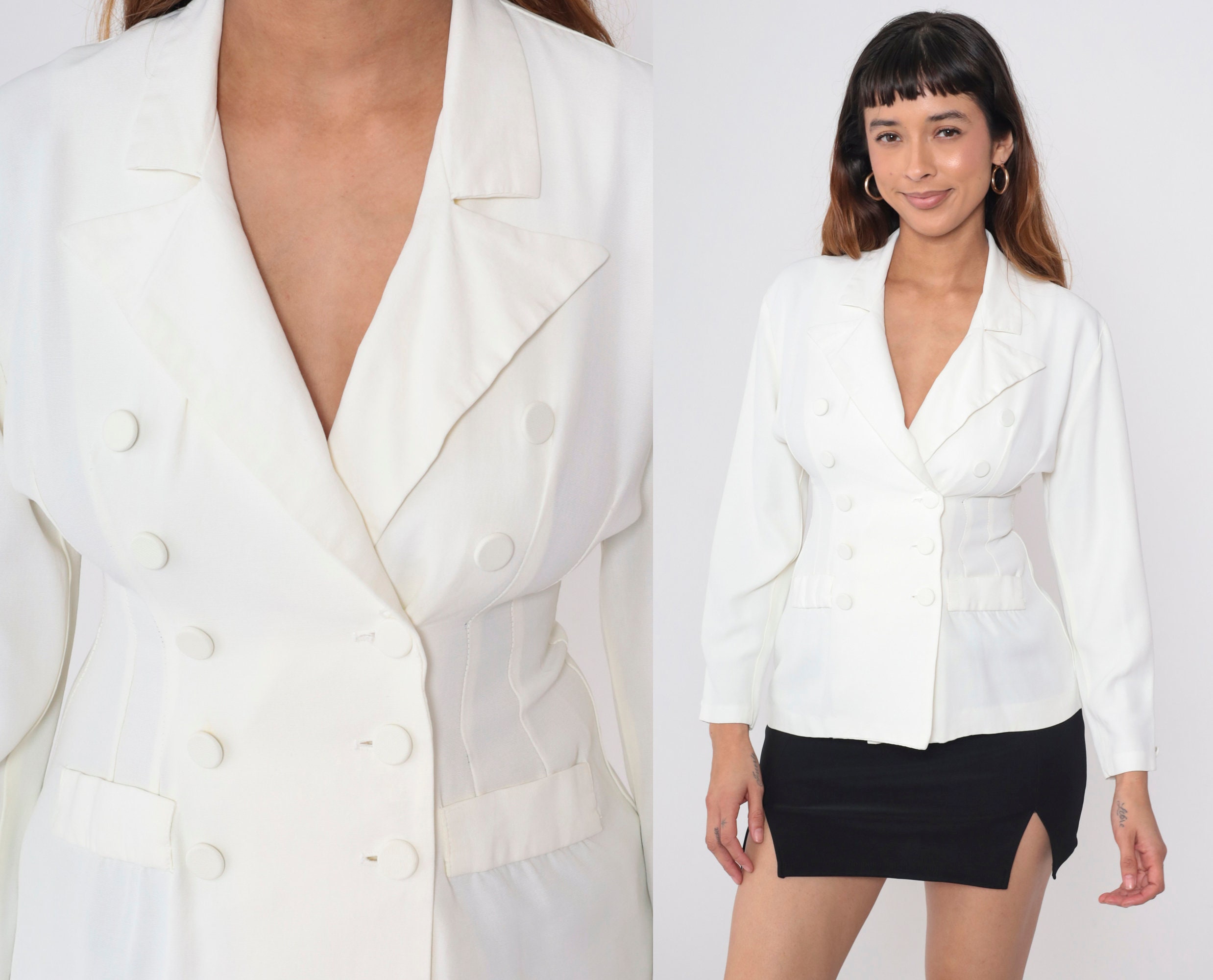 Vintage 90s jacket in white with a deep v neck. It features a peak lapel, princess seams, and a double breasted button closure.