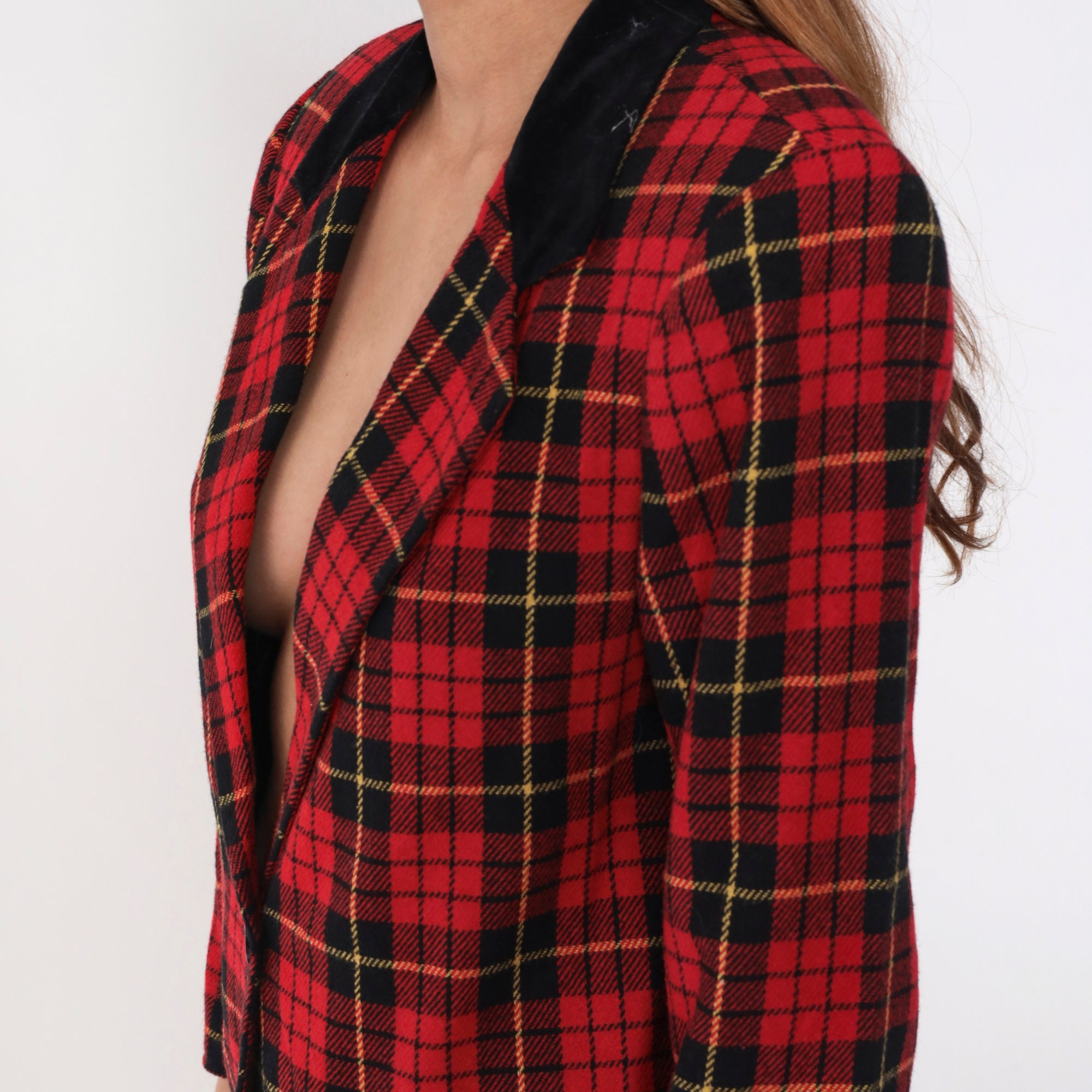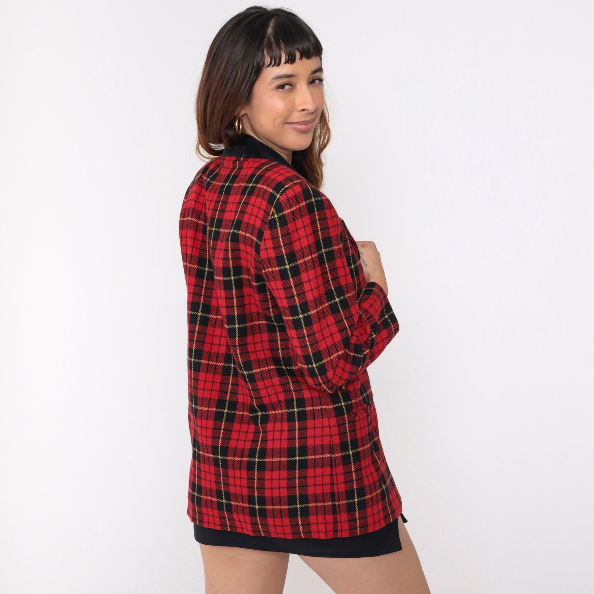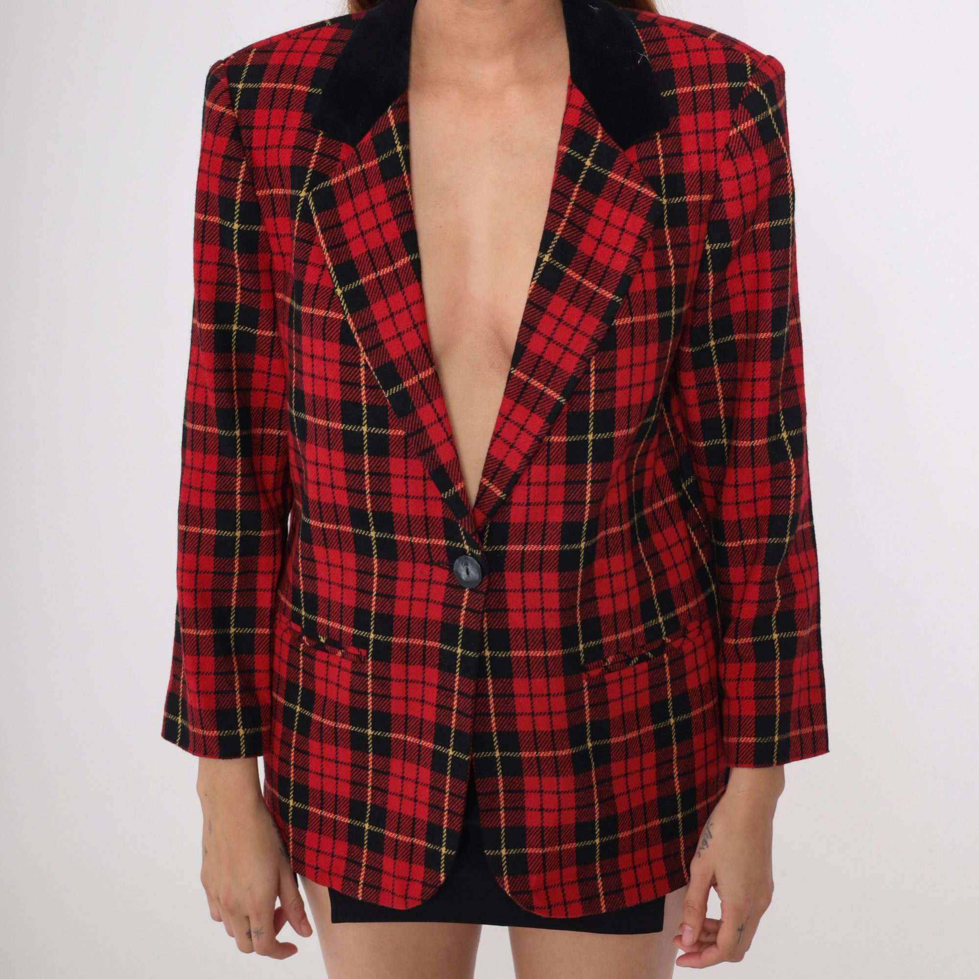 Vintage 90s blazer jacket in red plaid with a black velvet collar. It has a deep v neck and a single button closure.