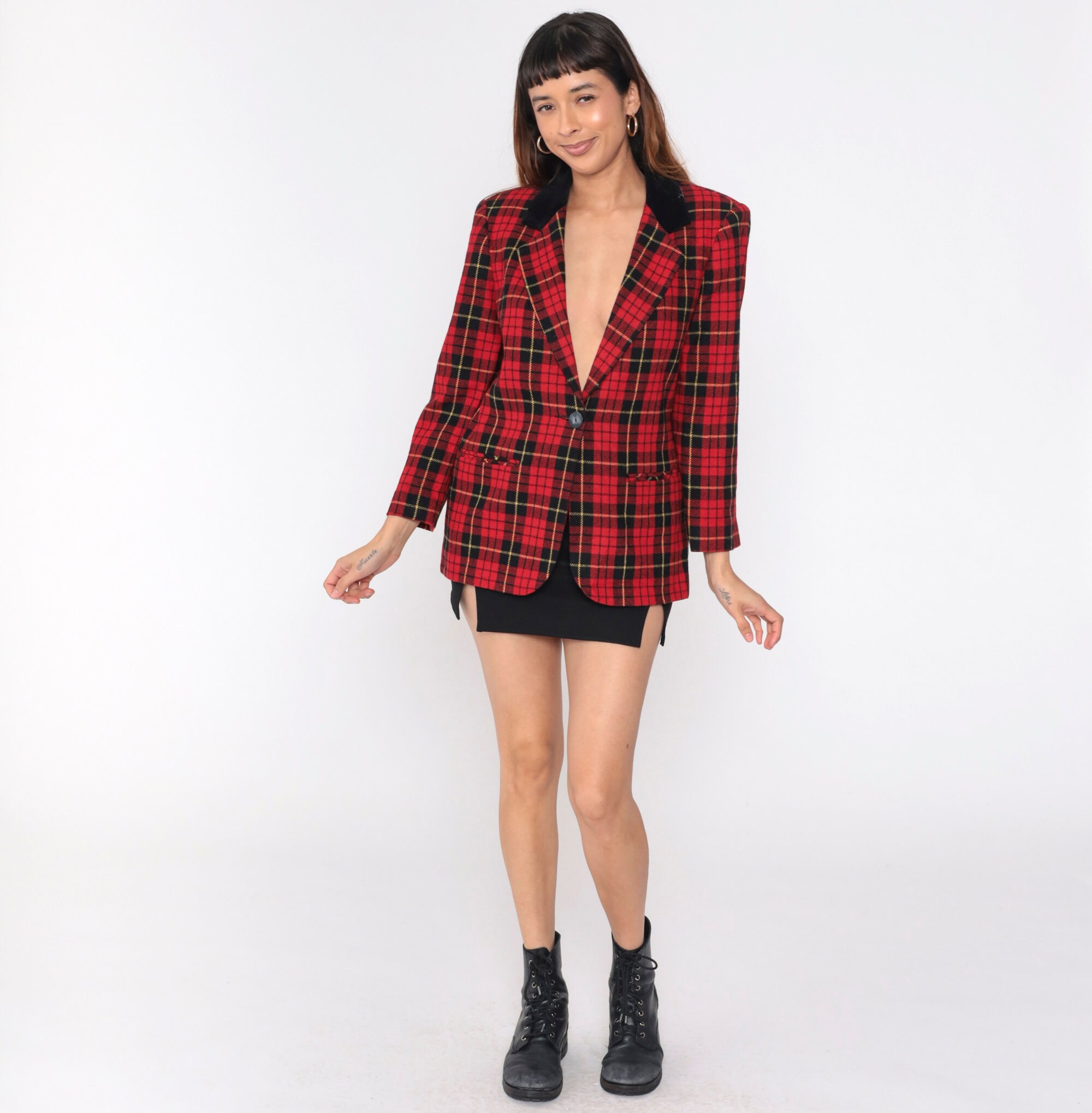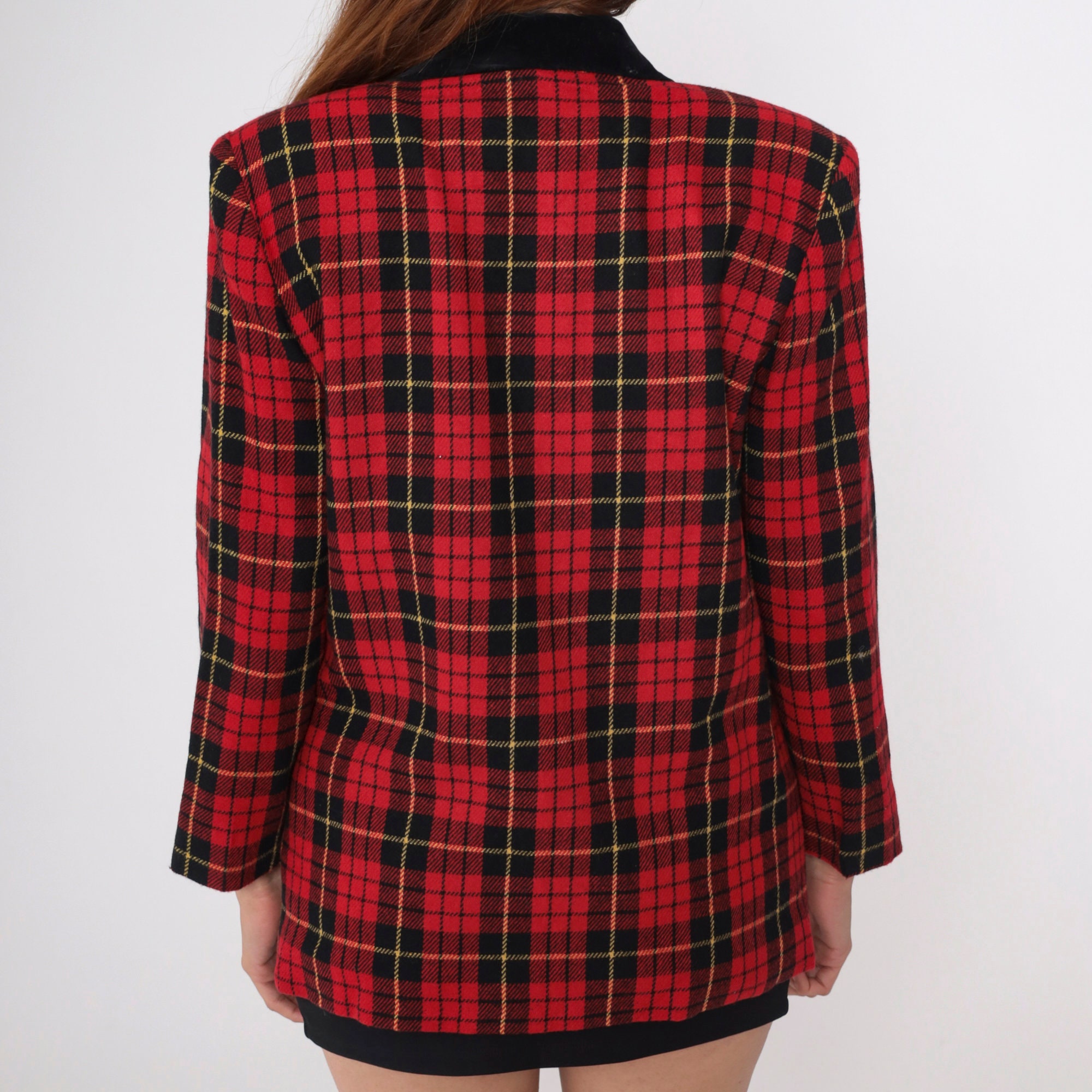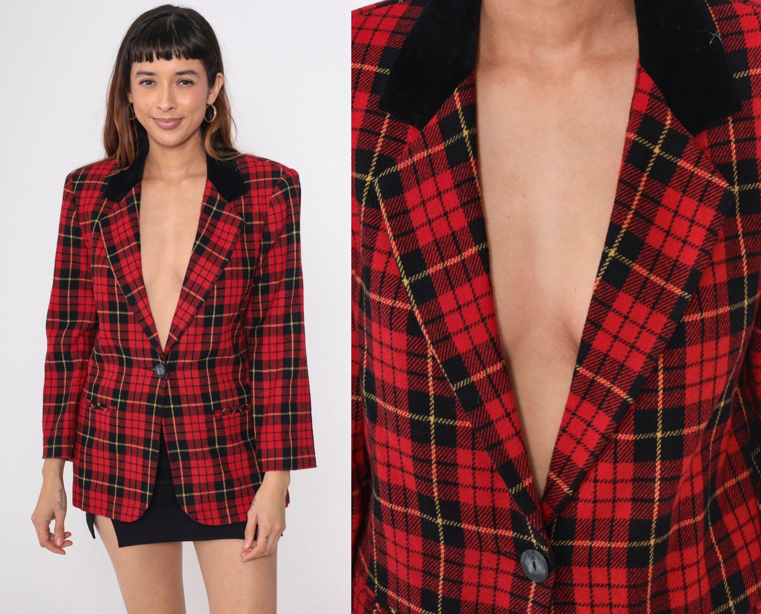 Vintage 90s blazer jacket in red plaid with a black velvet collar. It has a deep v neck and a single button closure.