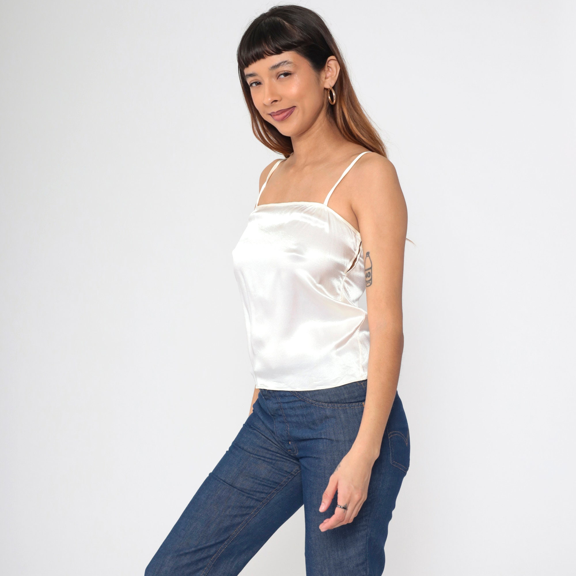 Vintage 80s tank top in shiny white with a square neckline, spaghetti straps, and a hook and eye closure on the side.