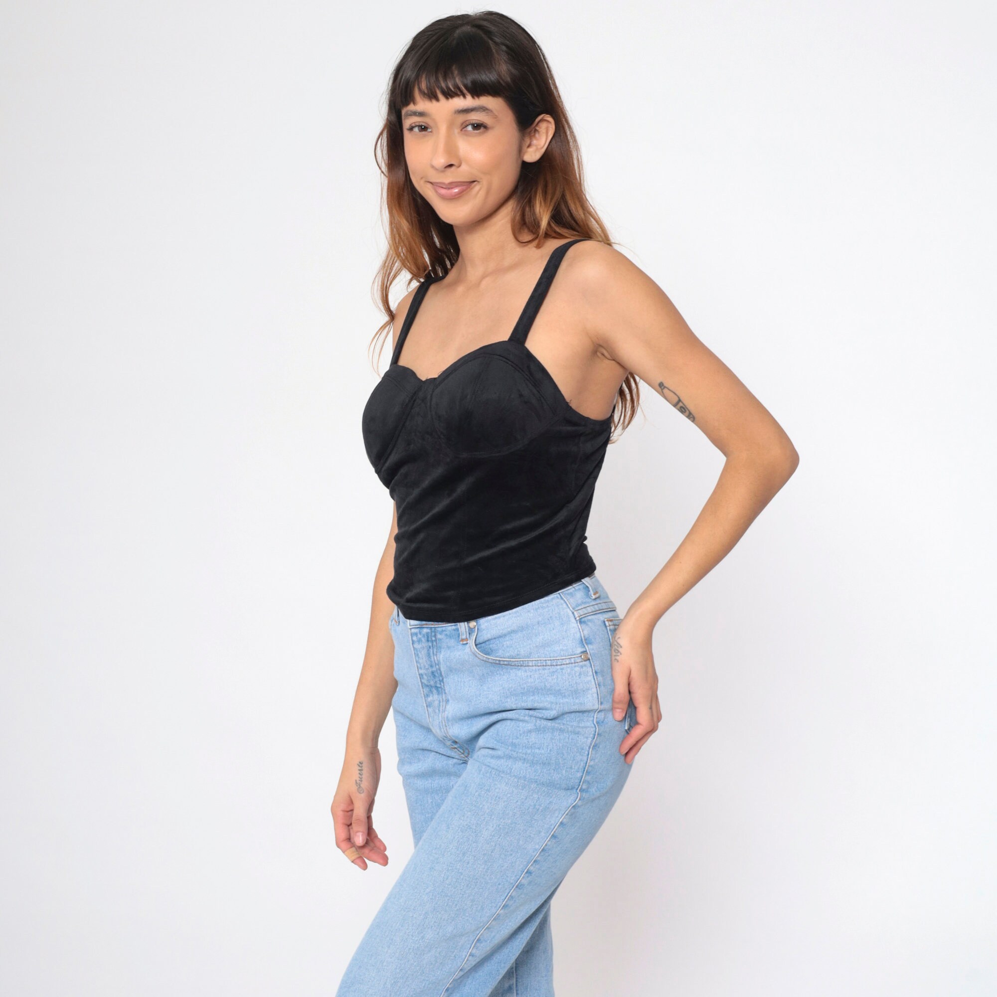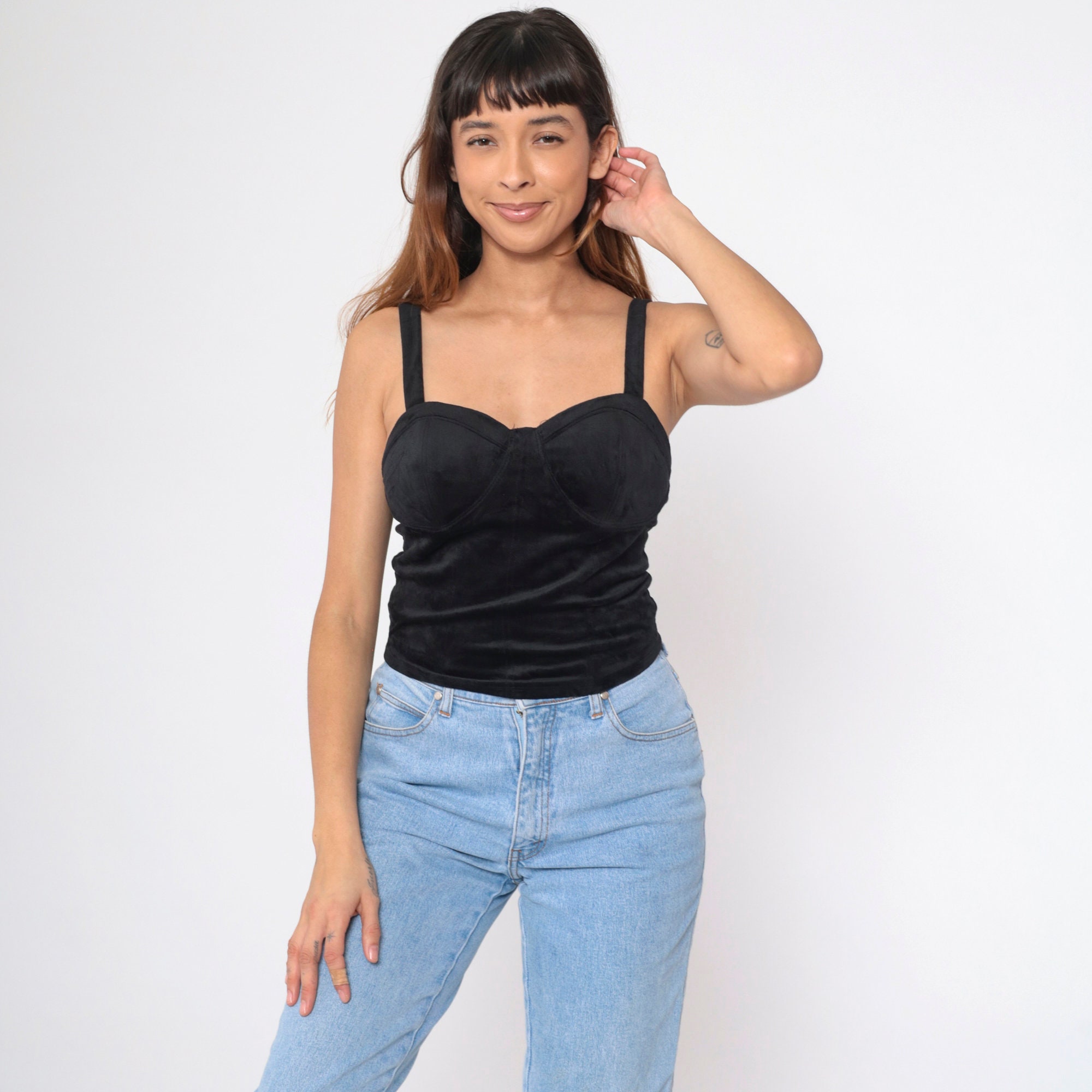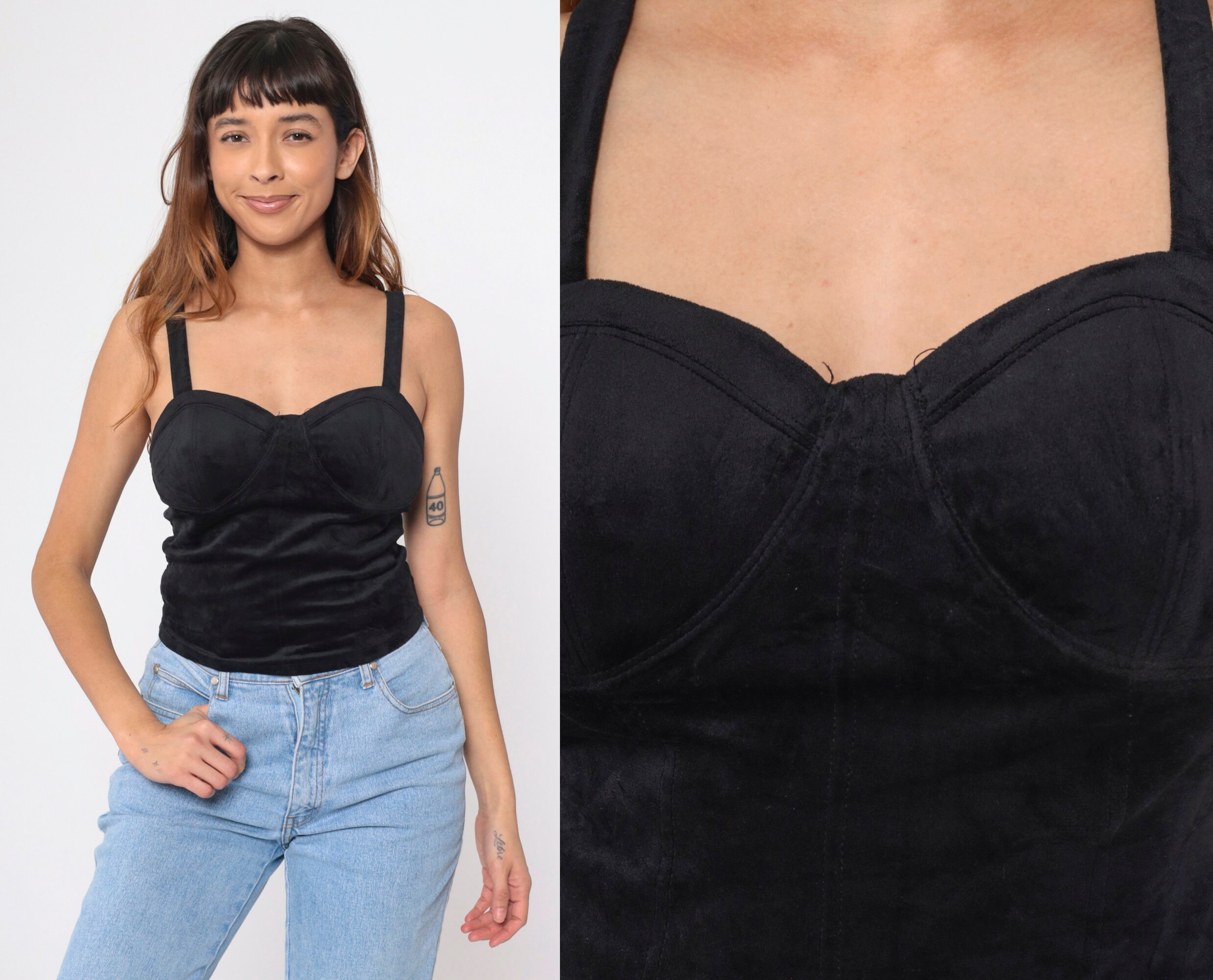 Vintage 90s tank top in black stretch velvet with a bustier cut.
