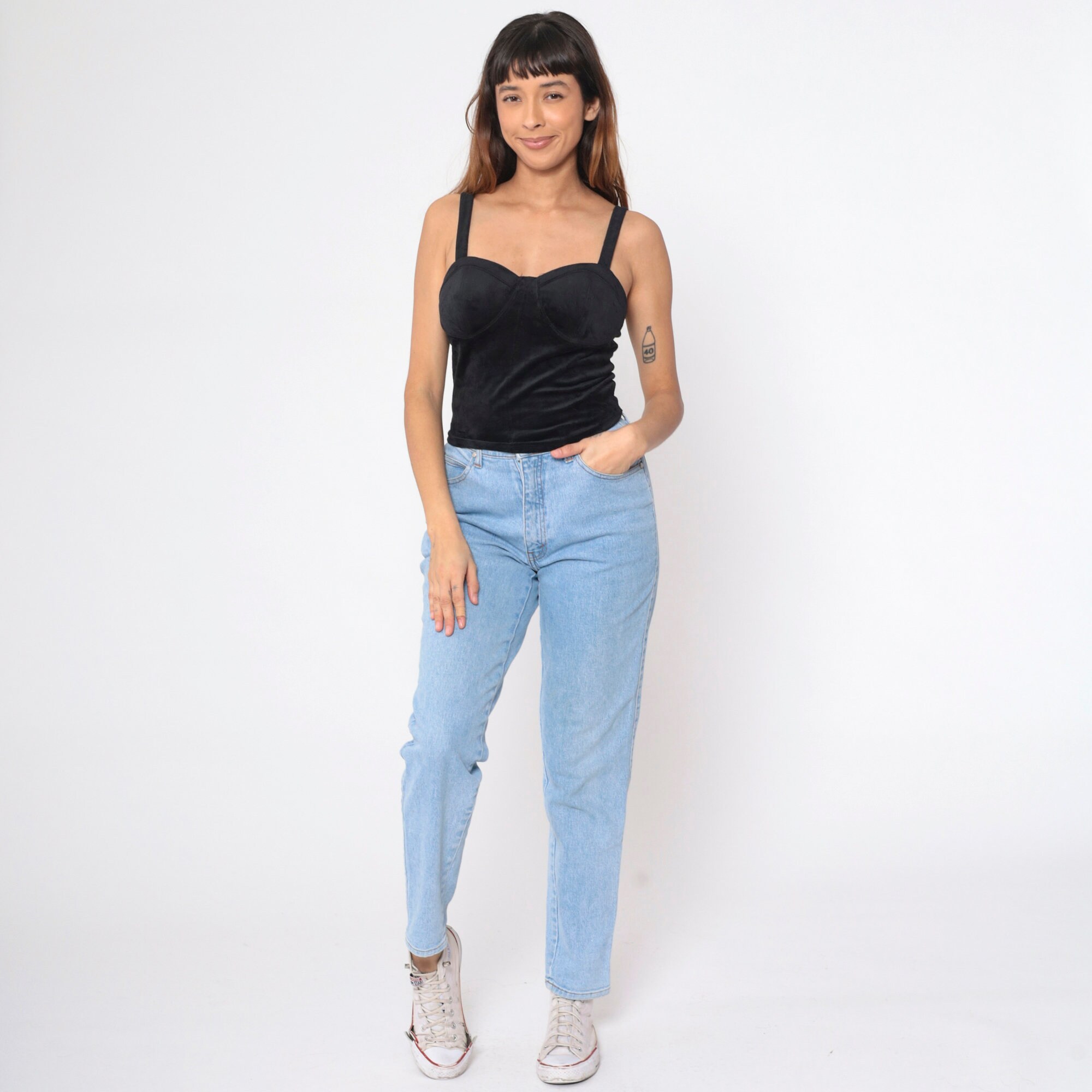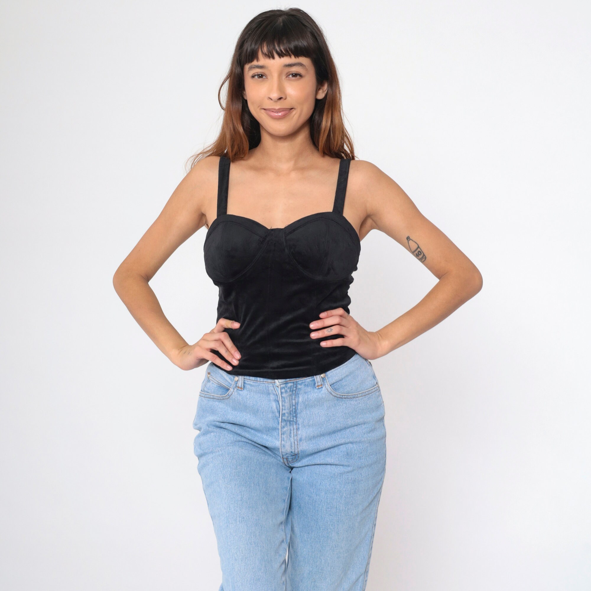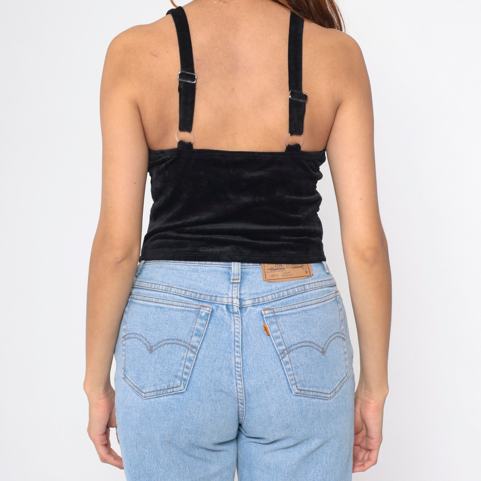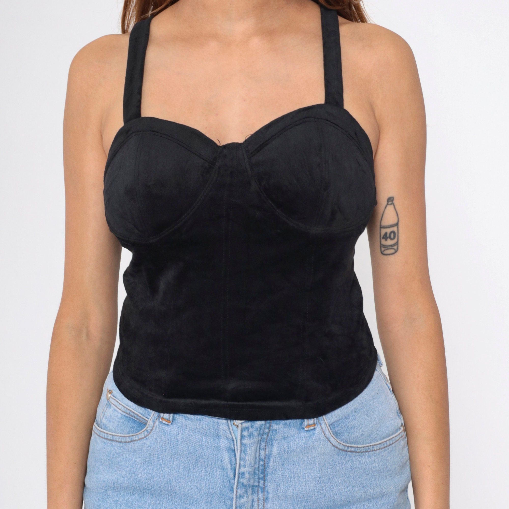 Vintage 90s tank top in black stretch velvet with a bustier cut.