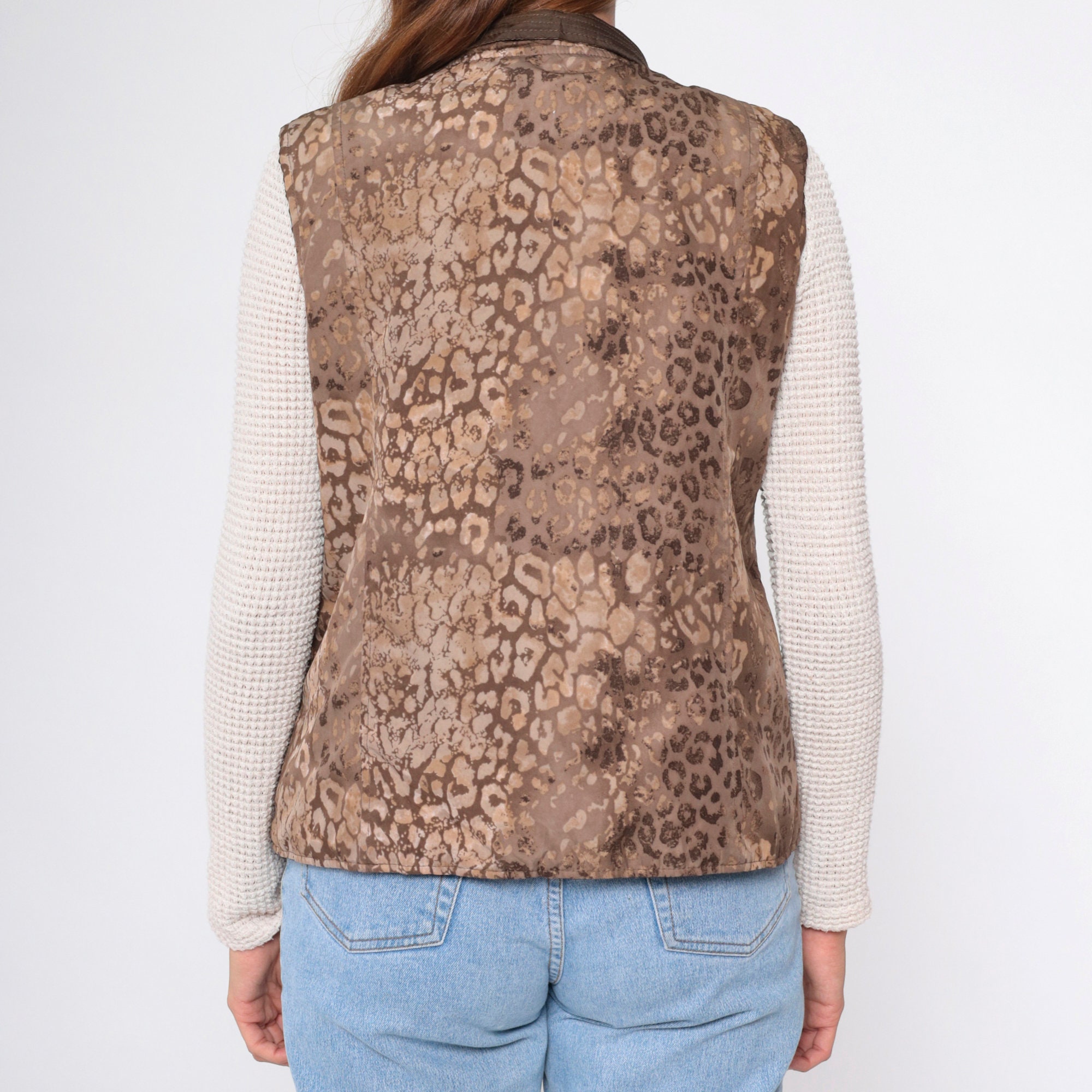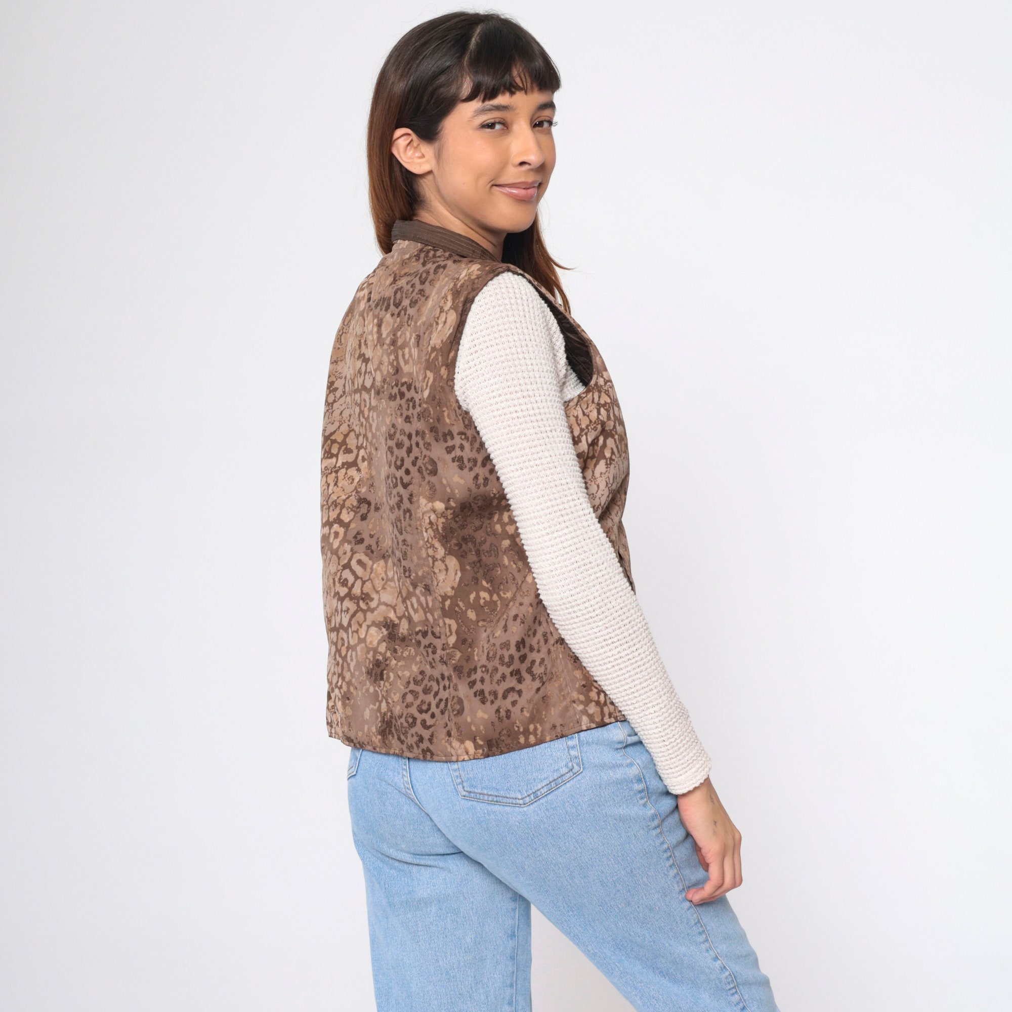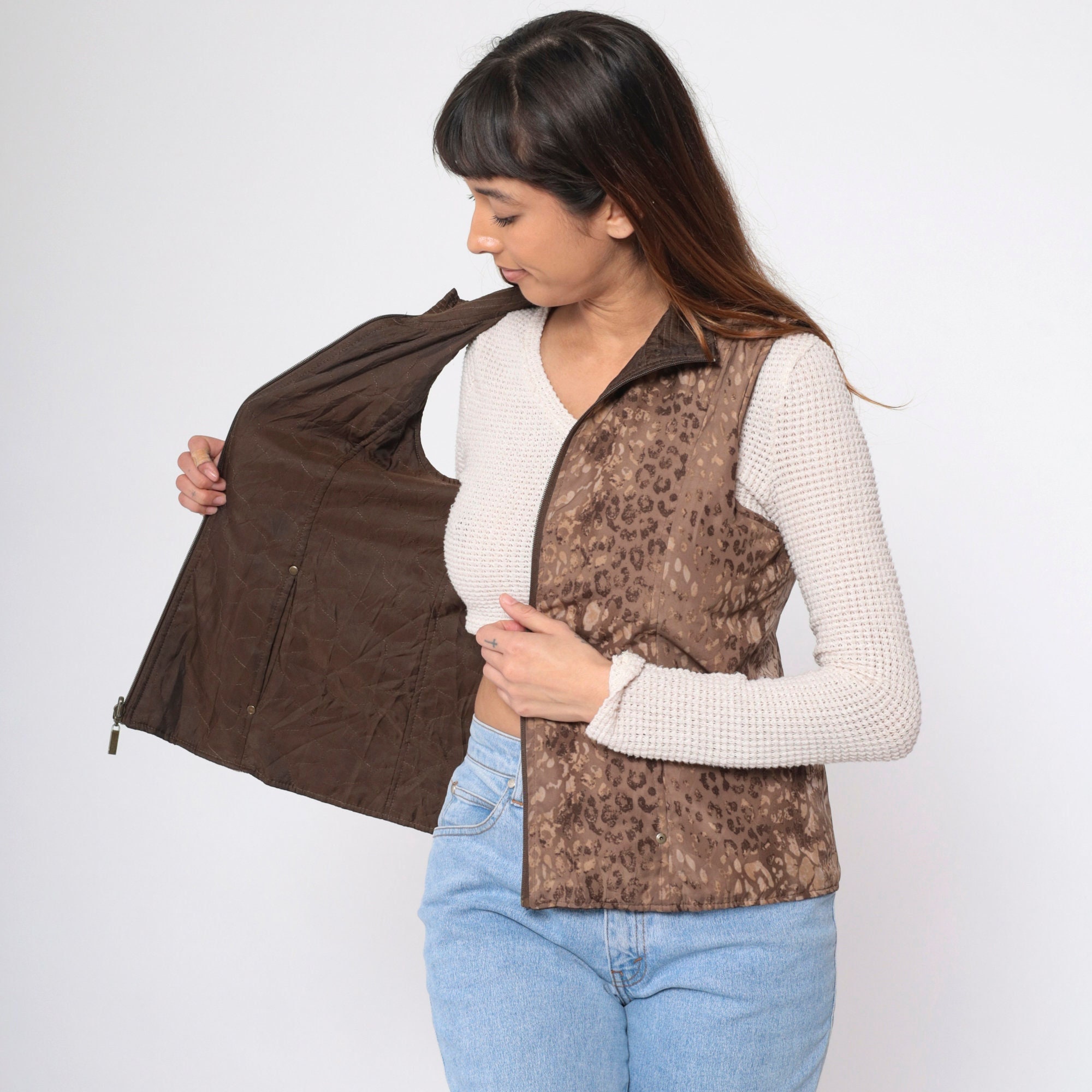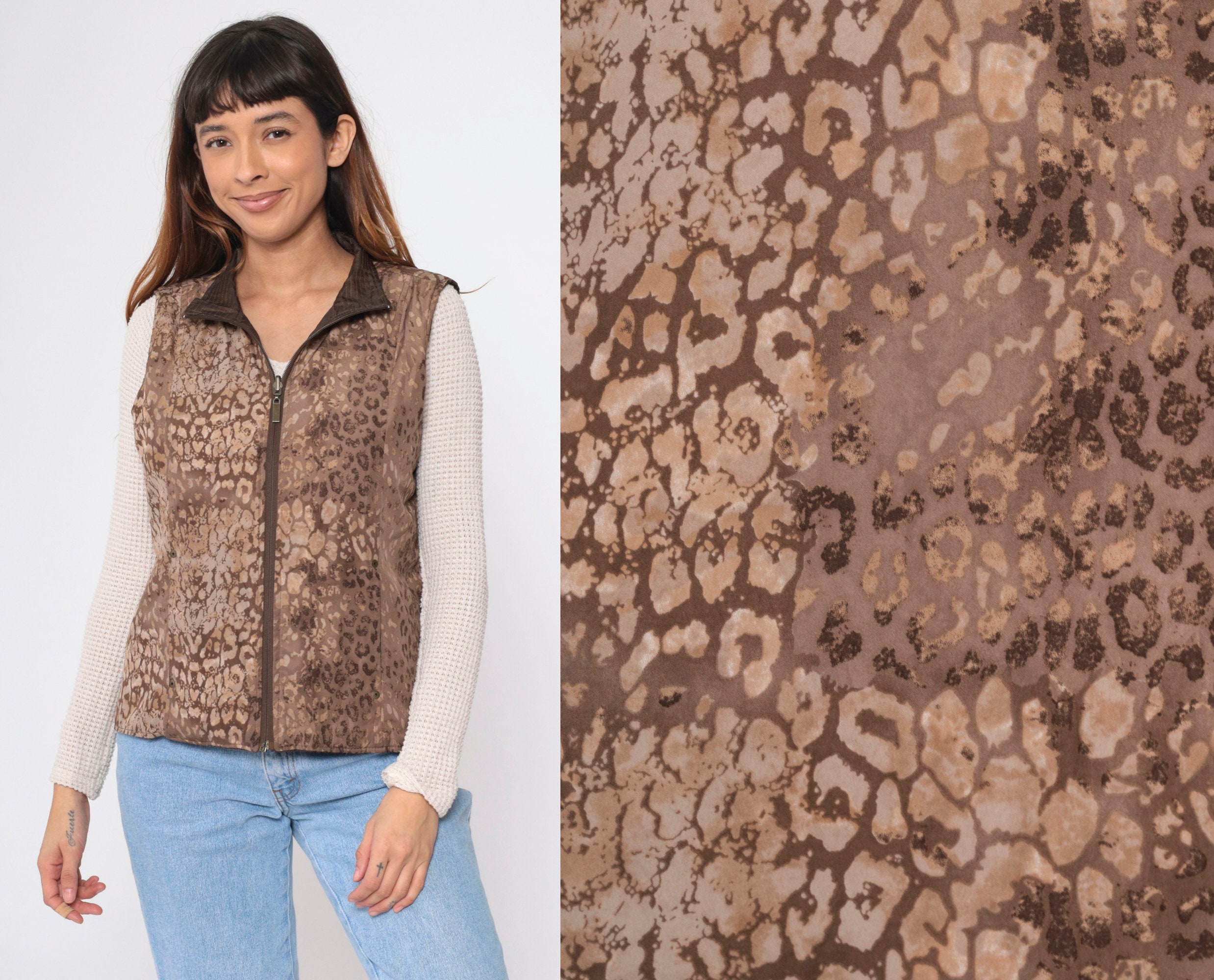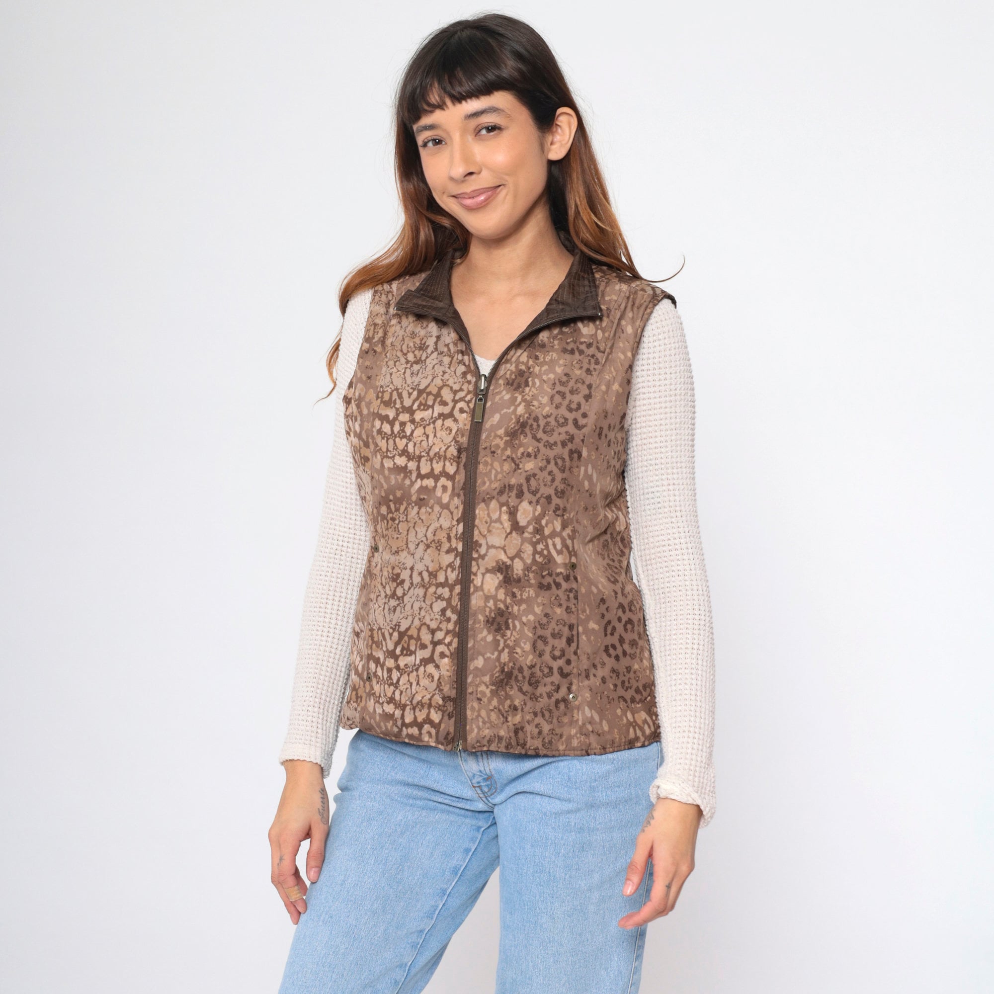 Vintage 90s reversible vest in leopard print with quilted solid brown on the other side. Zips up.