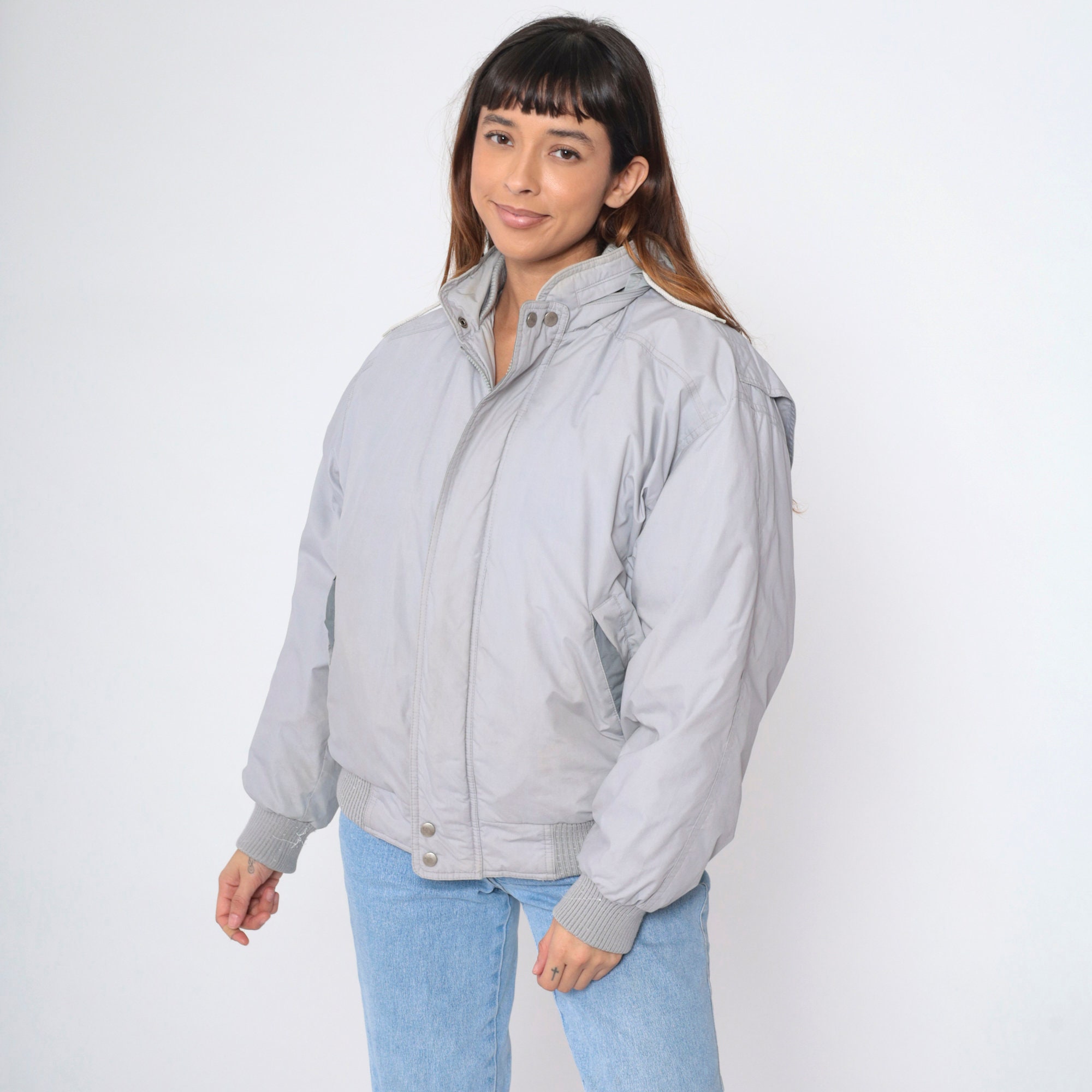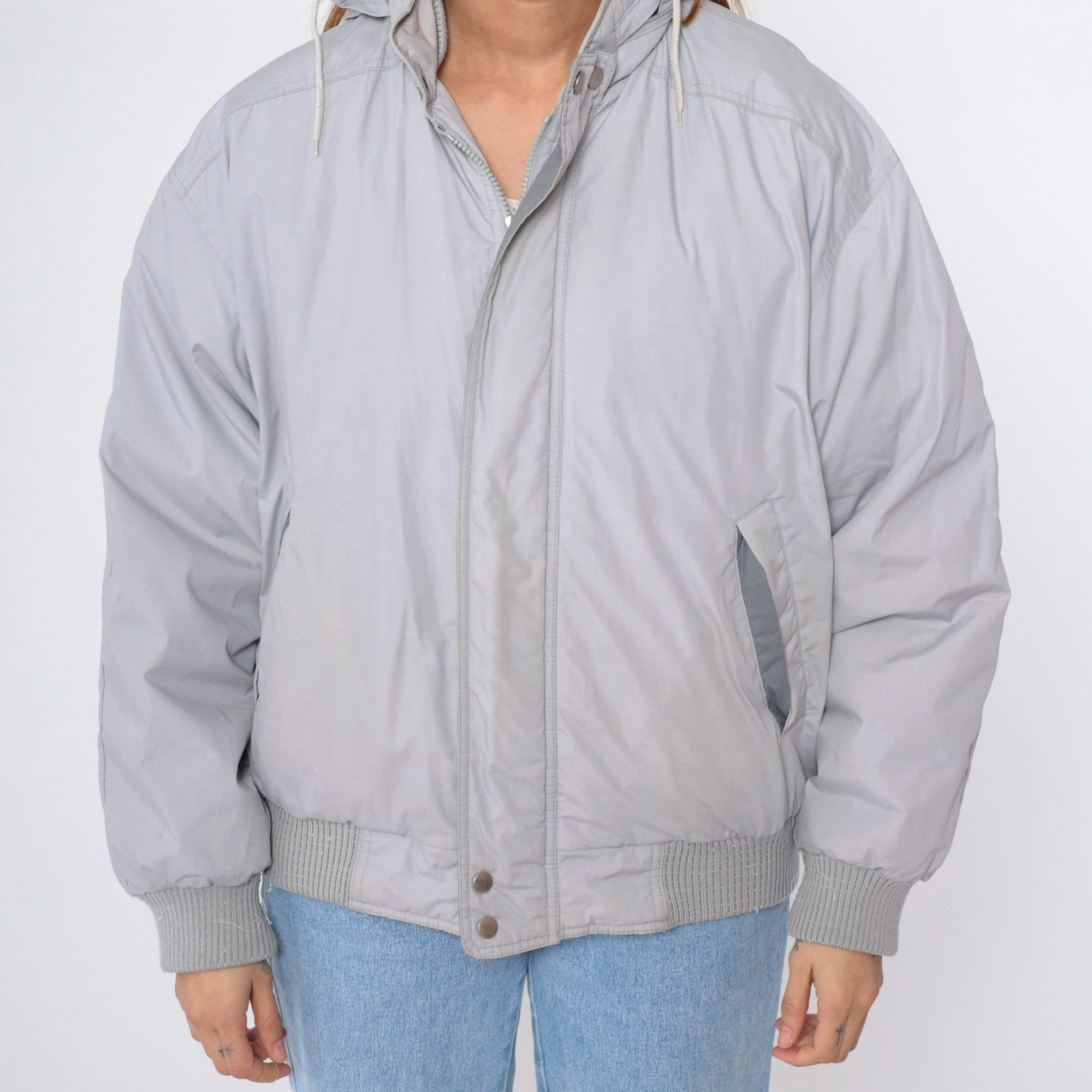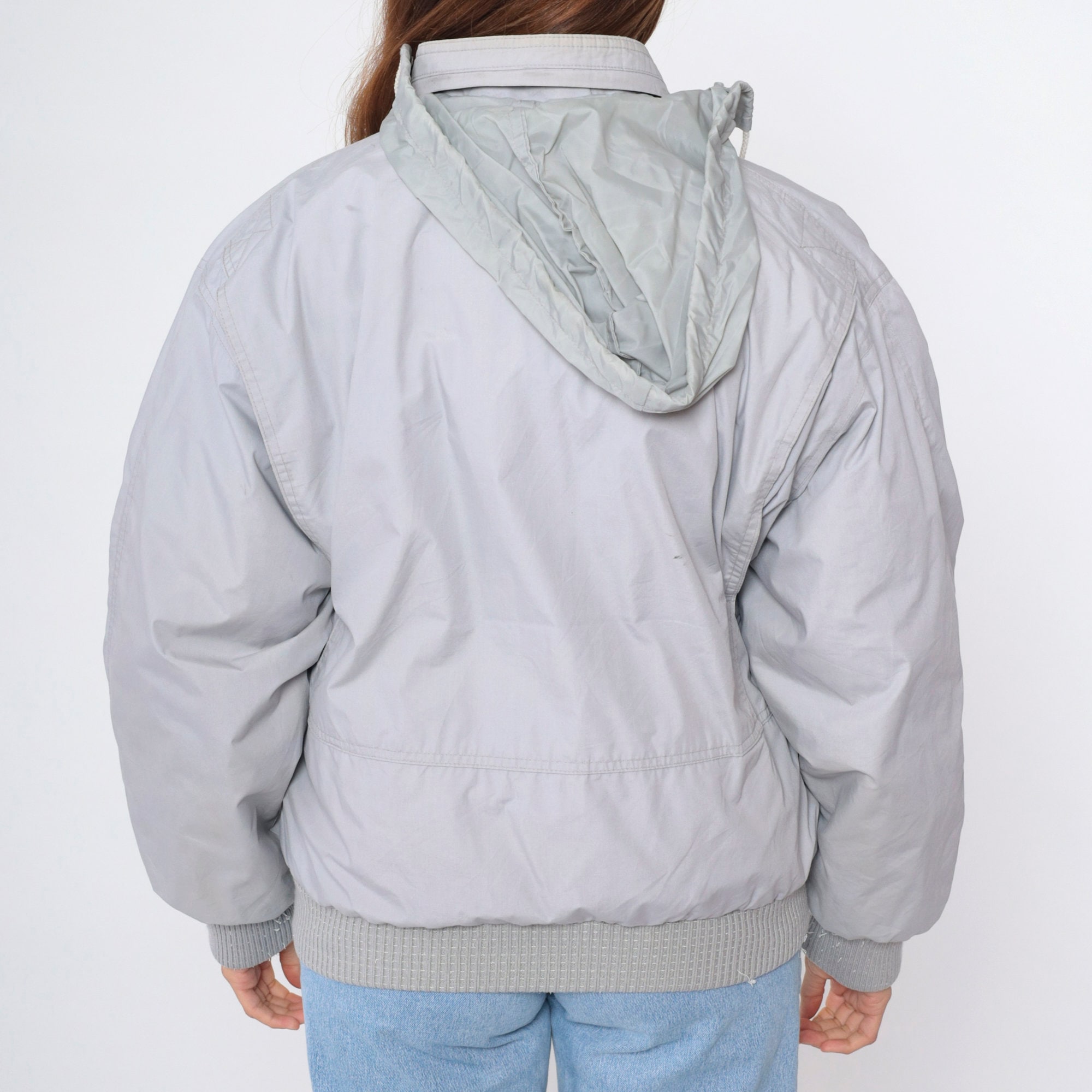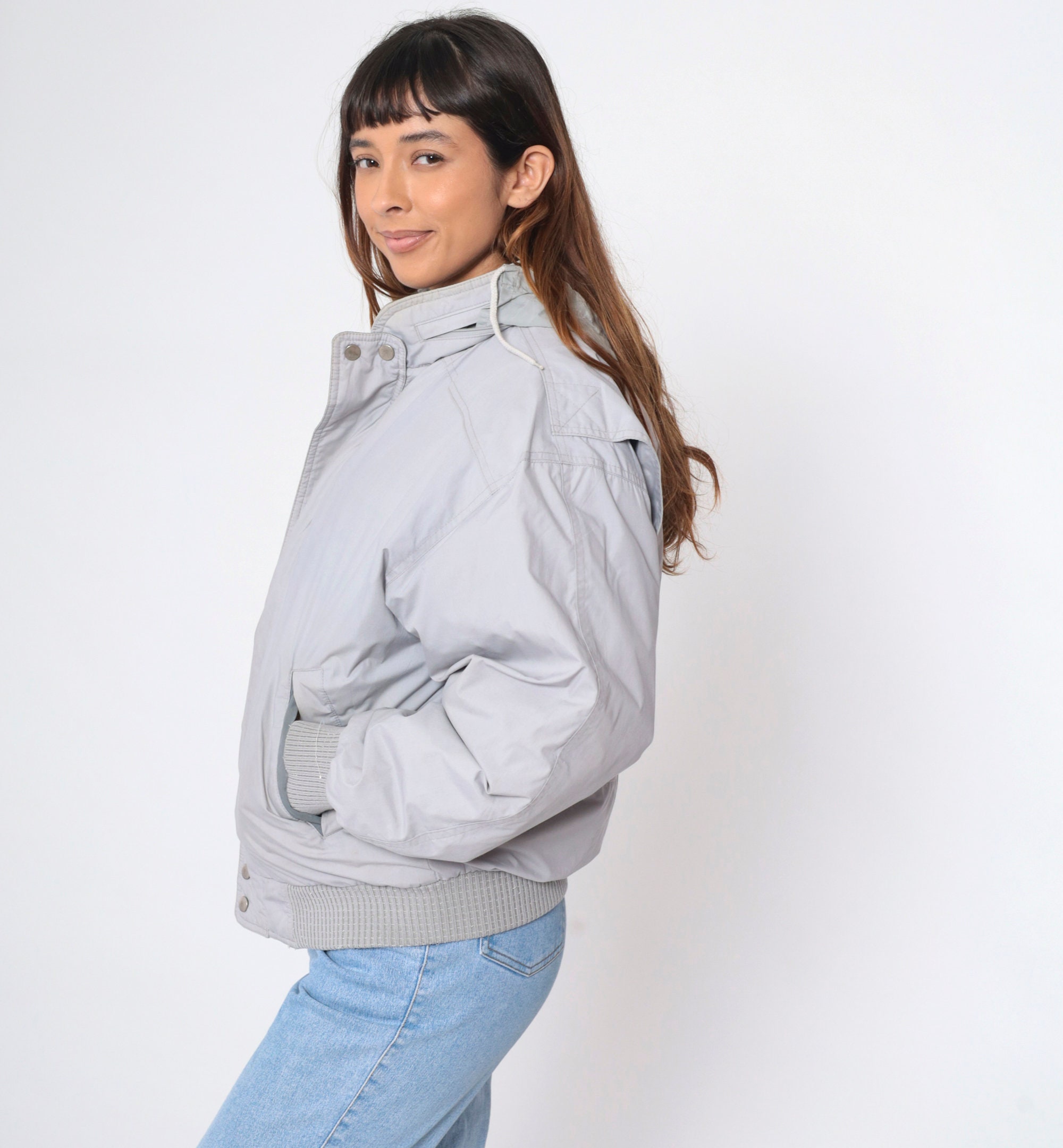 Vintage 80s Members Only jacket in grey with a down fill and a zip in hood. Originally for men.