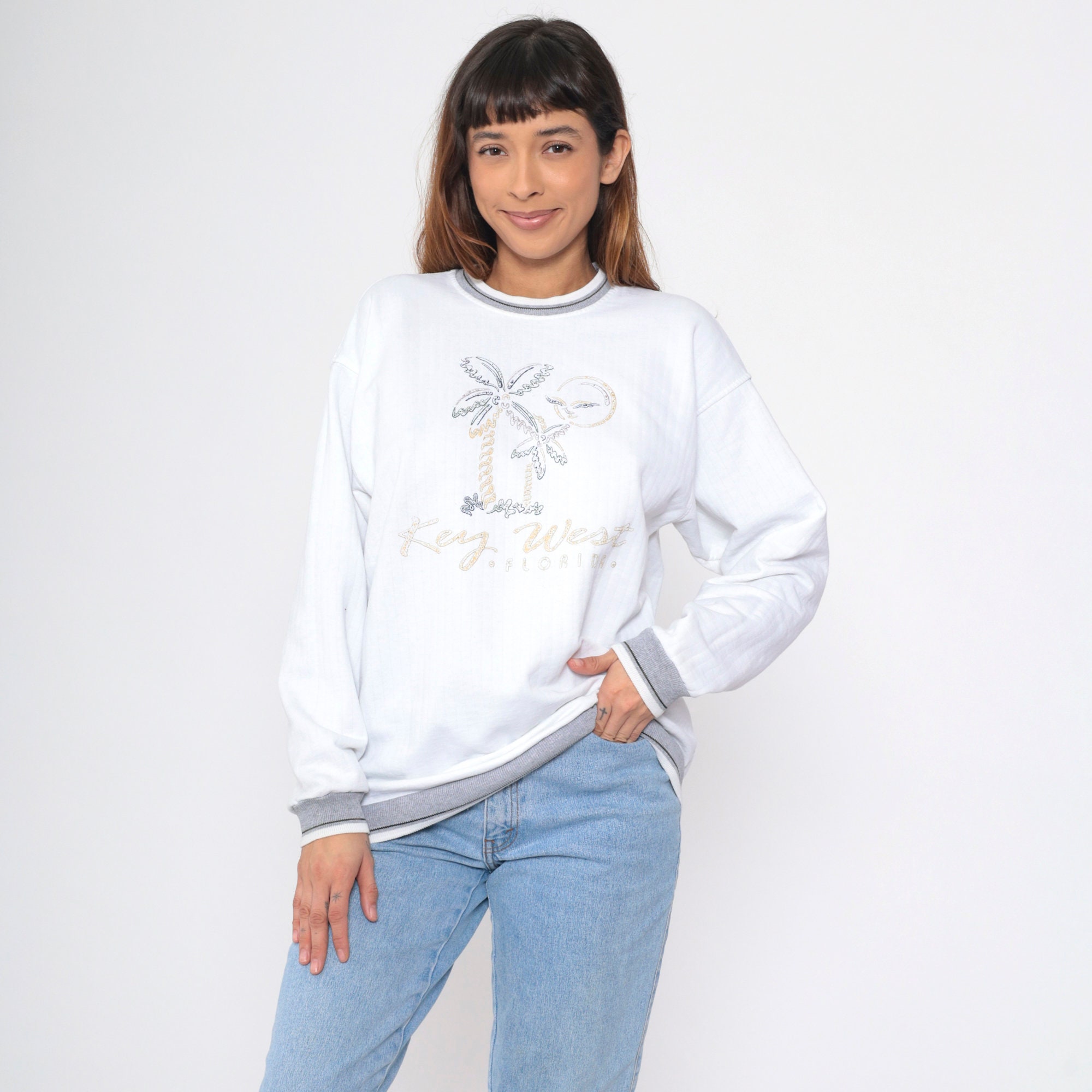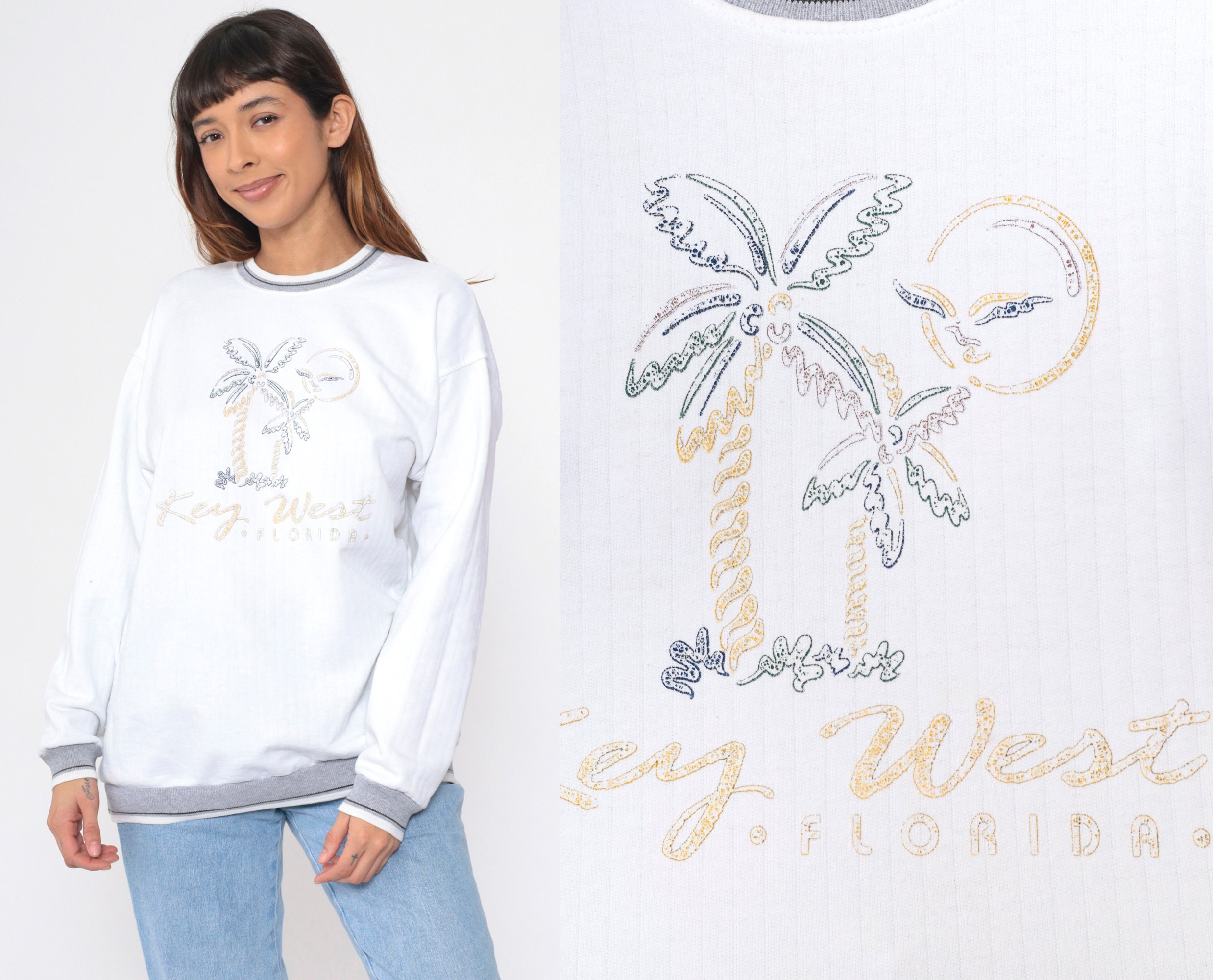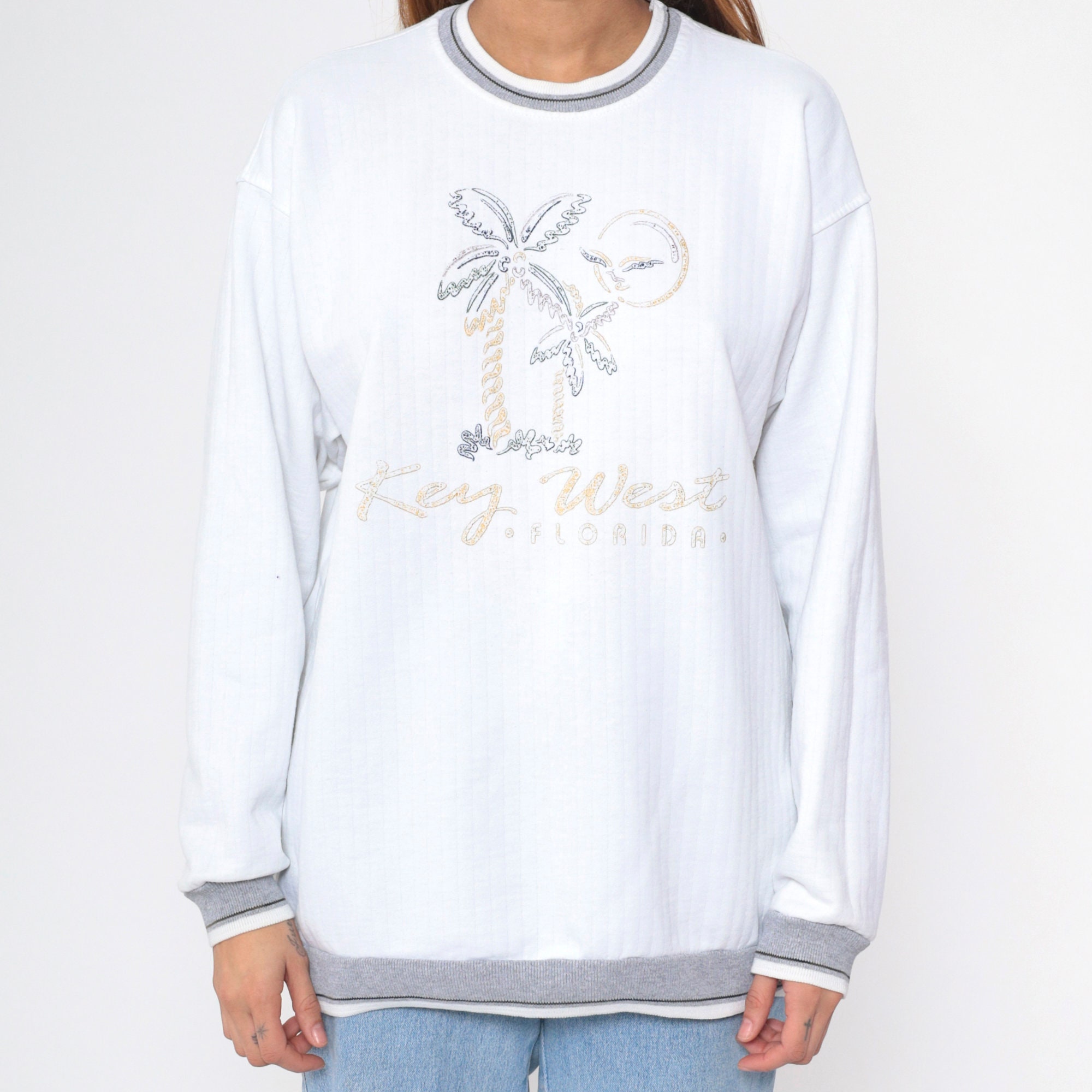 Vintage 90s sweatshirt with a Key West, Florida print with a beach graphic and a ringer neckline.