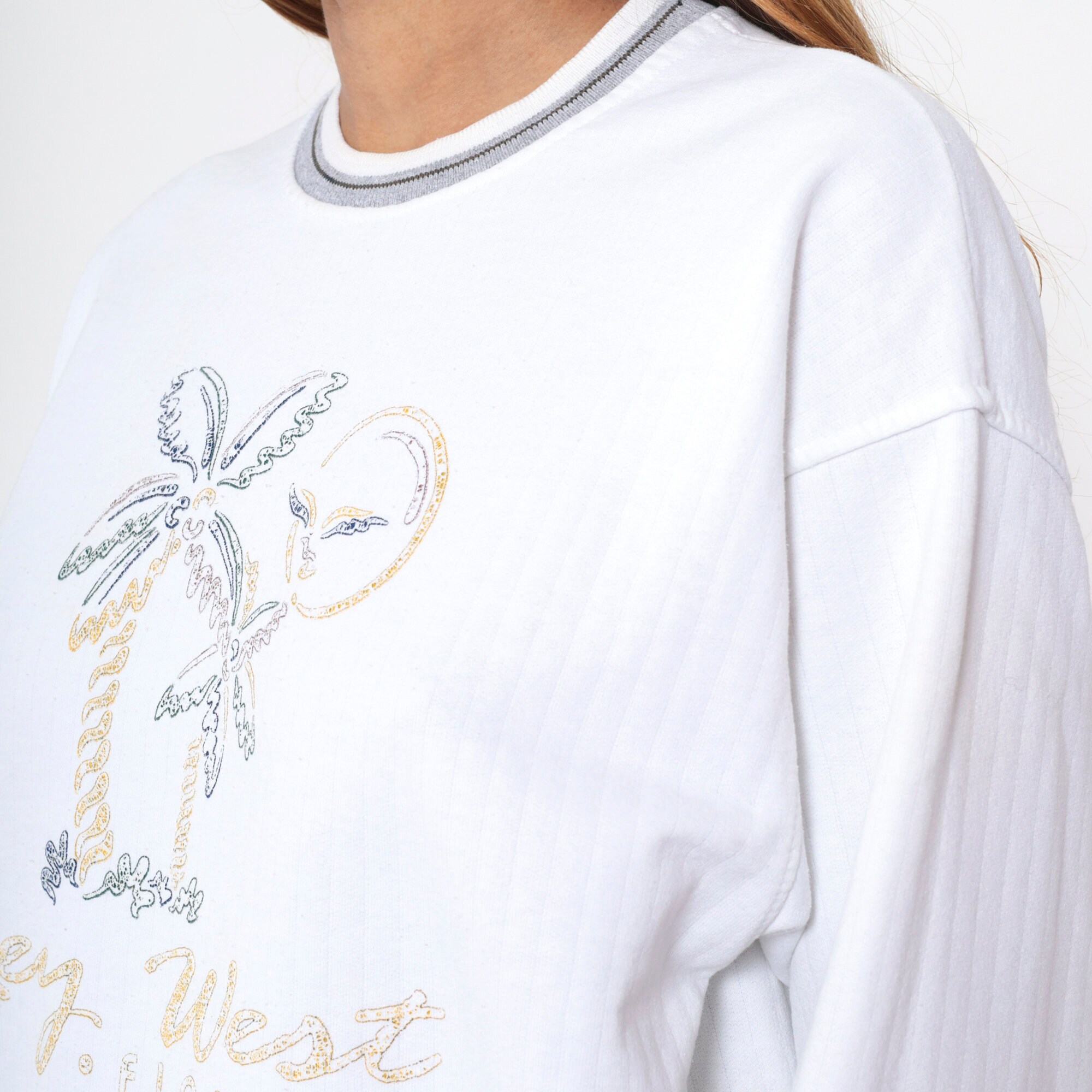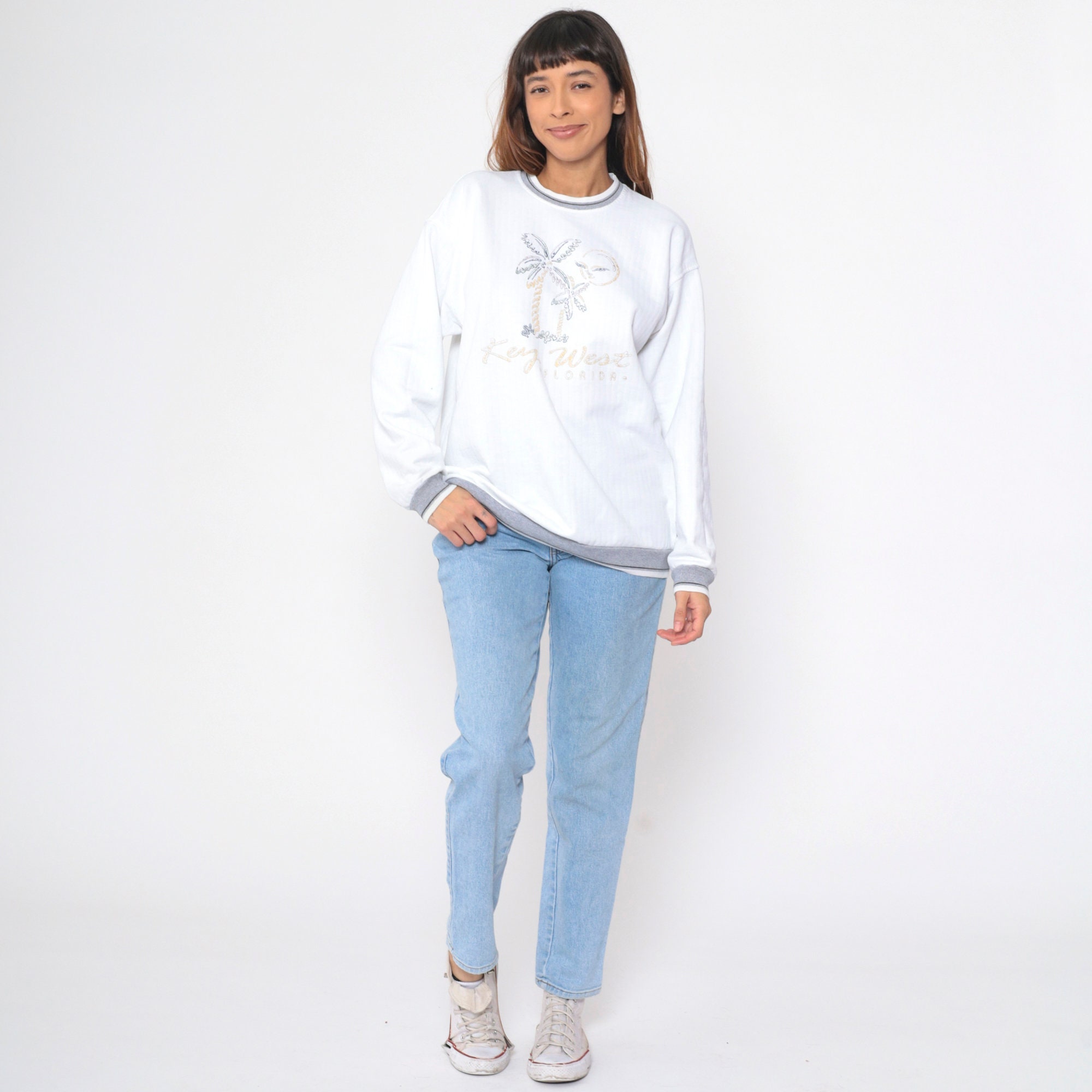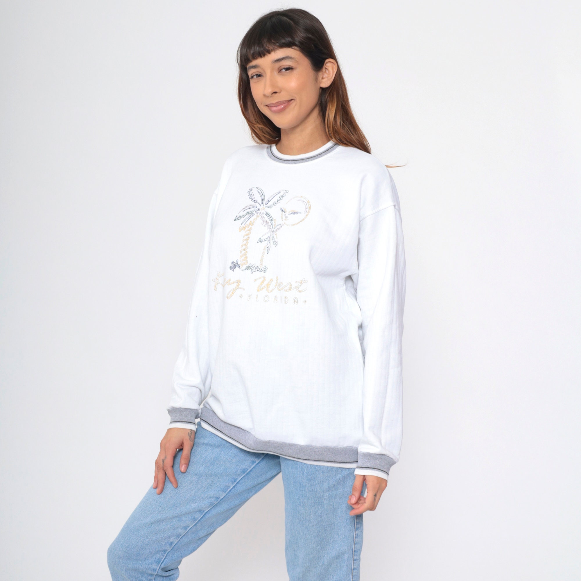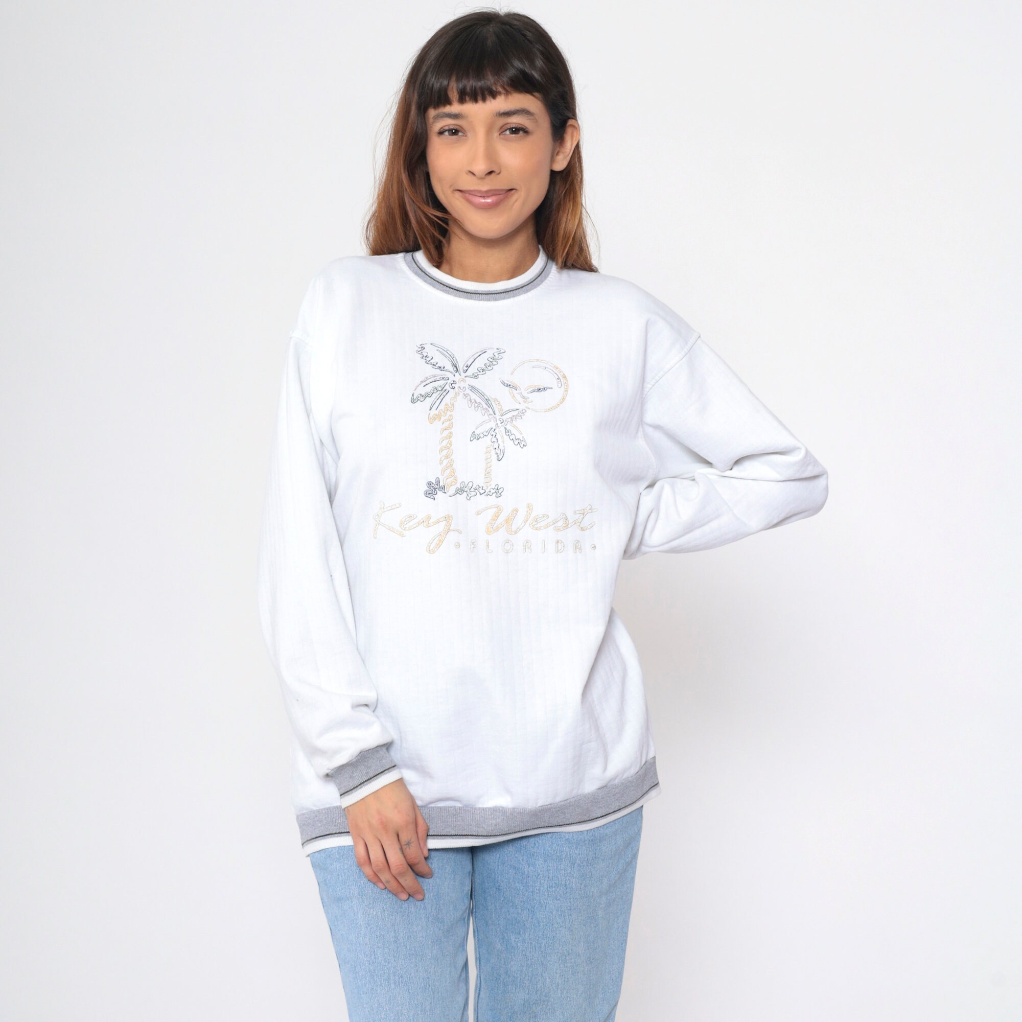 Vintage 90s sweatshirt with a Key West, Florida print with a beach graphic and a ringer neckline.
