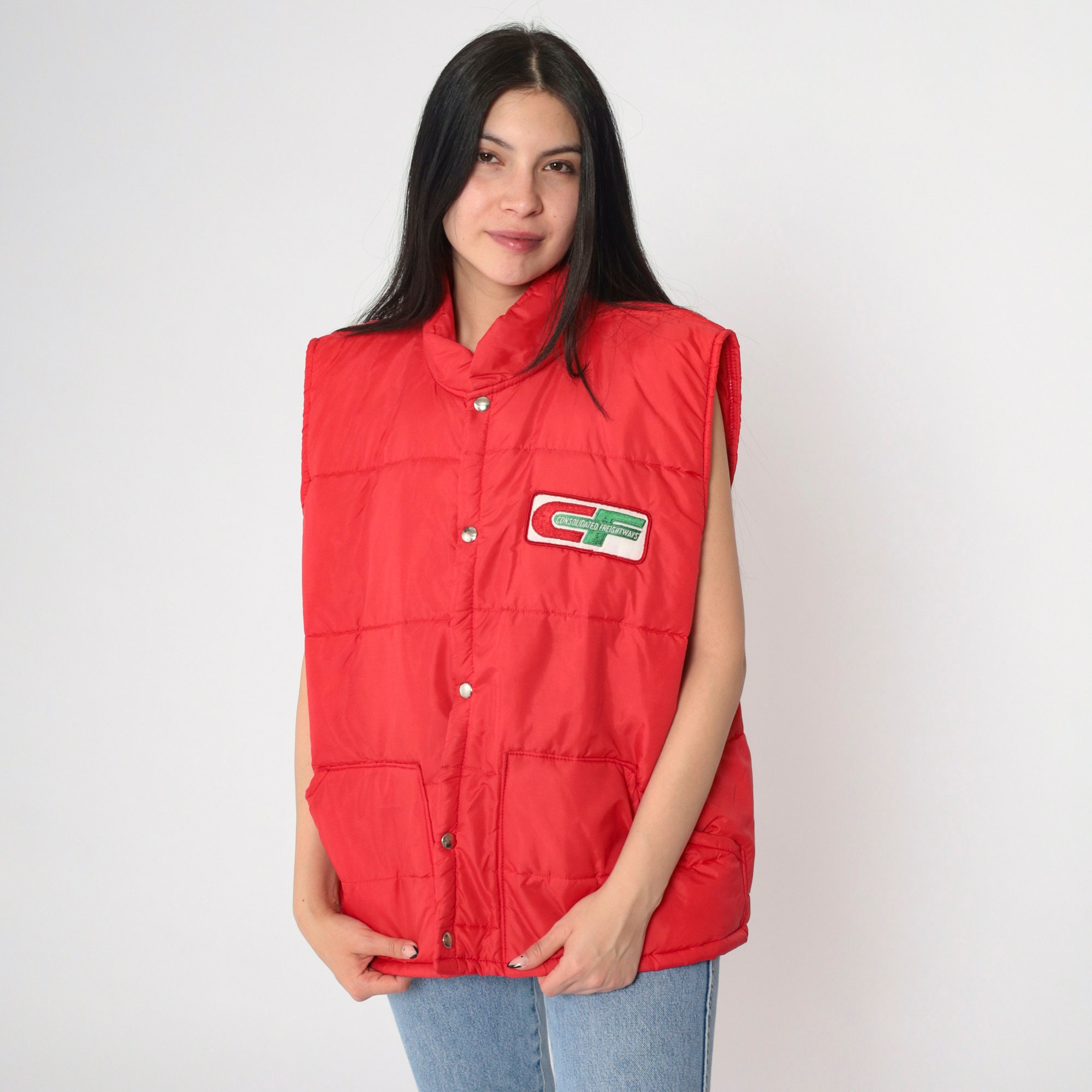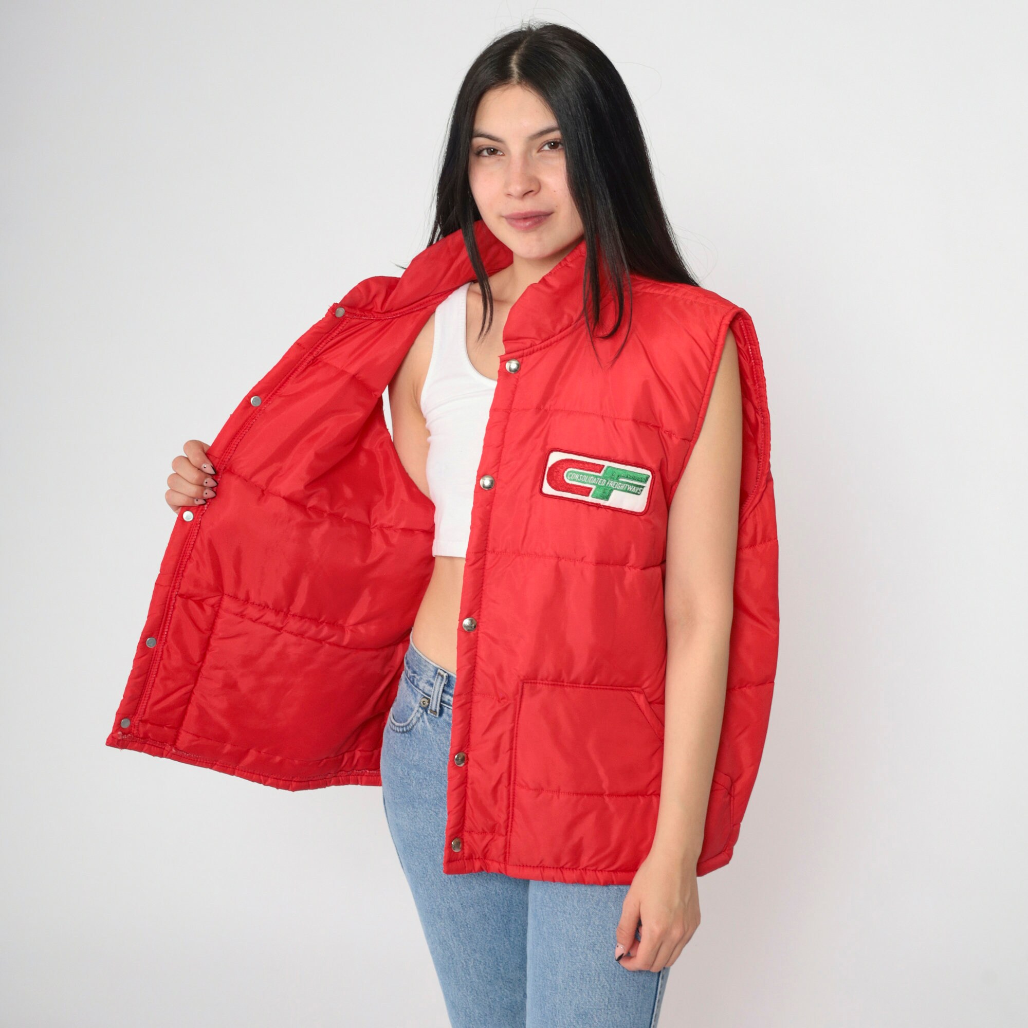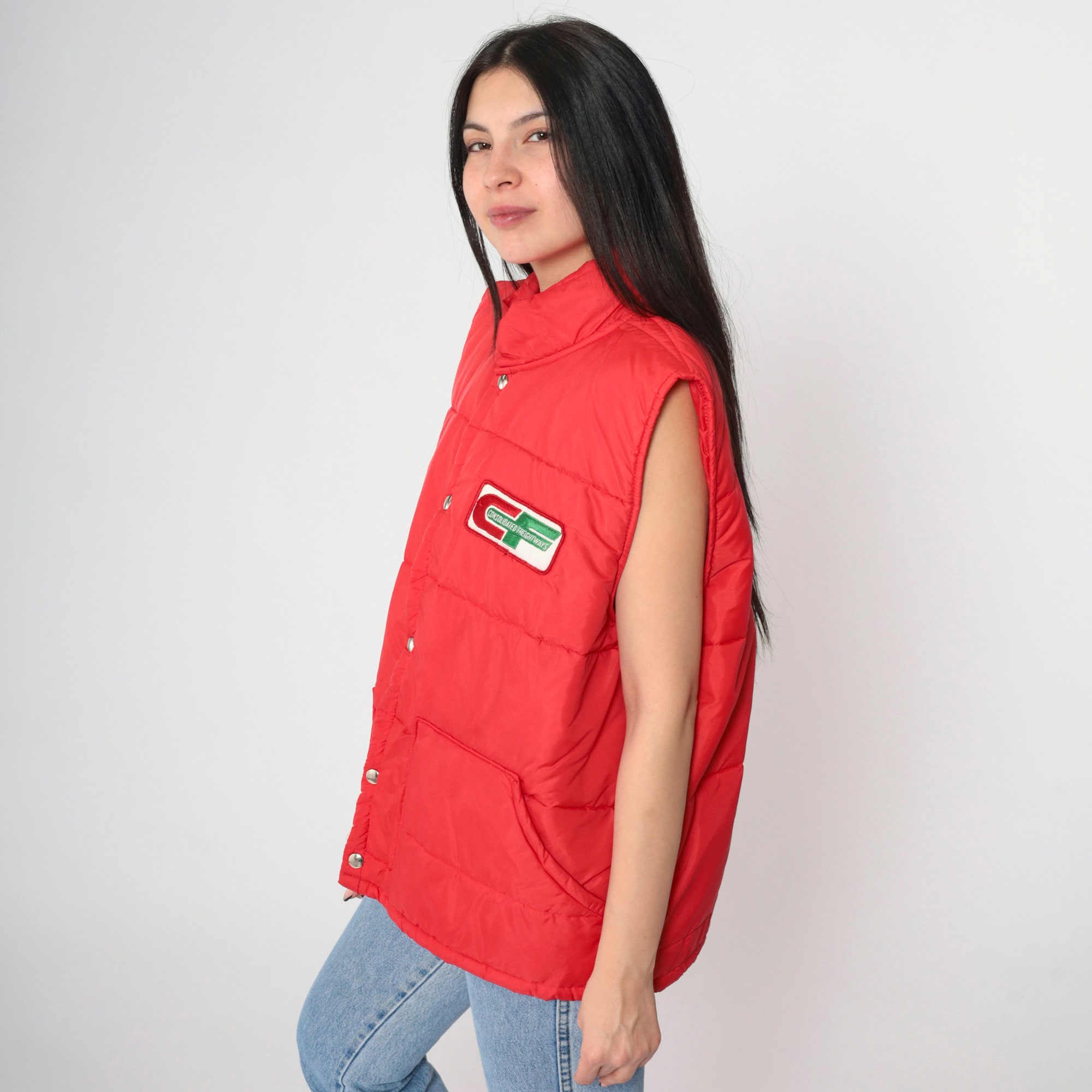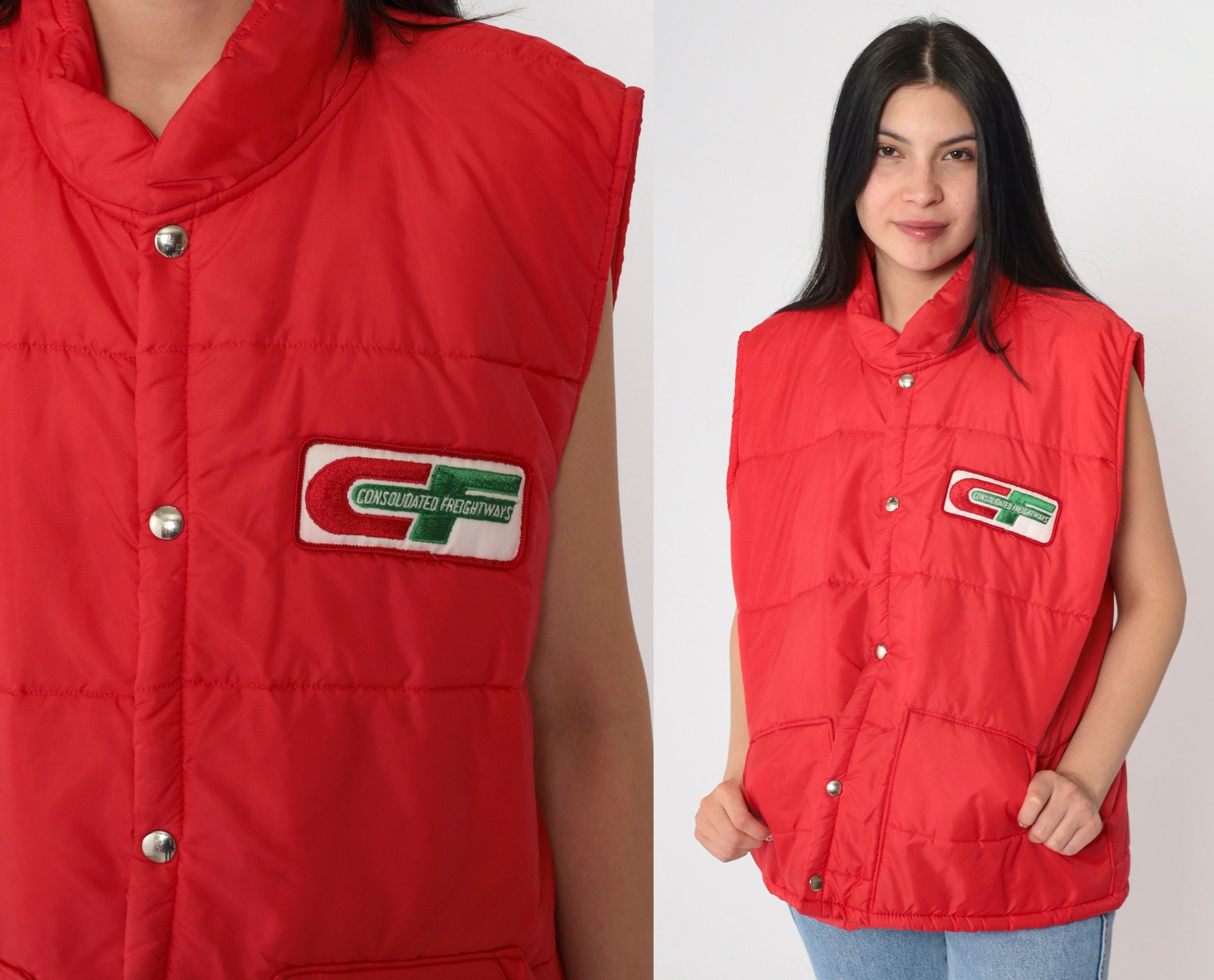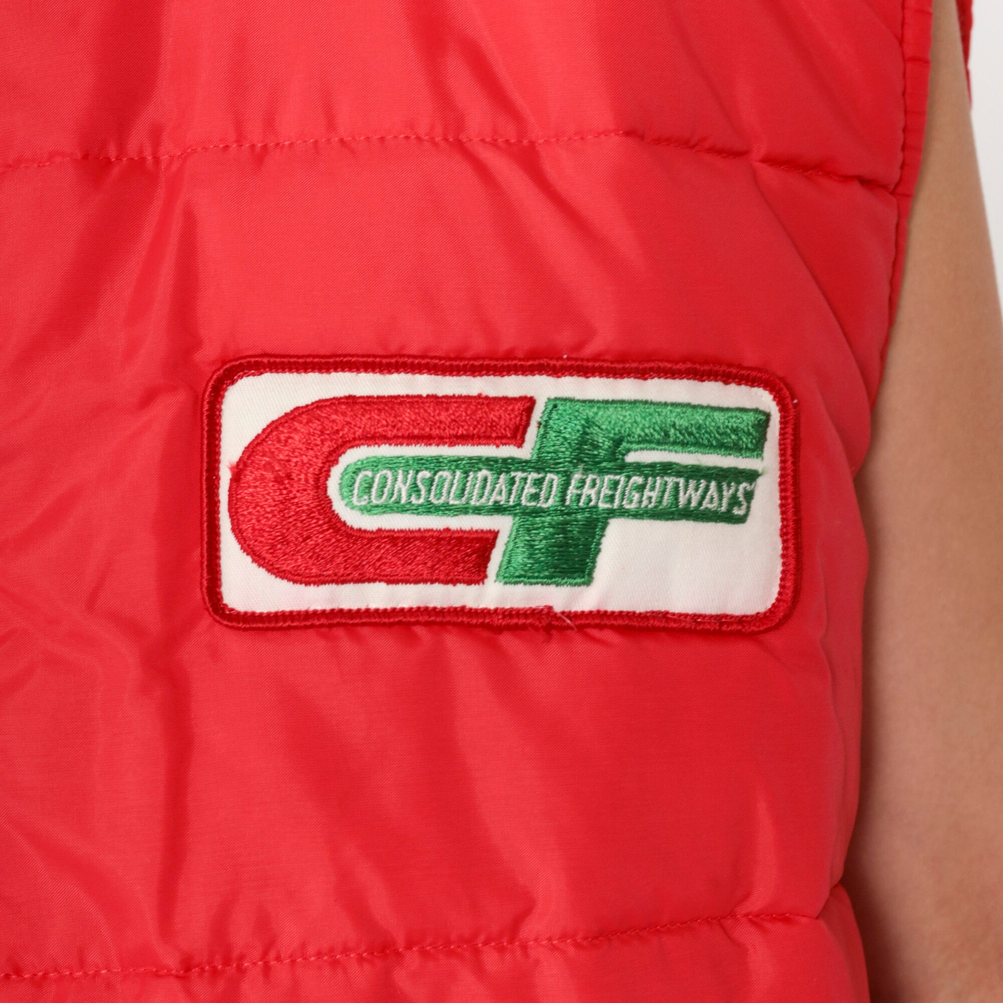 Vintage 80s ski vest in red with snaps up the front and a Consolidated Freightways patch on the chest.