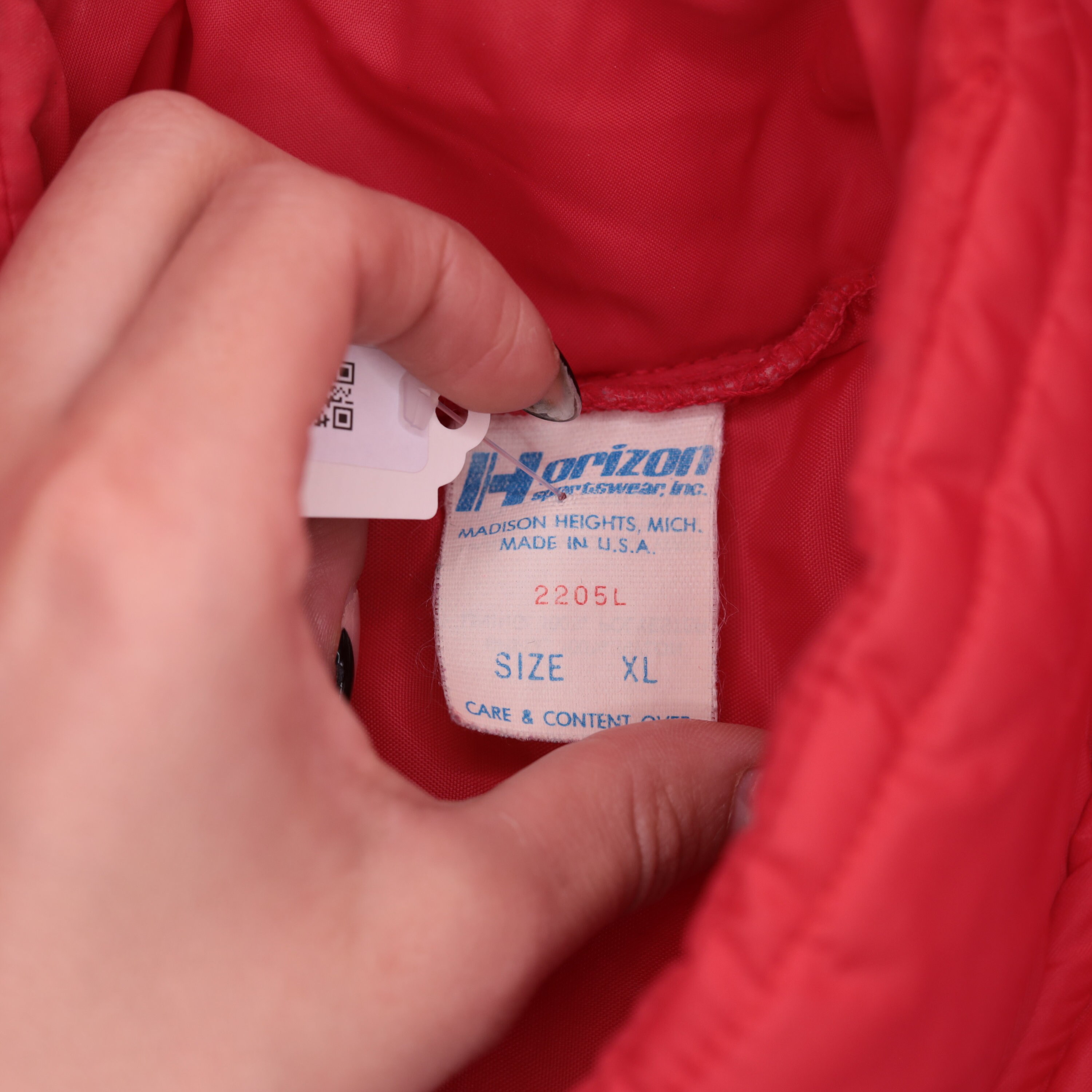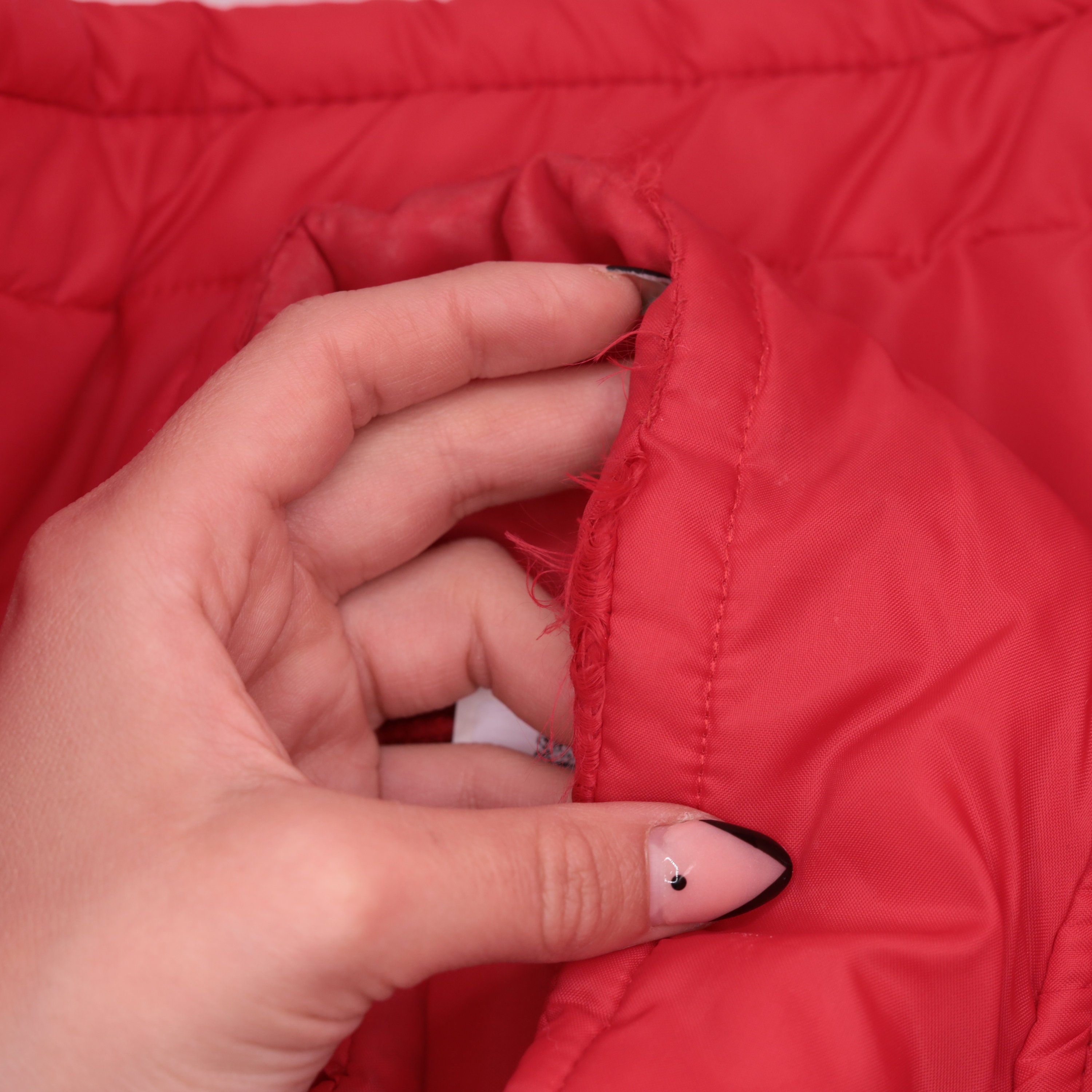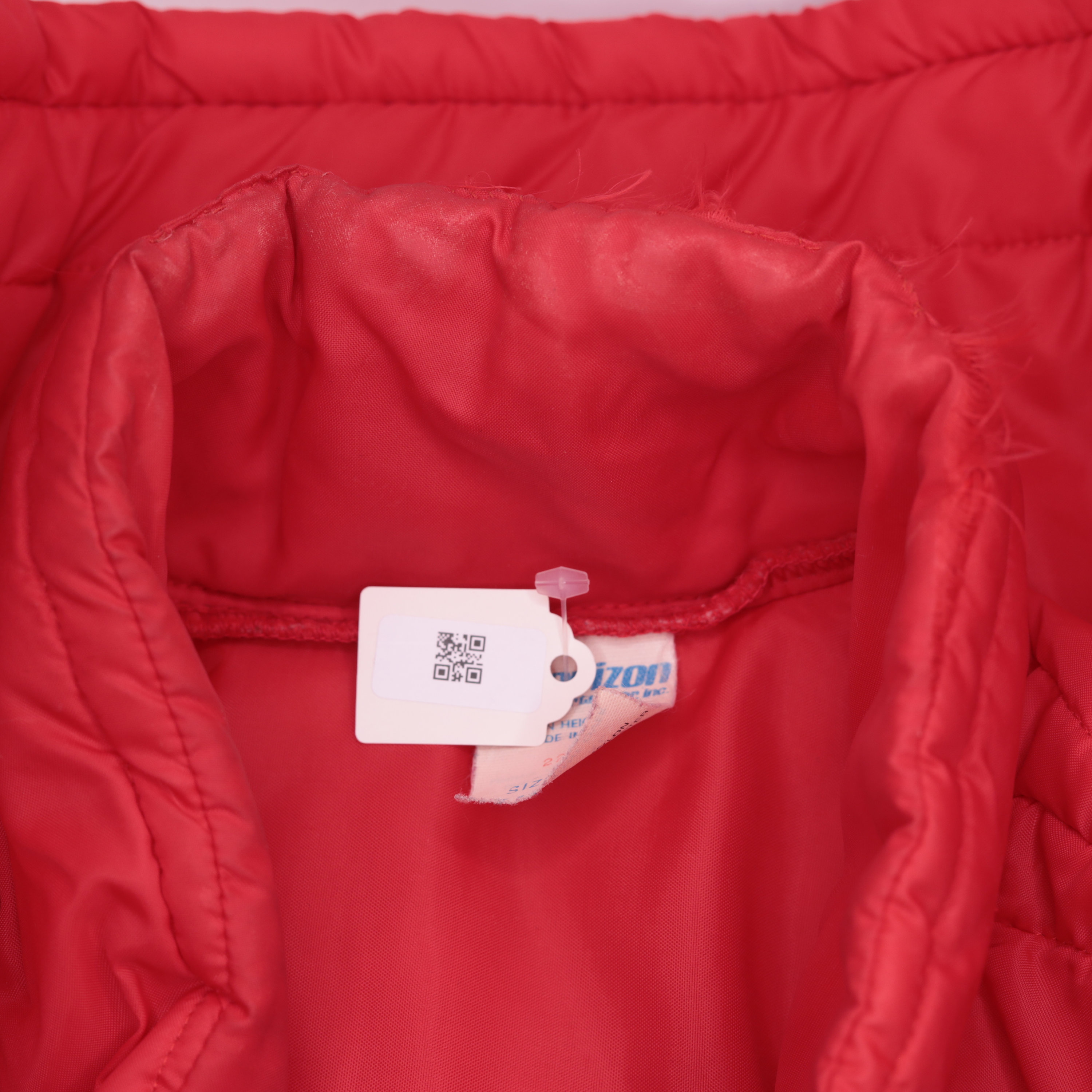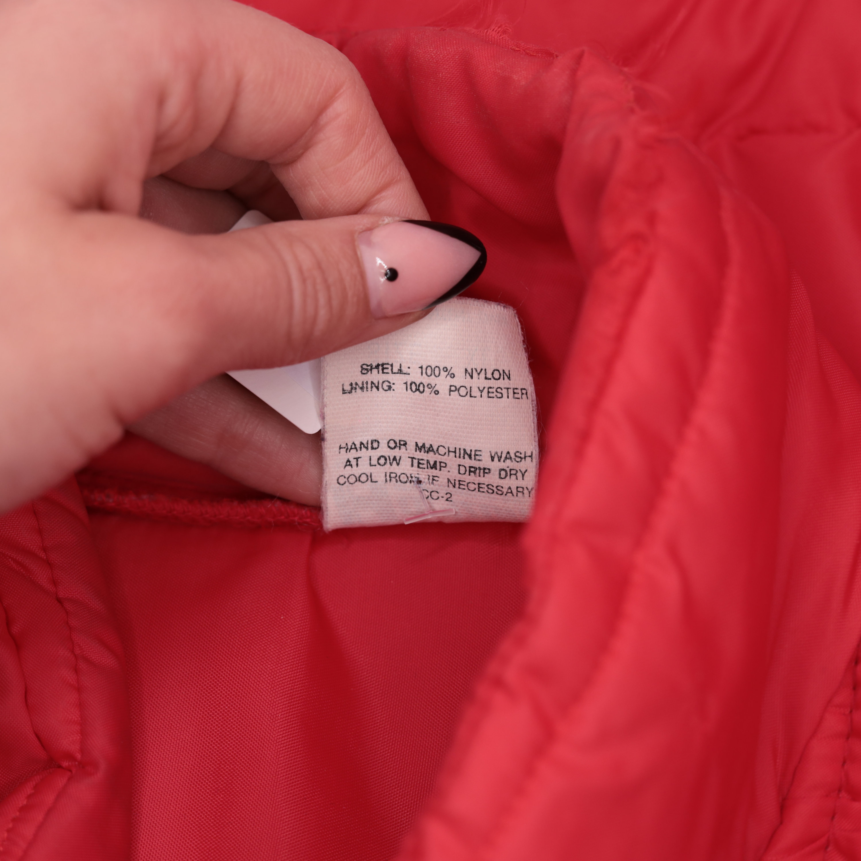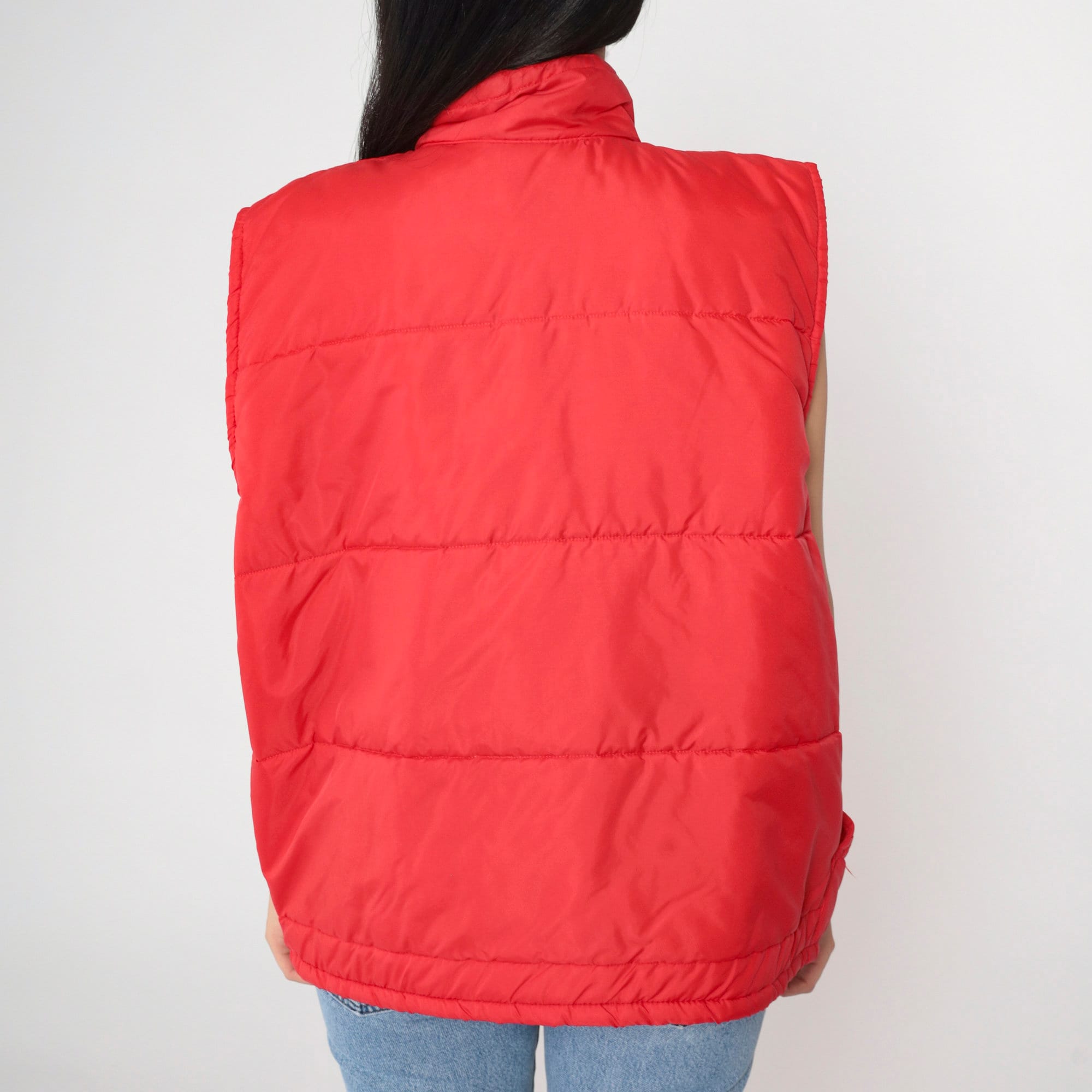 Vintage 80s ski vest in red with snaps up the front and a Consolidated Freightways patch on the chest.