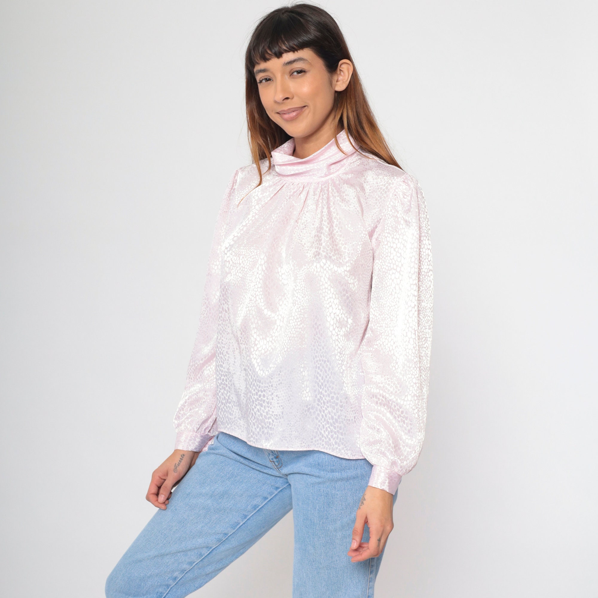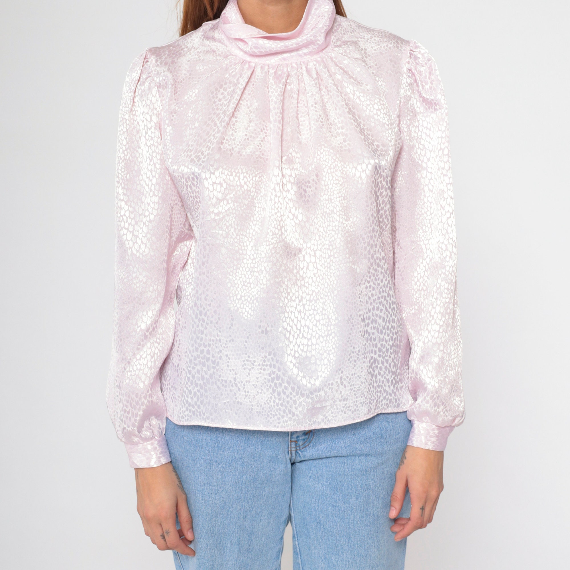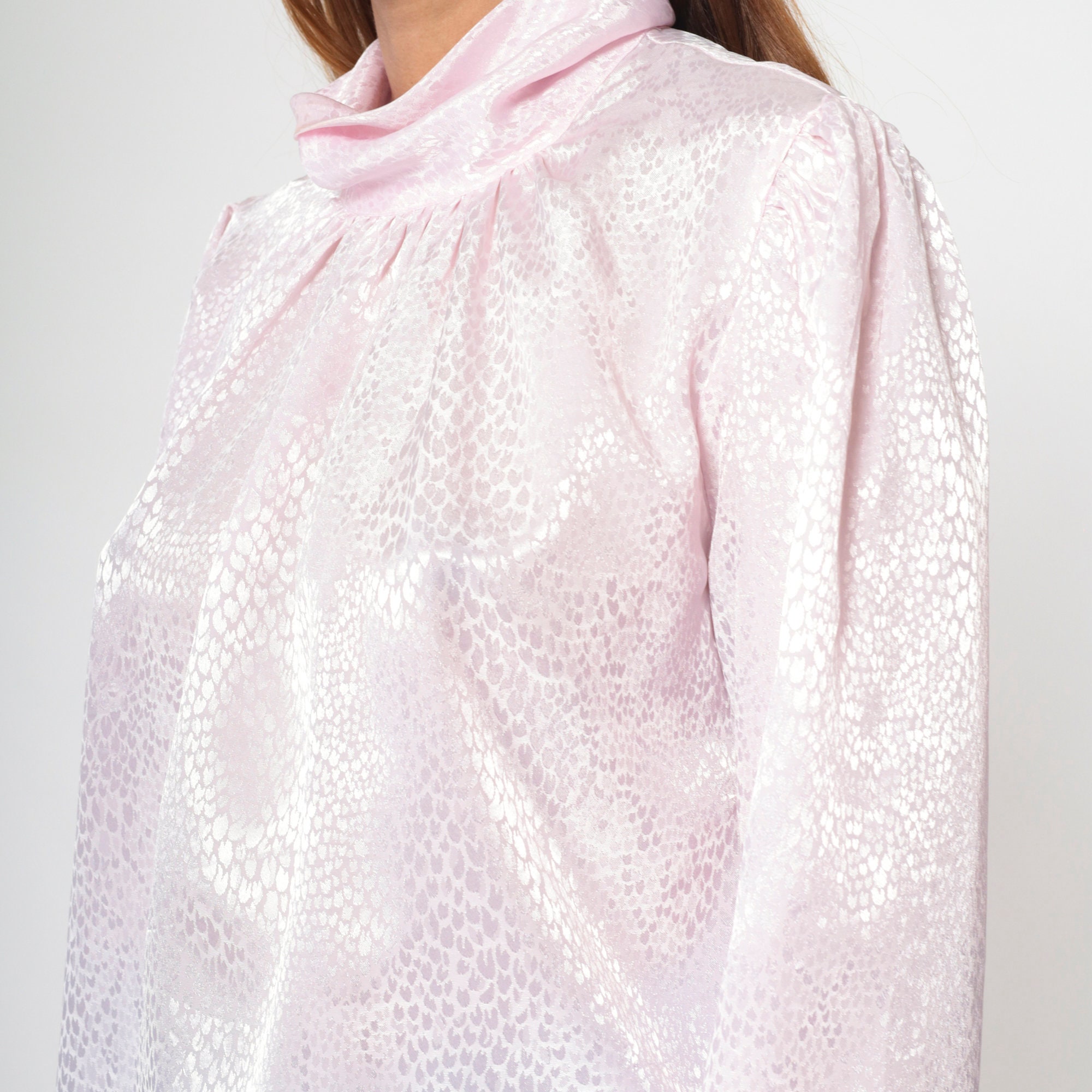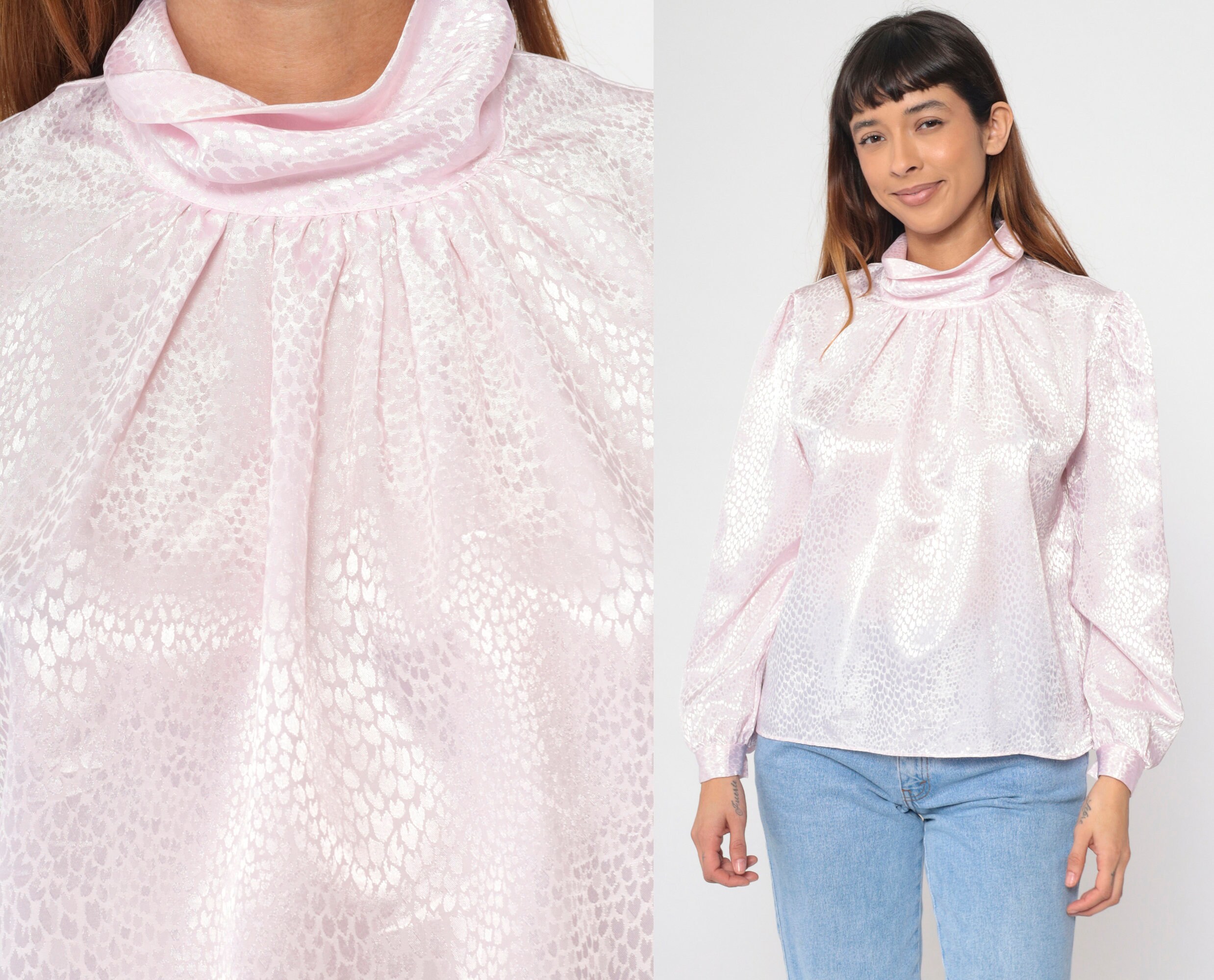 Vintage 80s blouse in light pink with an embossed snakeskin print. It features a turtleneck and puff sleeves. Buttons at the back of the neck.