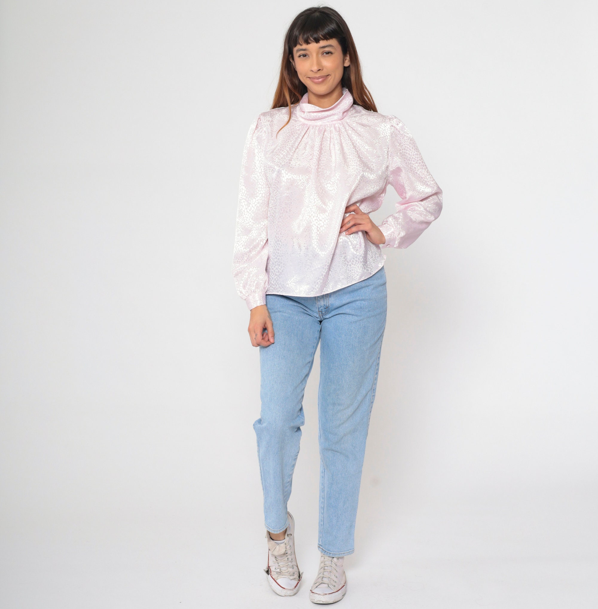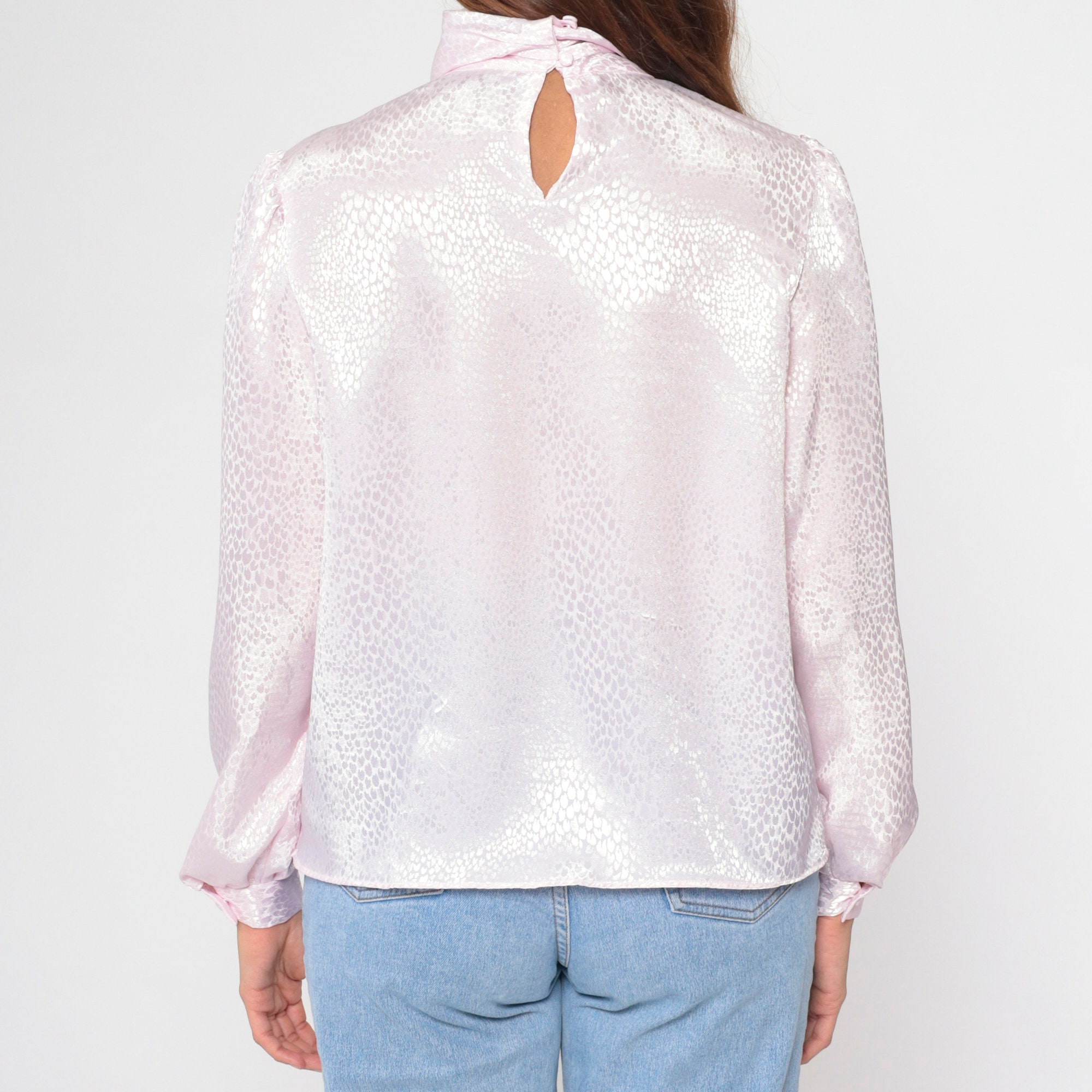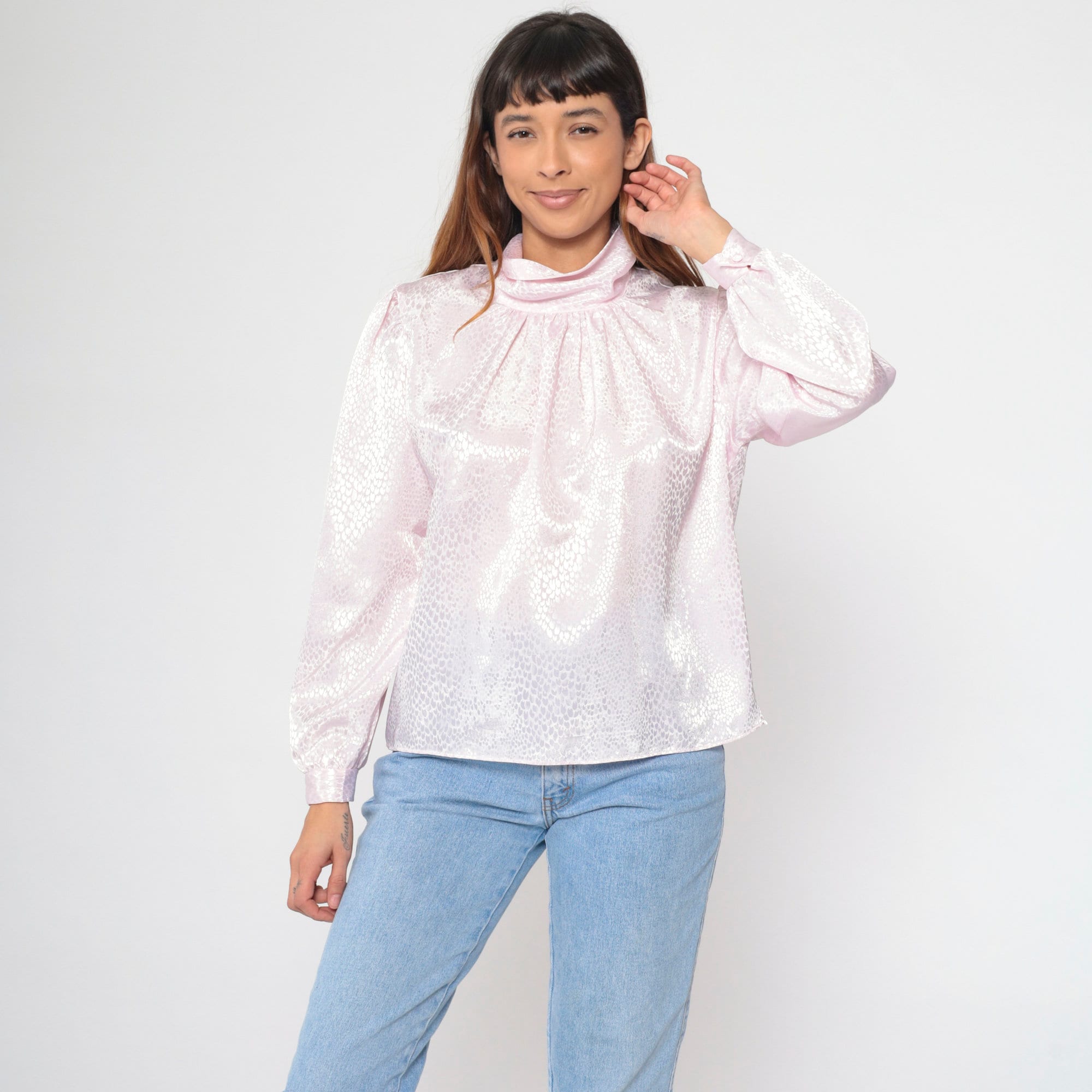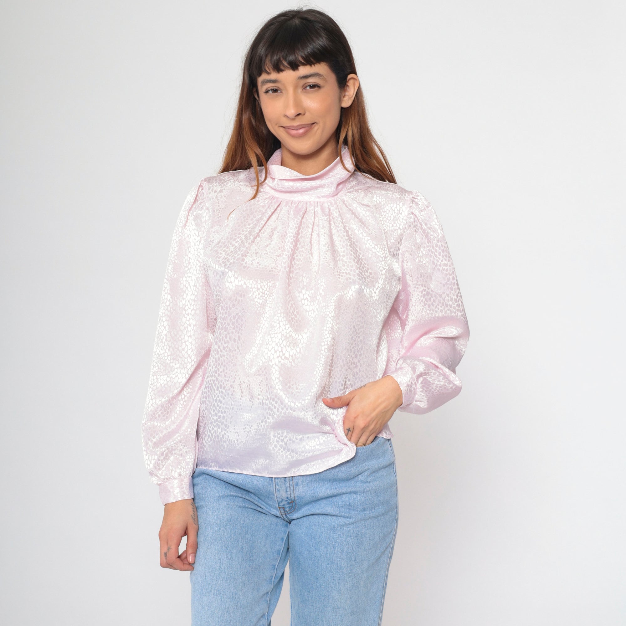 Vintage 80s blouse in light pink with an embossed snakeskin print. It features a turtleneck and puff sleeves. Buttons at the back of the neck.
