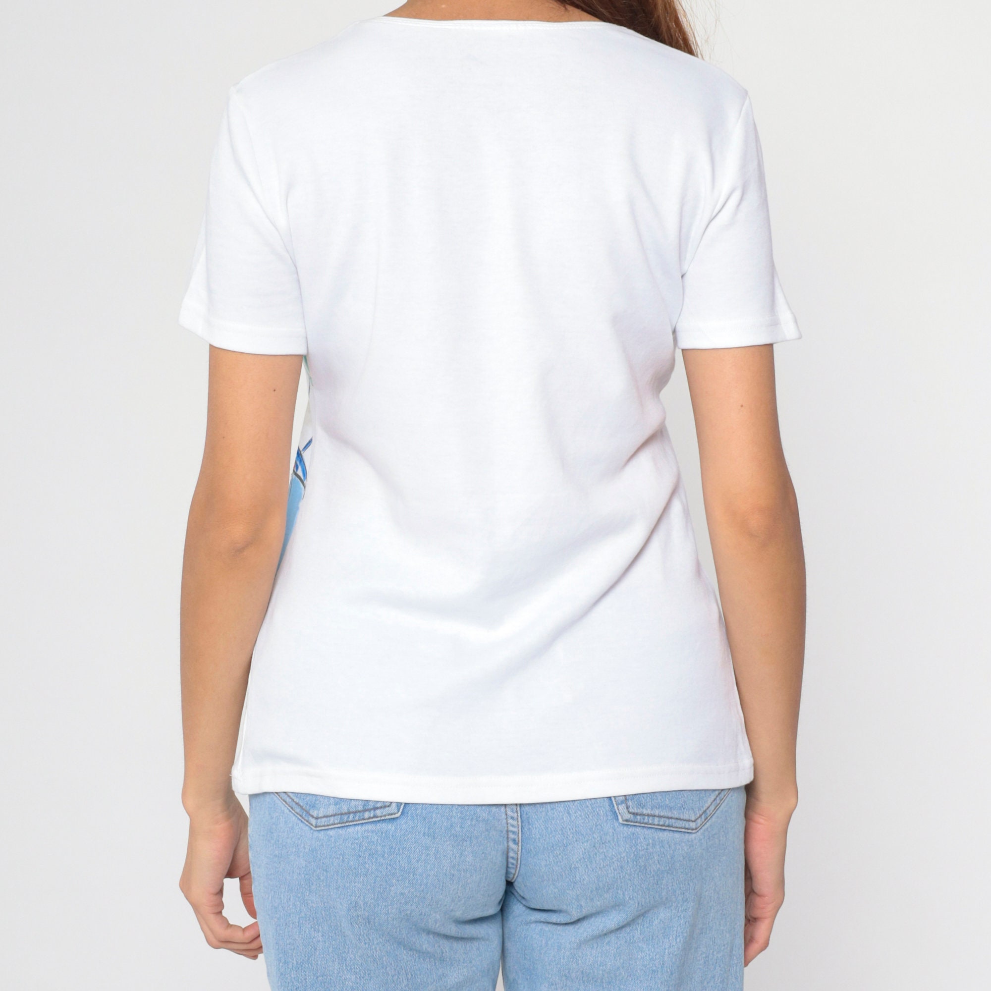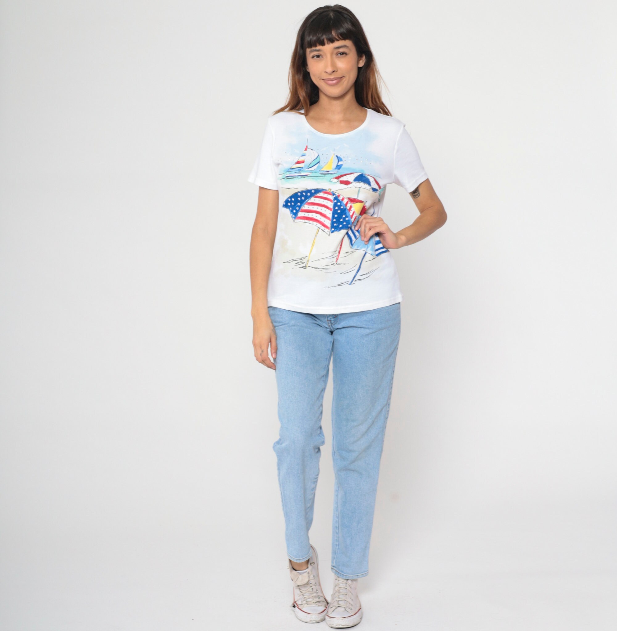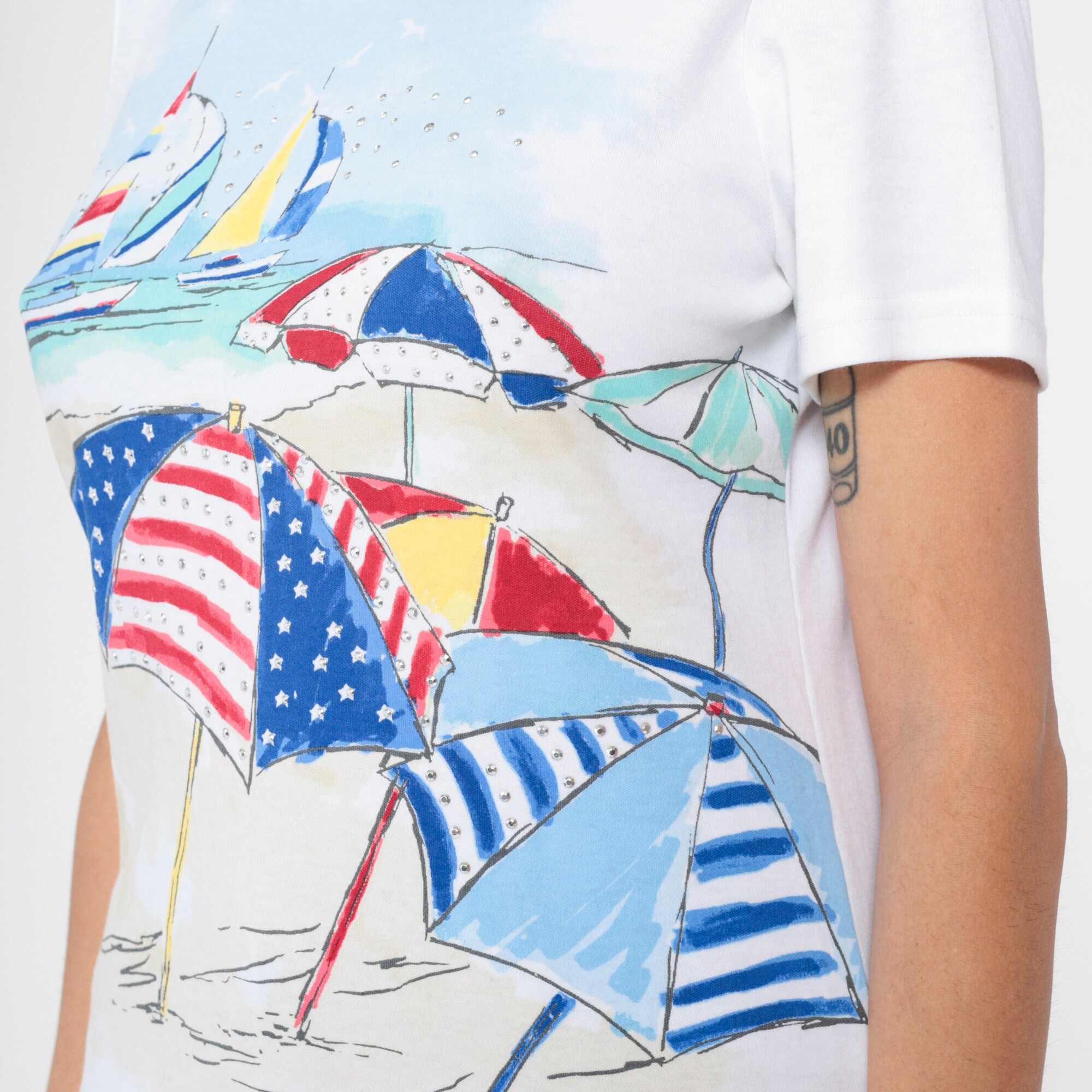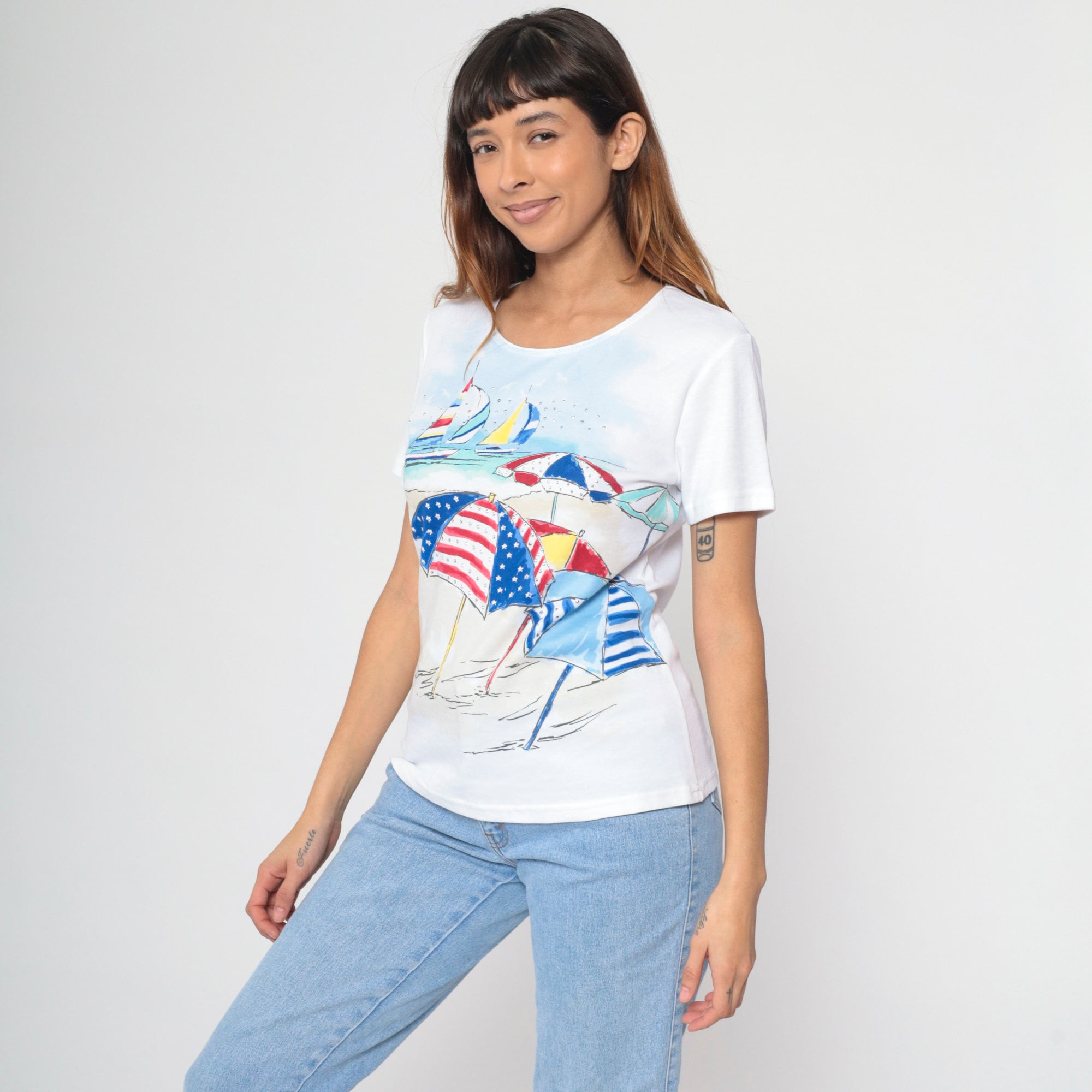 Vintage 90s shirt with a studded beach umbrella and sailboat print.
