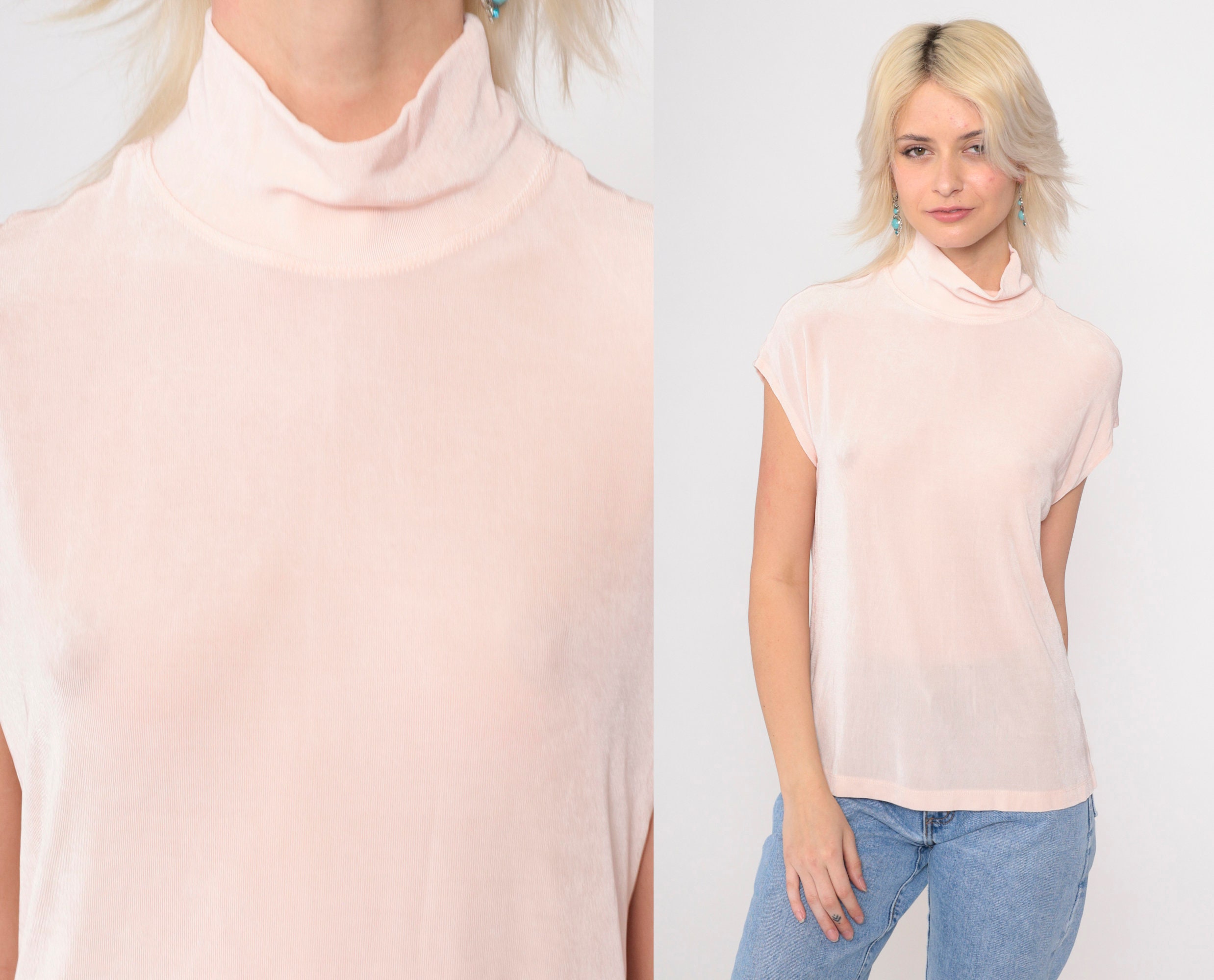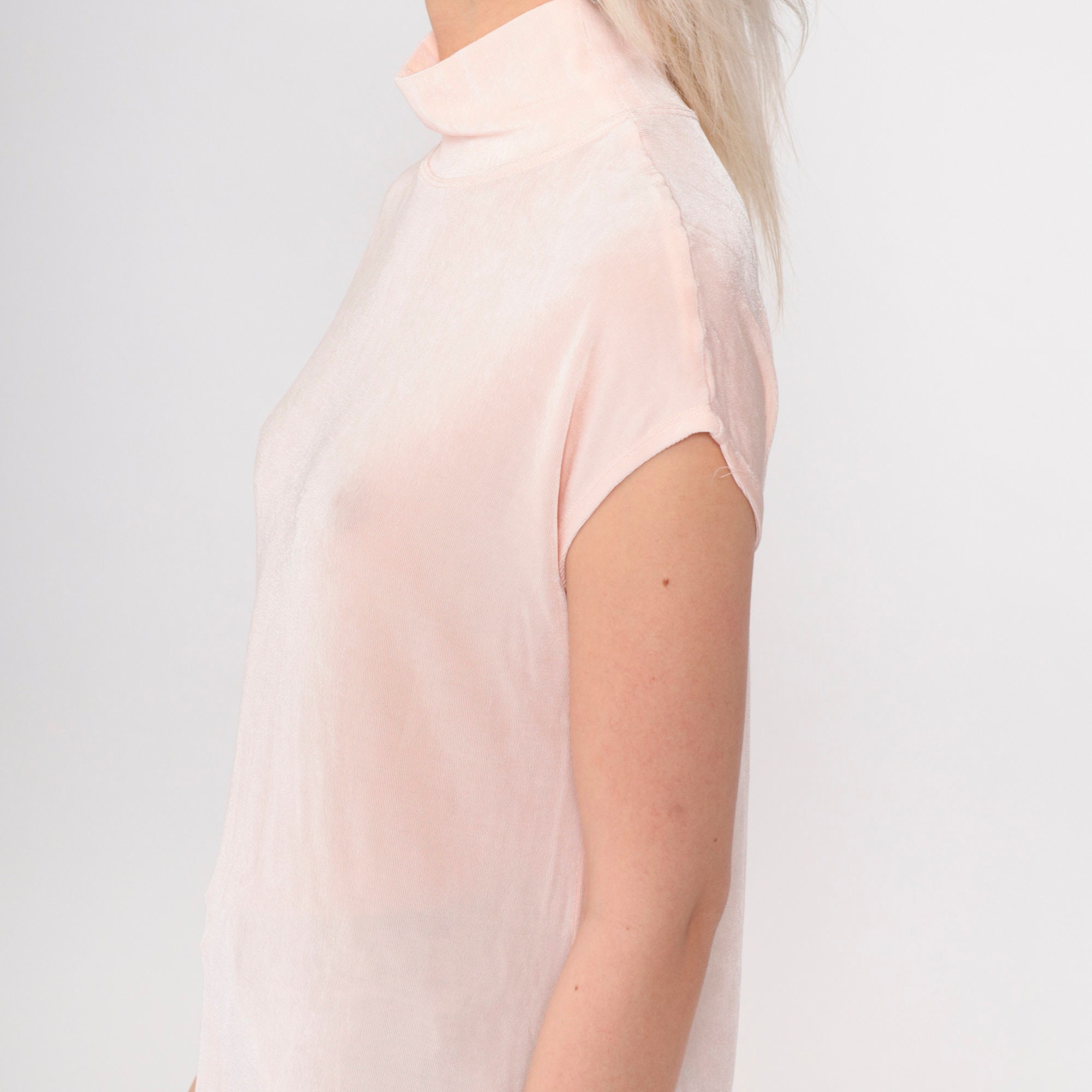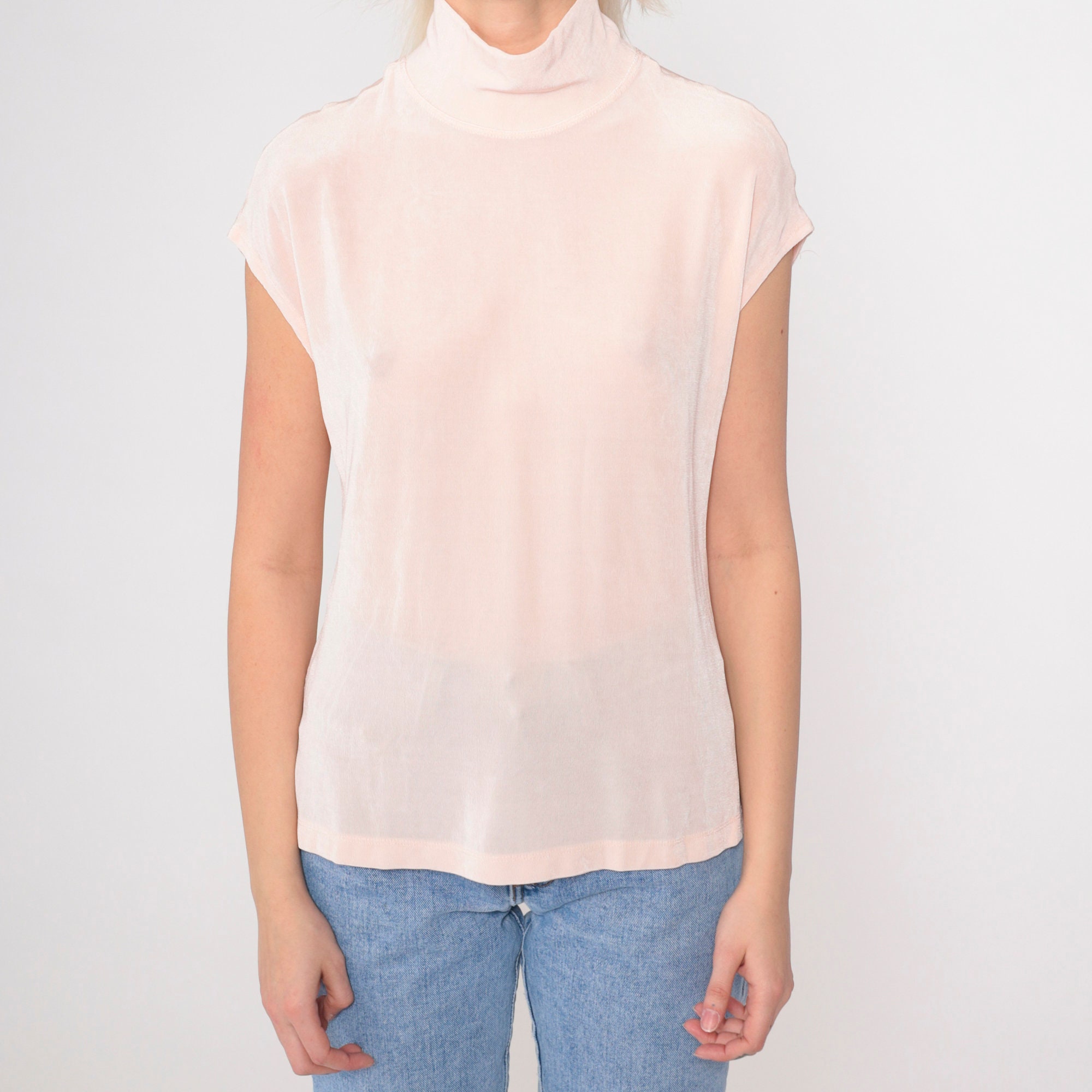 Vintage 90s t shirt in semi-sheer baby pink with cap sleeves and a mock neck. Tight fit.
