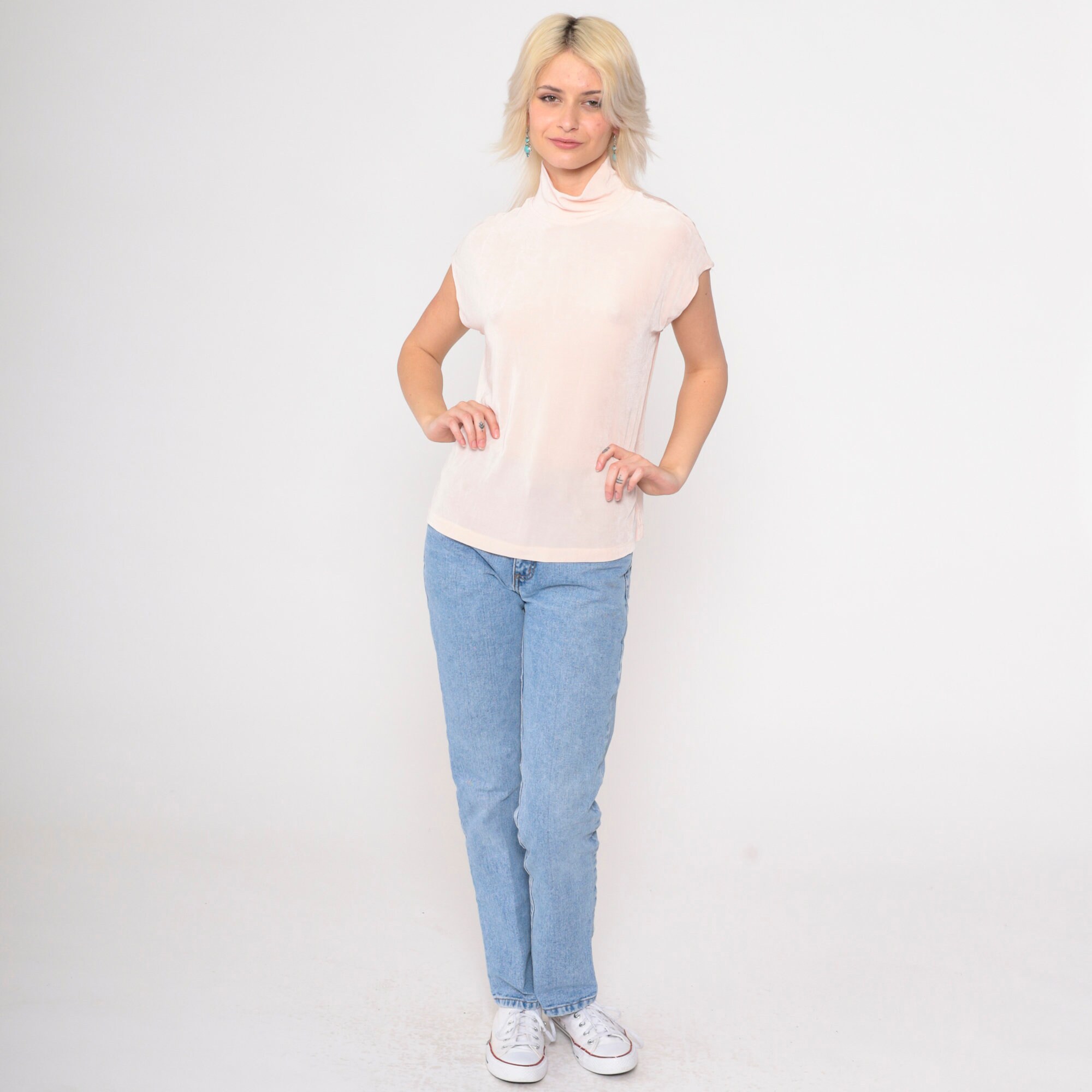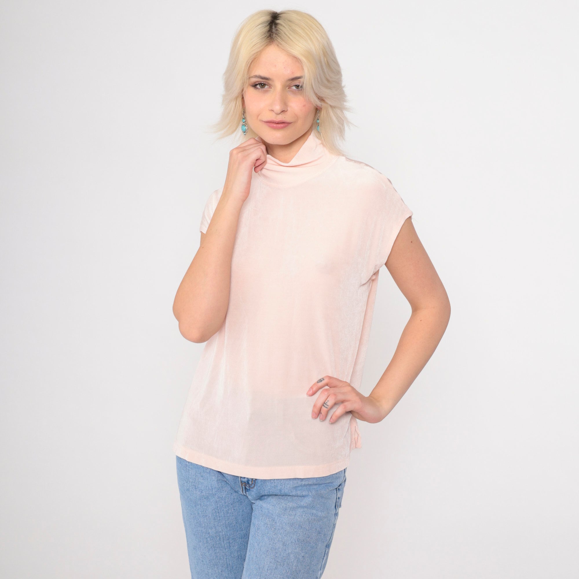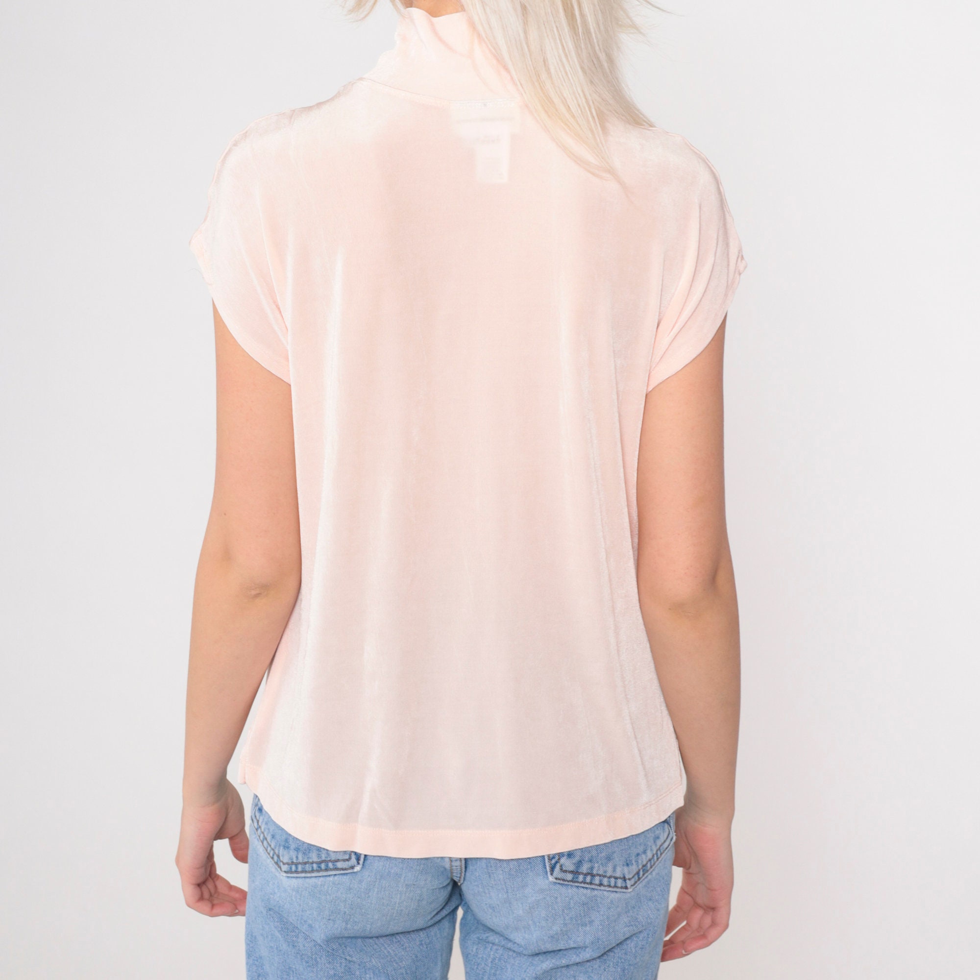 Vintage 90s t shirt in semi-sheer baby pink with cap sleeves and a mock neck. Tight fit.
