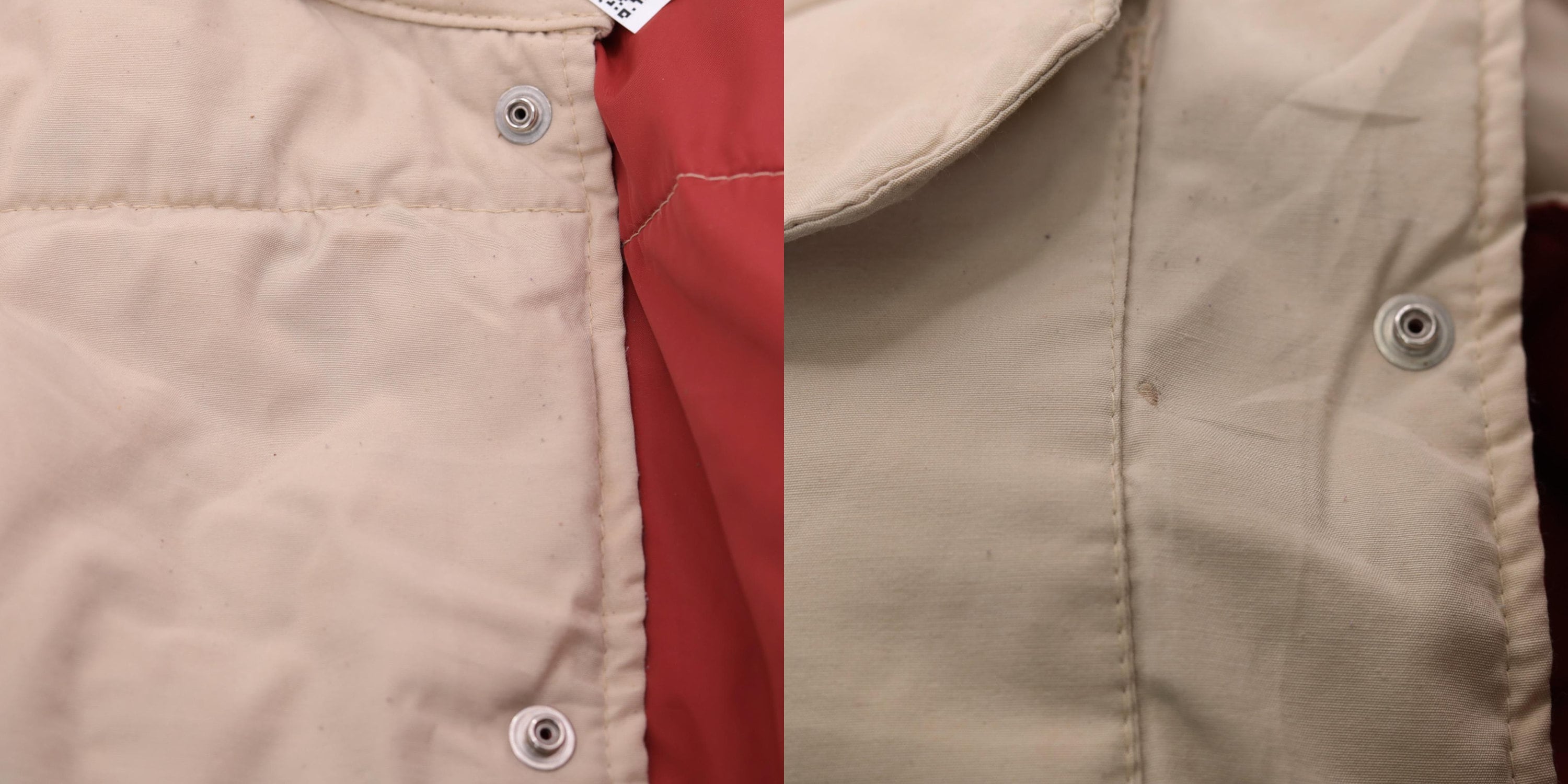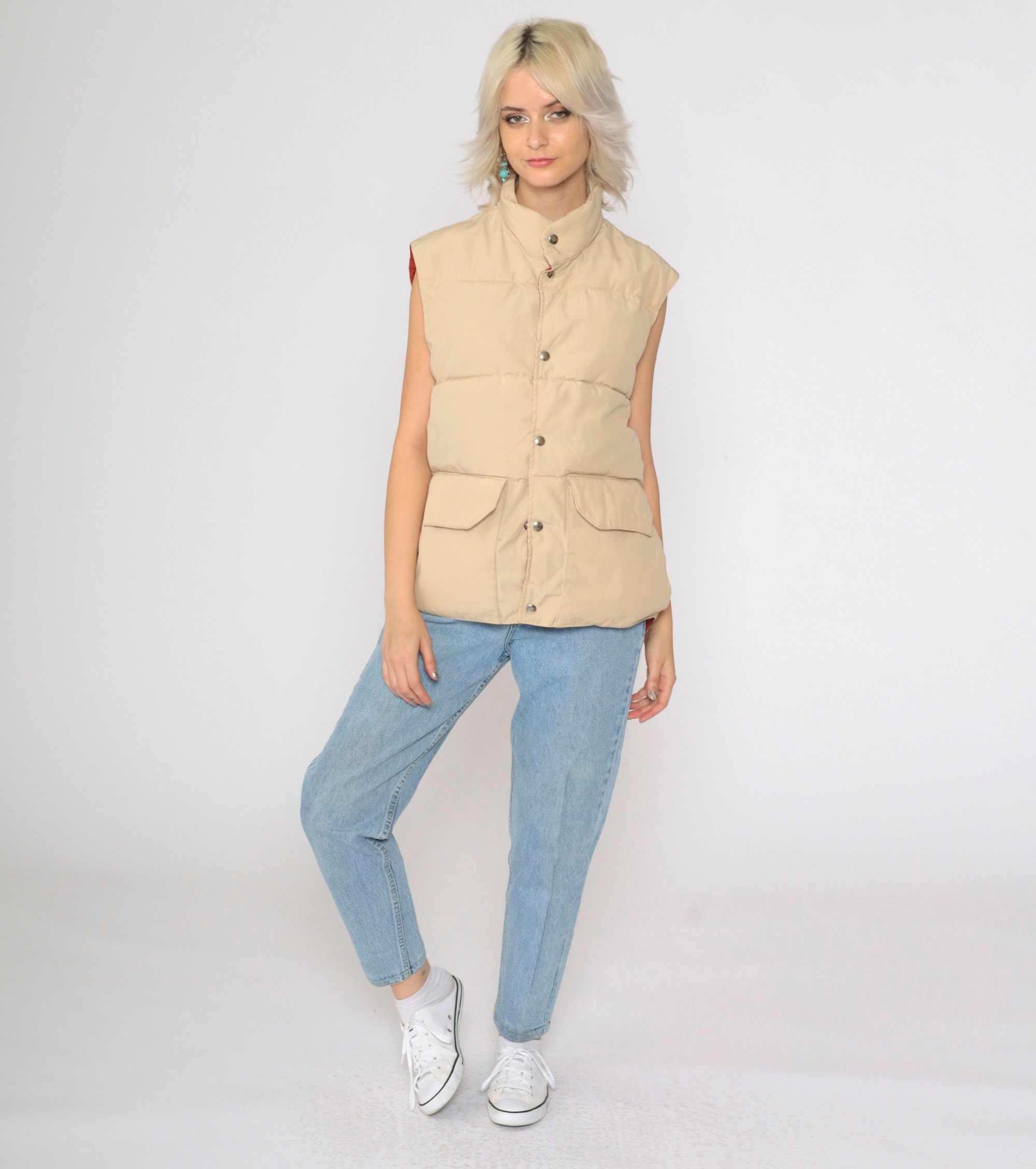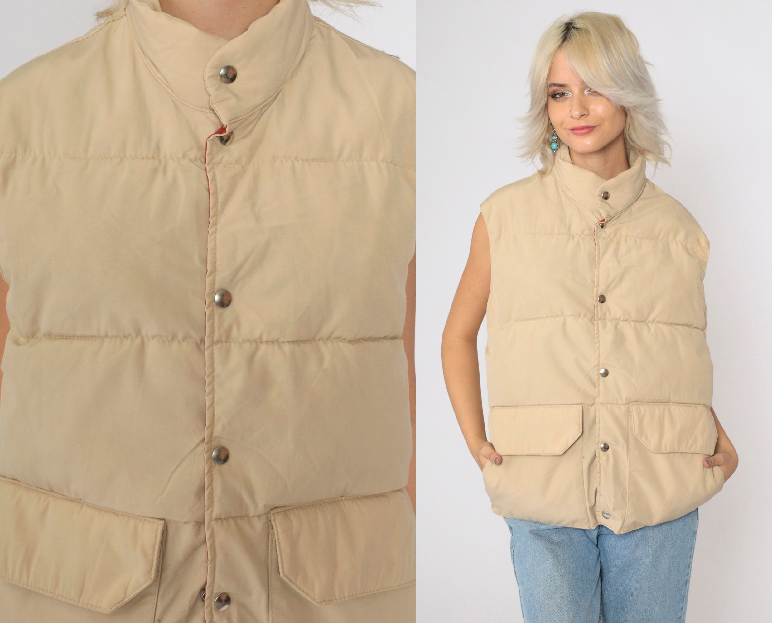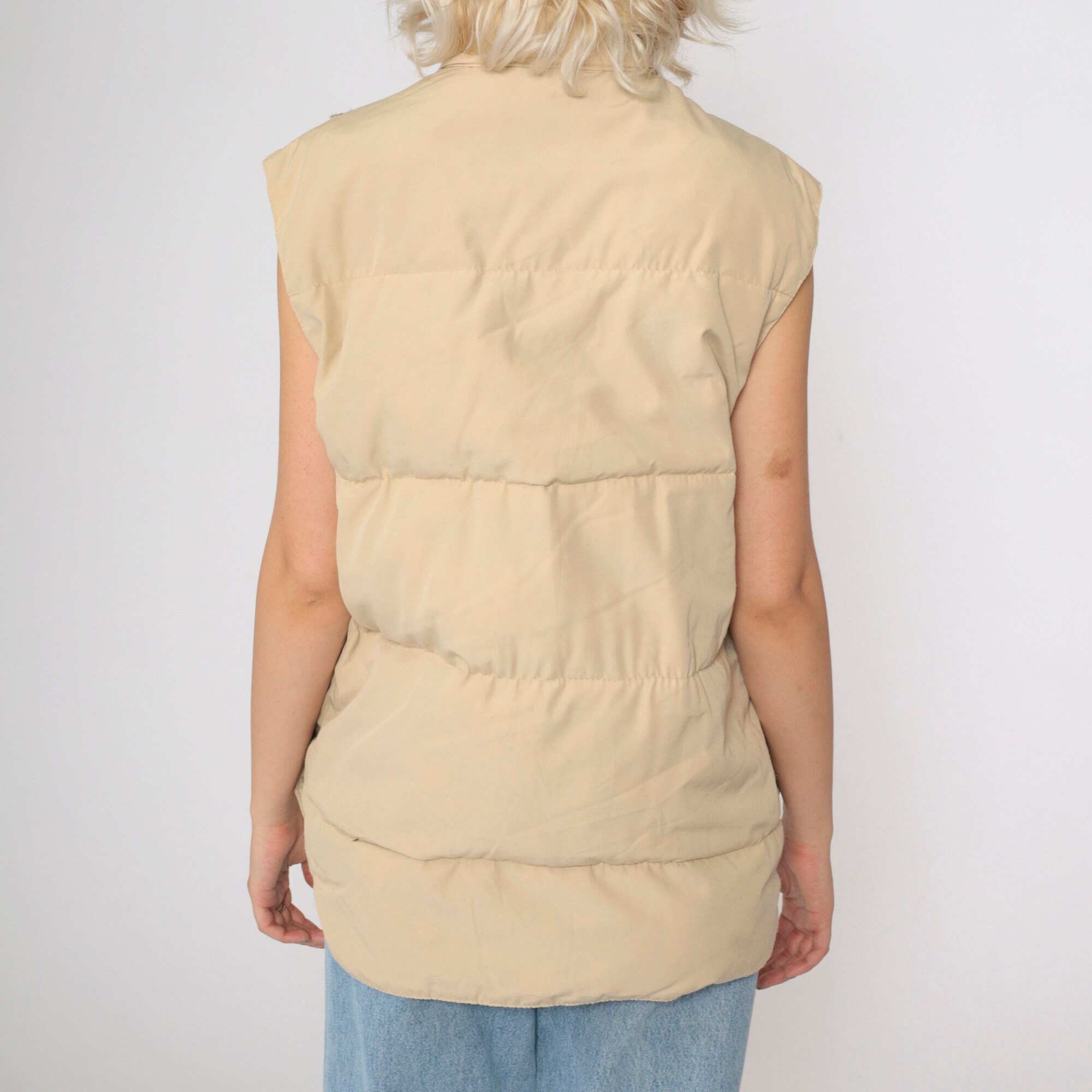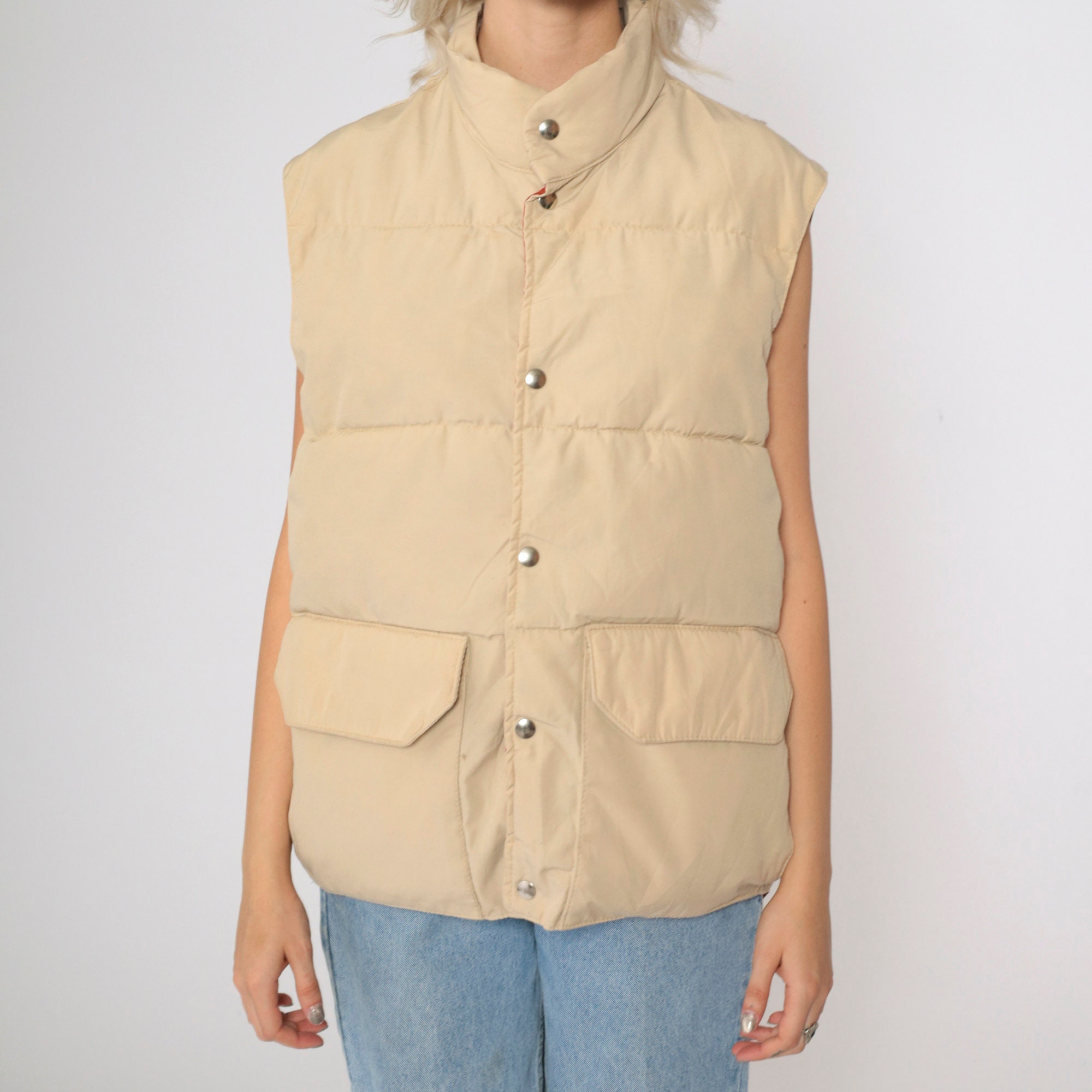 Vintage 80s puffer vest in tan with a down fill and snaps up the front.