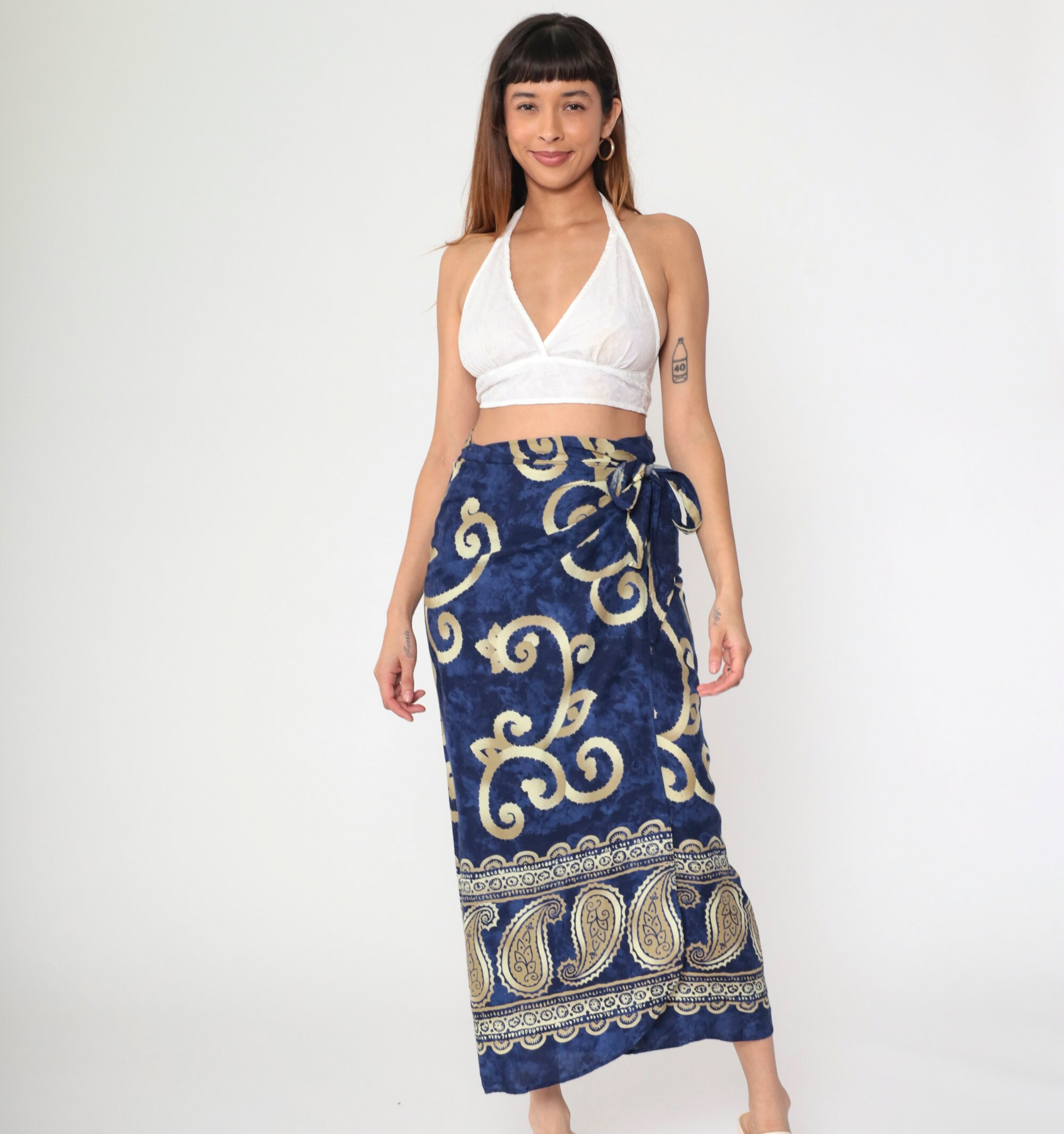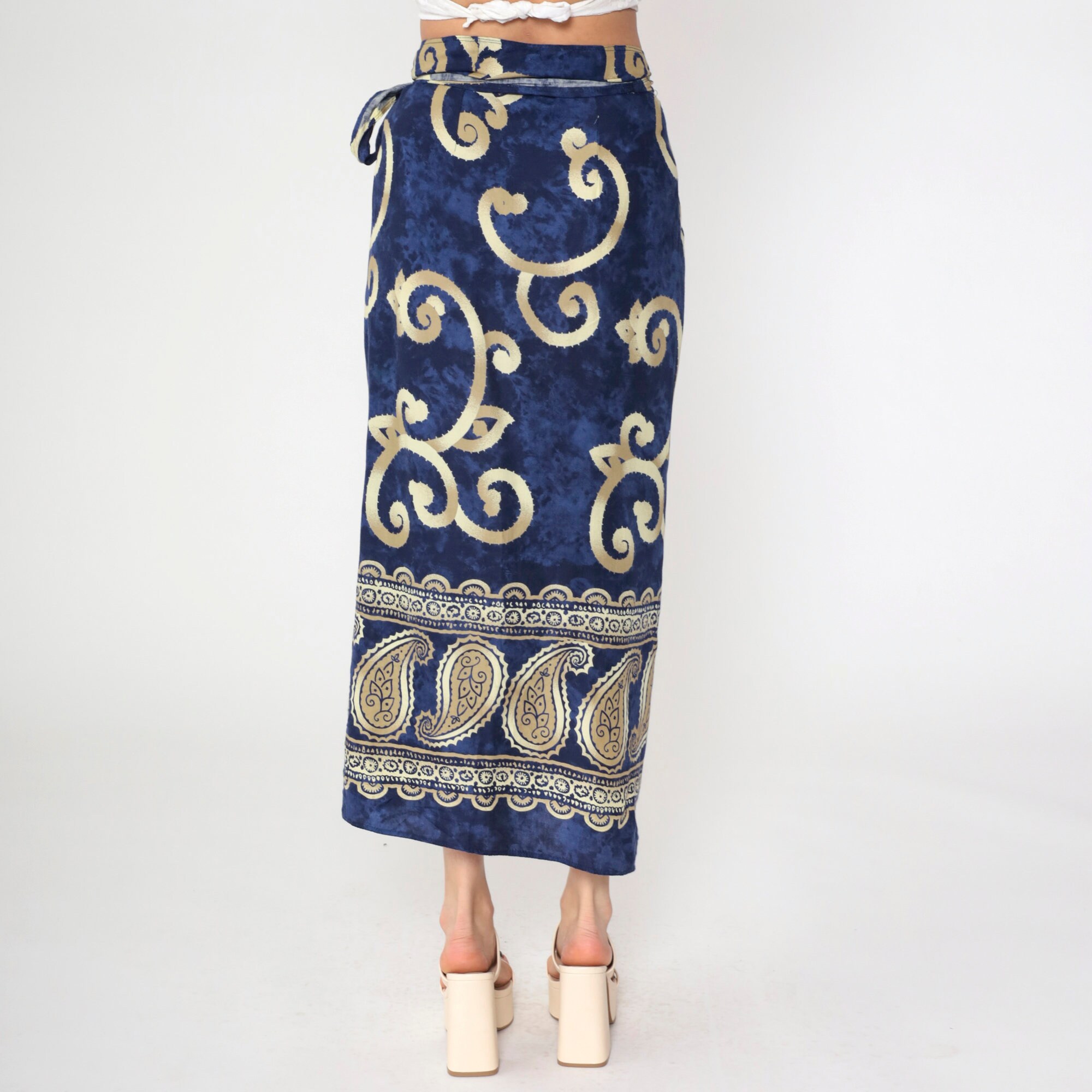 00s sarong wrap skirt in dark blue with a scroll and paisley print. Midi length.