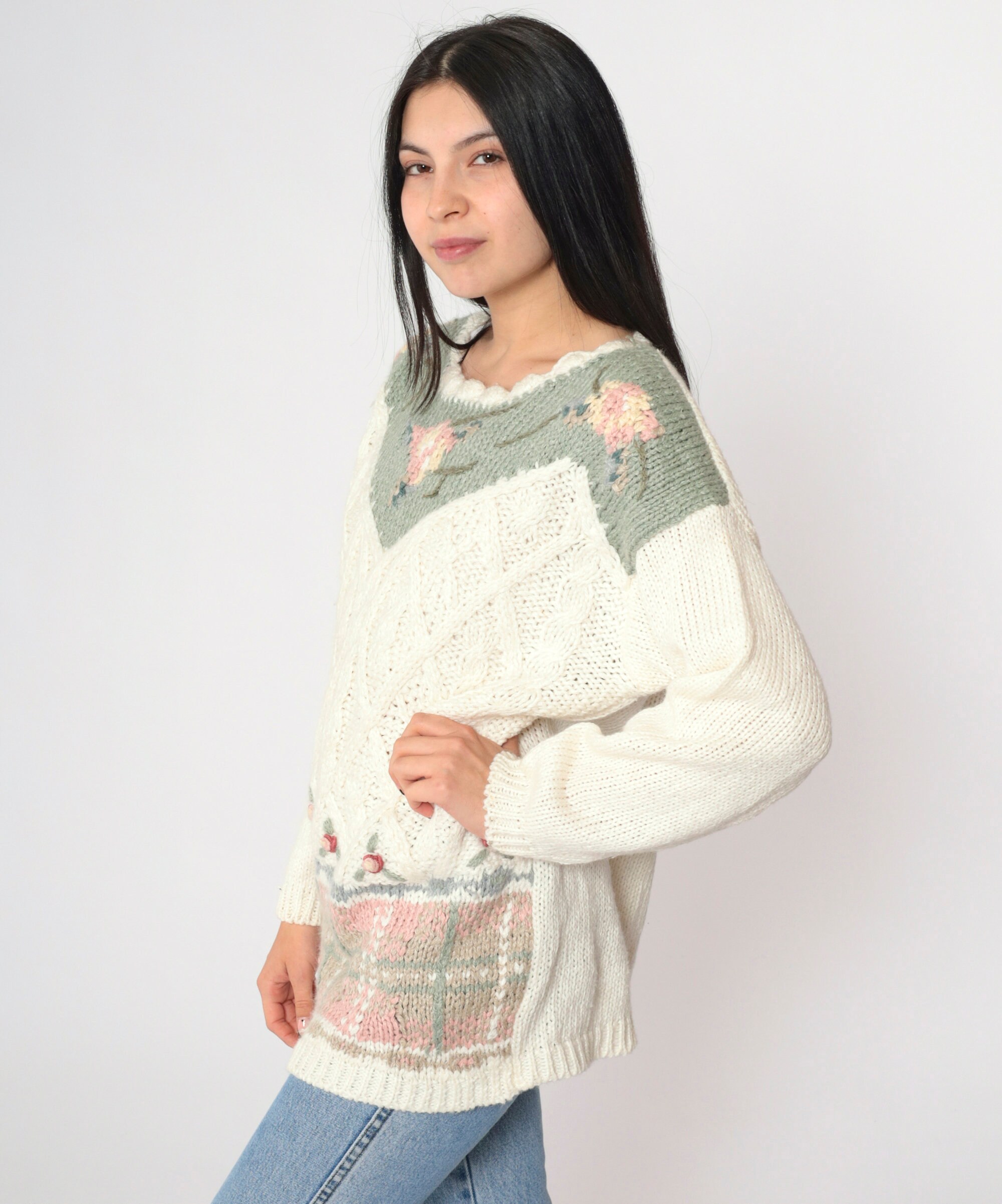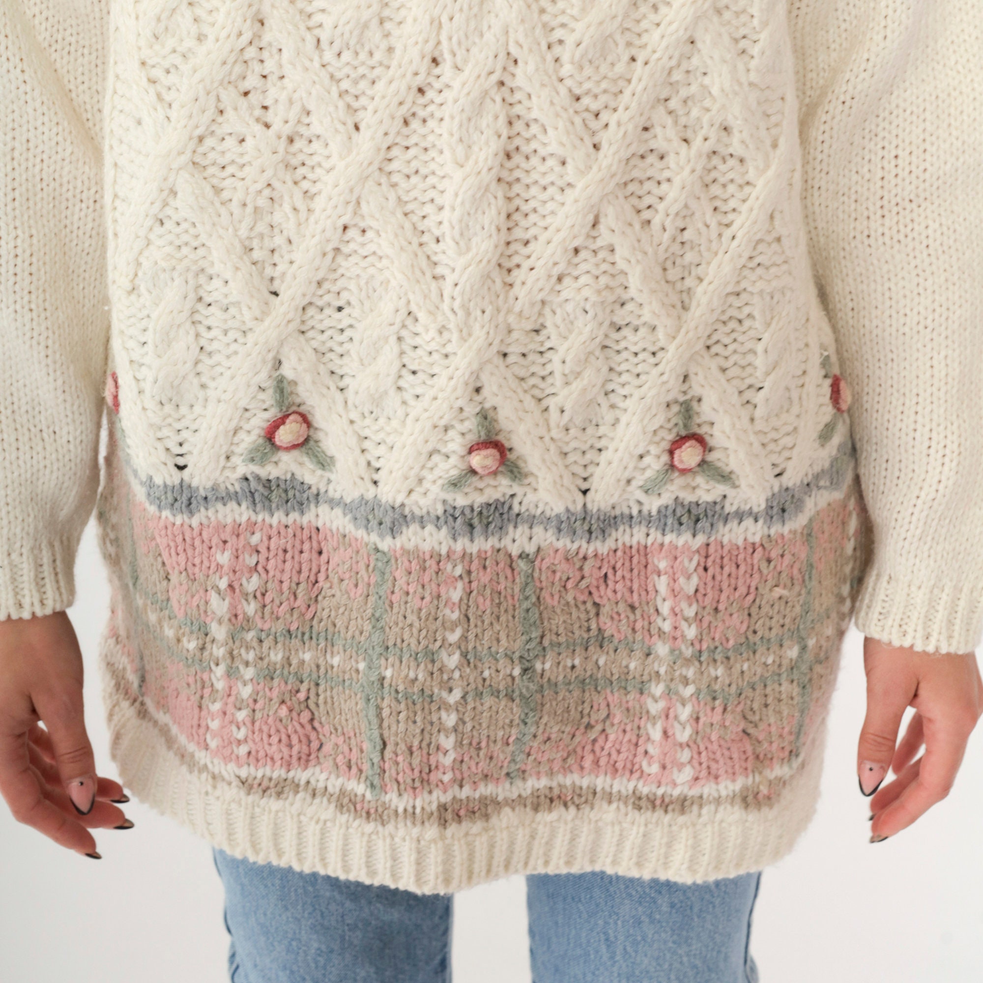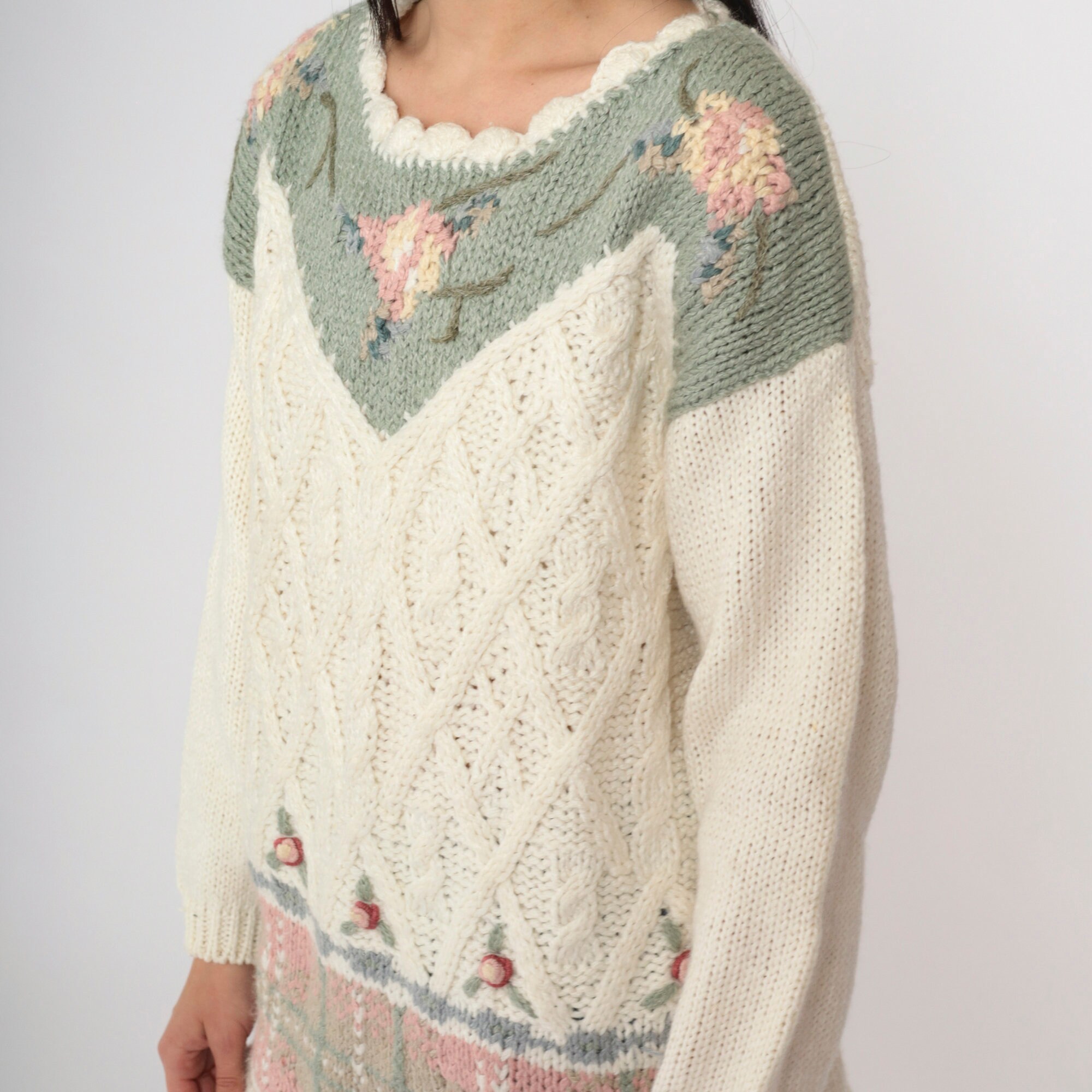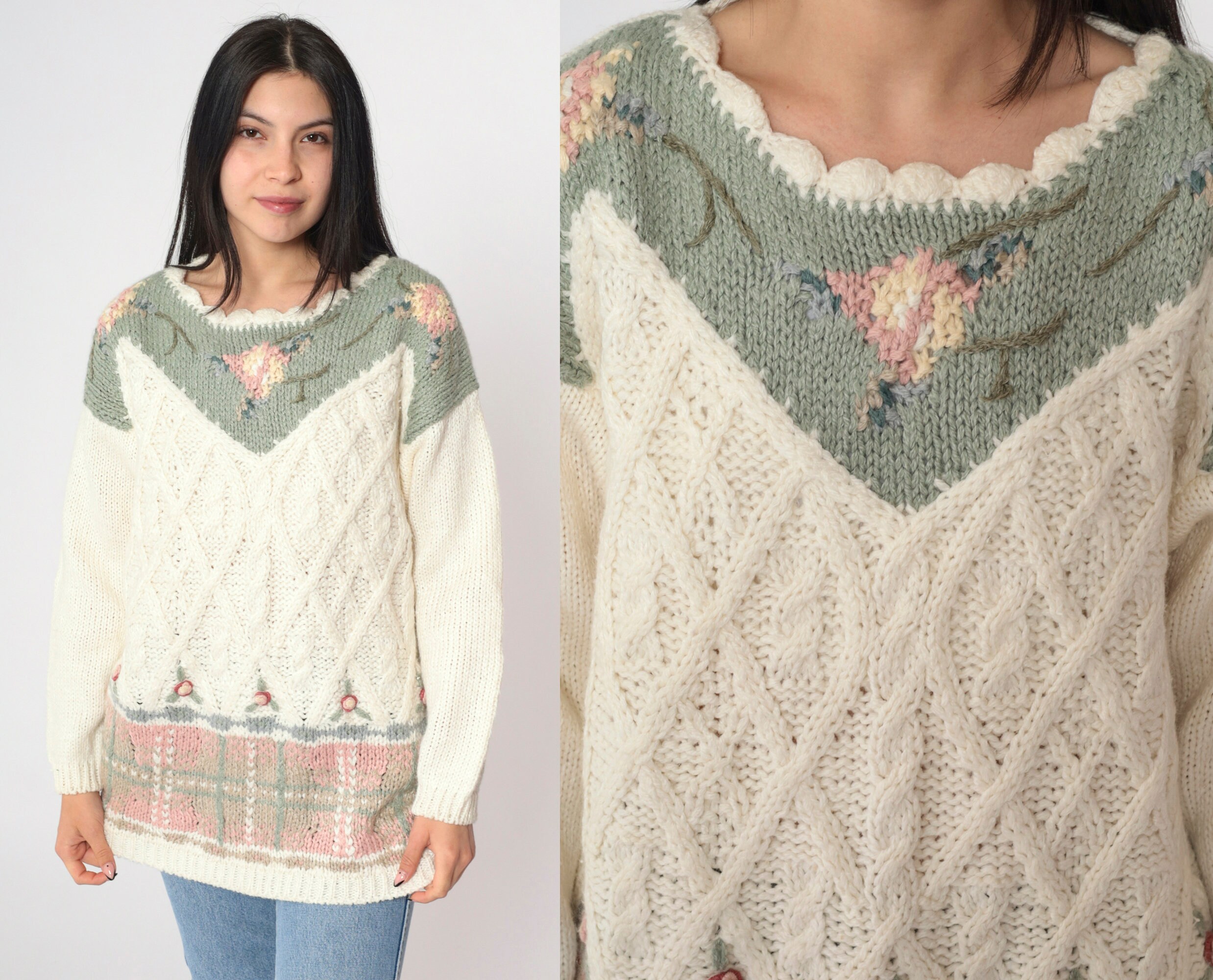 Vintage hand-knit sweater from the 90s featuring a delicate floral pattern in cream, green, and pink. This chunky knit pullover by Casual Corner has a textured design with cable knit details and long sleeves. Size Large.