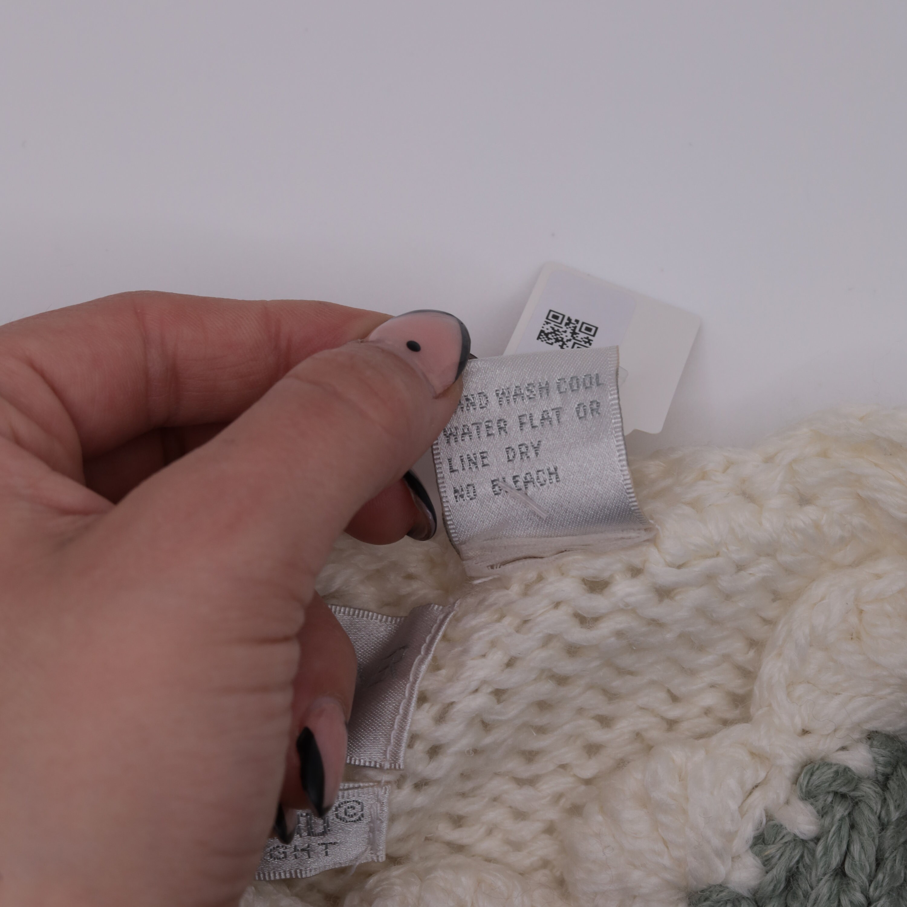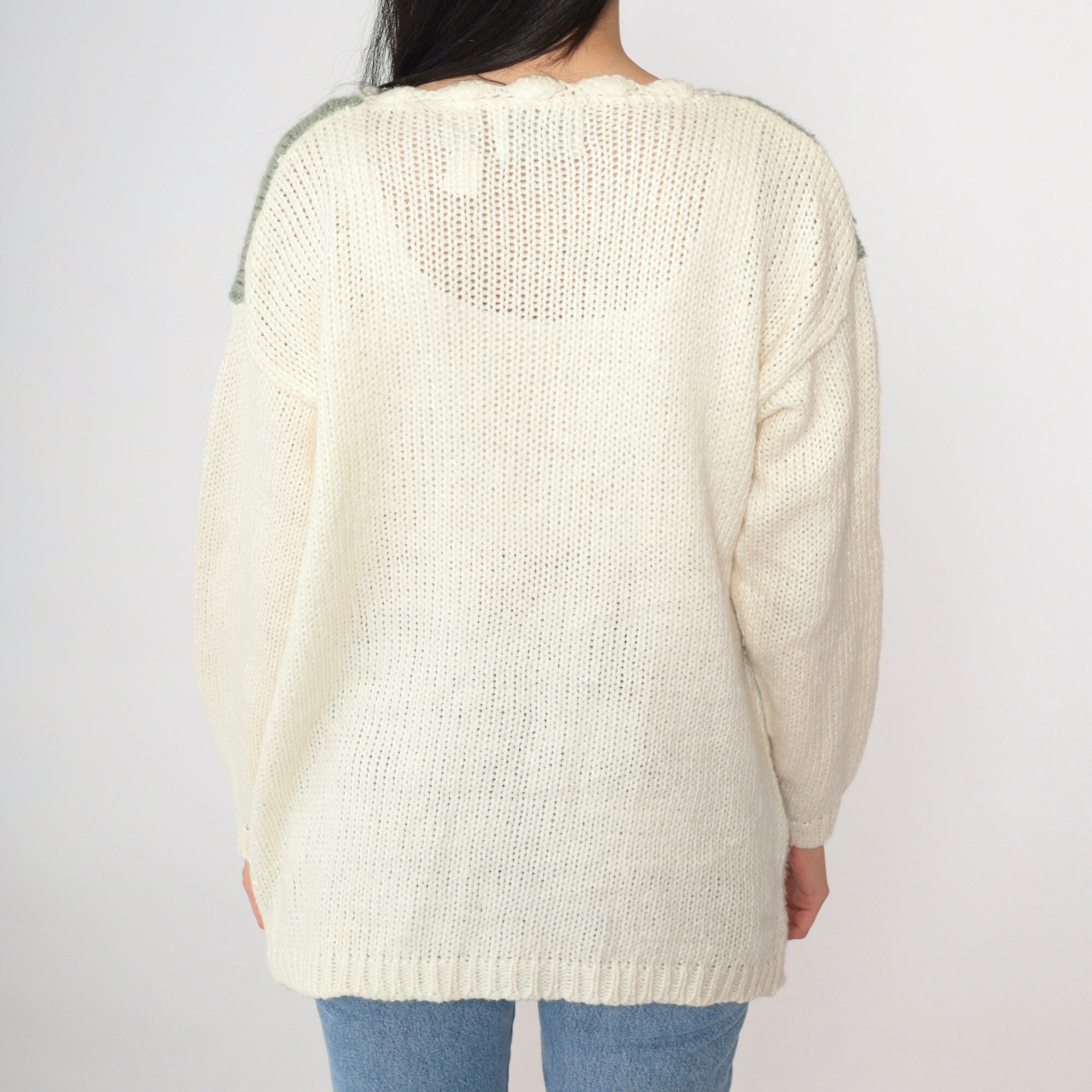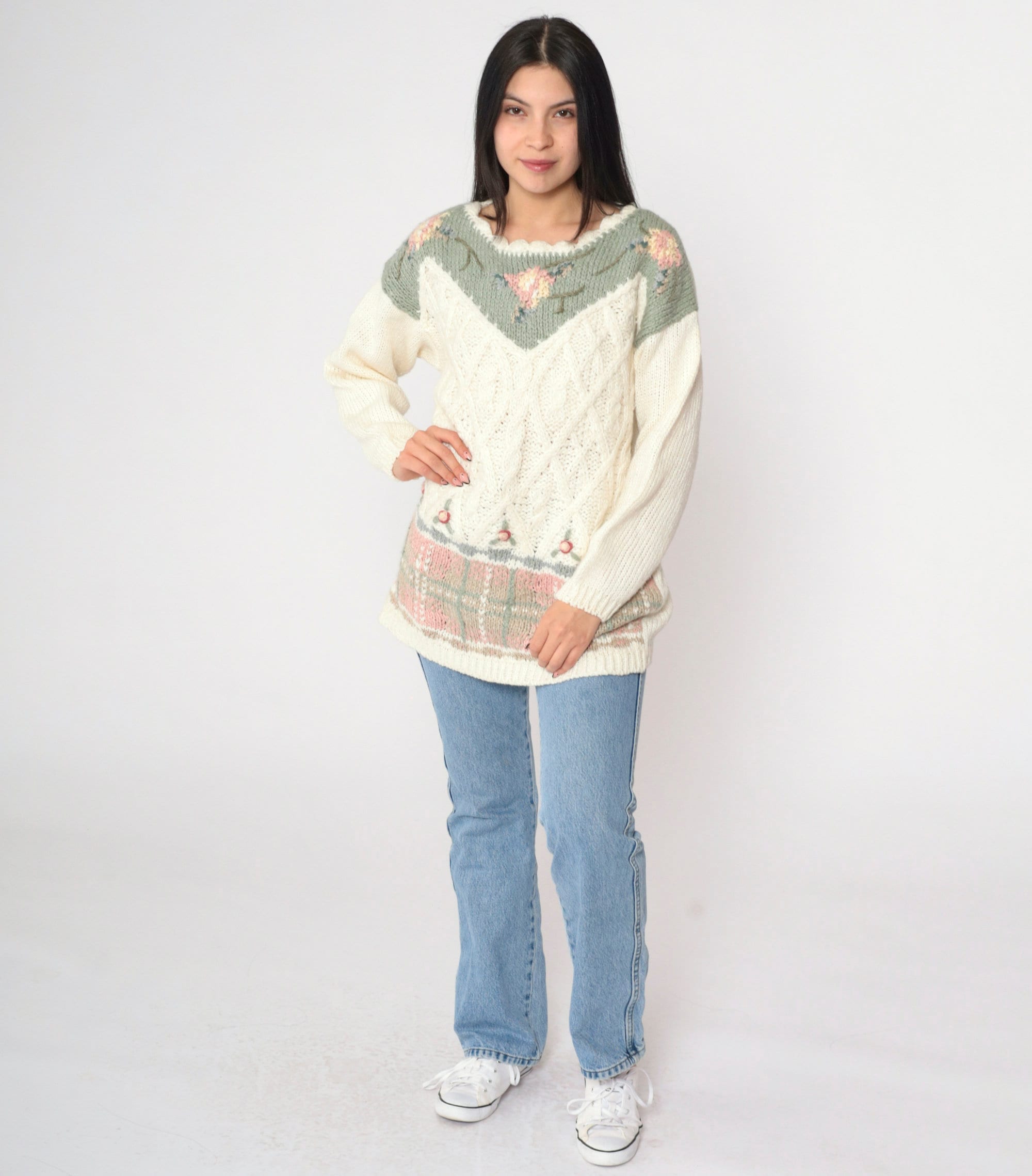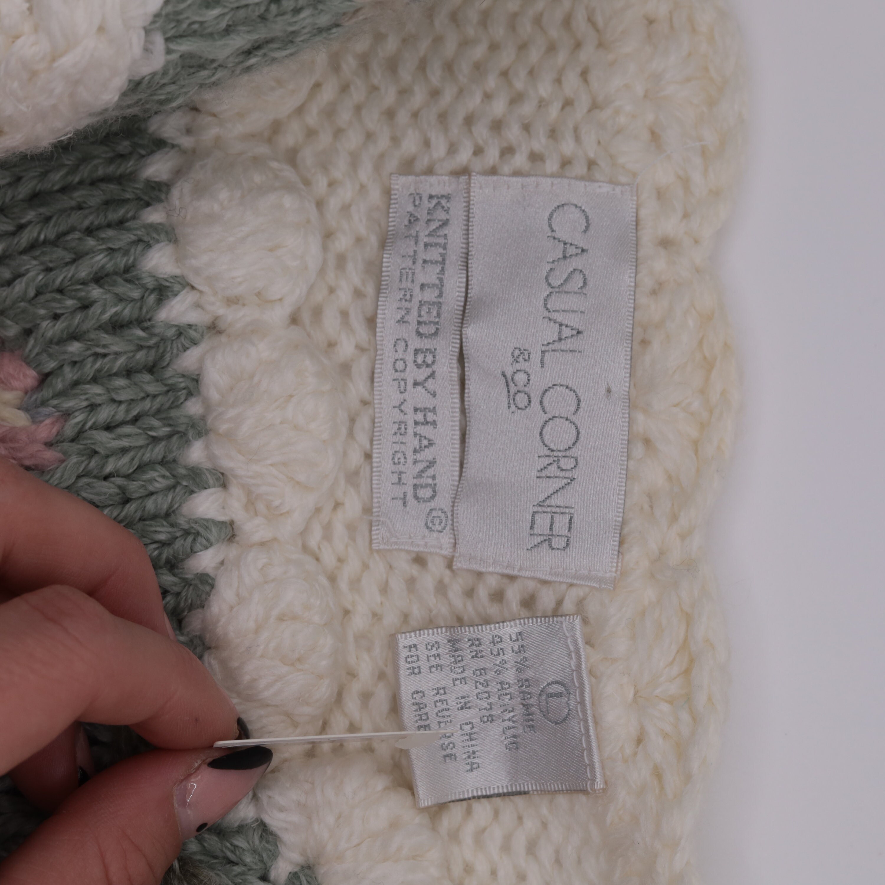 Vintage hand-knit sweater from the 90s featuring a delicate floral pattern in cream, green, and pink. This chunky knit pullover by Casual Corner has a textured design with cable knit details and long sleeves. Size Large.