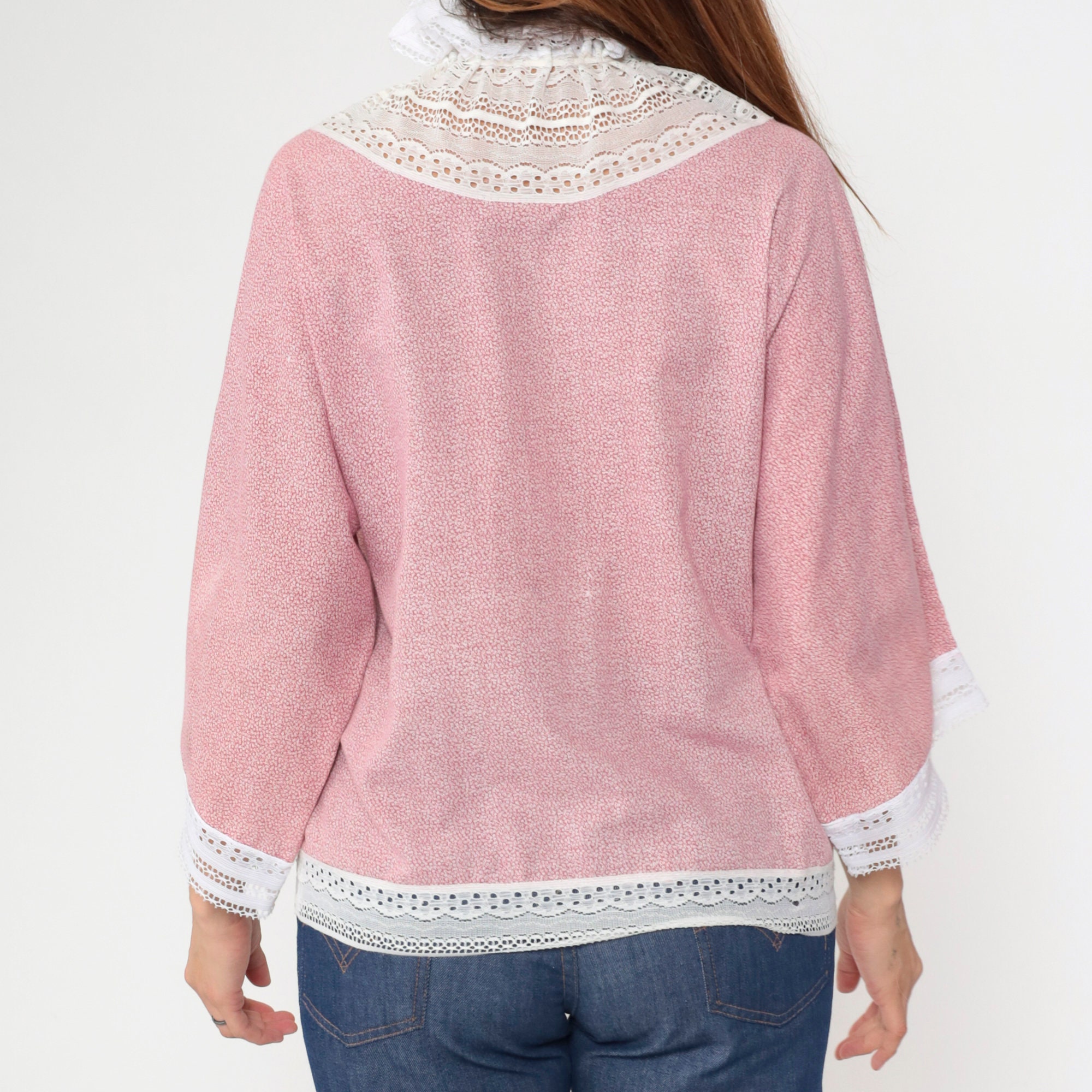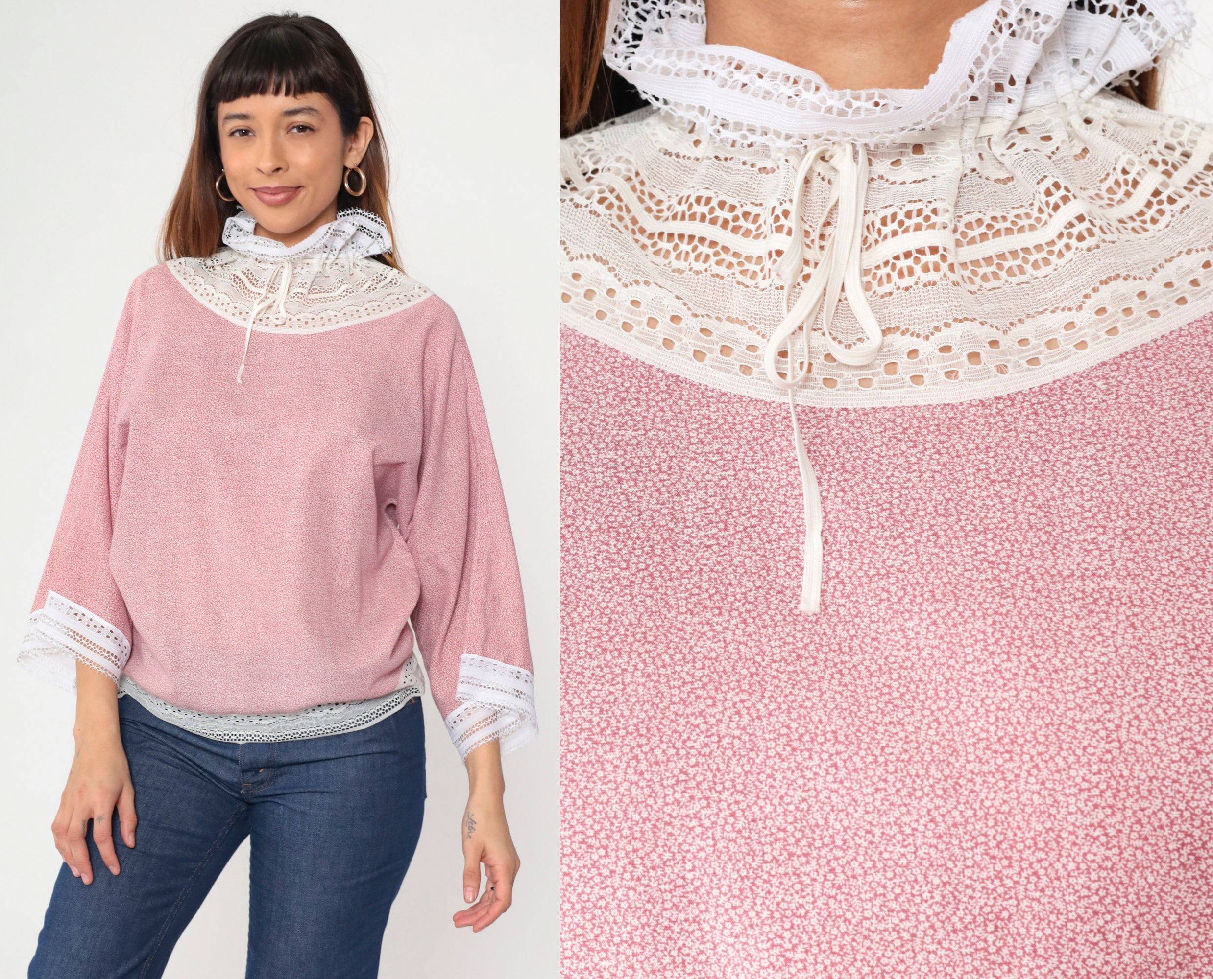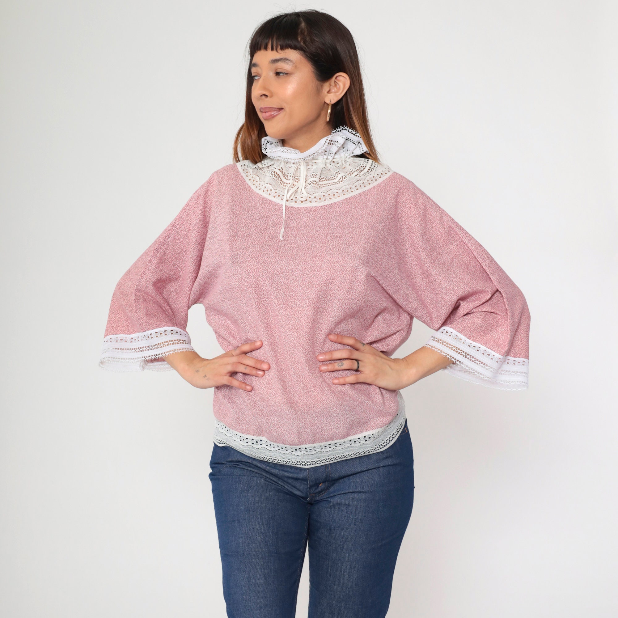 Vintage 70s blouse in a pink calico print with white lace trim. It has a drawstring ribbon neckline with a ruffle collar, and long wide sleeves.