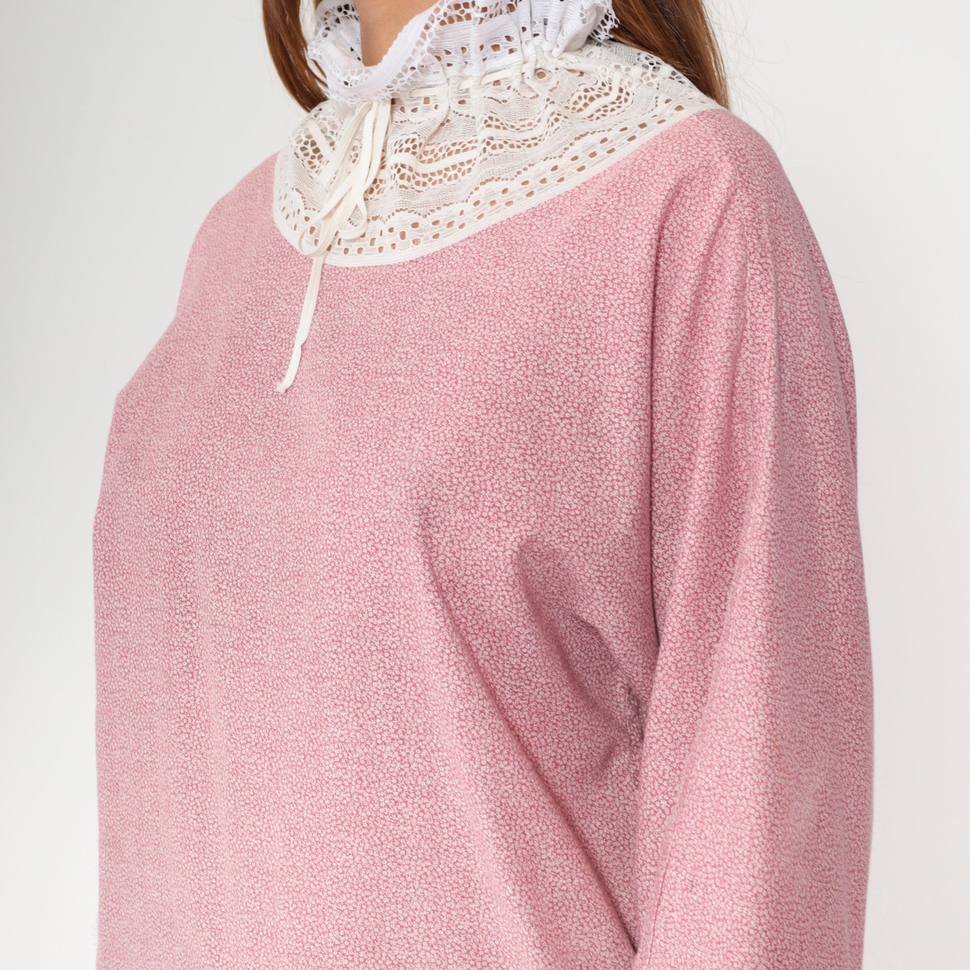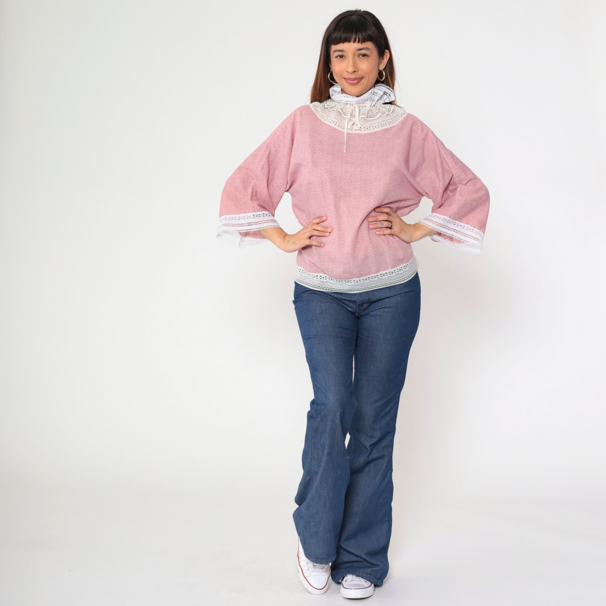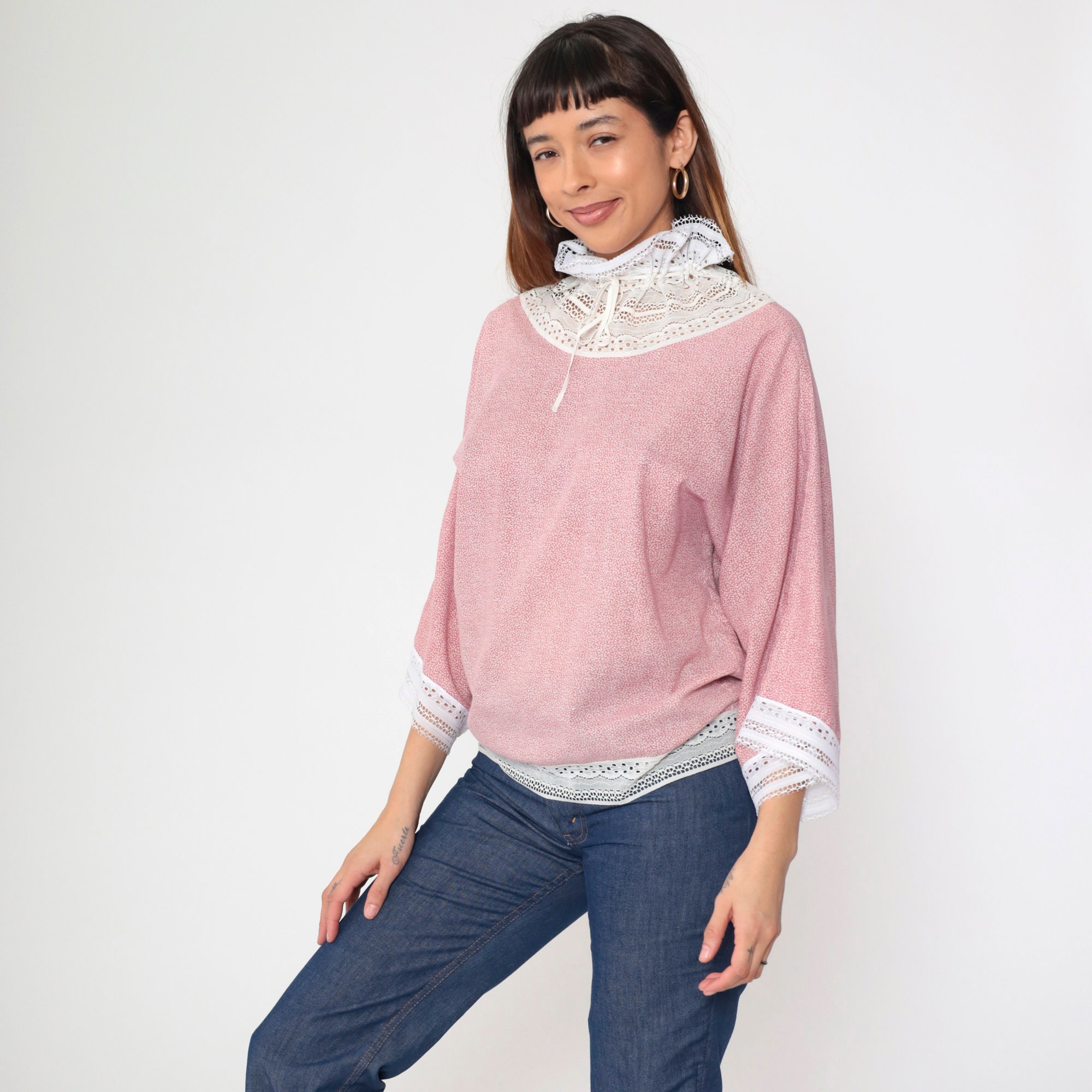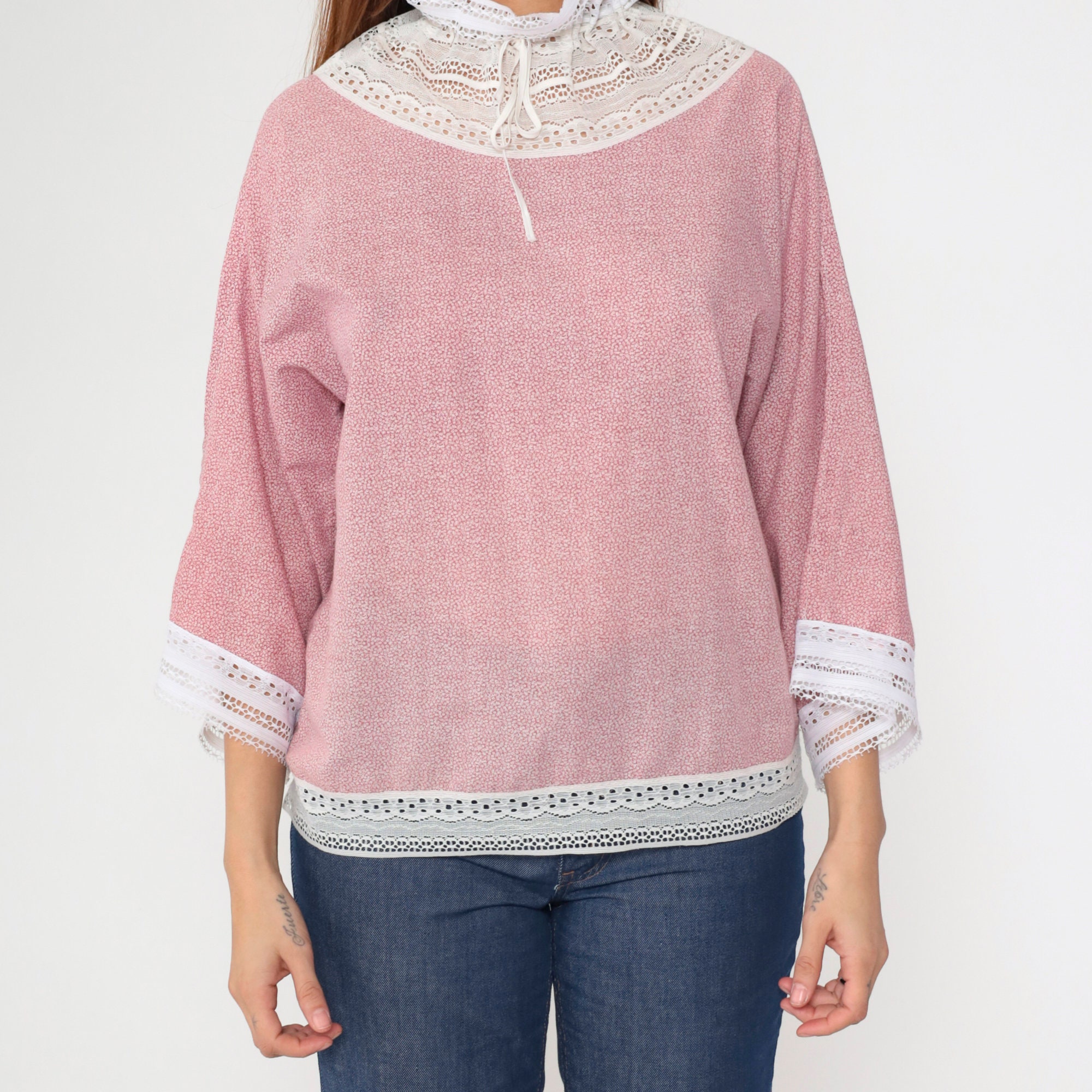 Vintage 70s blouse in a pink calico print with white lace trim. It has a drawstring ribbon neckline with a ruffle collar, and long wide sleeves.