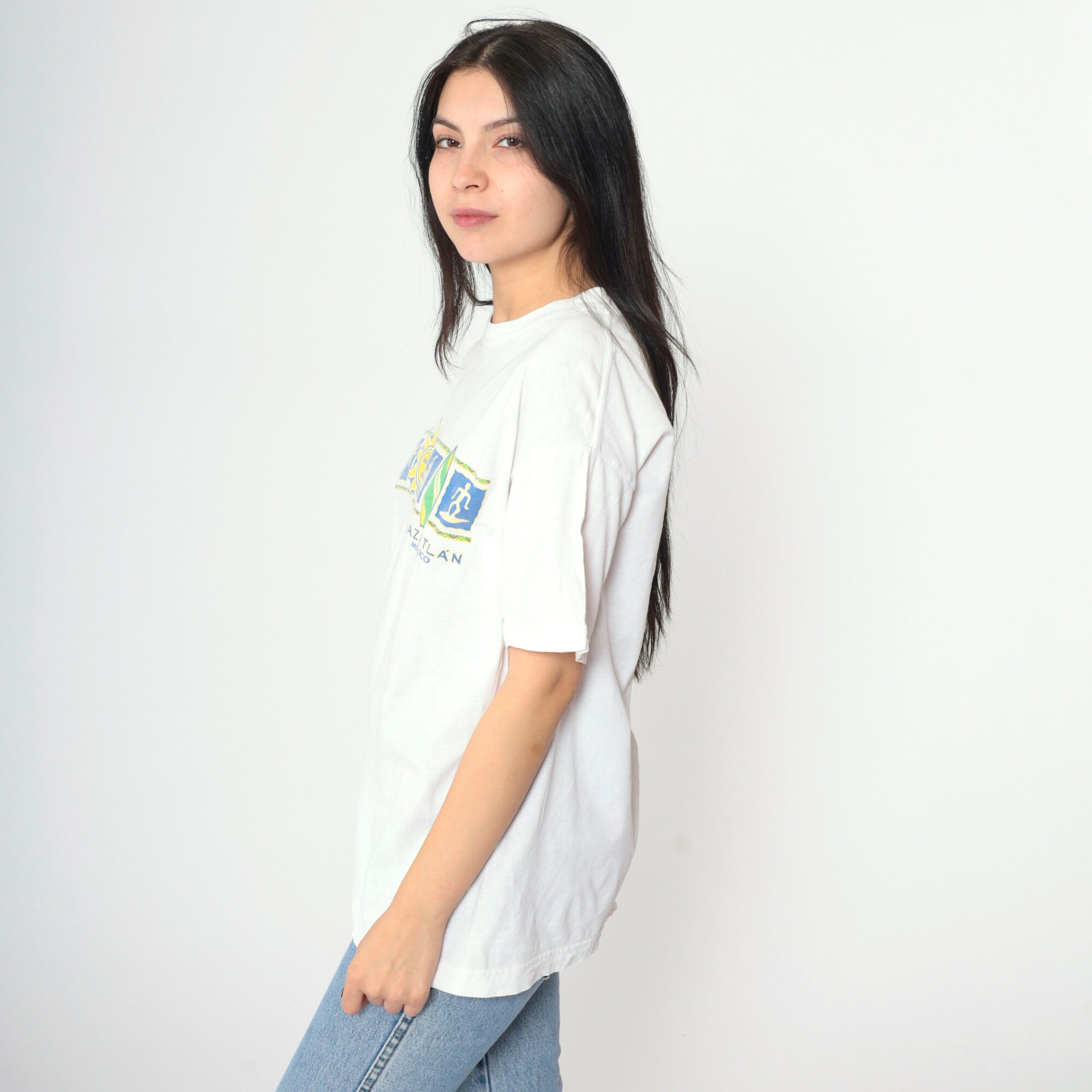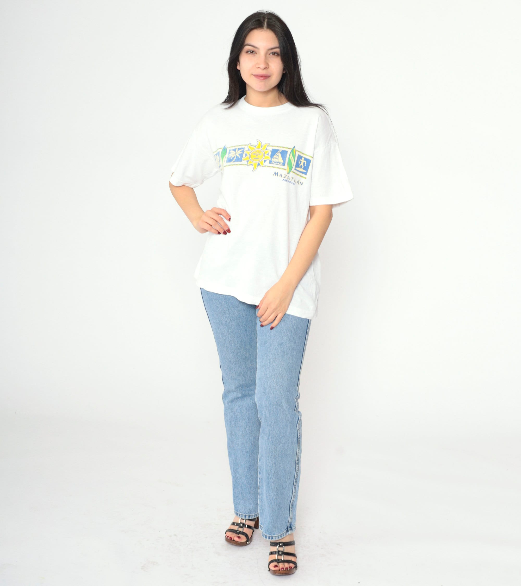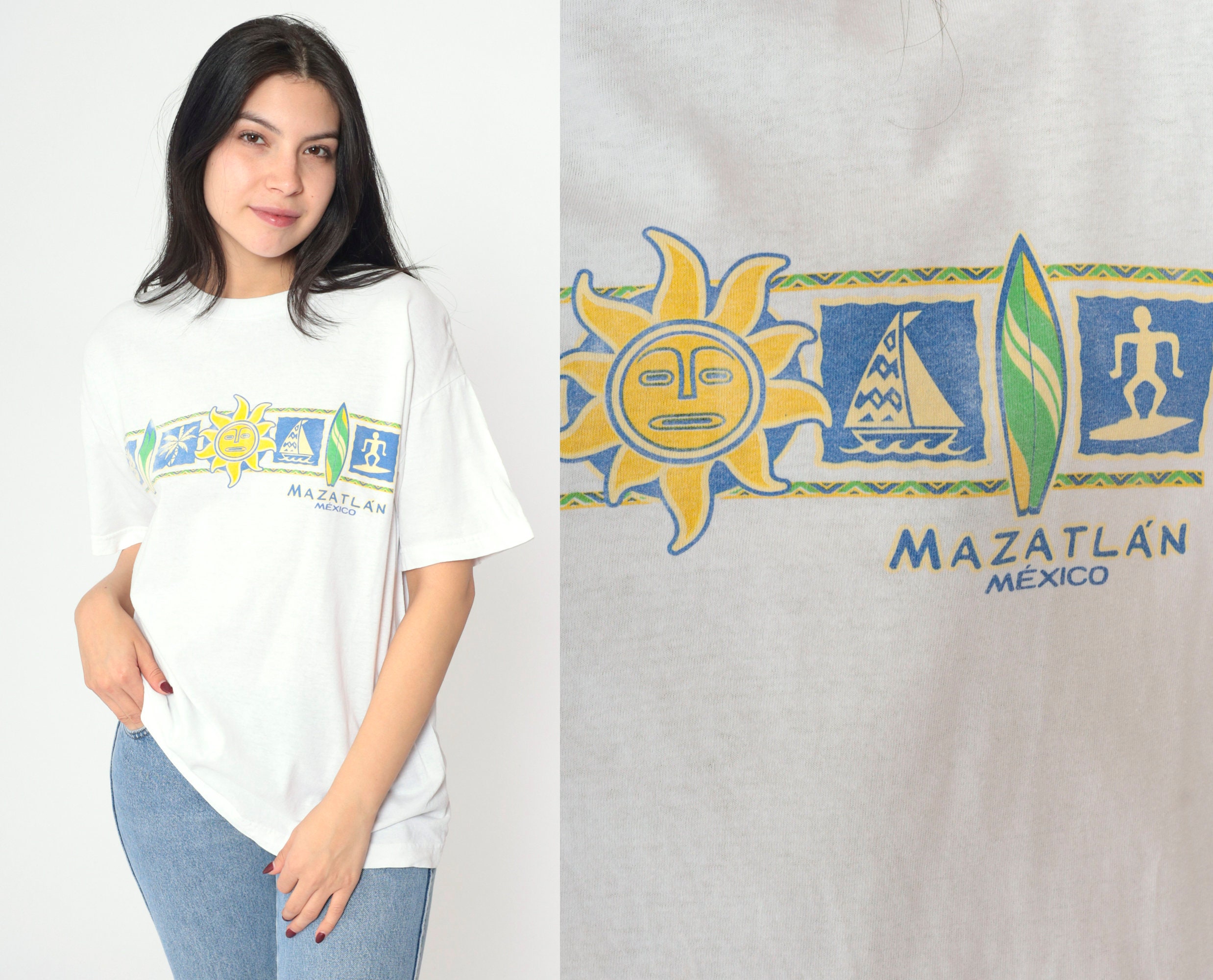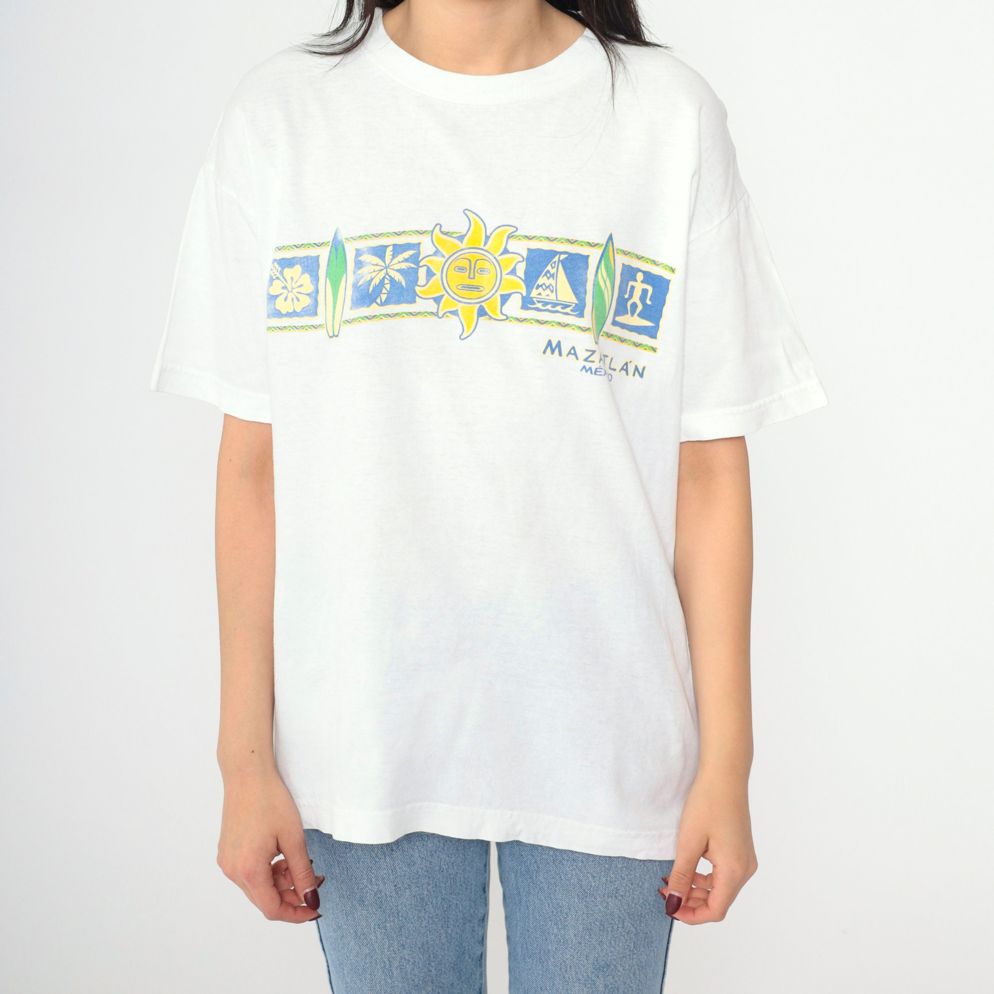 Vintage 00s t shirt with a Mazatlan Mexico print with a sun and surf print.