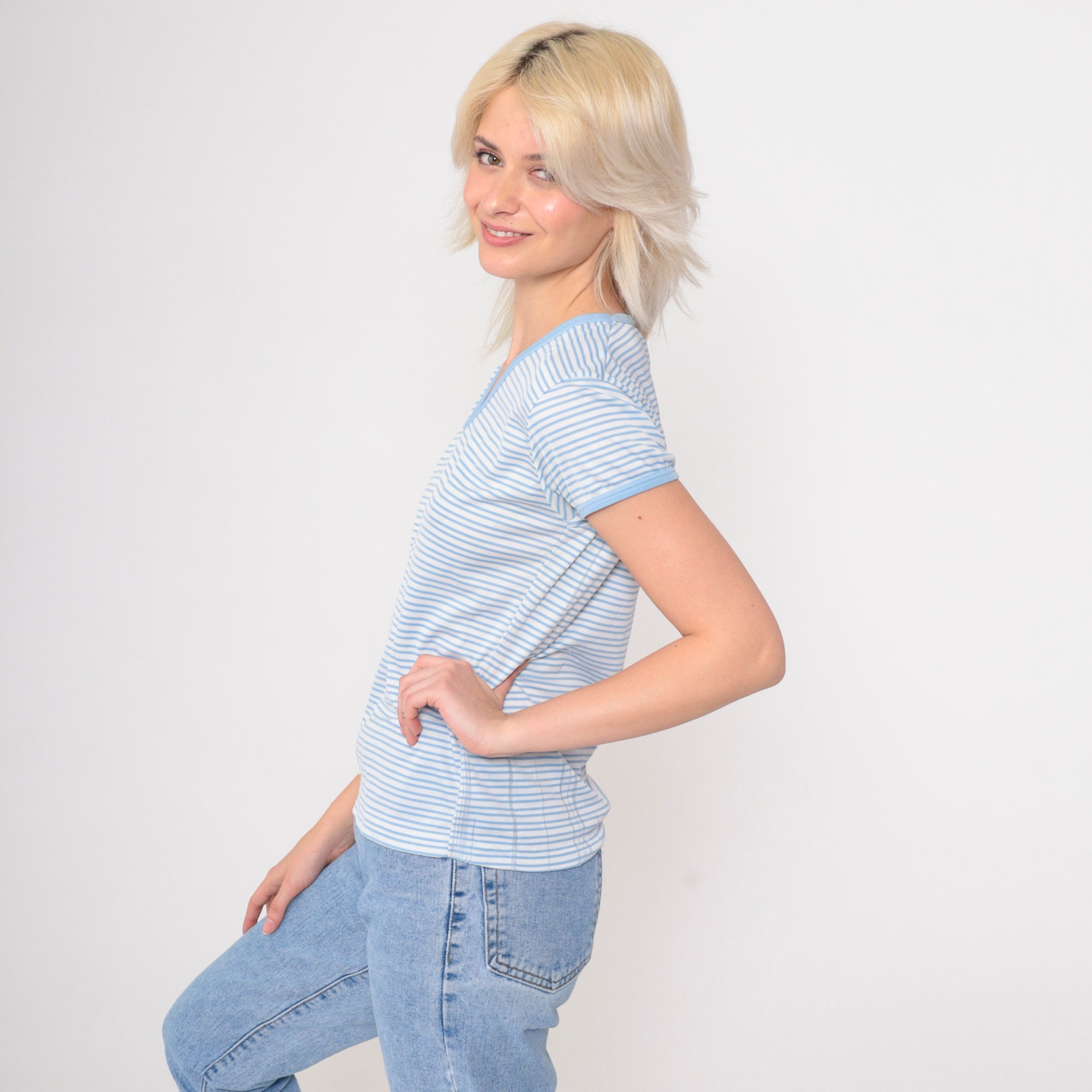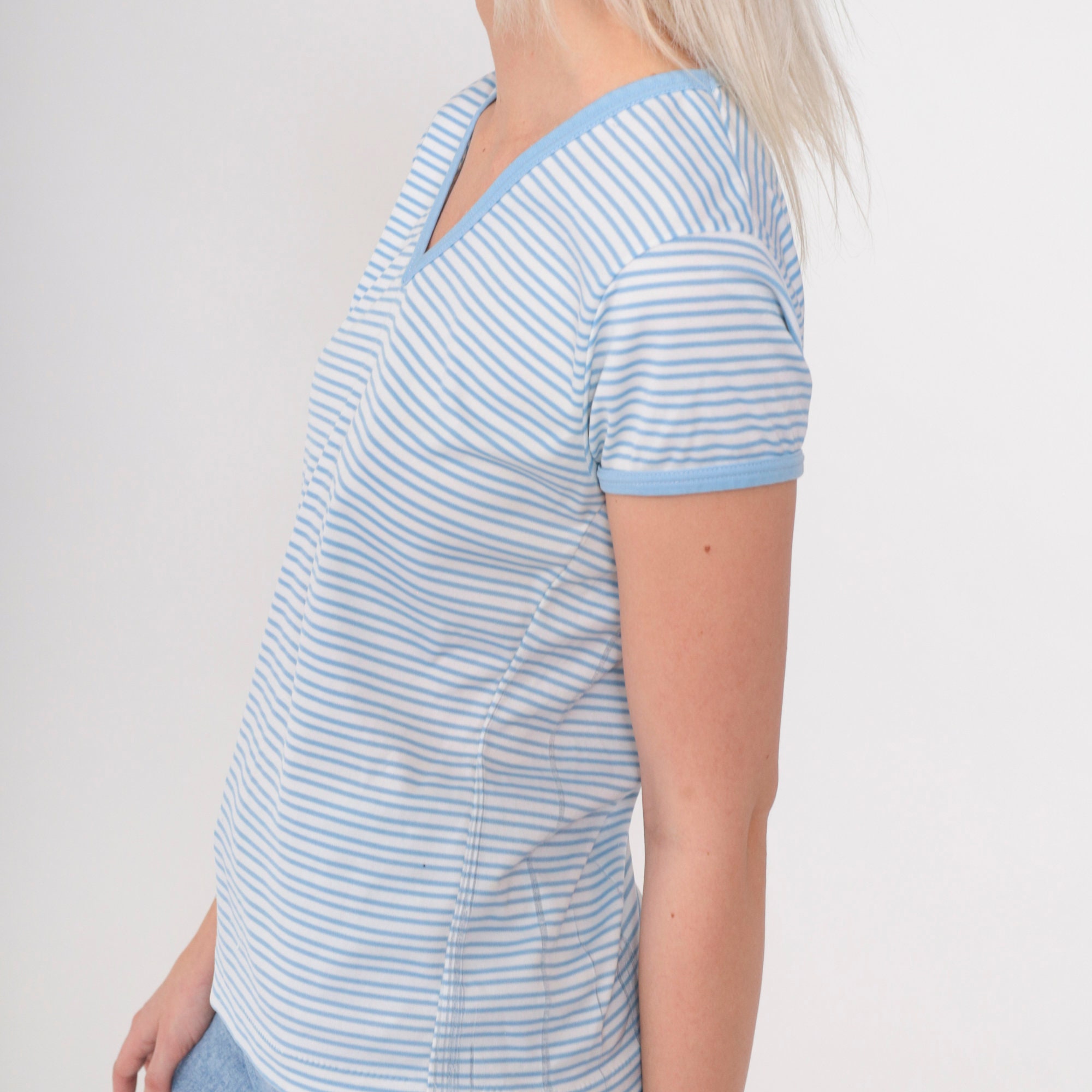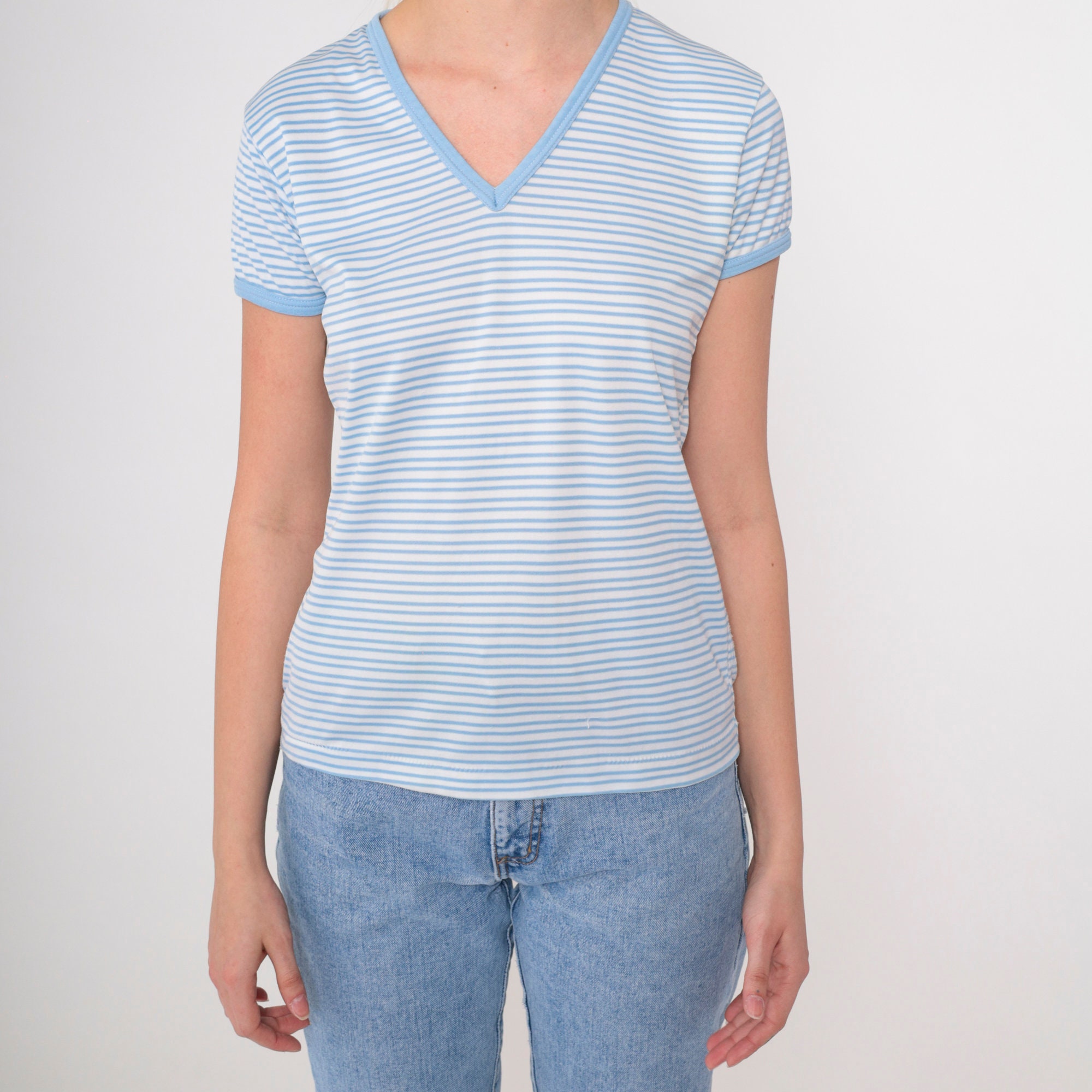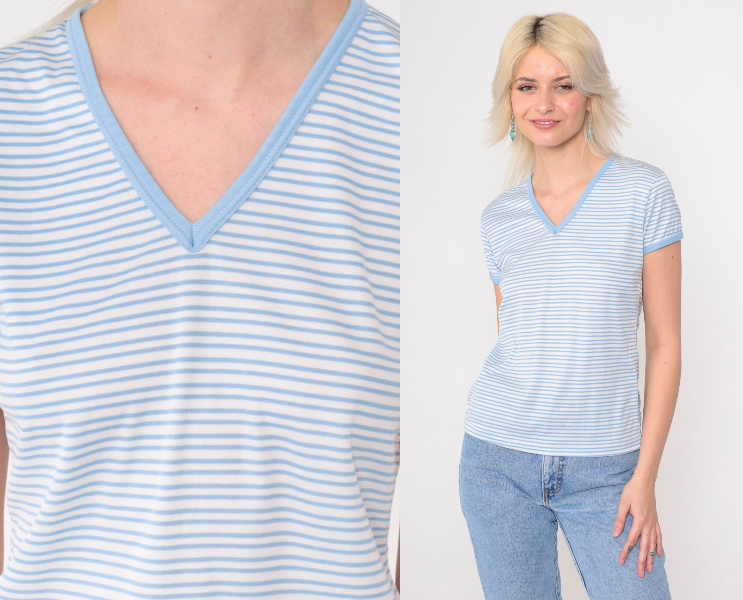 Vintage 80s shirt in white and blue stripes with short sleeves and a v neck.