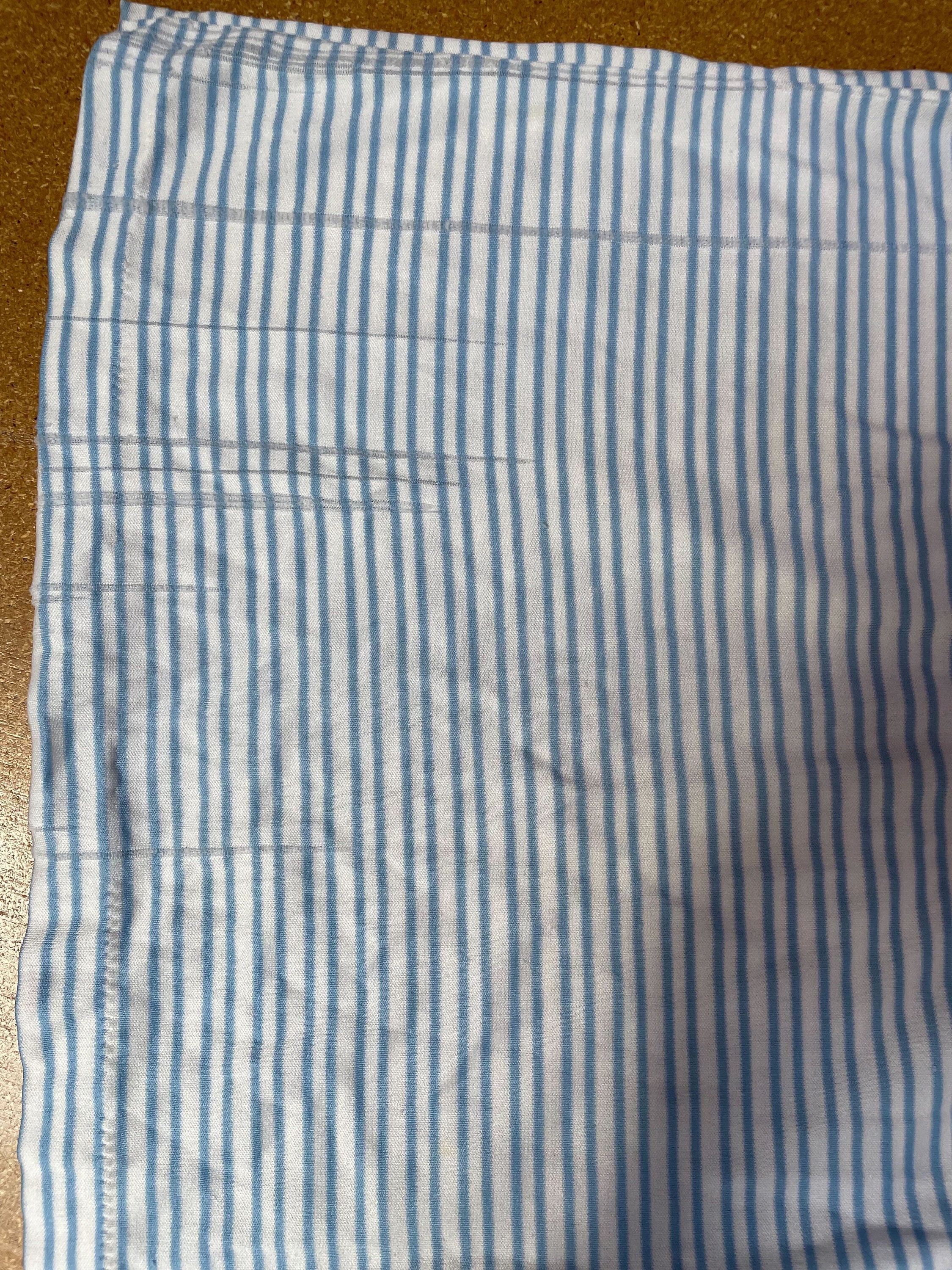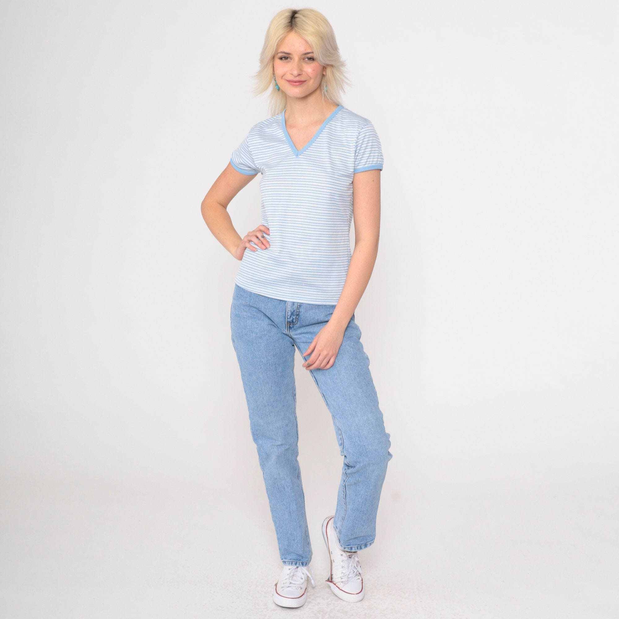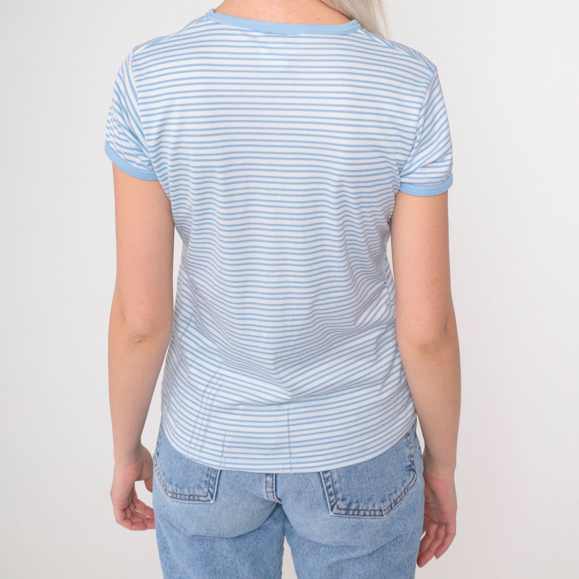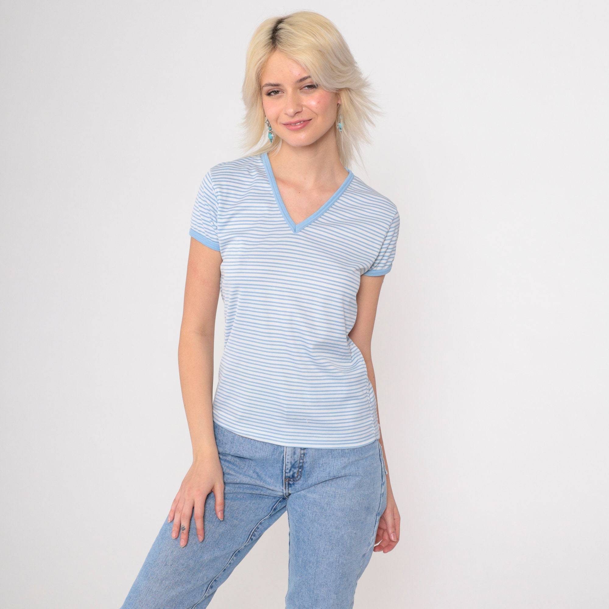 Vintage 80s shirt in white and blue stripes with short sleeves and a v neck.