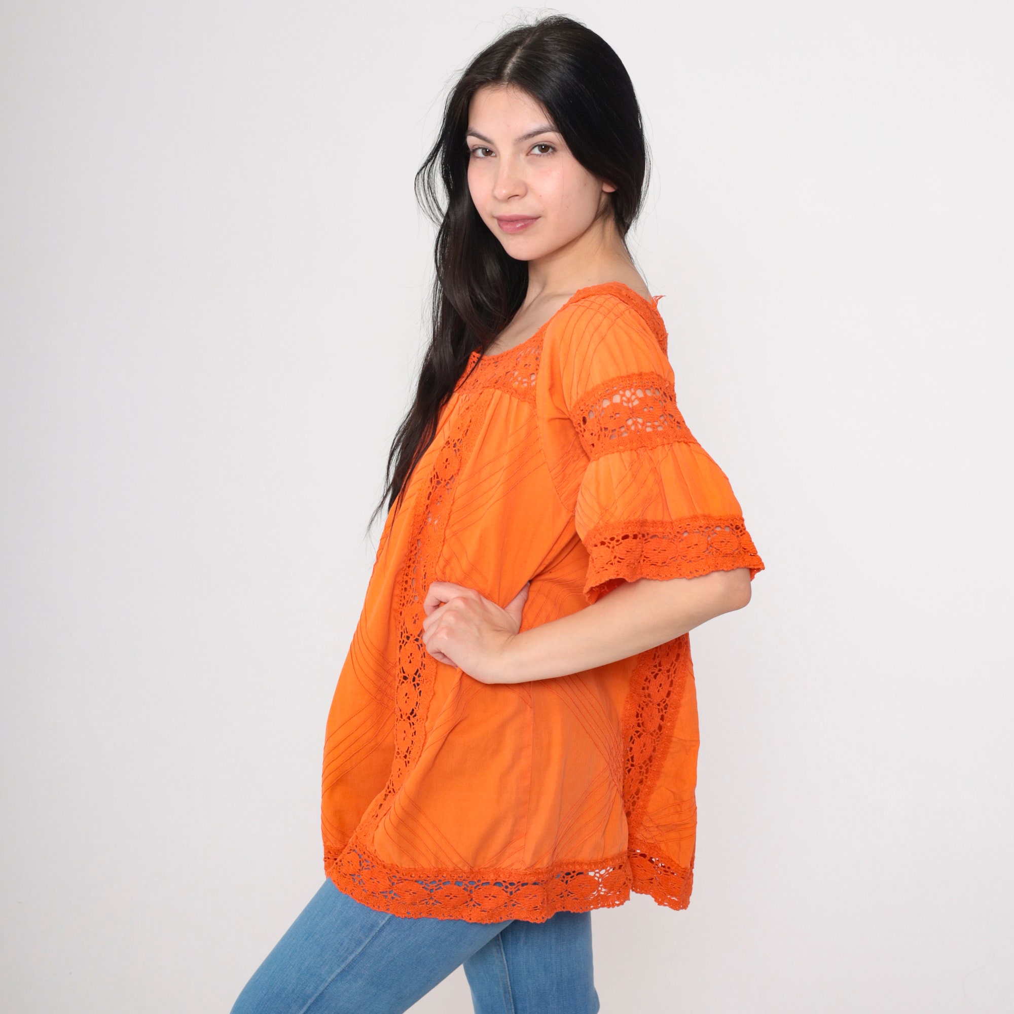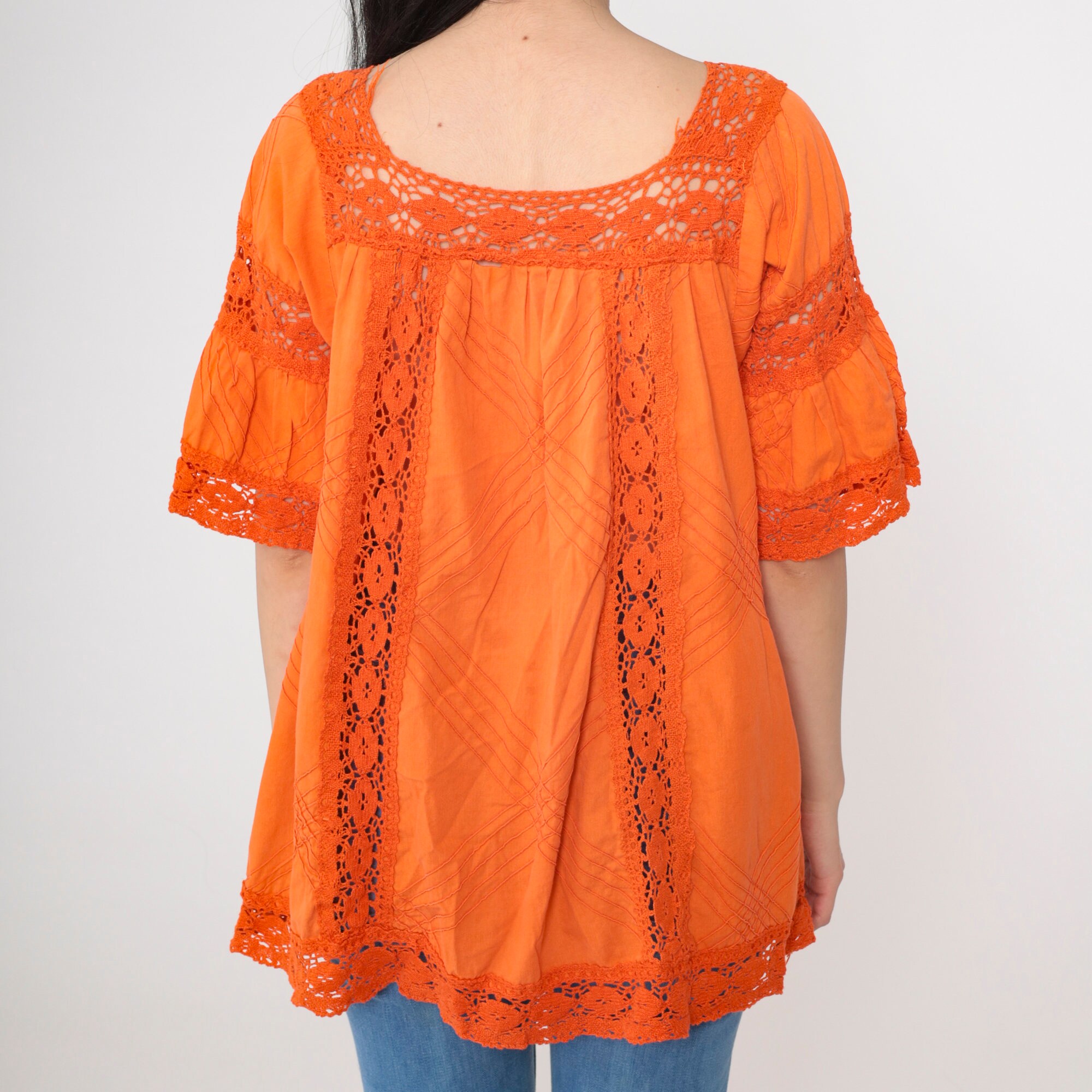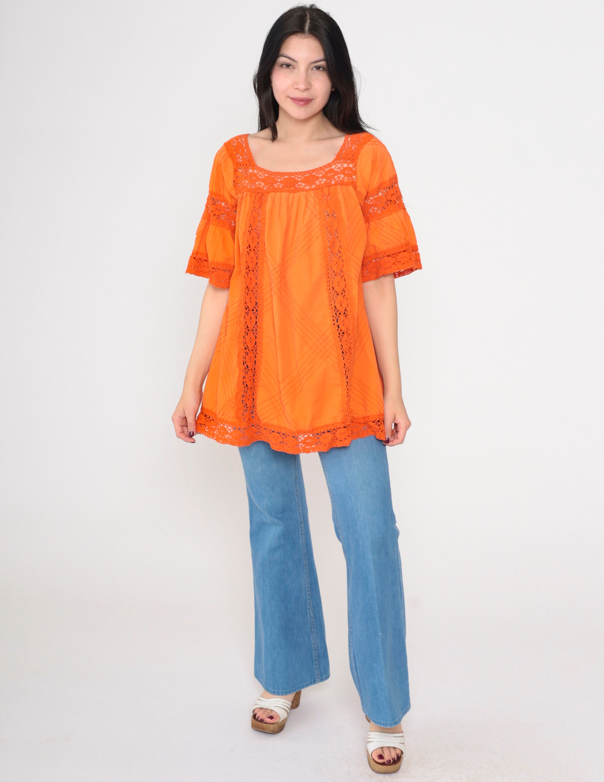 Vintage blouse in orange with sheer crochet lace trim and bell sleeves. Tent cut.