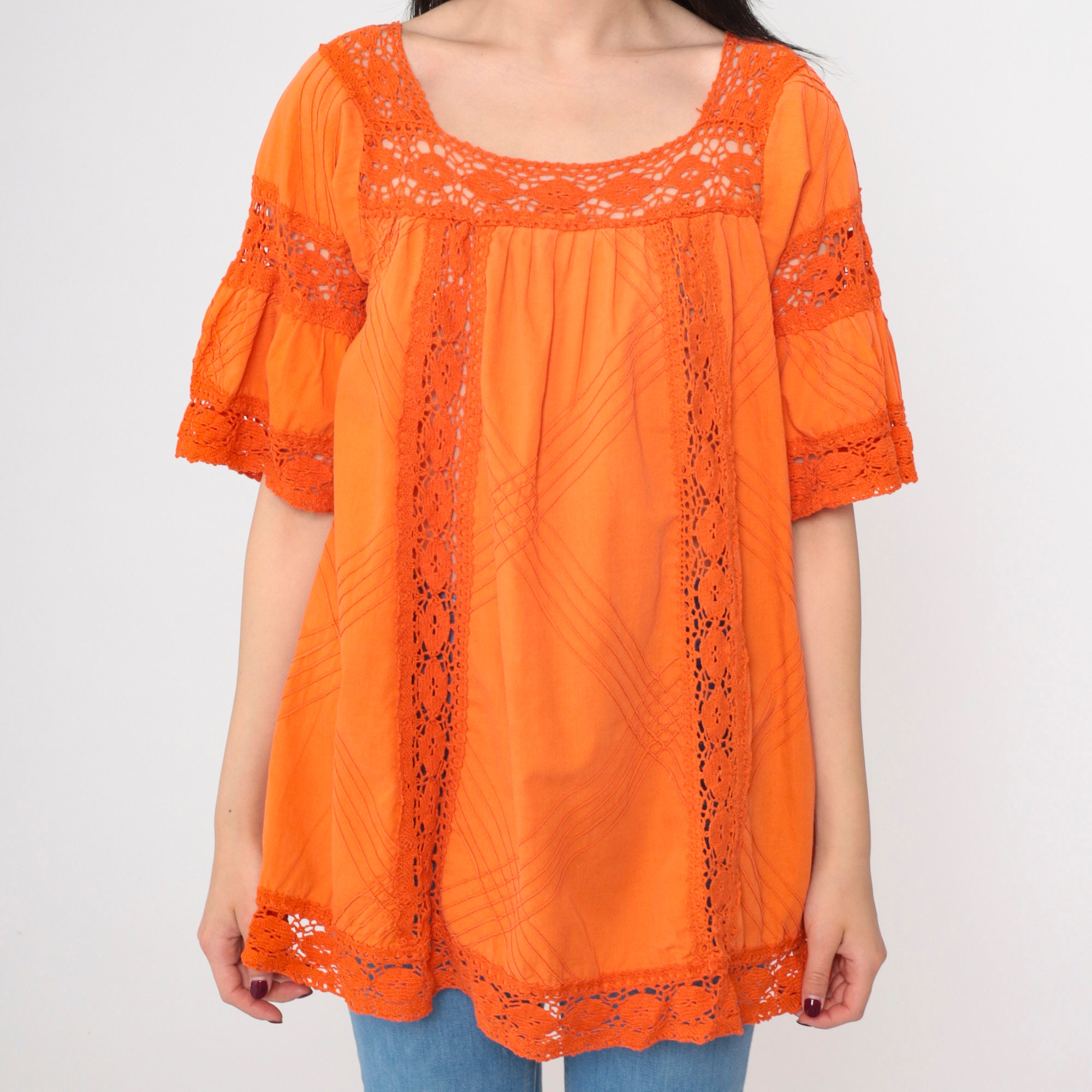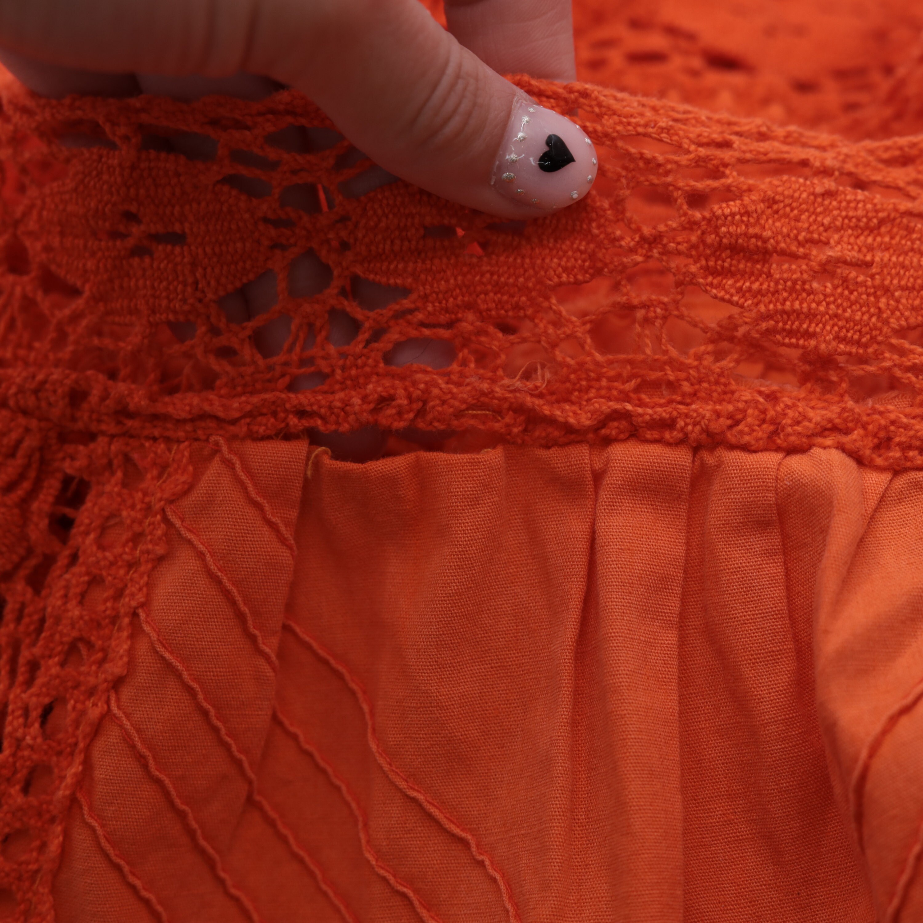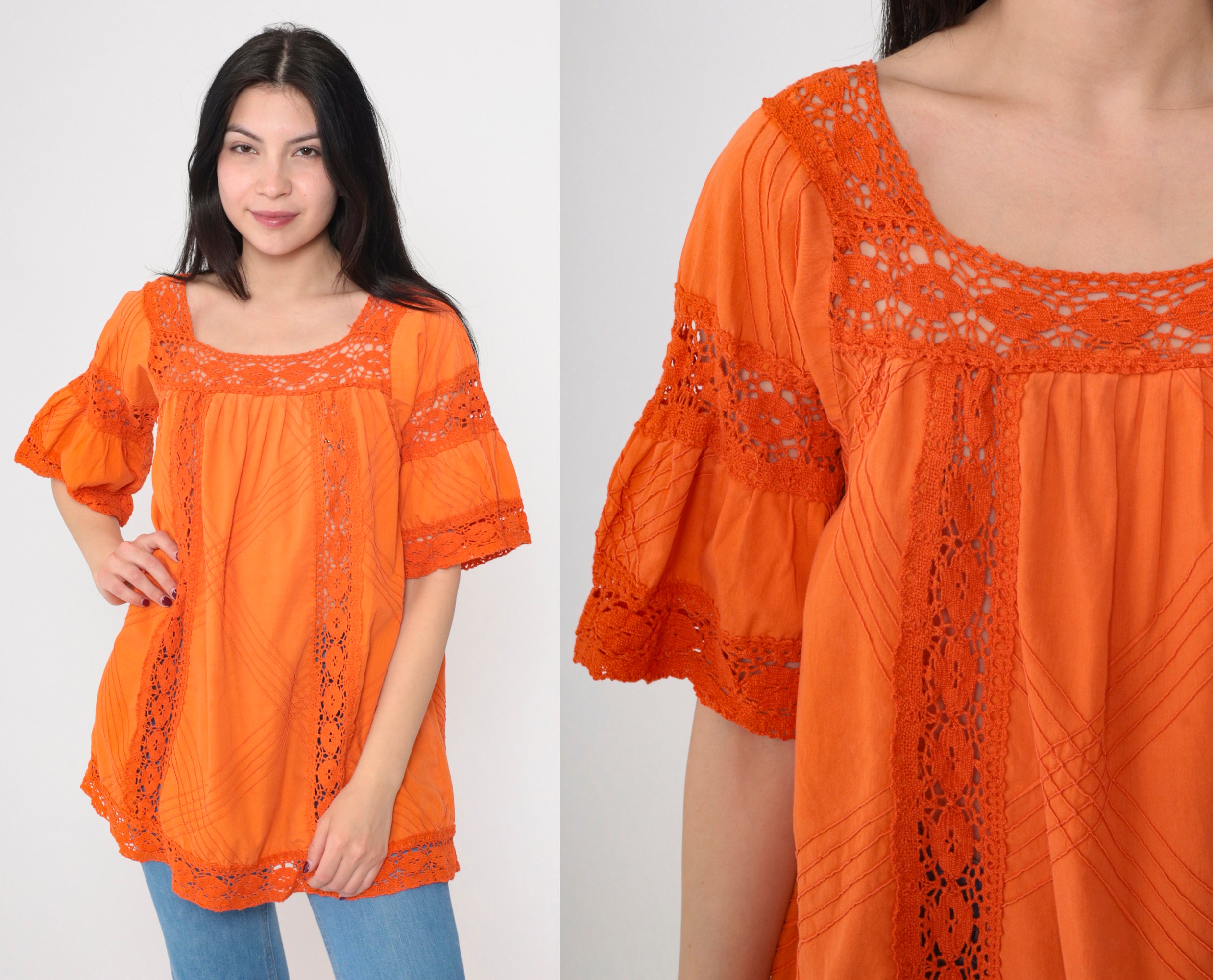 Vintage blouse in orange with sheer crochet lace trim and bell sleeves. Tent cut.